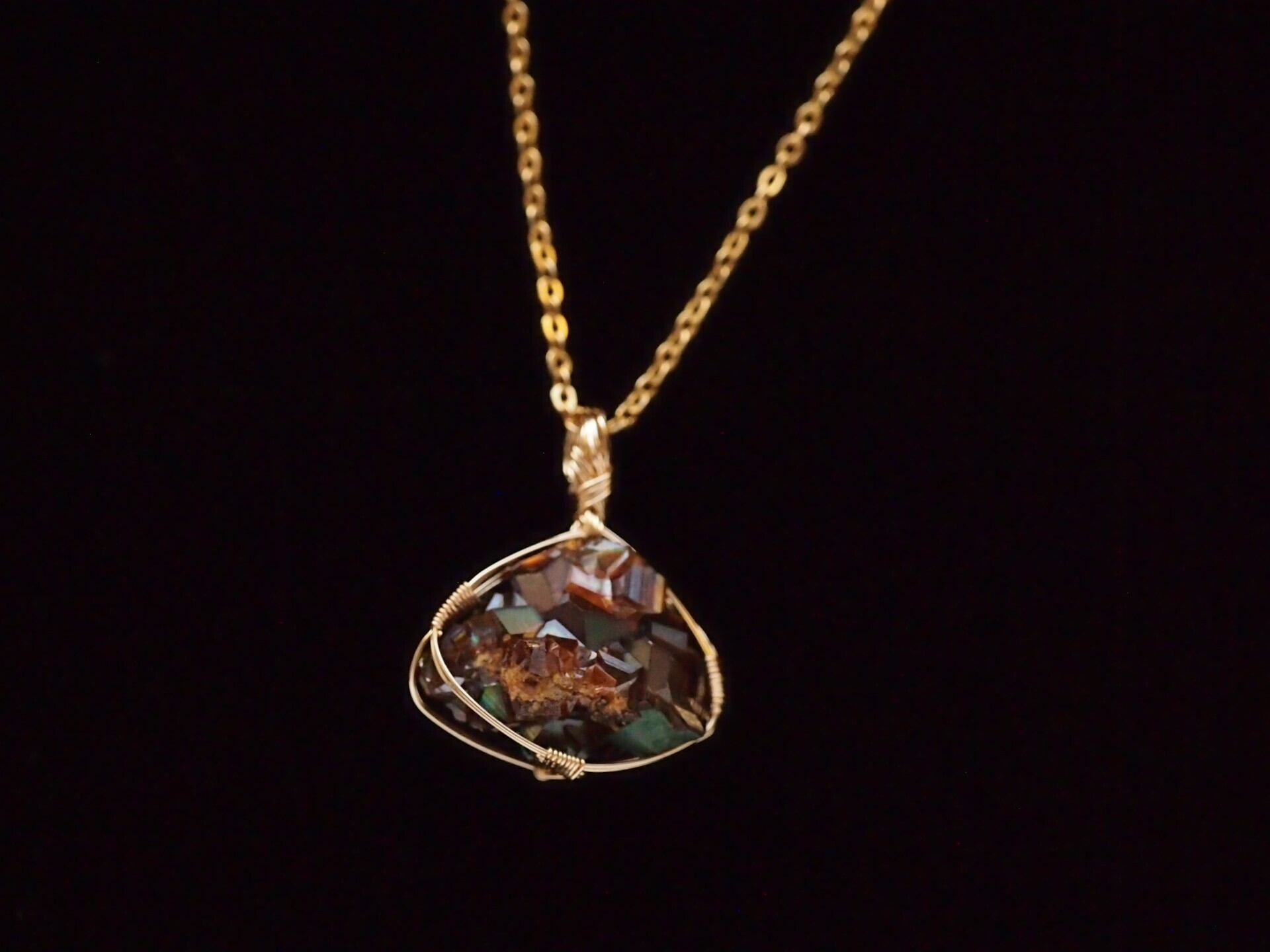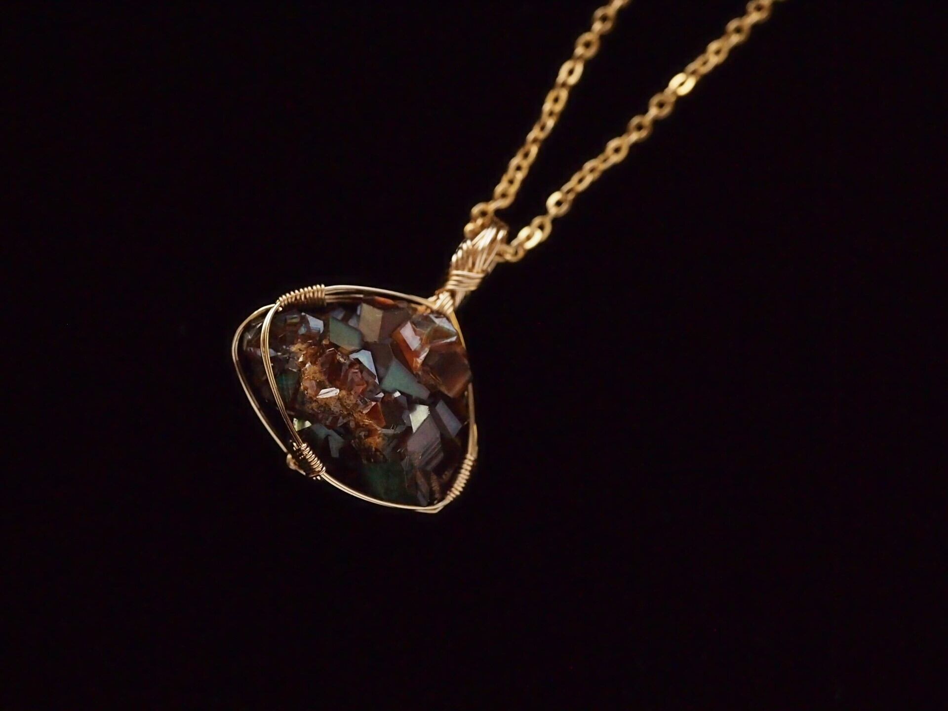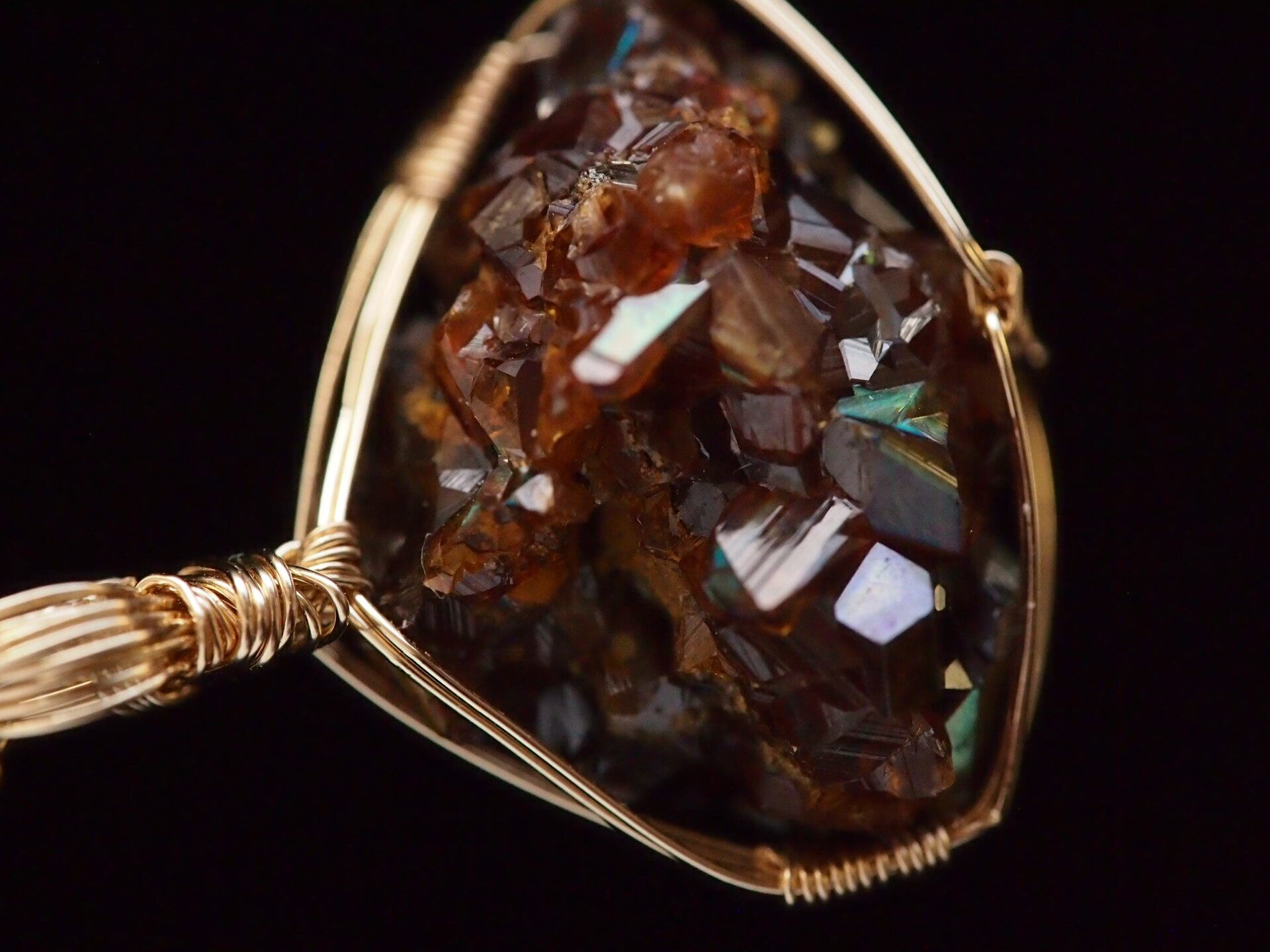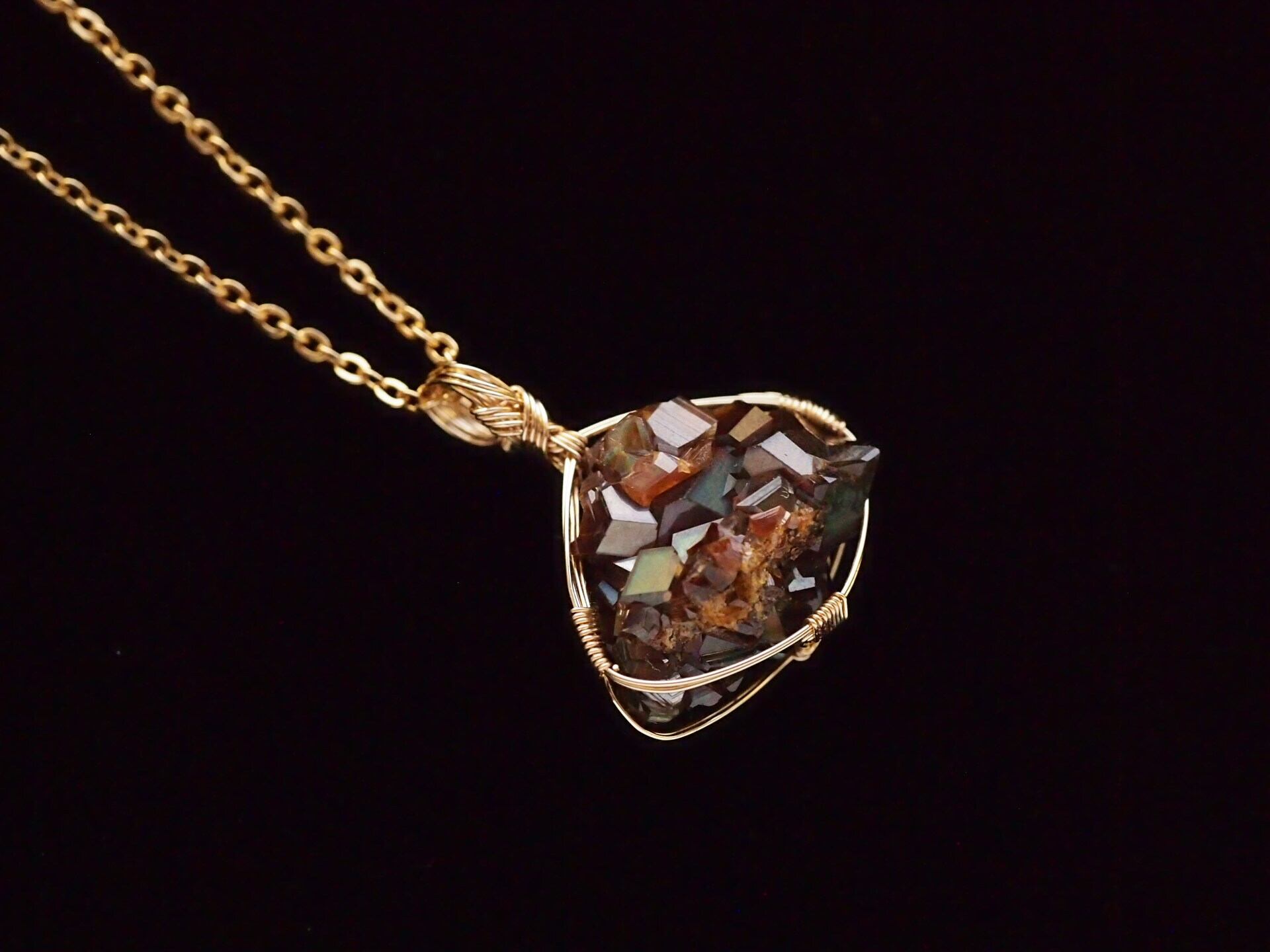 小さなレインボーガーネットのクラスターを14kgfワイヤーで繊細に女神巻き®ペンダントトップに仕上げました♡