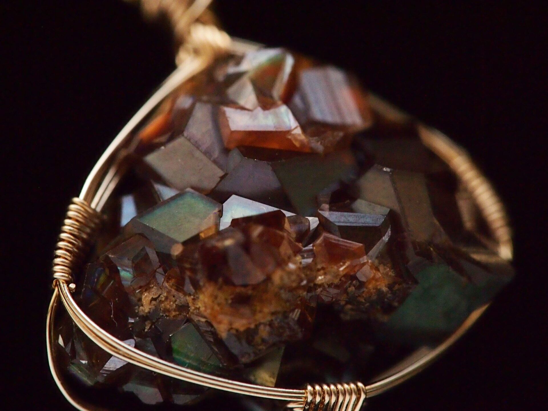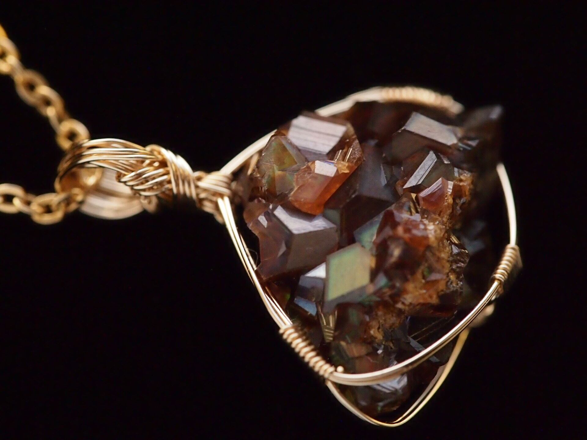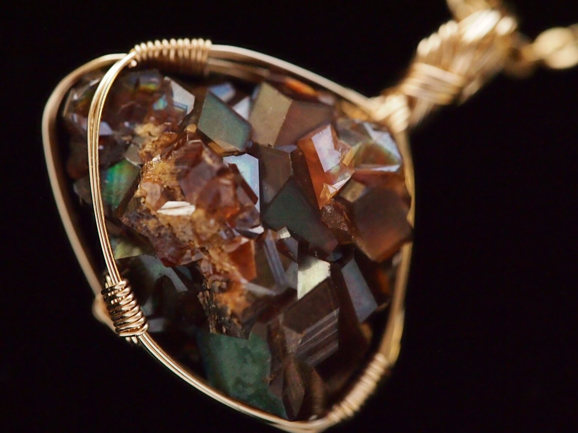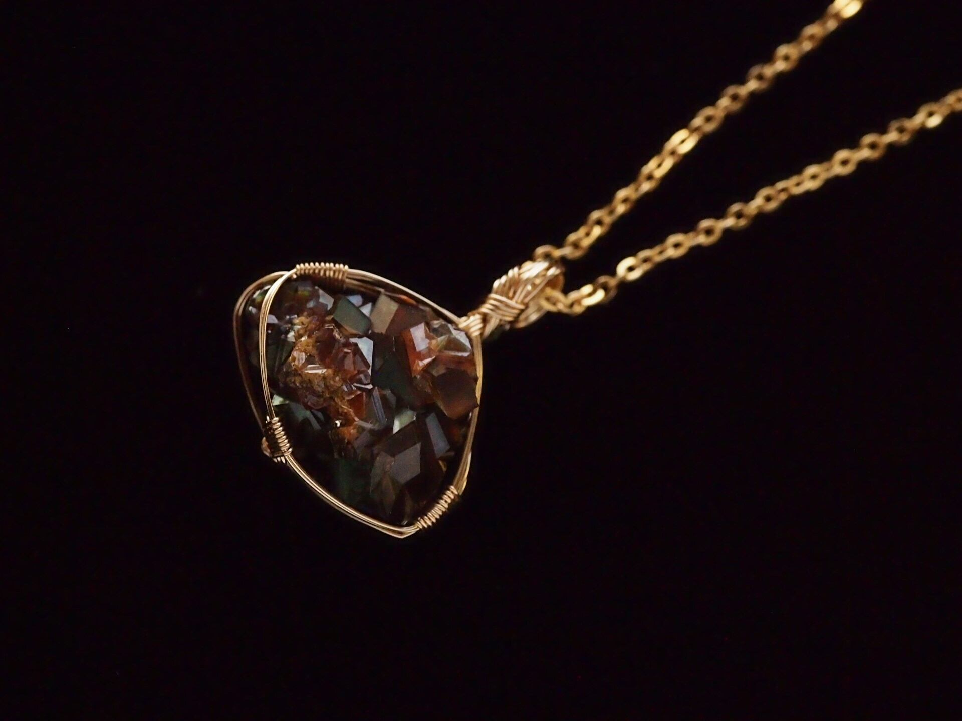 小さなレインボーガーネットのクラスターを14kgfワイヤーで繊細に女神巻き®ペンダントトップに仕上げました♡