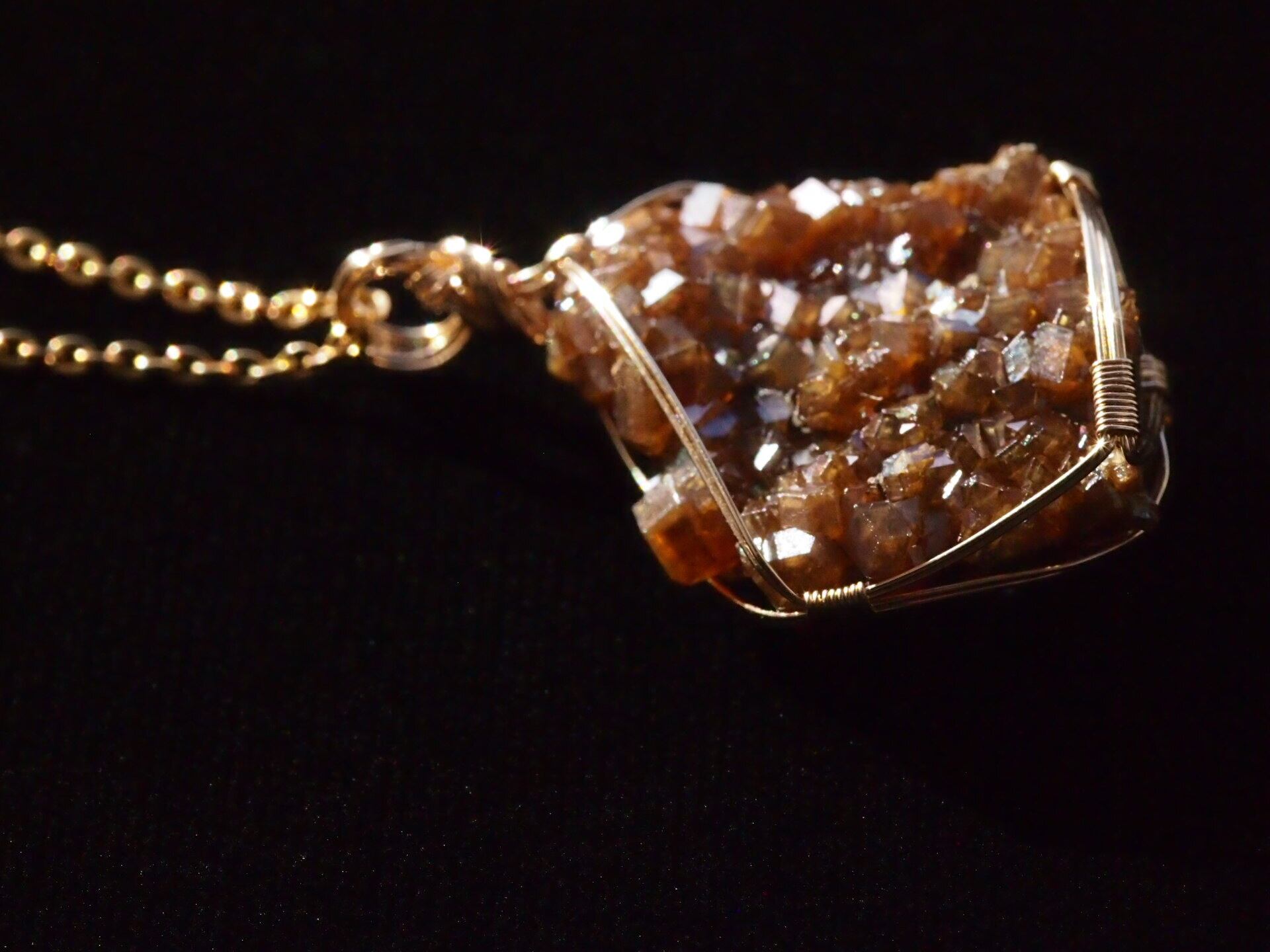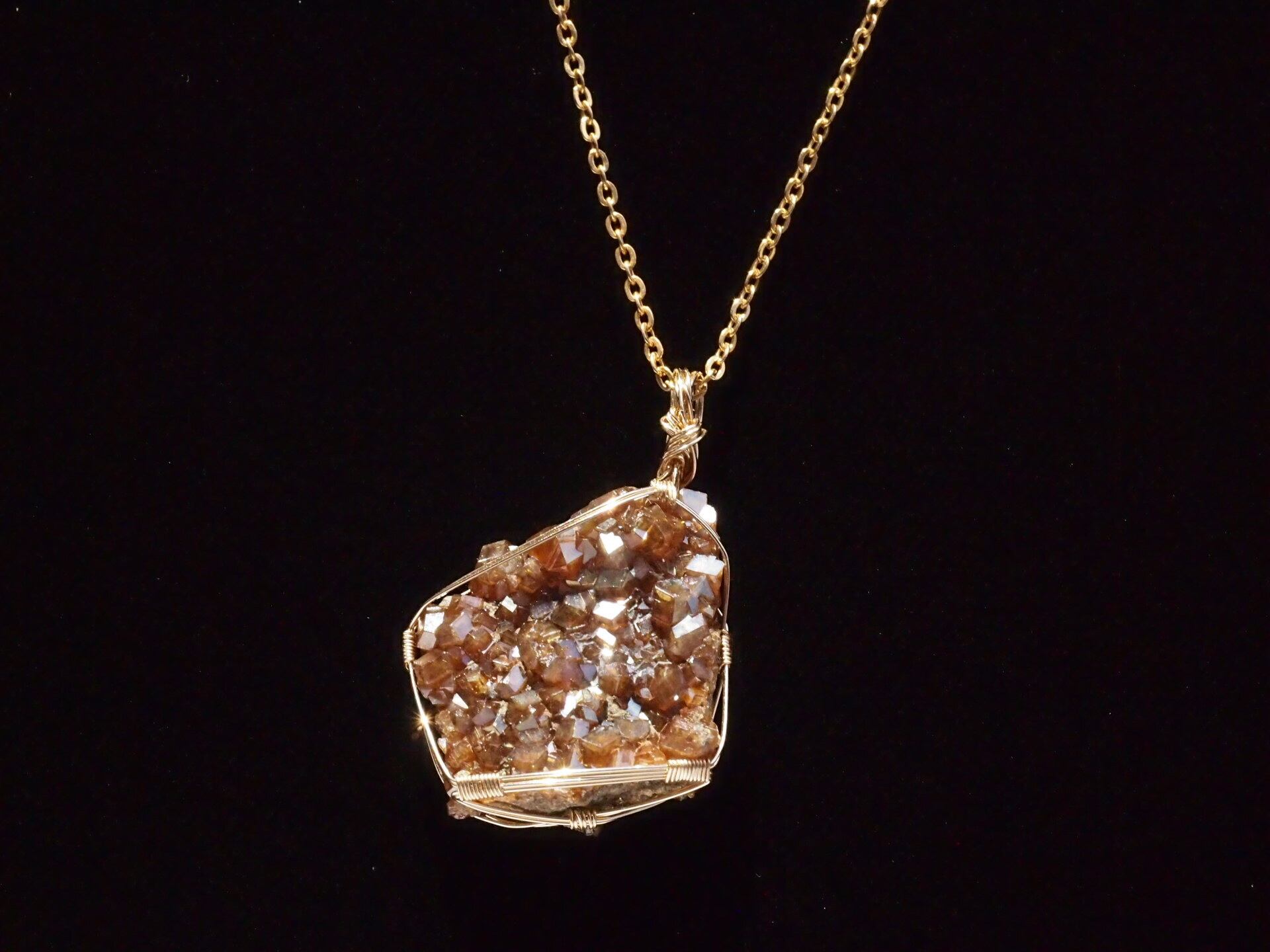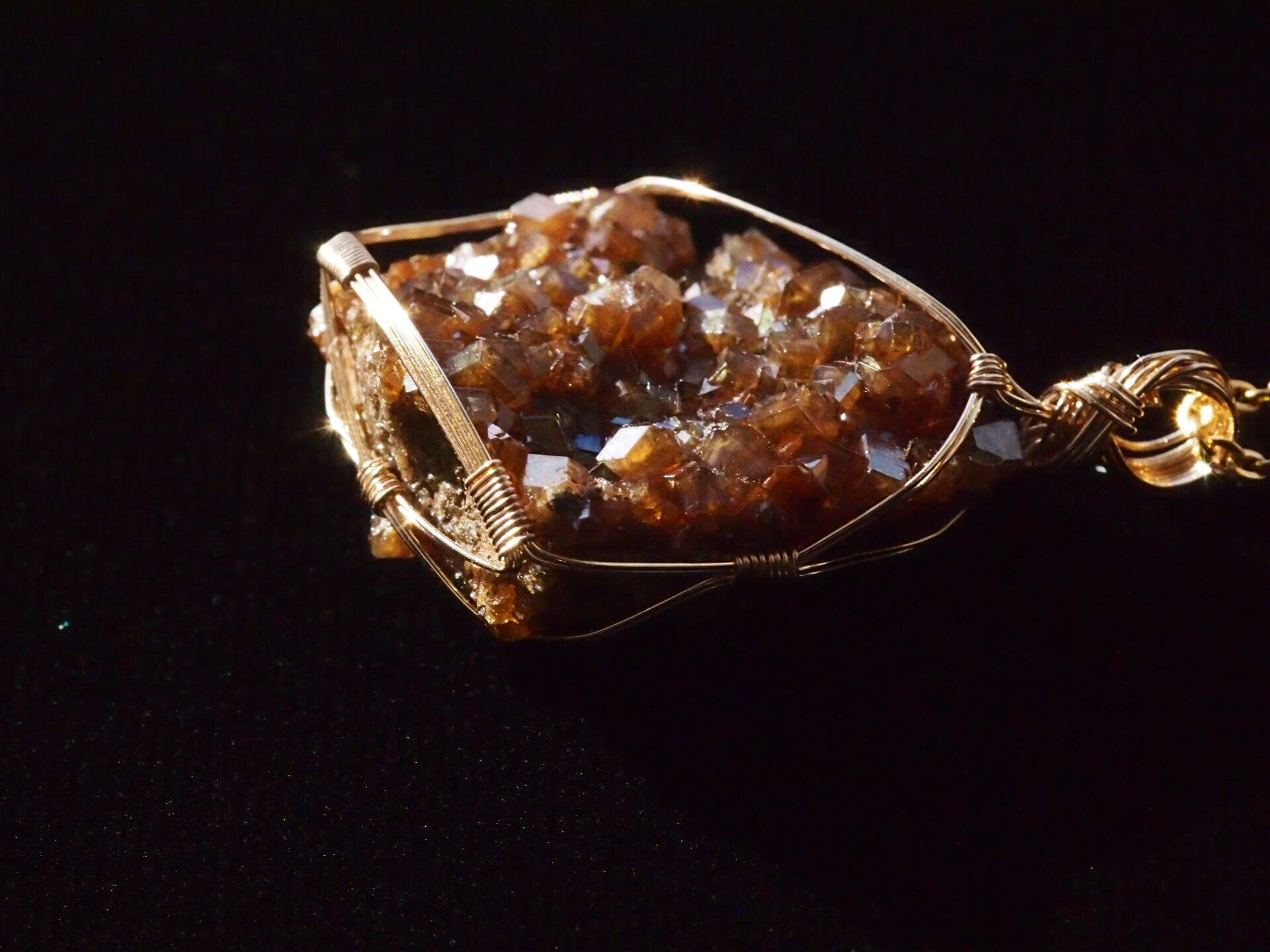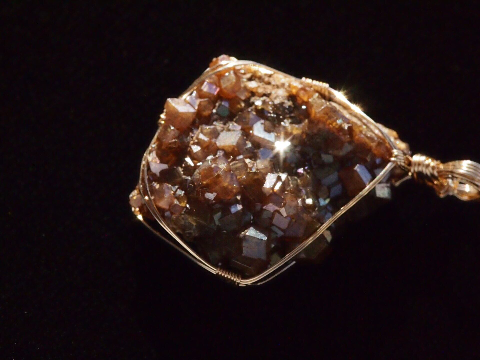 小さな結晶が集まった大変美しい奈良県産のレインボーガーネットのクラスターを使って制作しました。