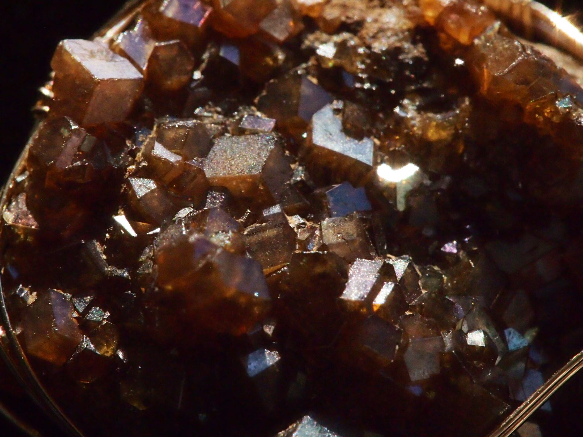 こちらのクラスターも、ややマットなチョコレート色の結晶表面に、グリーン、レッド、オレンジ、ブルーと、角度によって様々な色が見られます。