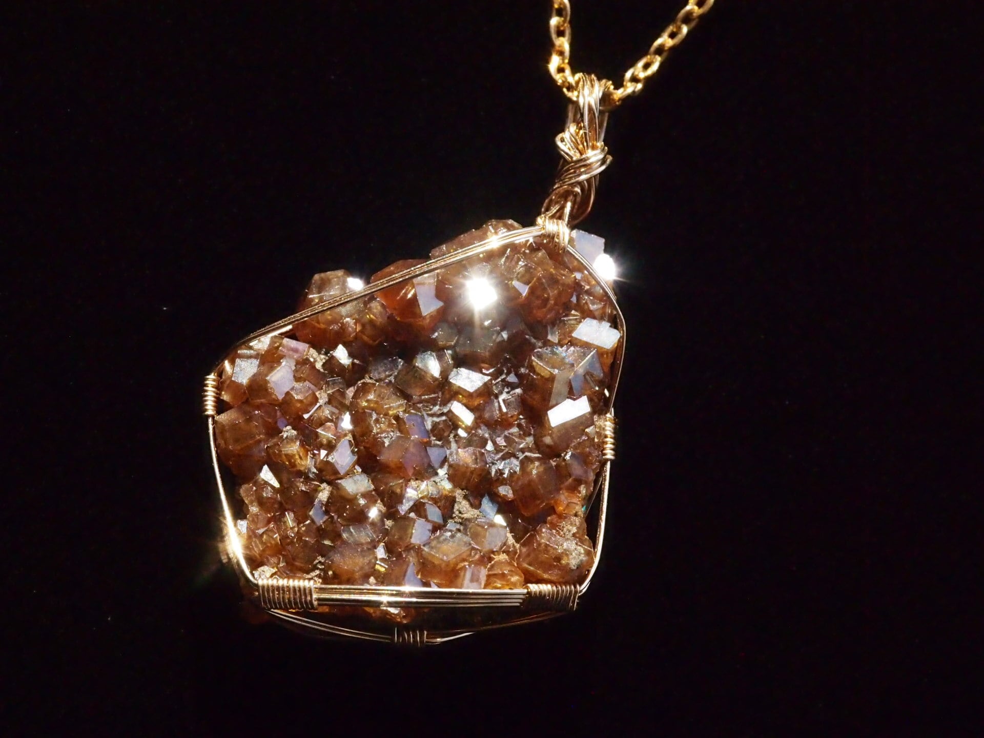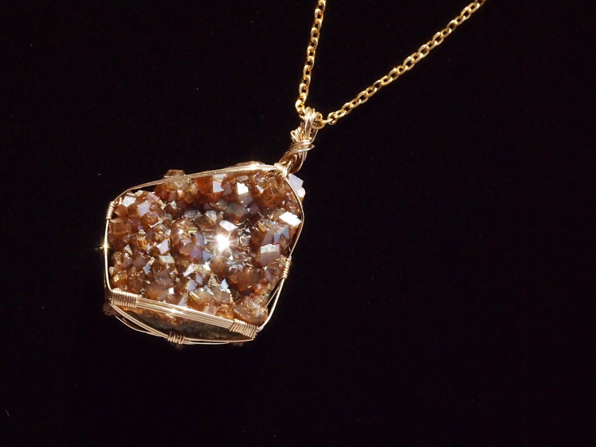 存在感のあるレインボーガーネットのクラスターを14kgfワイヤーで繊細に女神巻き®ペンダントトップに仕上げました♡