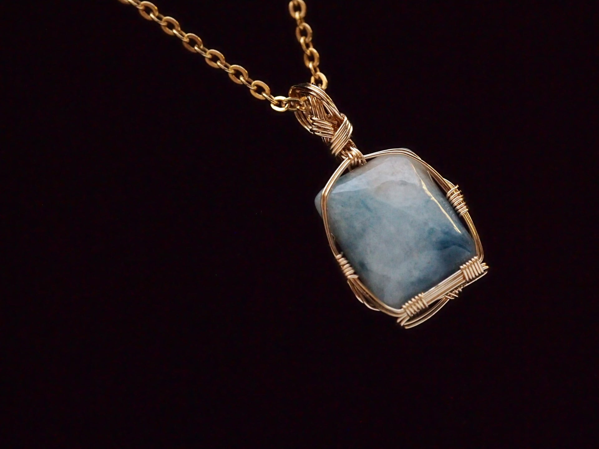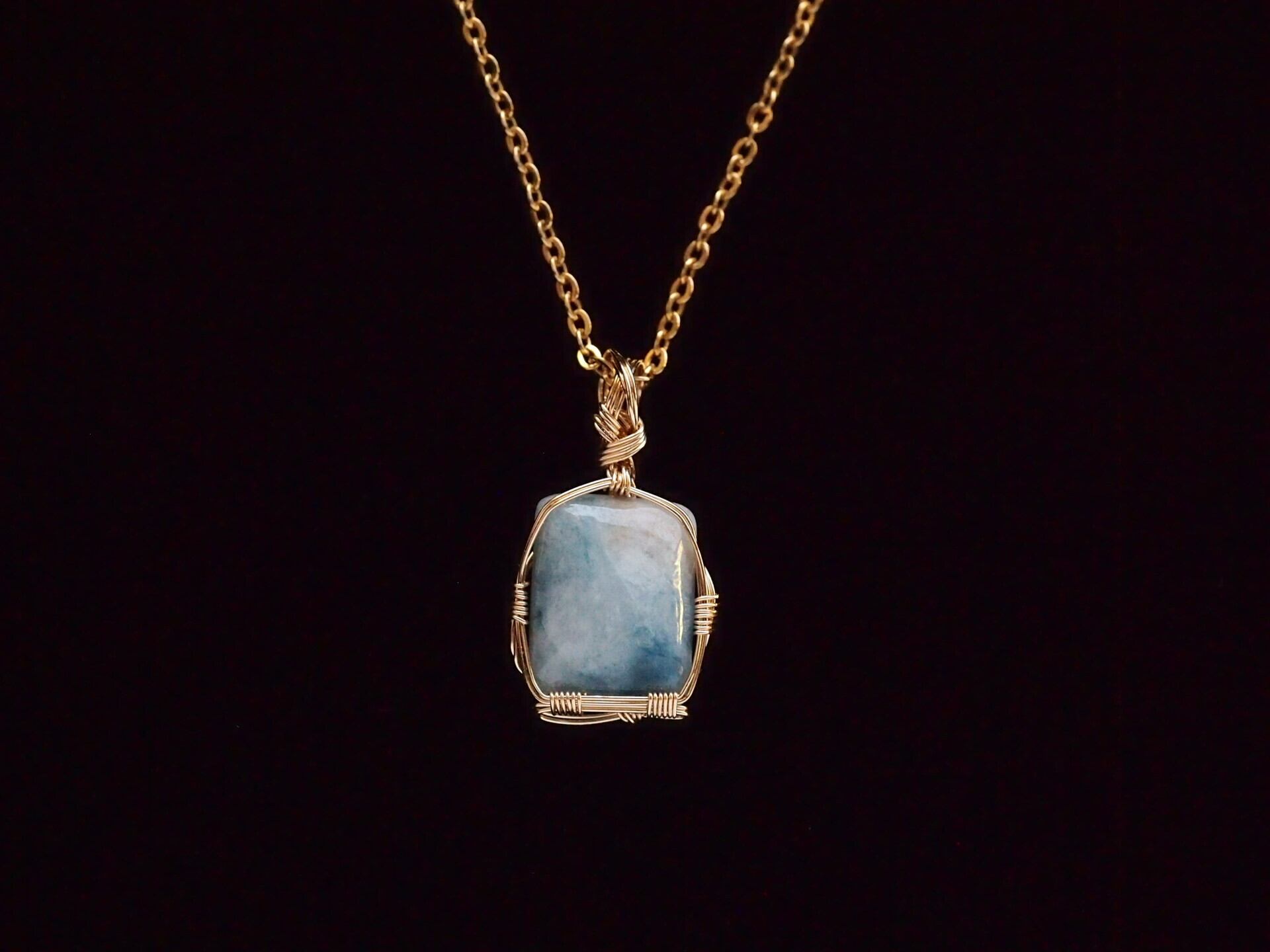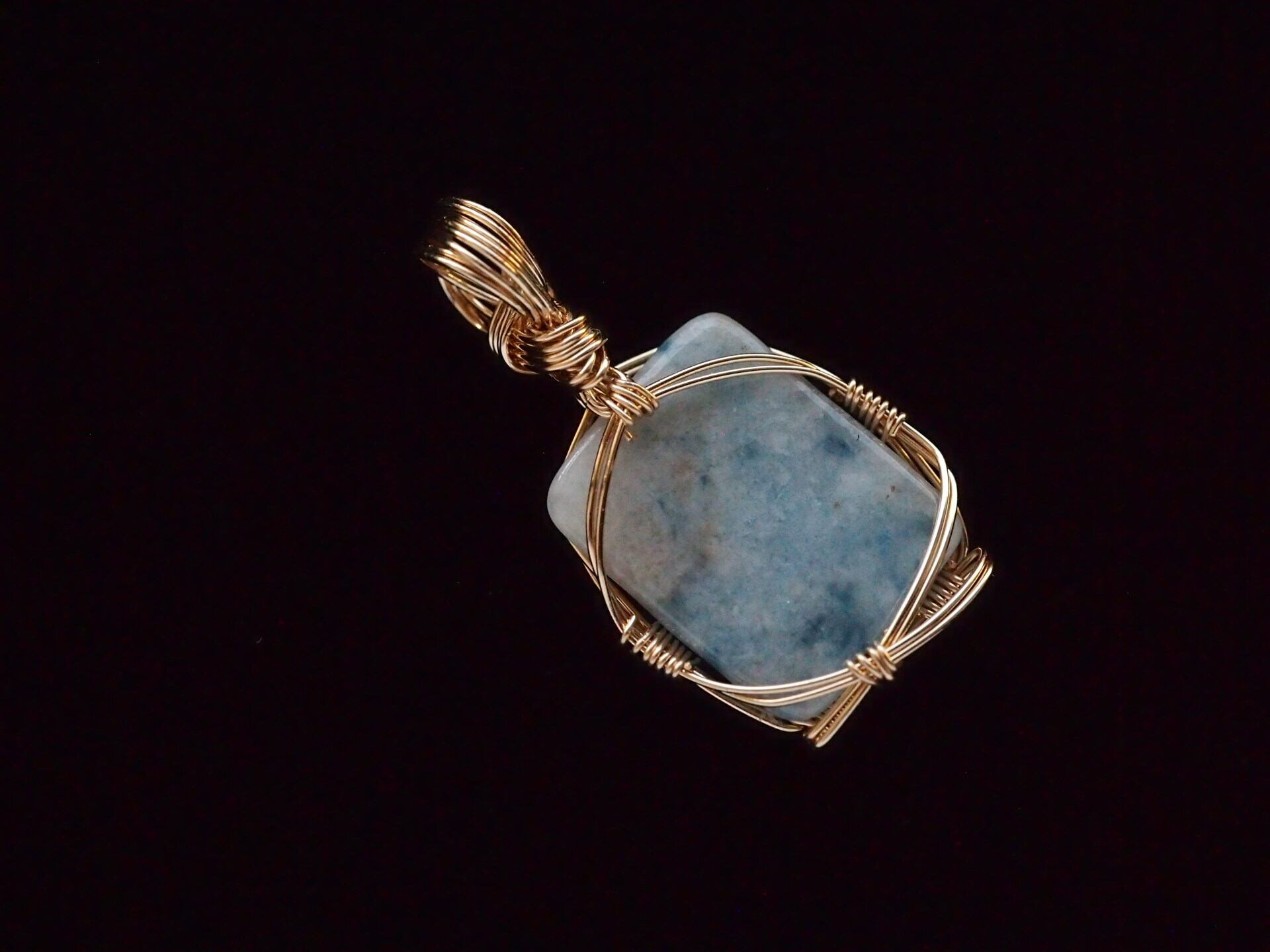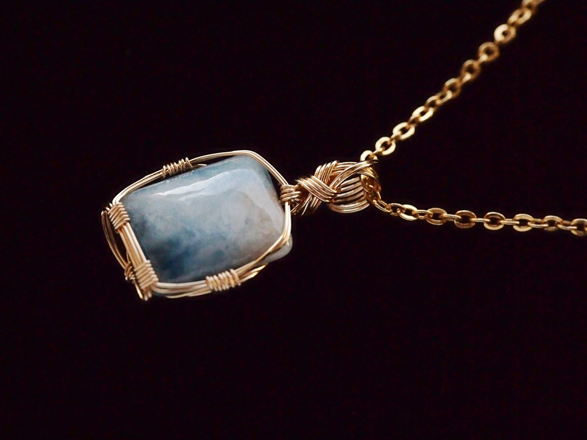 糸魚川市コン沢産のレクタングルカットの青翡翠を14kgfワイヤーで繊細に女神巻き®ペンダントトップに仕上げました♡