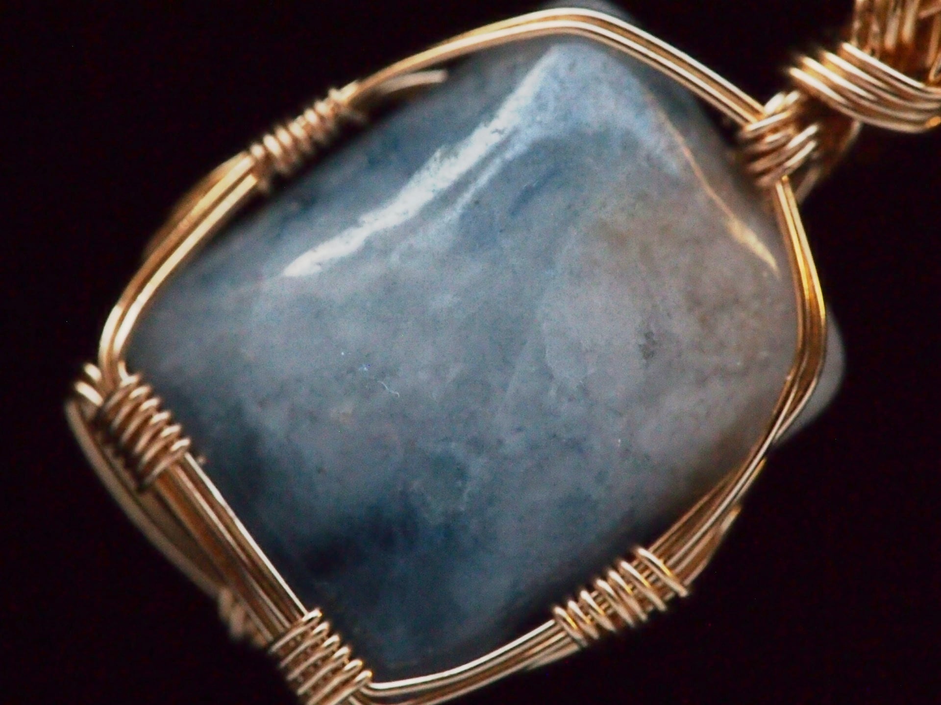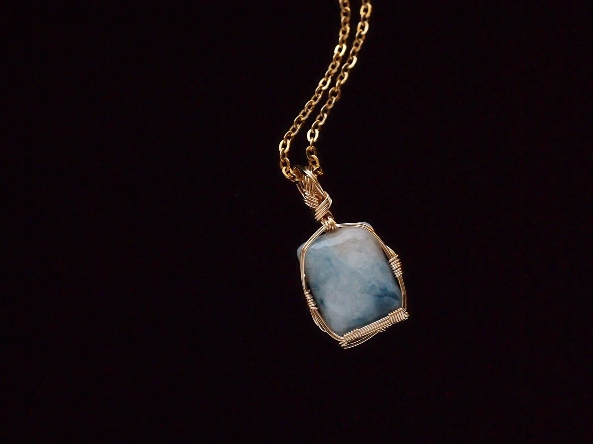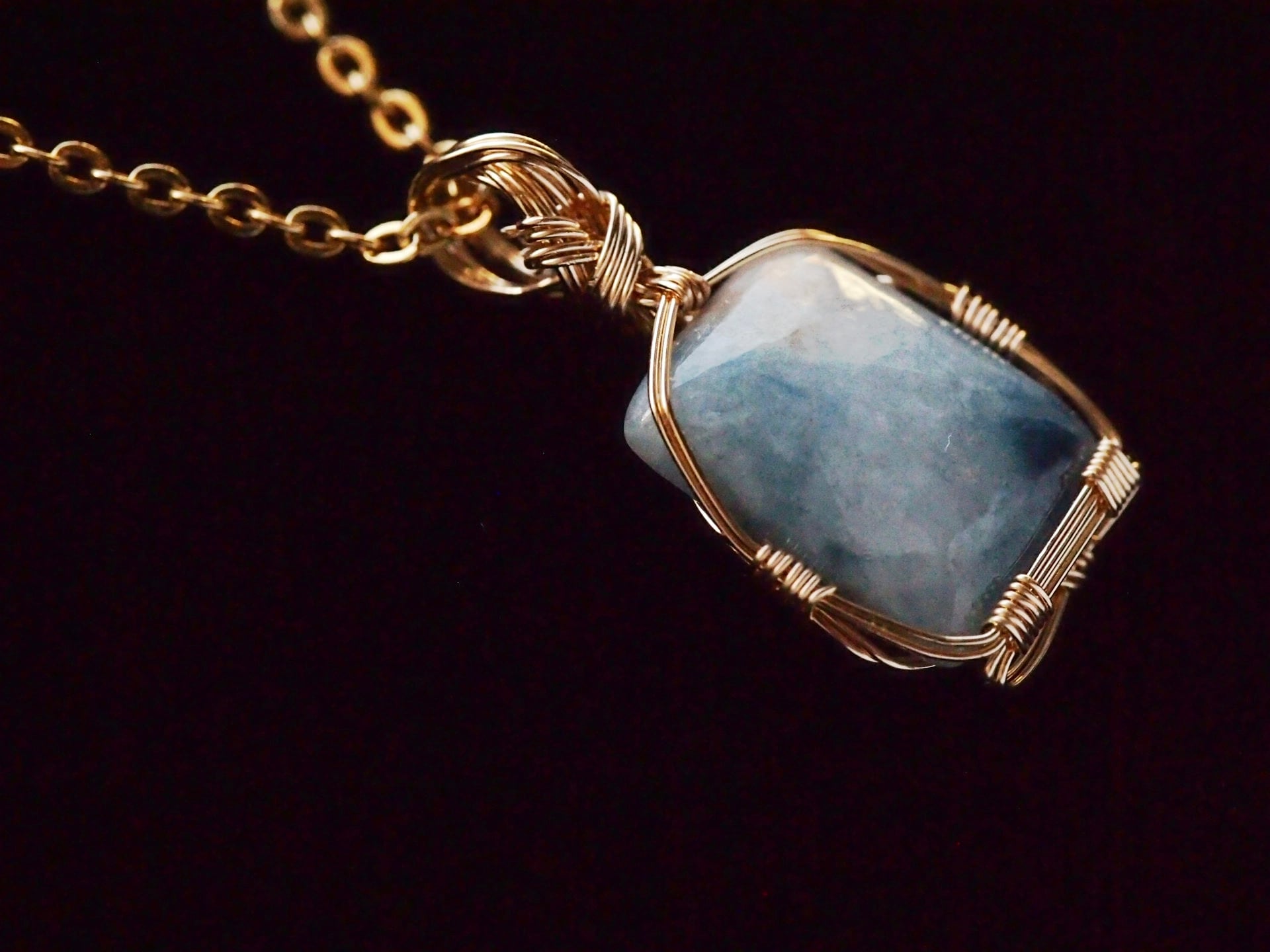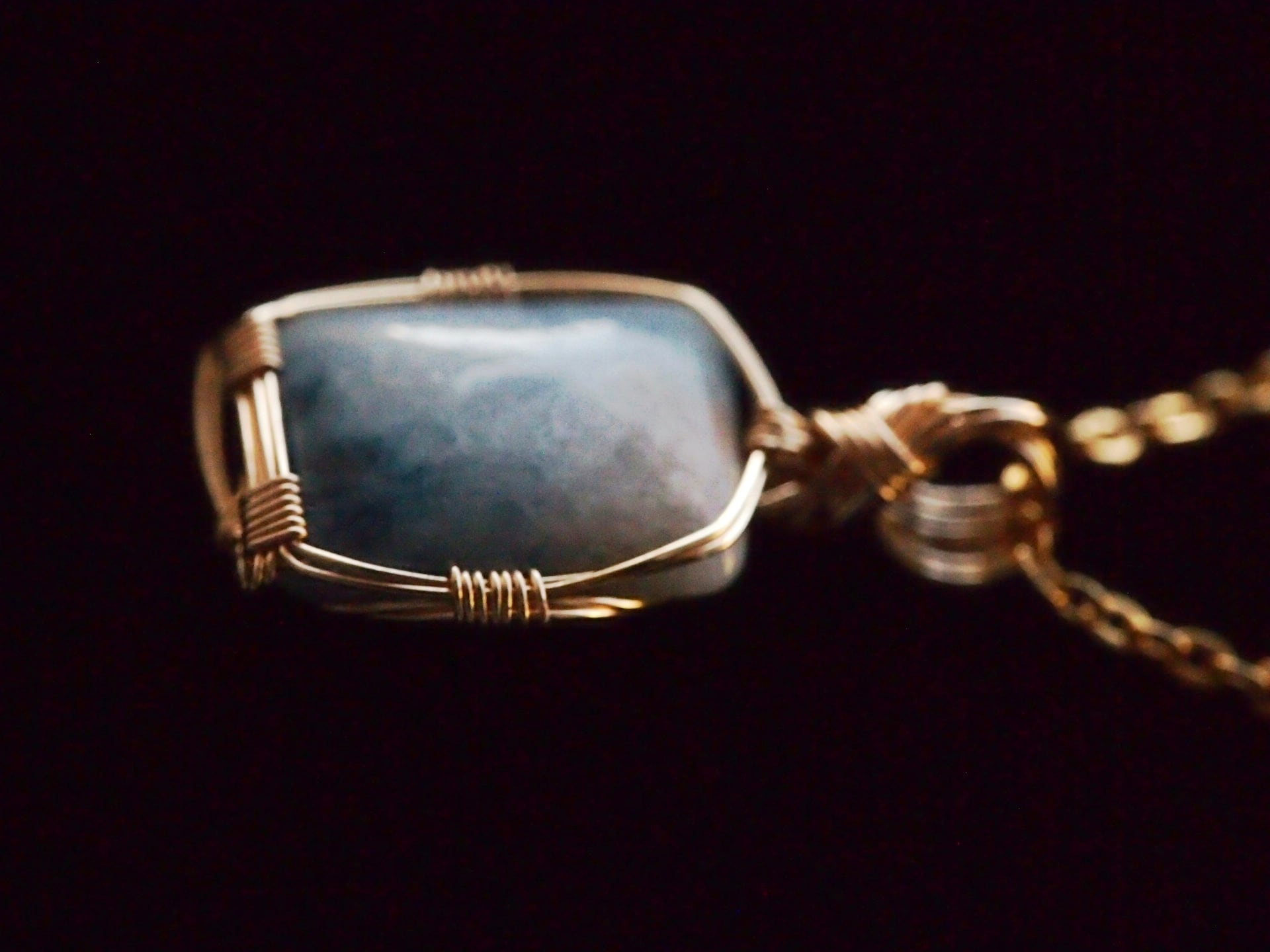 糸魚川市コン沢産のレクタングルカットの青翡翠を14kgfワイヤーで繊細に女神巻き®ペンダントトップに仕上げました♡