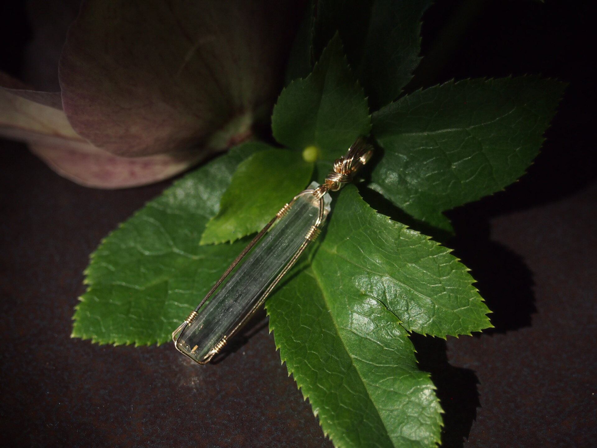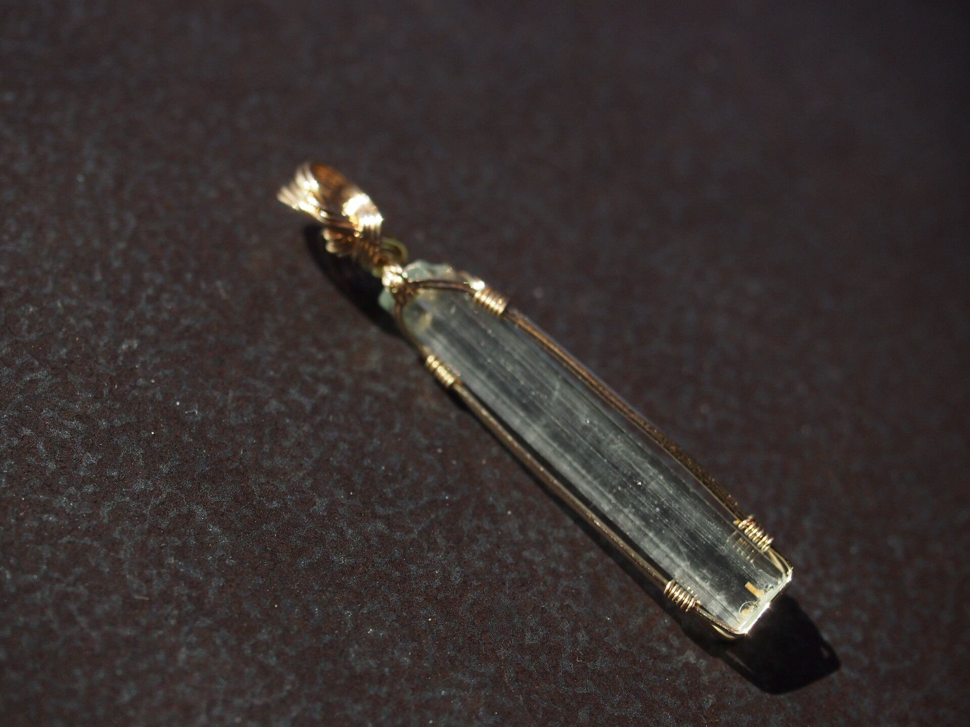 透明感が美しい、ごくごく淡いブルーのアクアマリンの柱状結晶をそのまま巻きました。