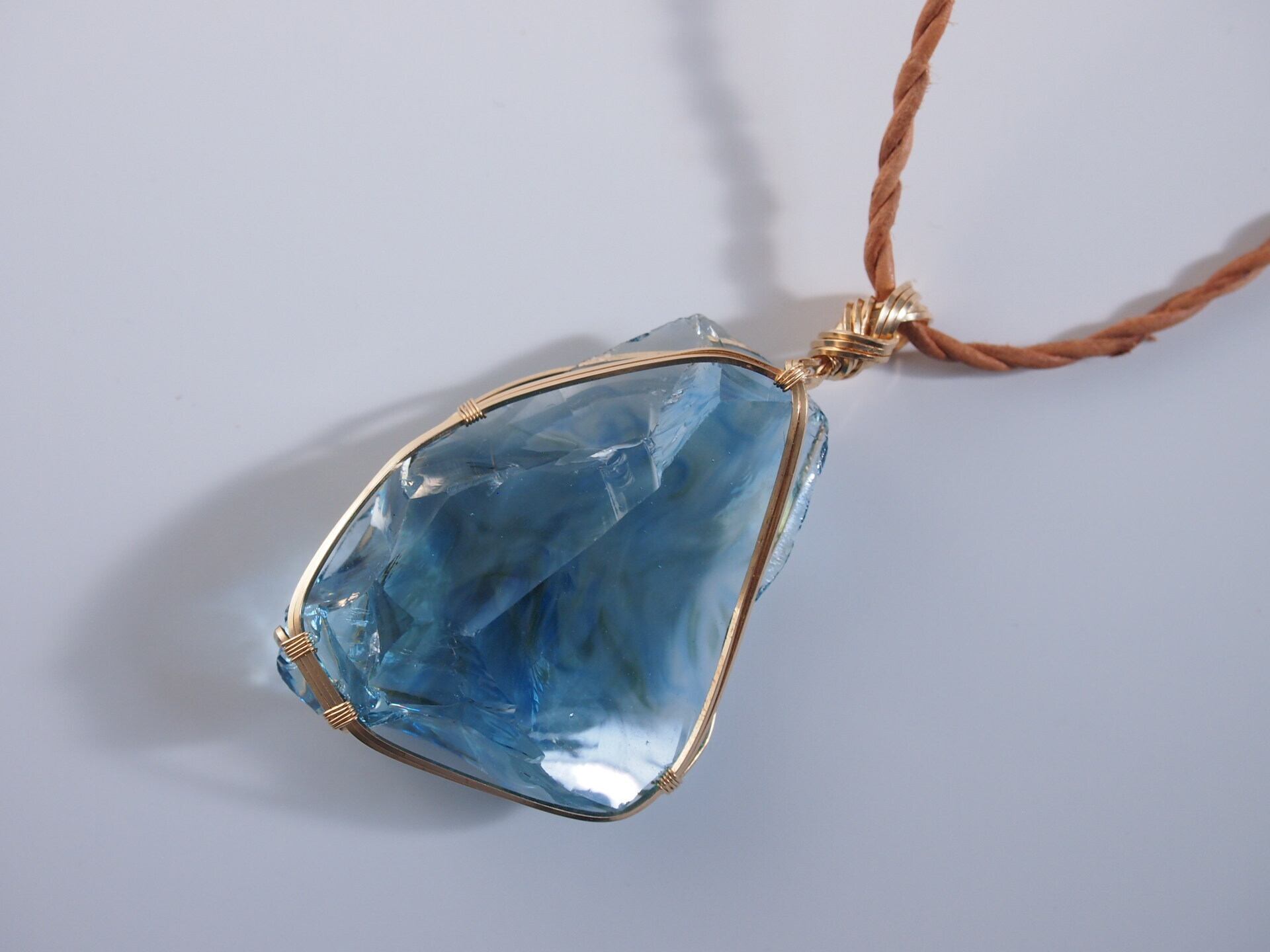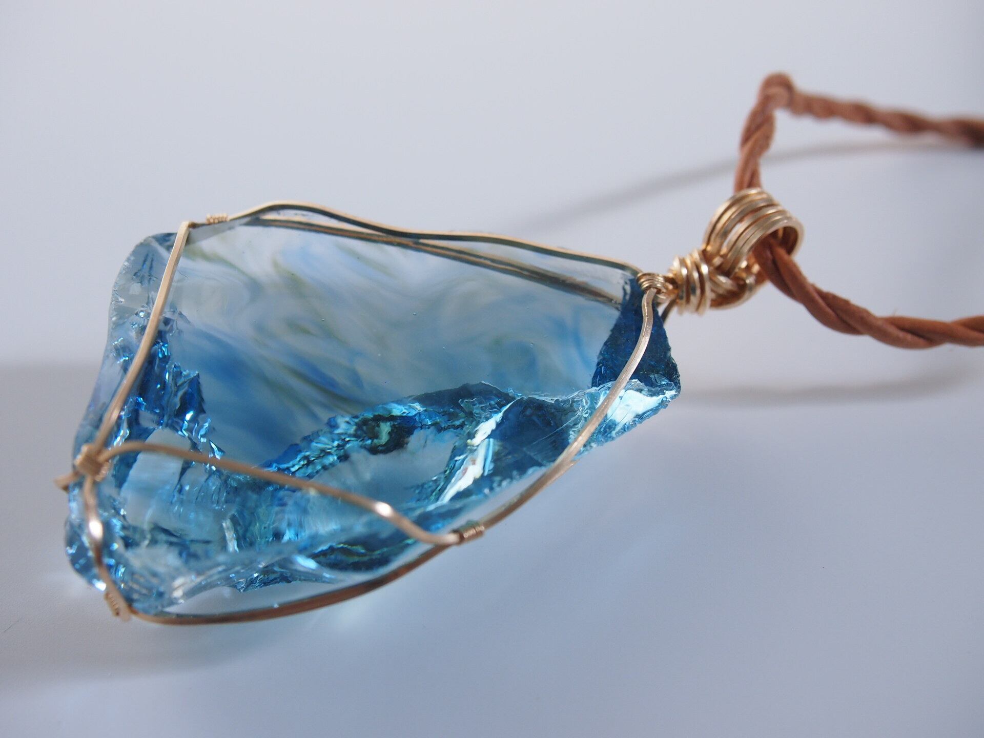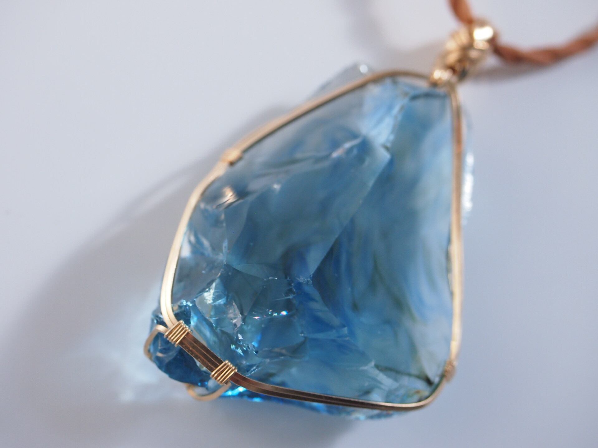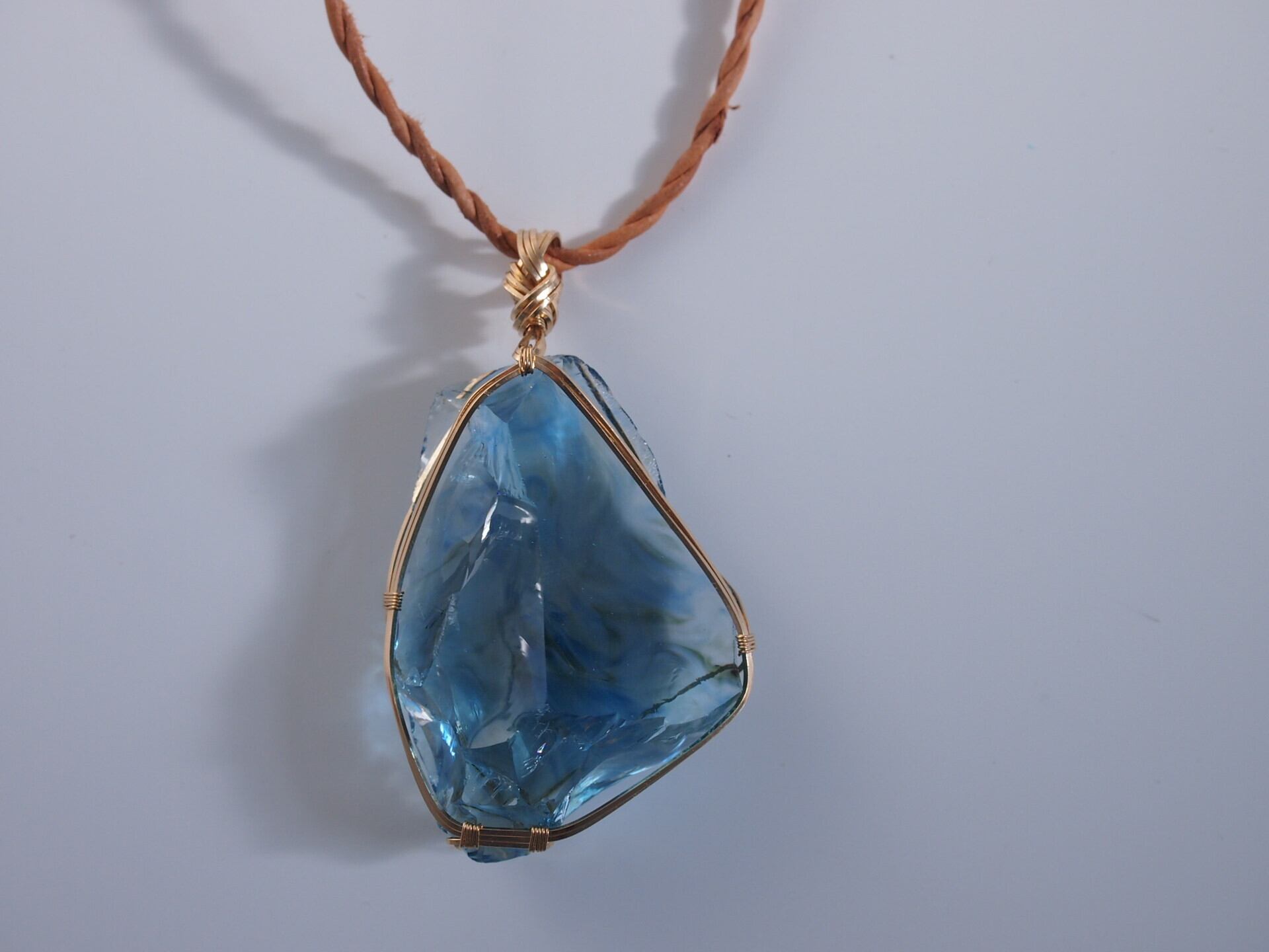 美しい海を内部に閉じ込めたようなYURAGIガラスを14kgfスクエアワイヤーで繊細に女神巻きペンダントトップに仕上げました♡