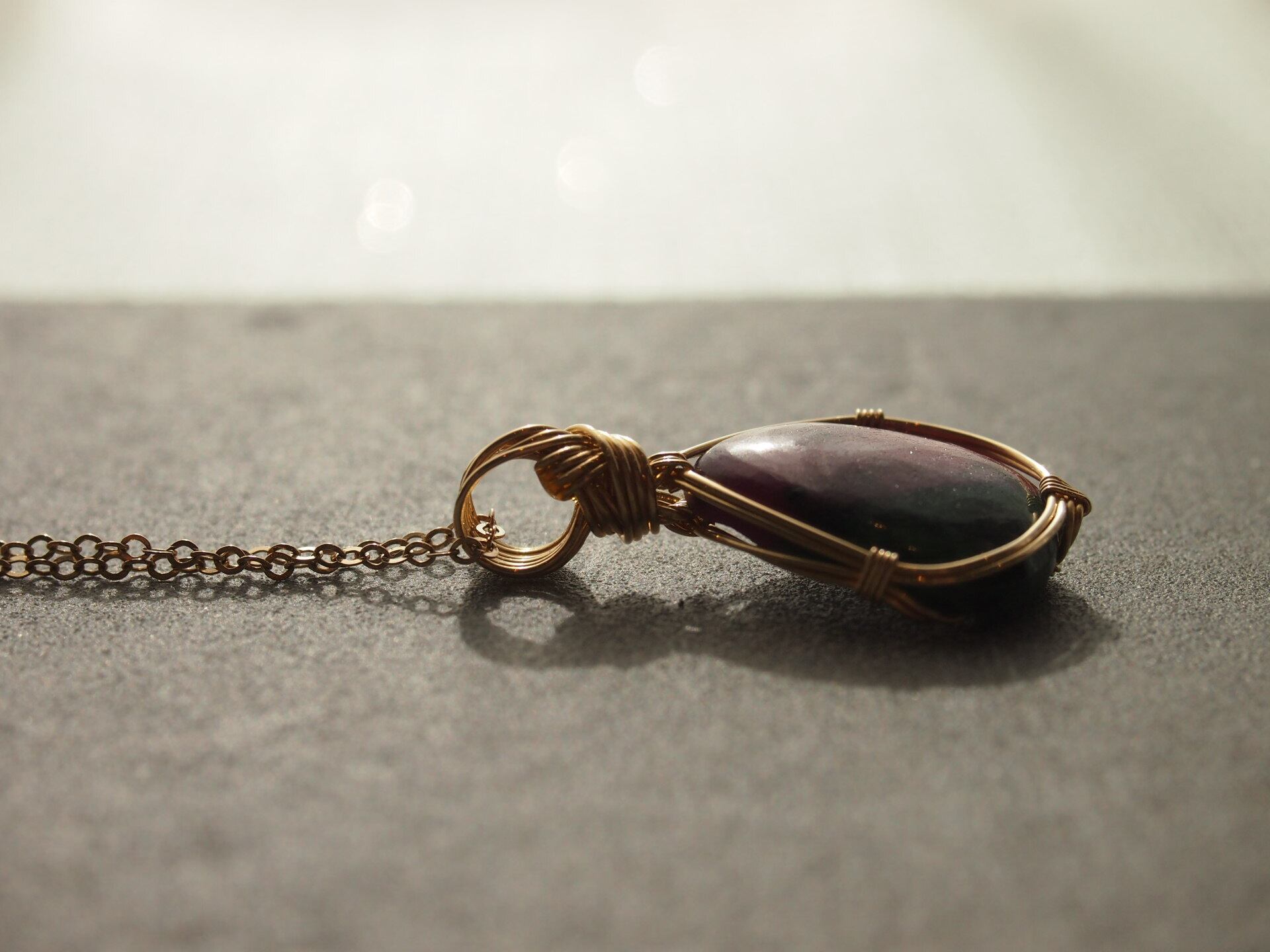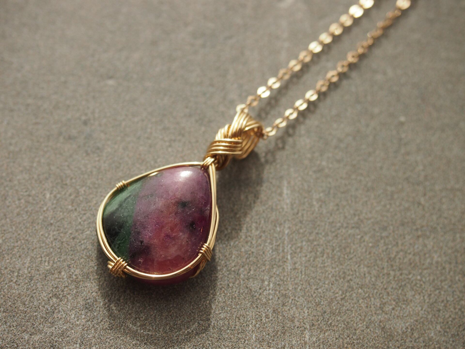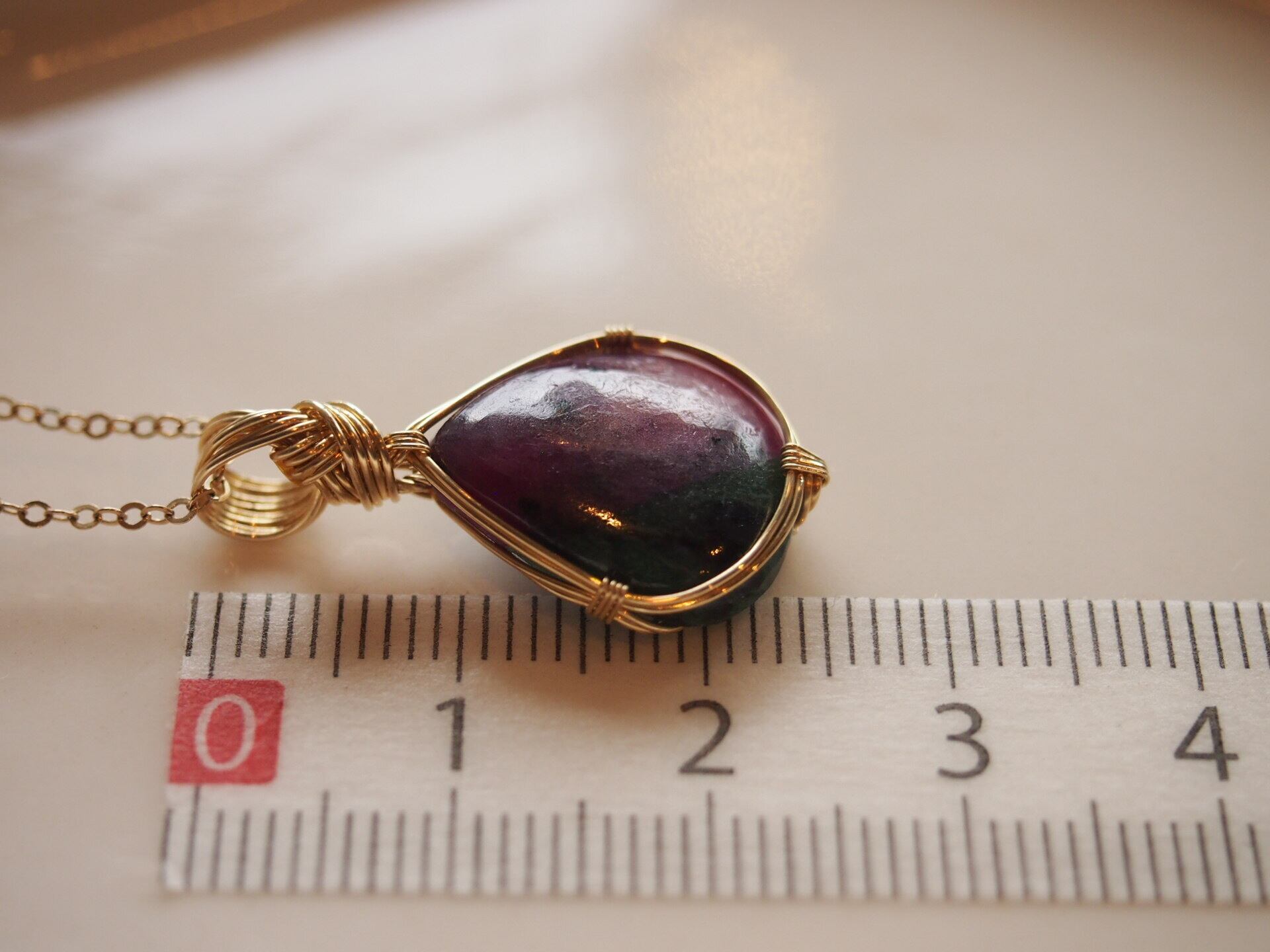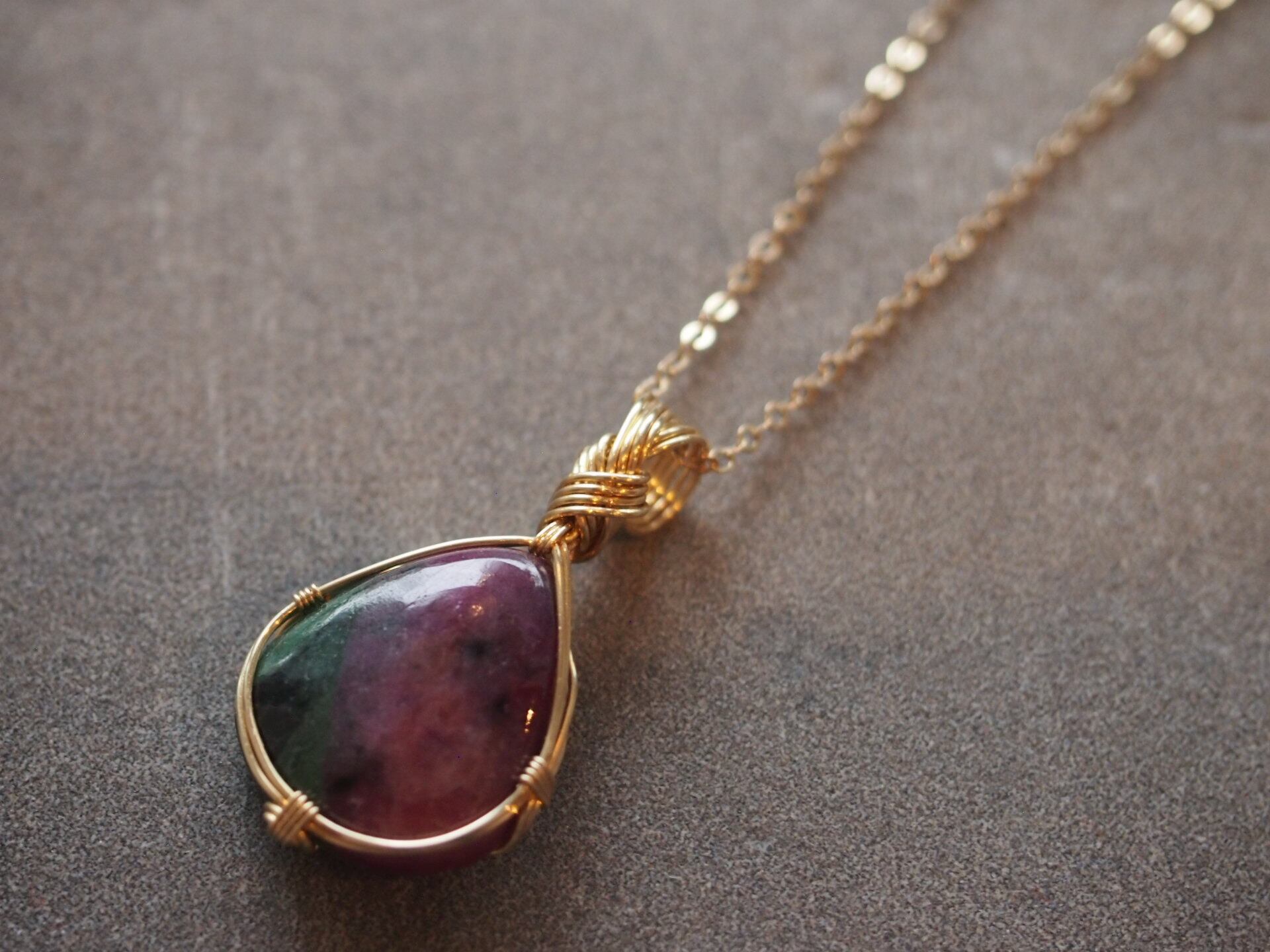 ルビーインゾイサイトの雫型カットを14kgfワイヤーで繊細に女神巻きペンダントトップに仕上げました♡