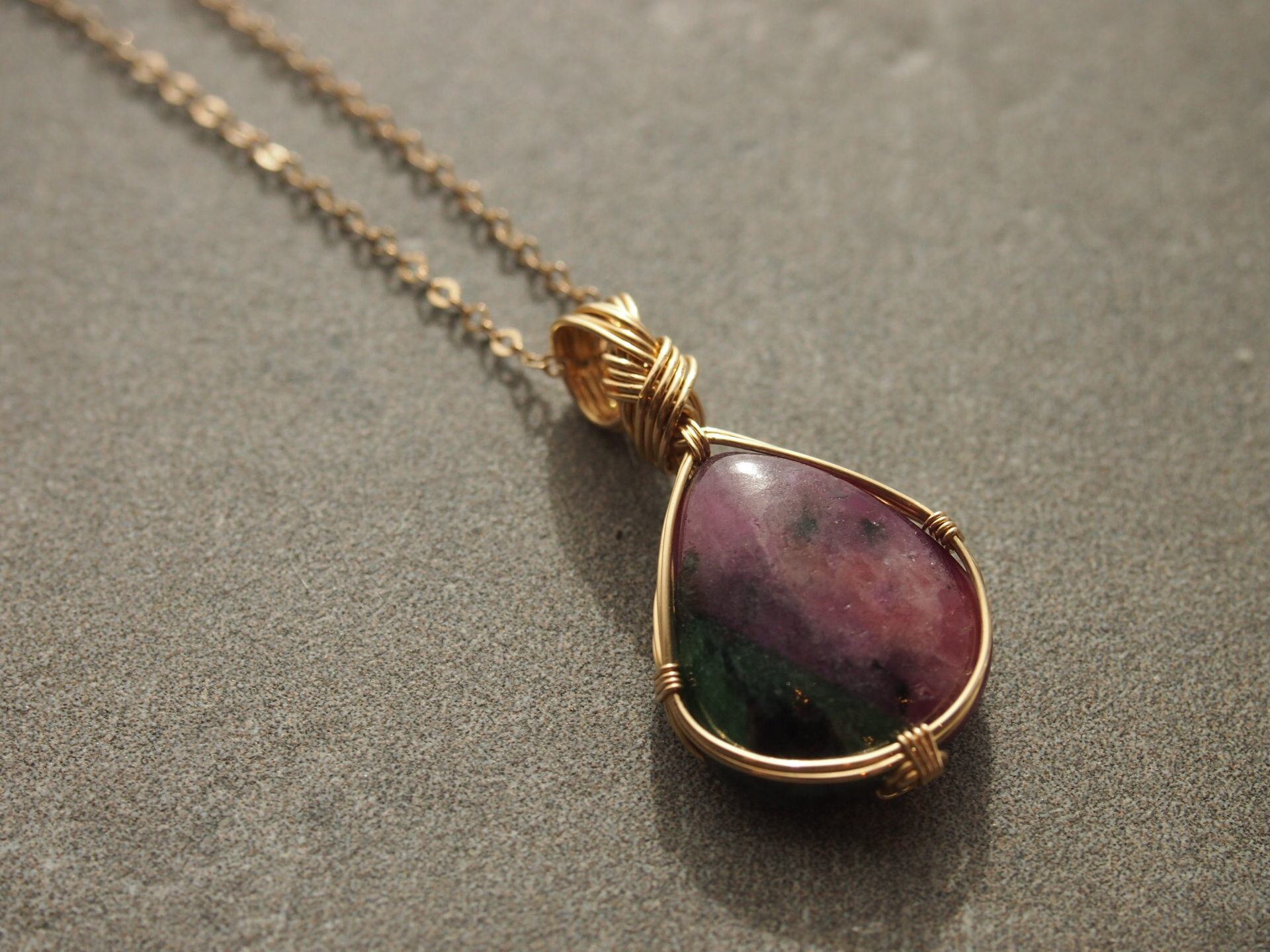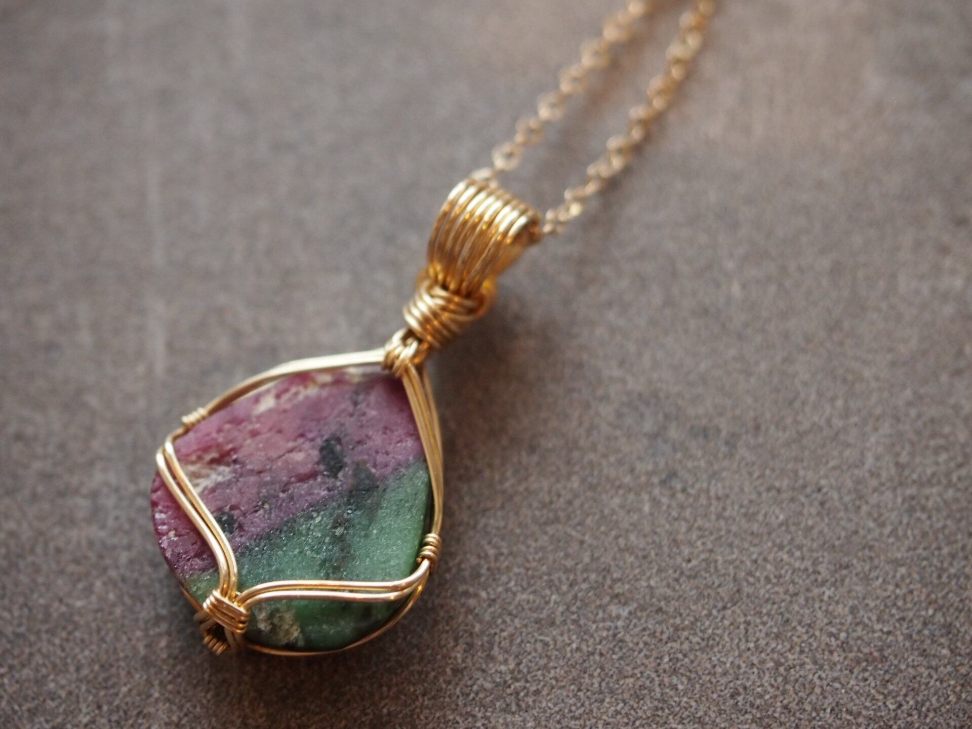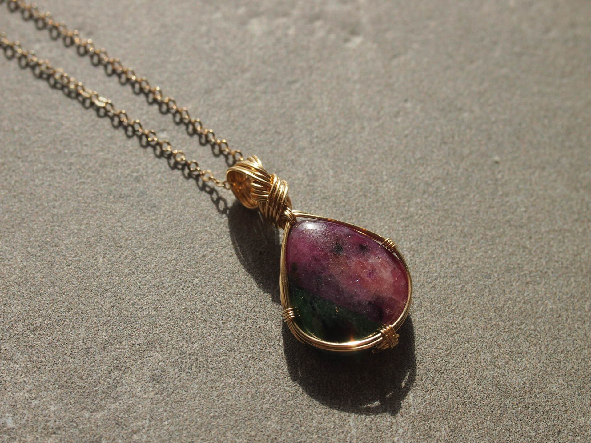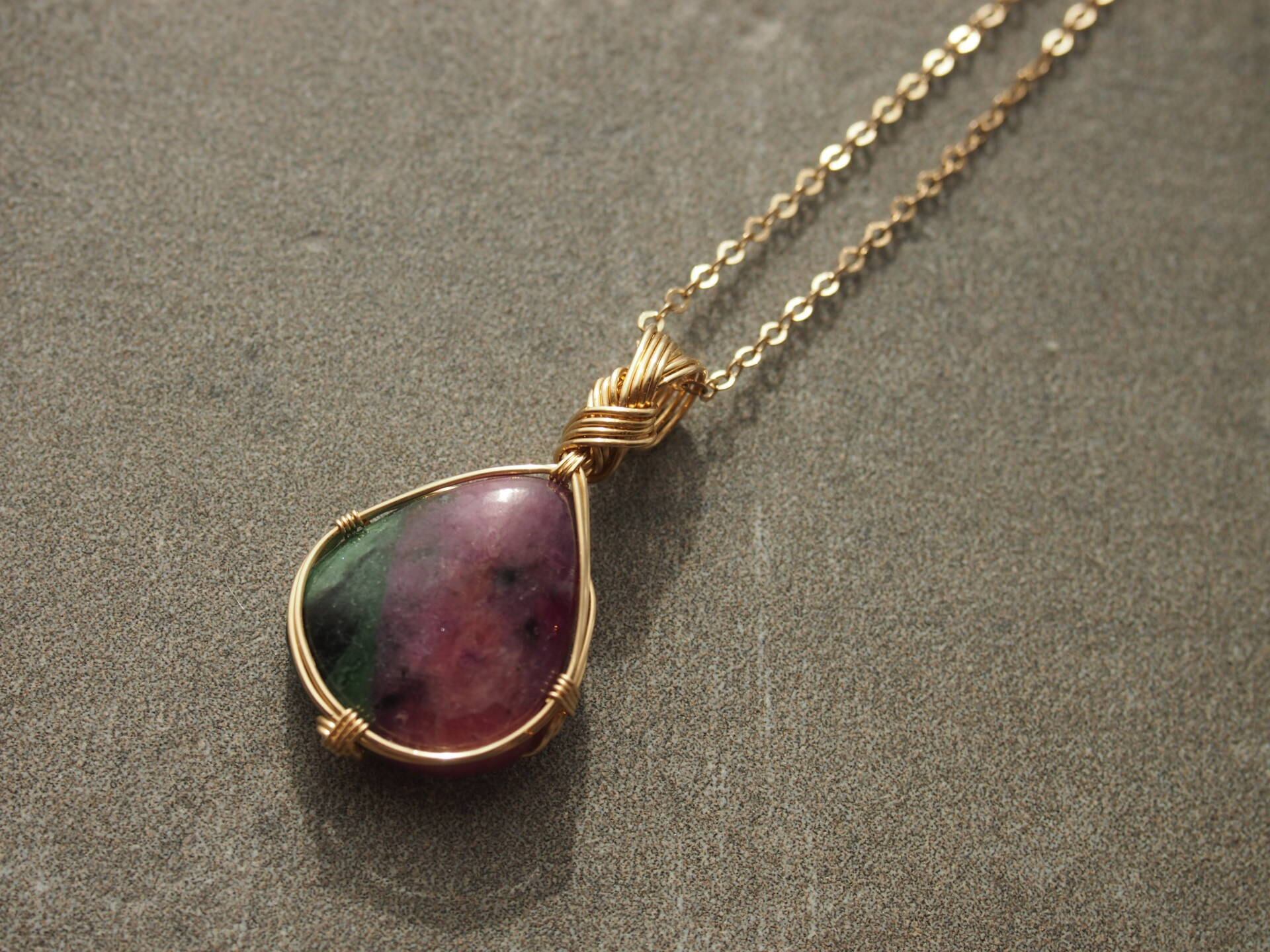 ルビーインゾイサイトの雫型カットを14kgfワイヤーで繊細に女神巻きペンダントトップに仕上げました♡