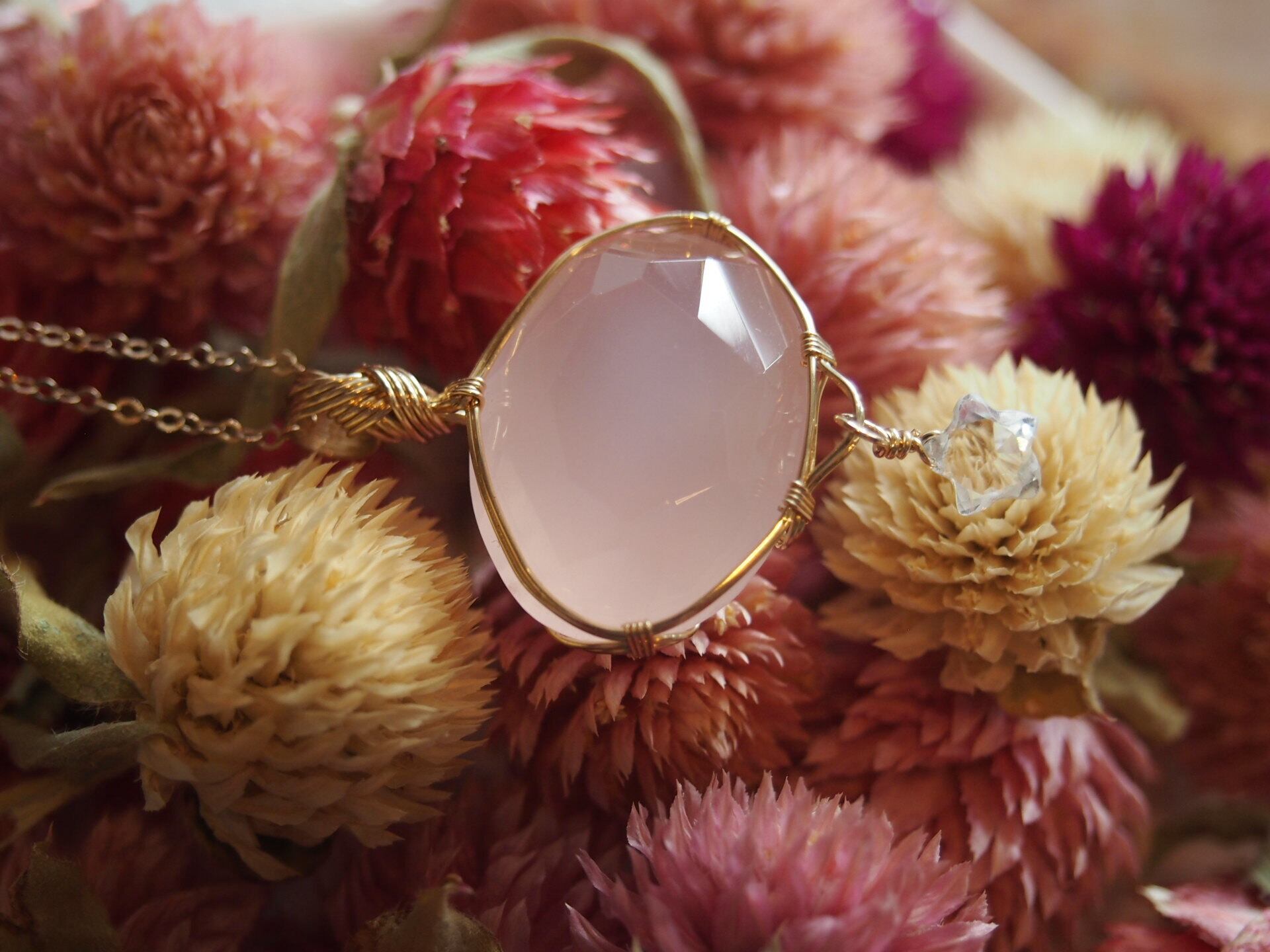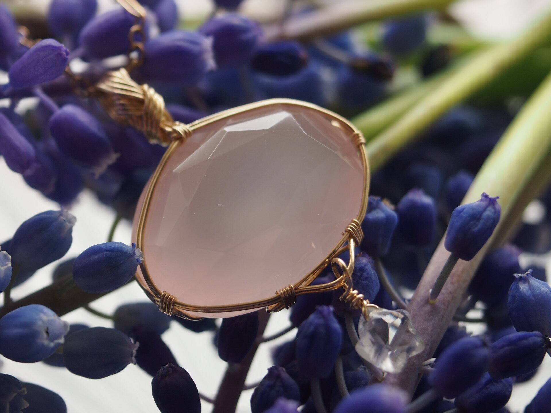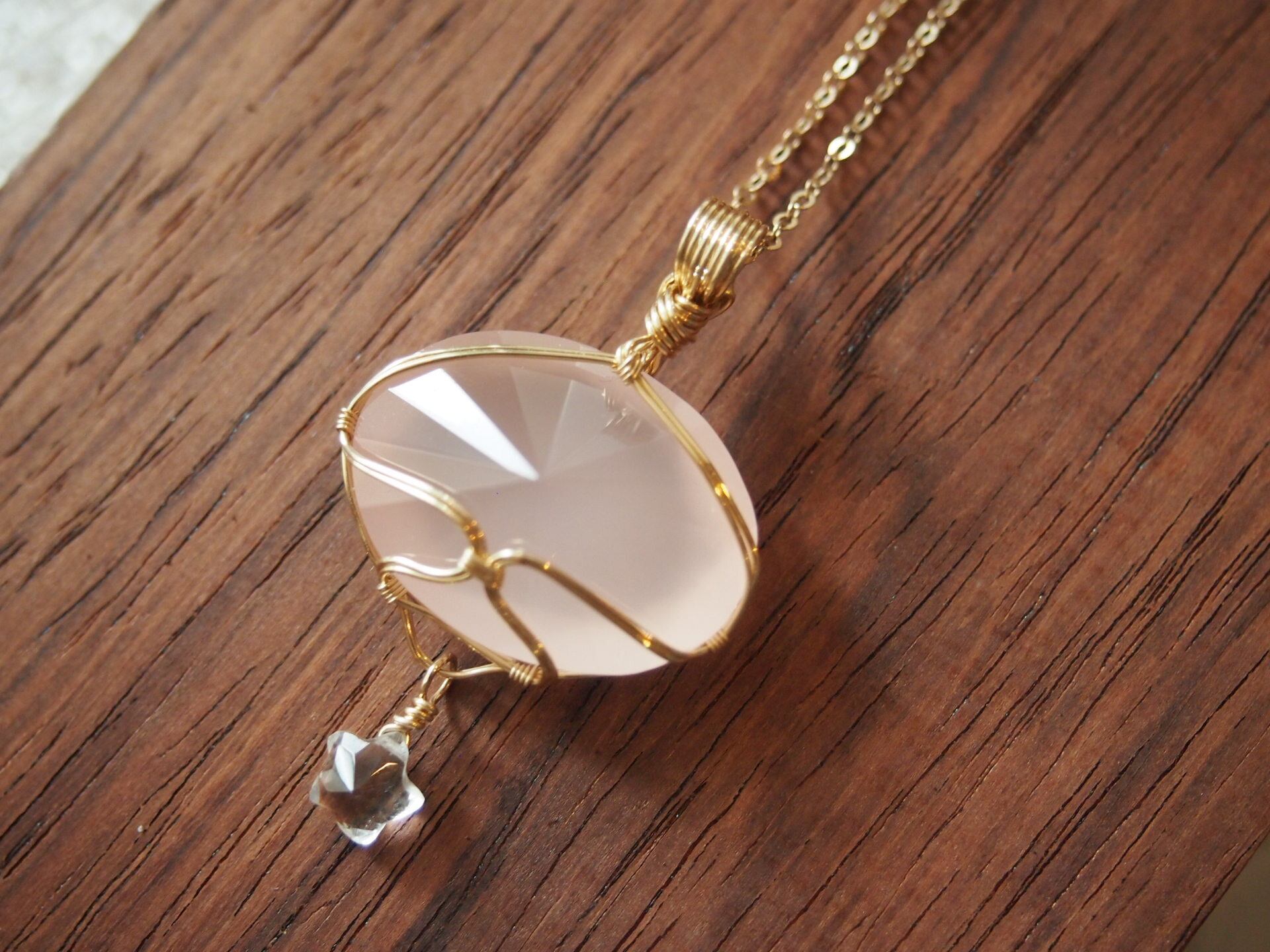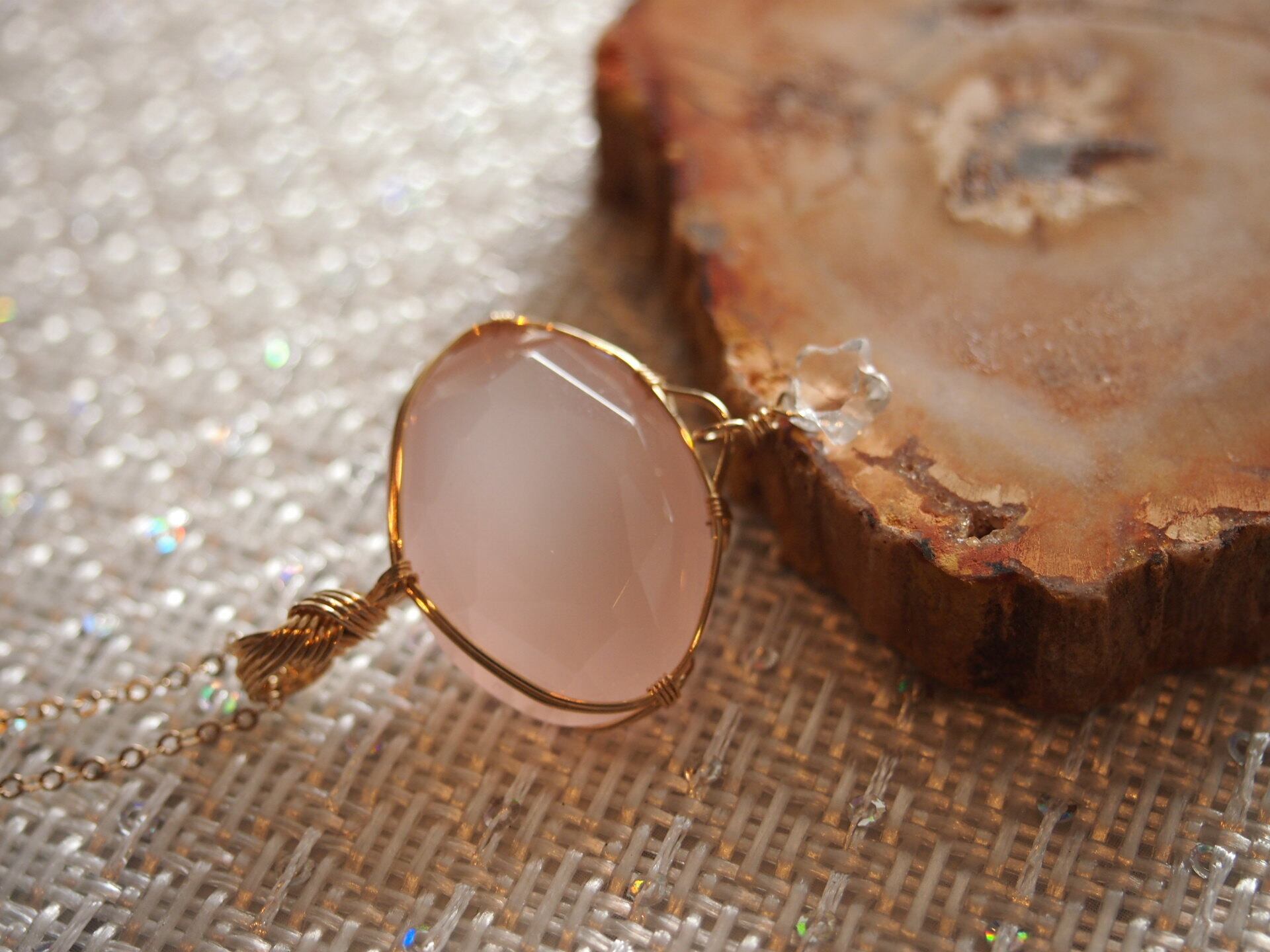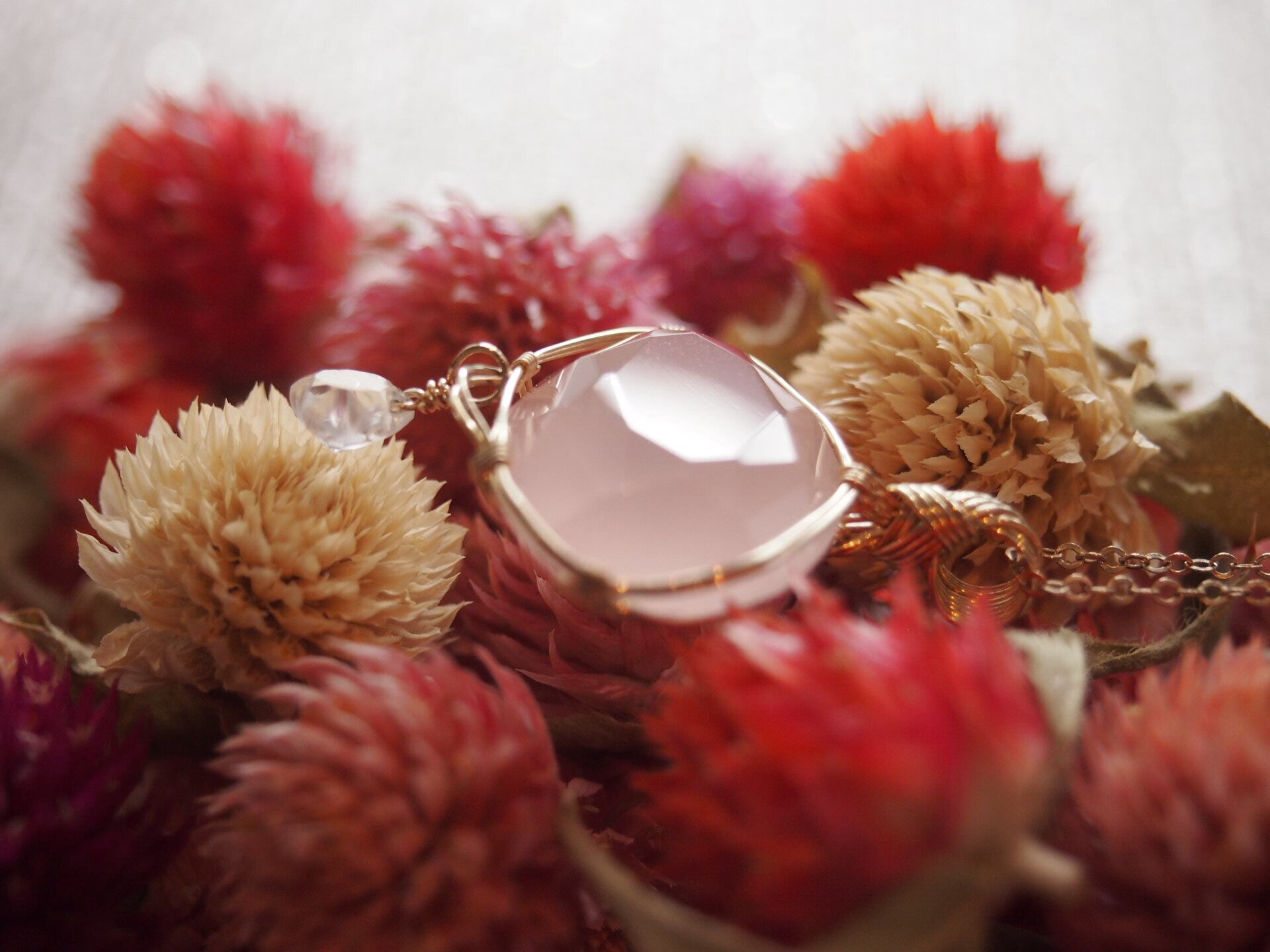 ファセットカット風のローズクォーツを14kgfワイヤーで繊細に女神巻きペンダントトップに仕上げました♡