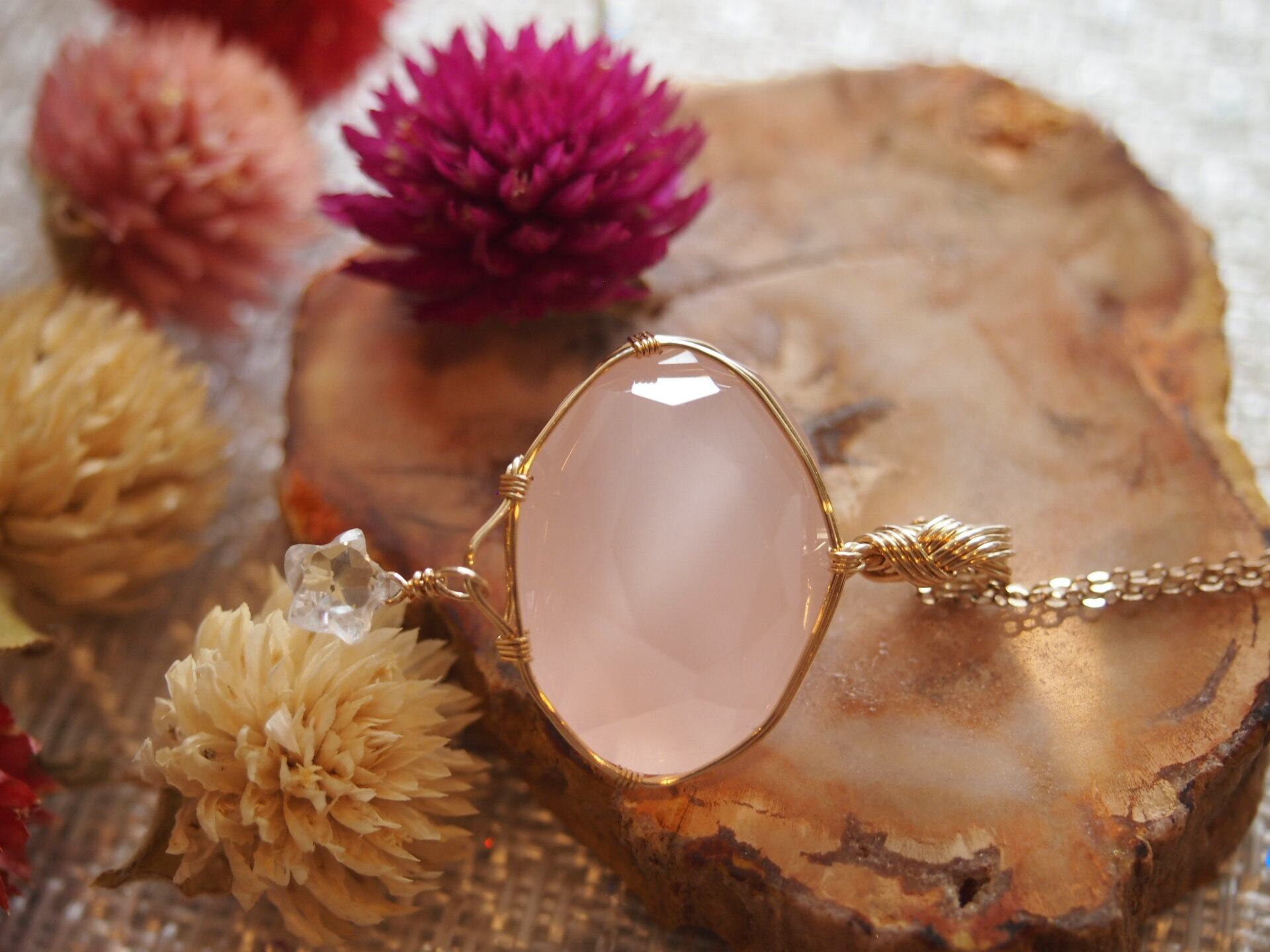 石の種類:ローズクォーツ(下のスターカットは水晶です)