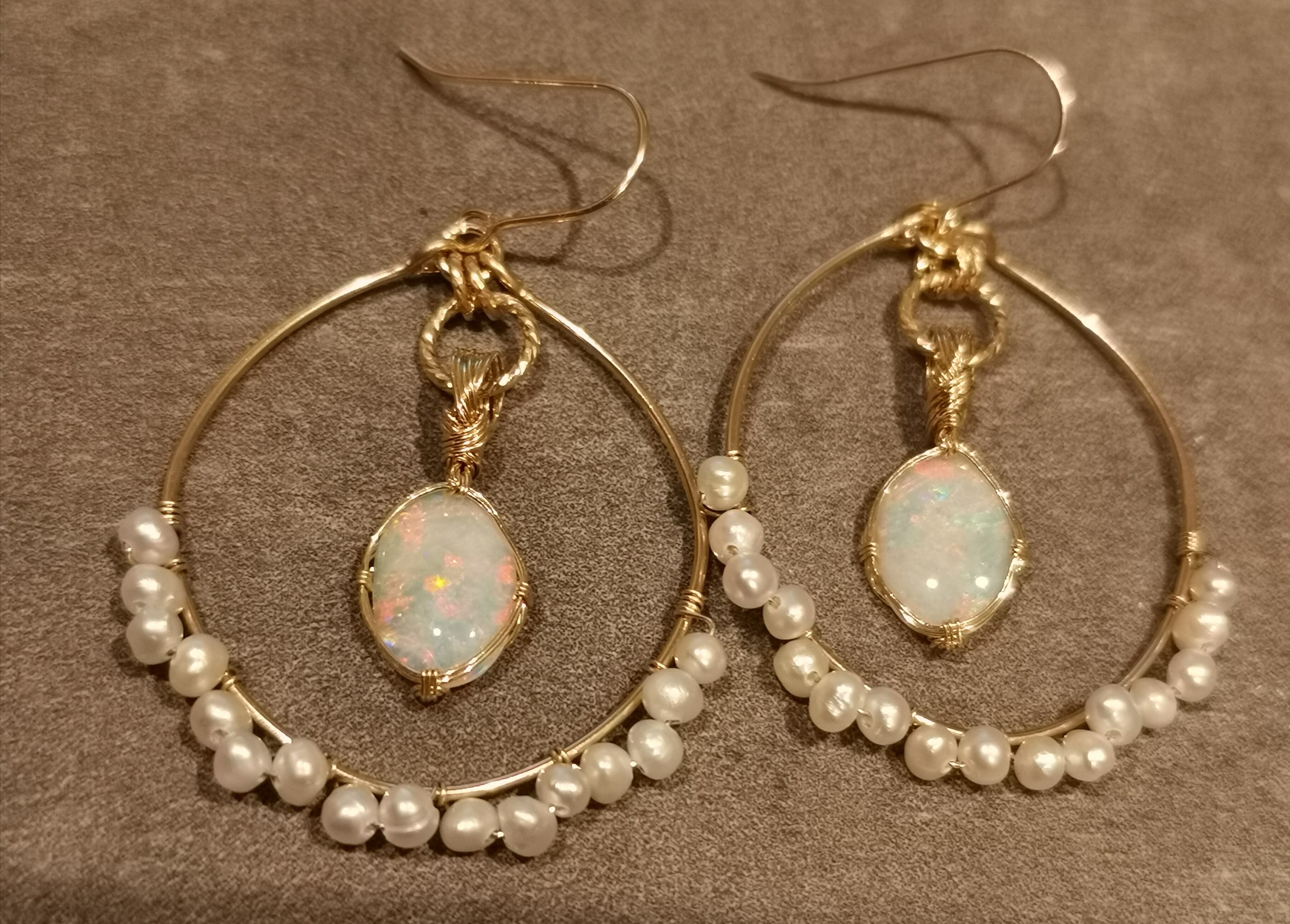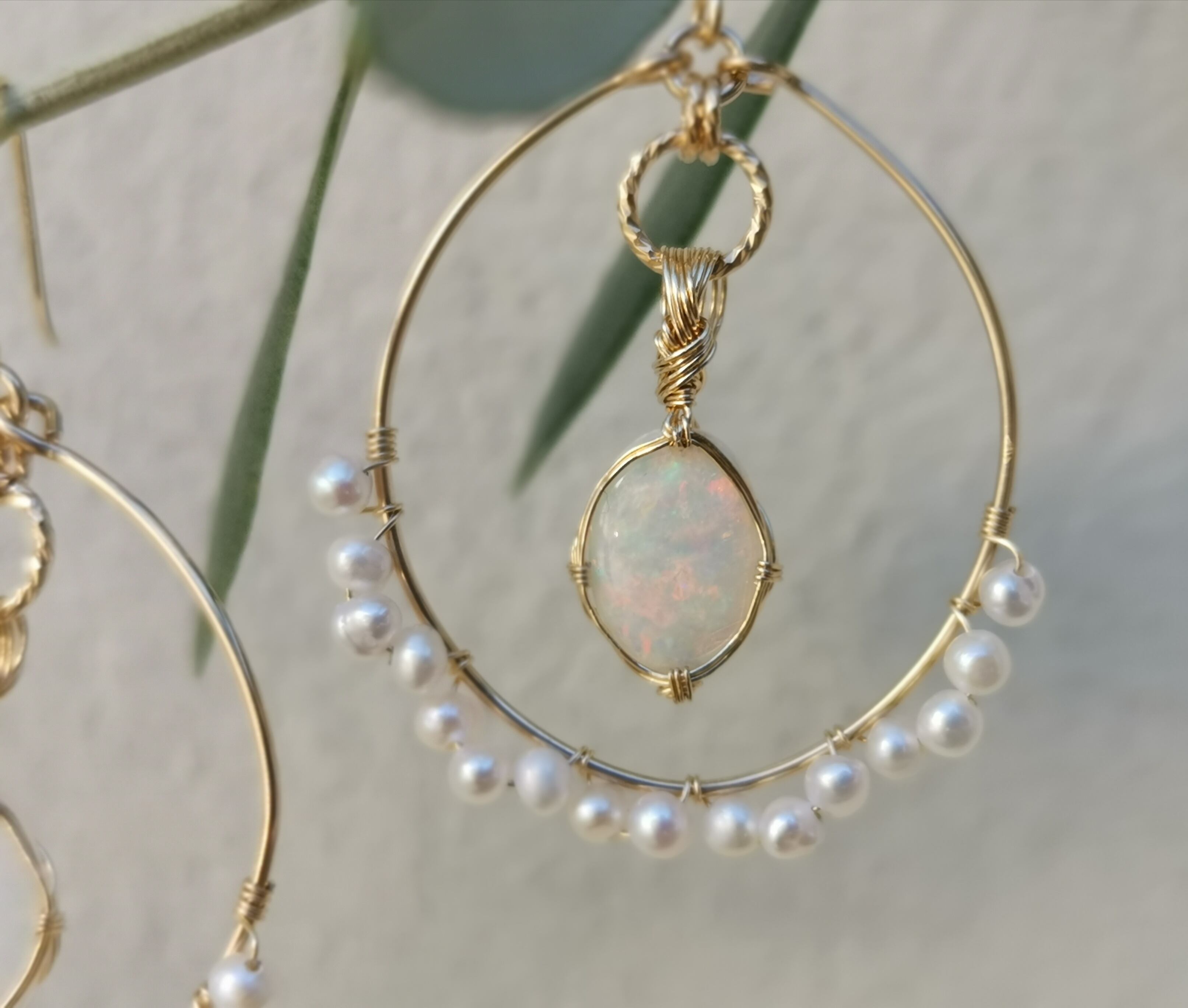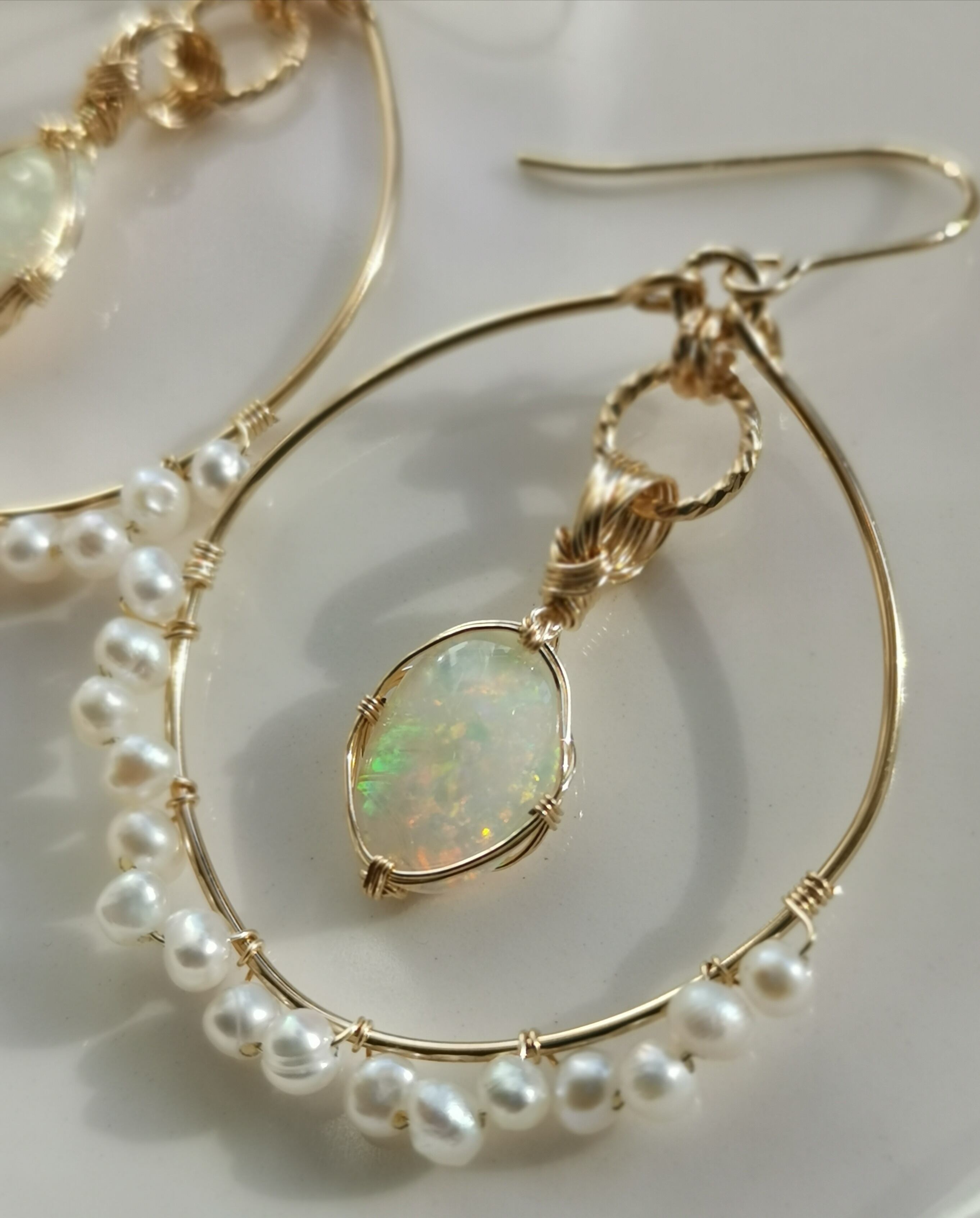 小さなホワイトオパールを14kgfワイヤーで繊細に女神巻きにし、淡水パールと合わせて揺れるピアスに仕上げました♡