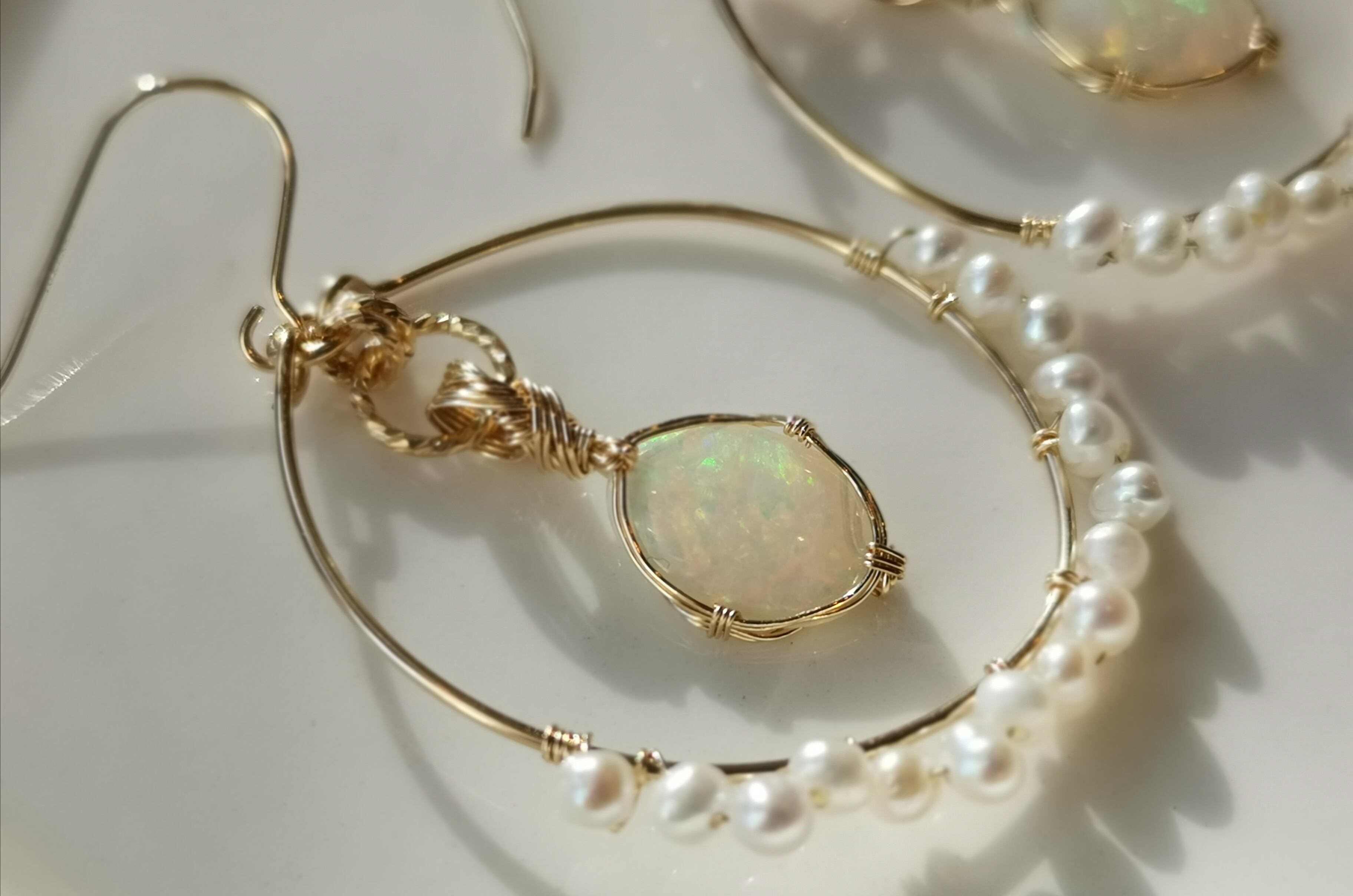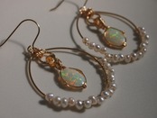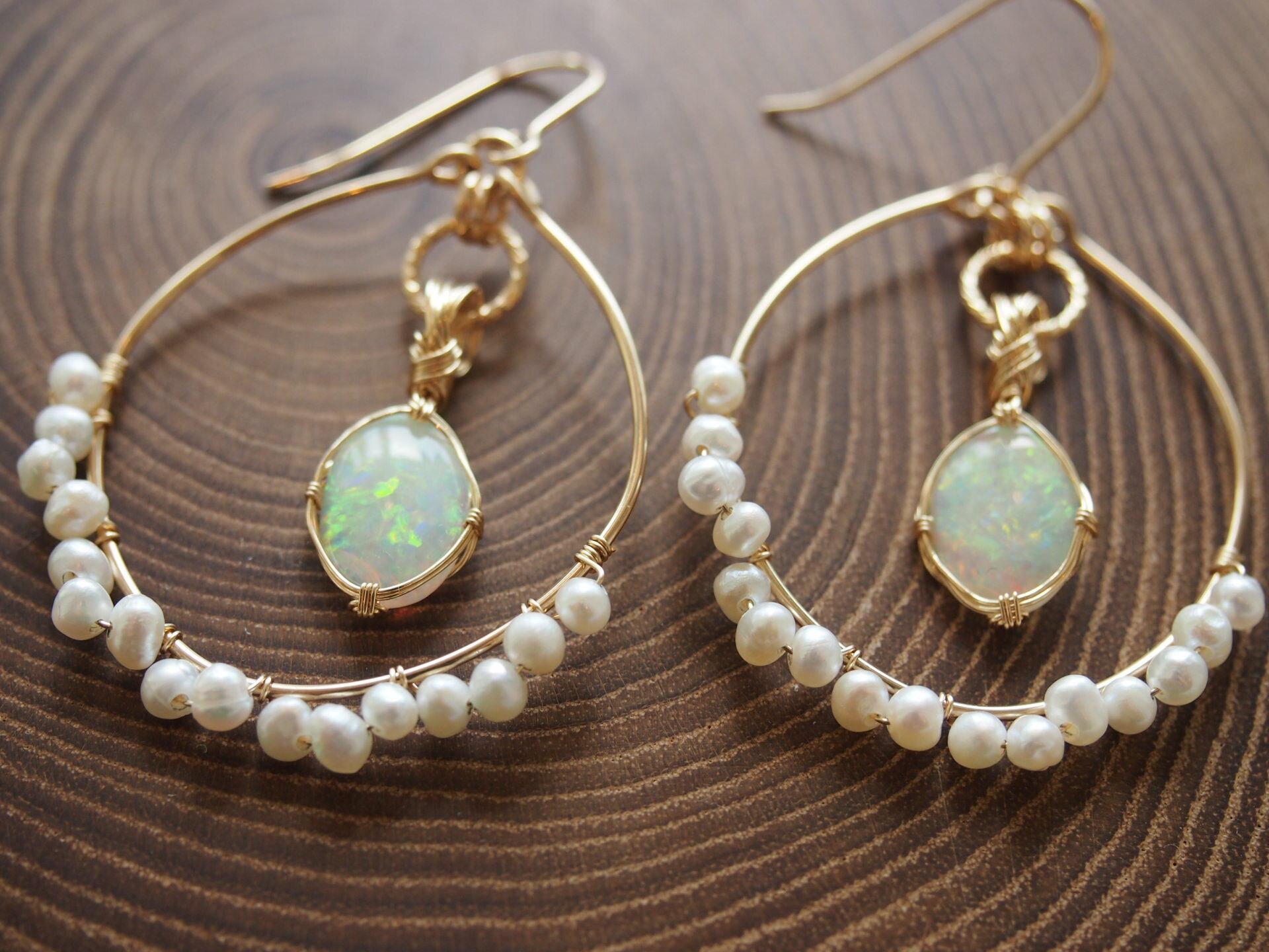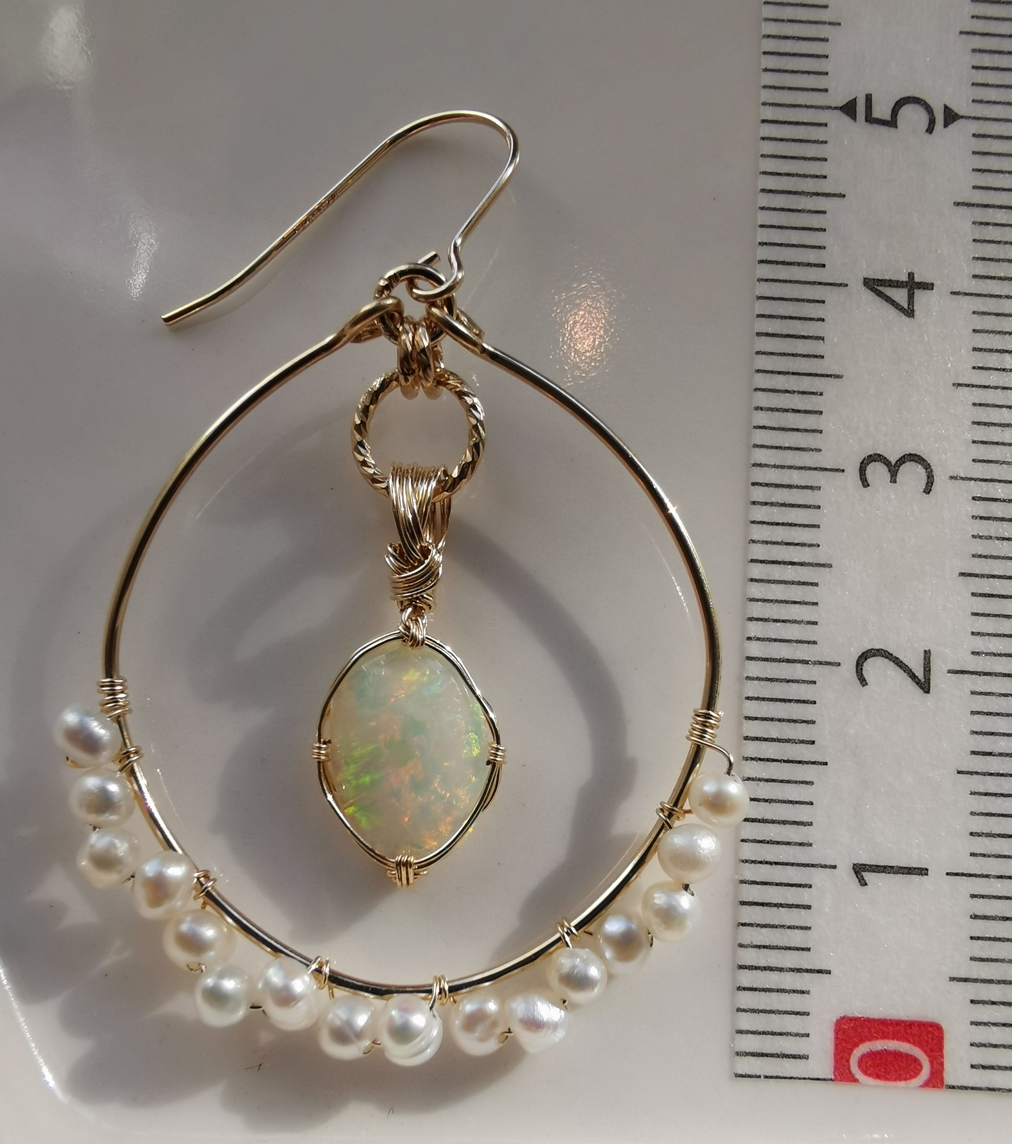 小さなホワイトオパールを14kgfワイヤーで繊細に女神巻きにし、淡水パールと合わせて揺れるピアスに仕上げました♡