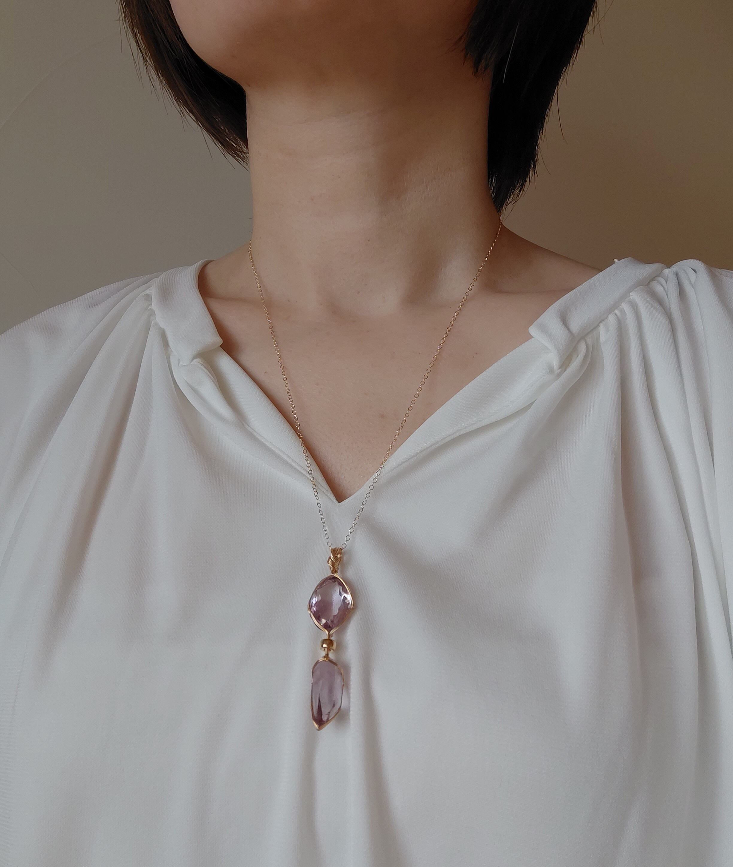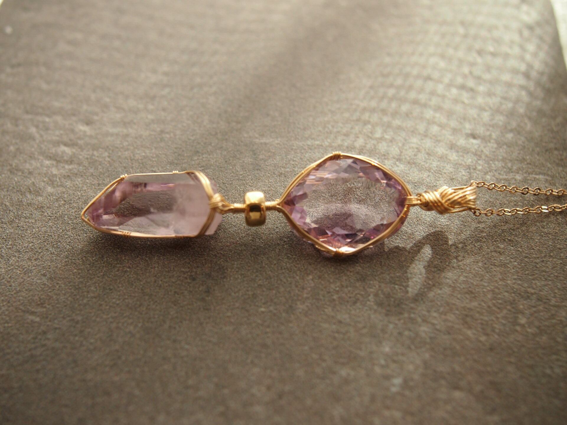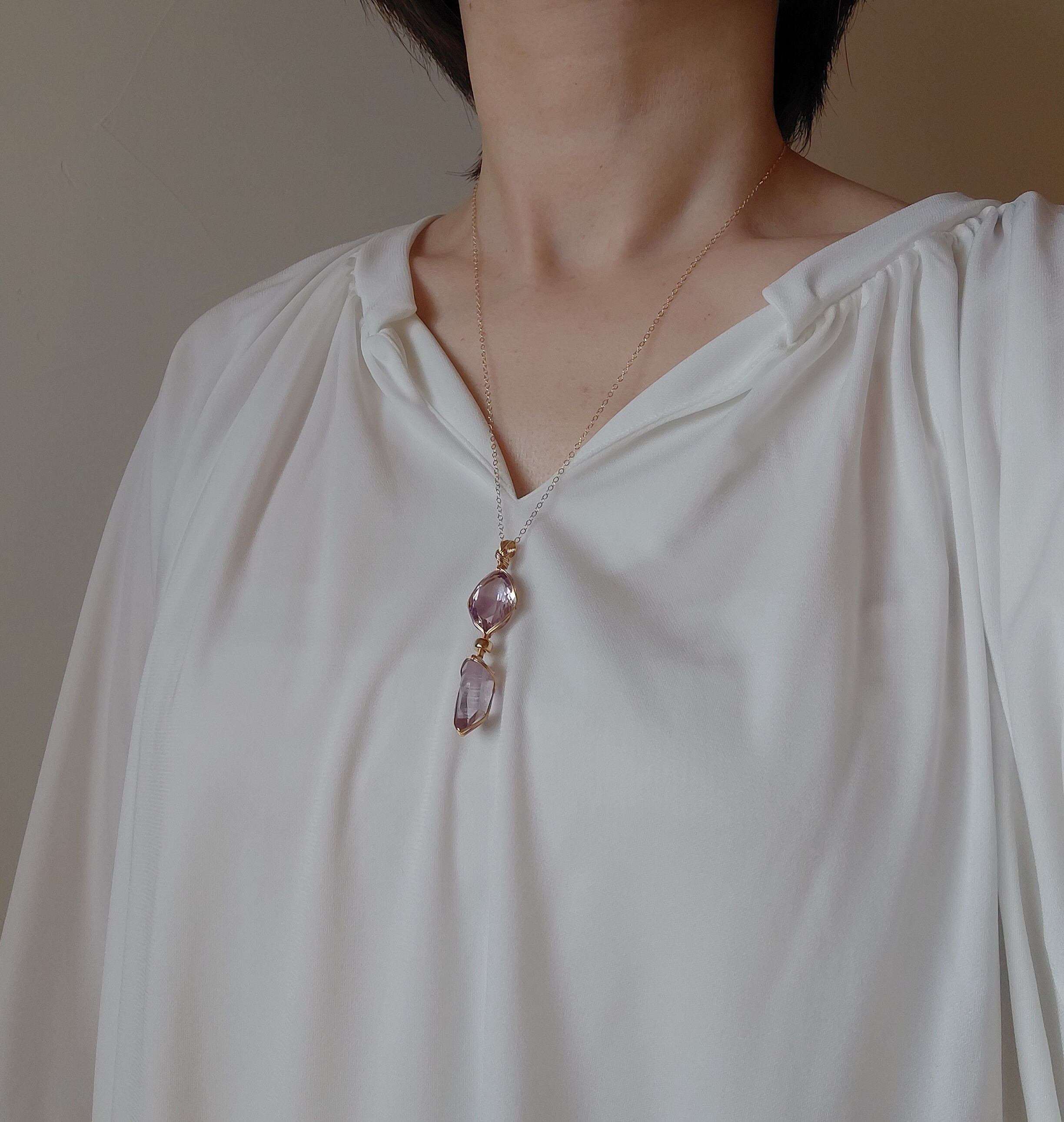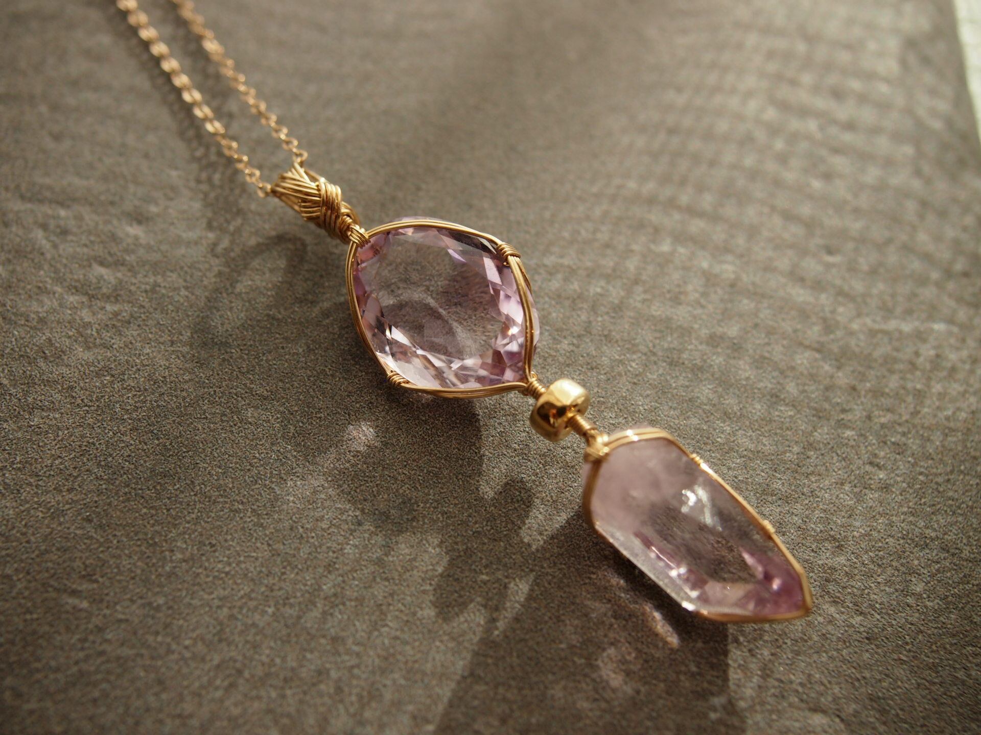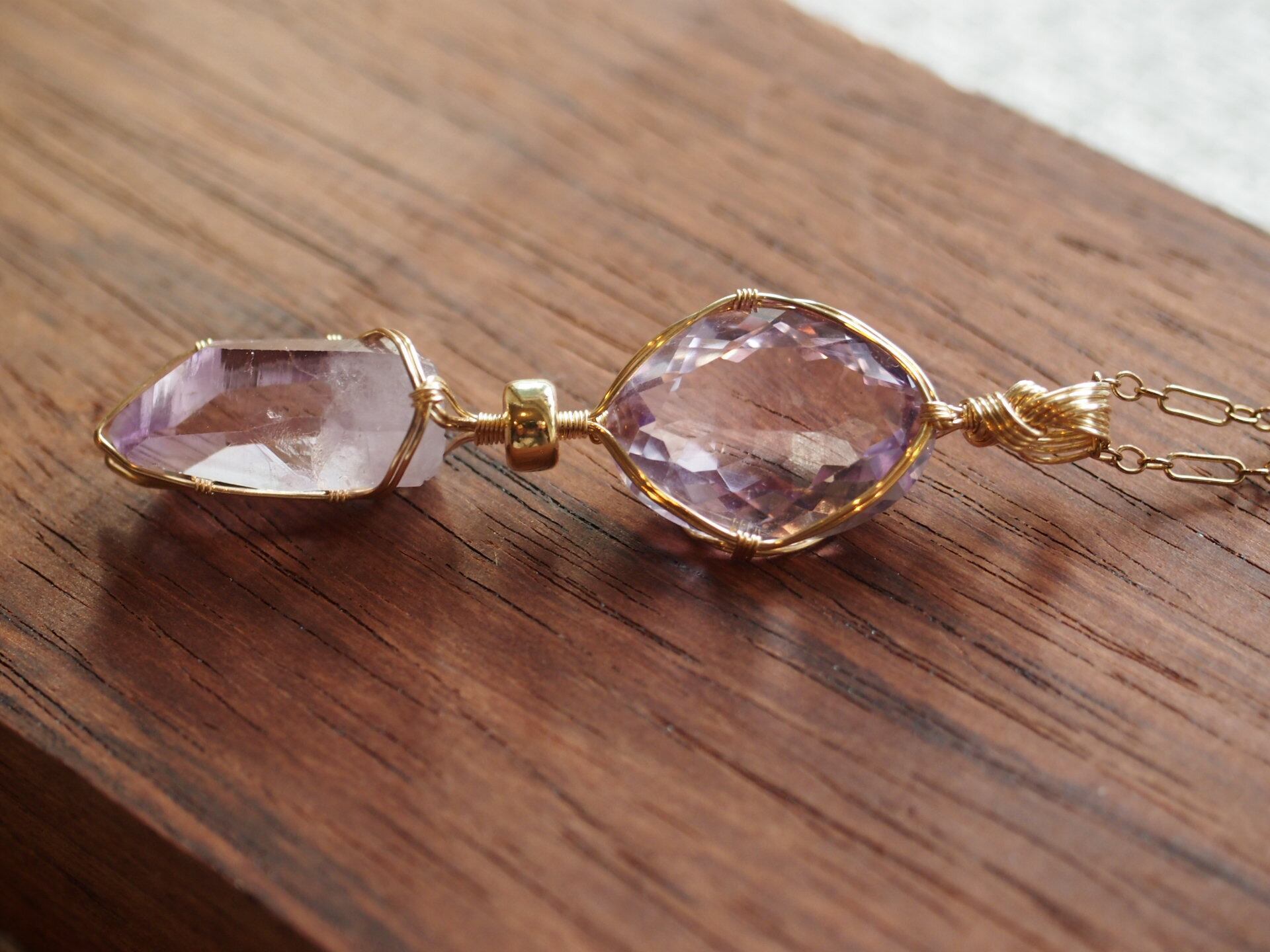 オーバルのファセットカットのアメシストと、小さなベラクルスアメシストの2つを14kgfワイヤーで繊細に女神巻きペンダントトップに仕上げました♡