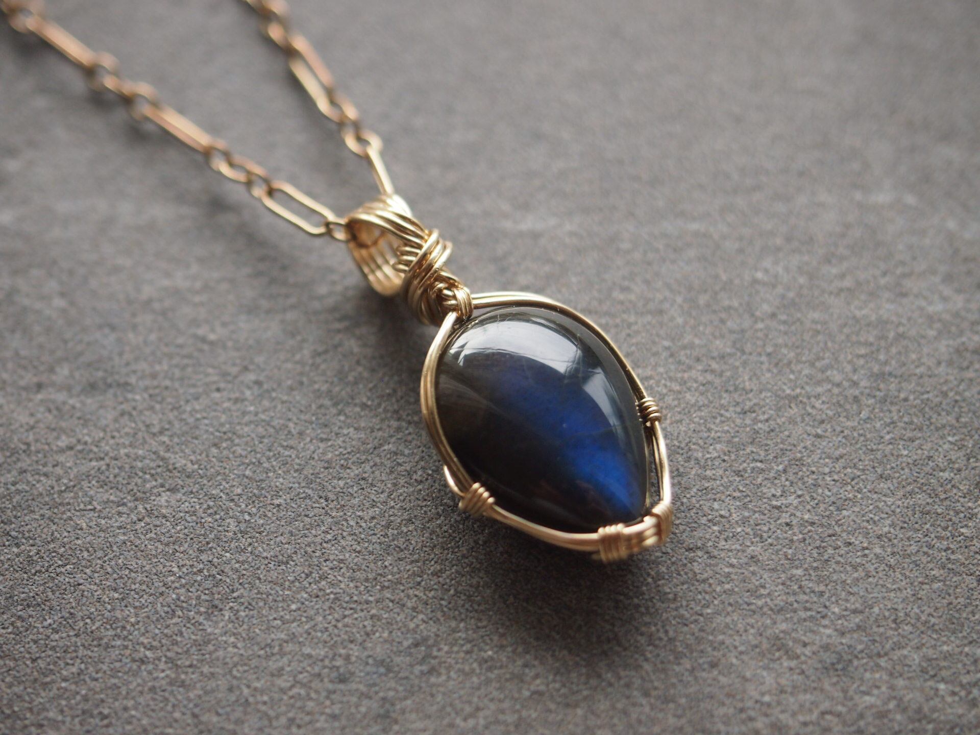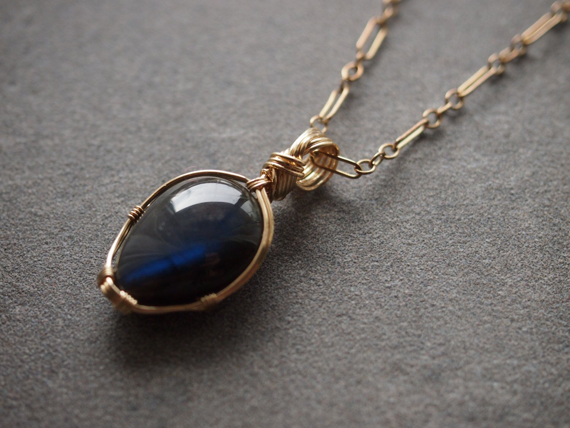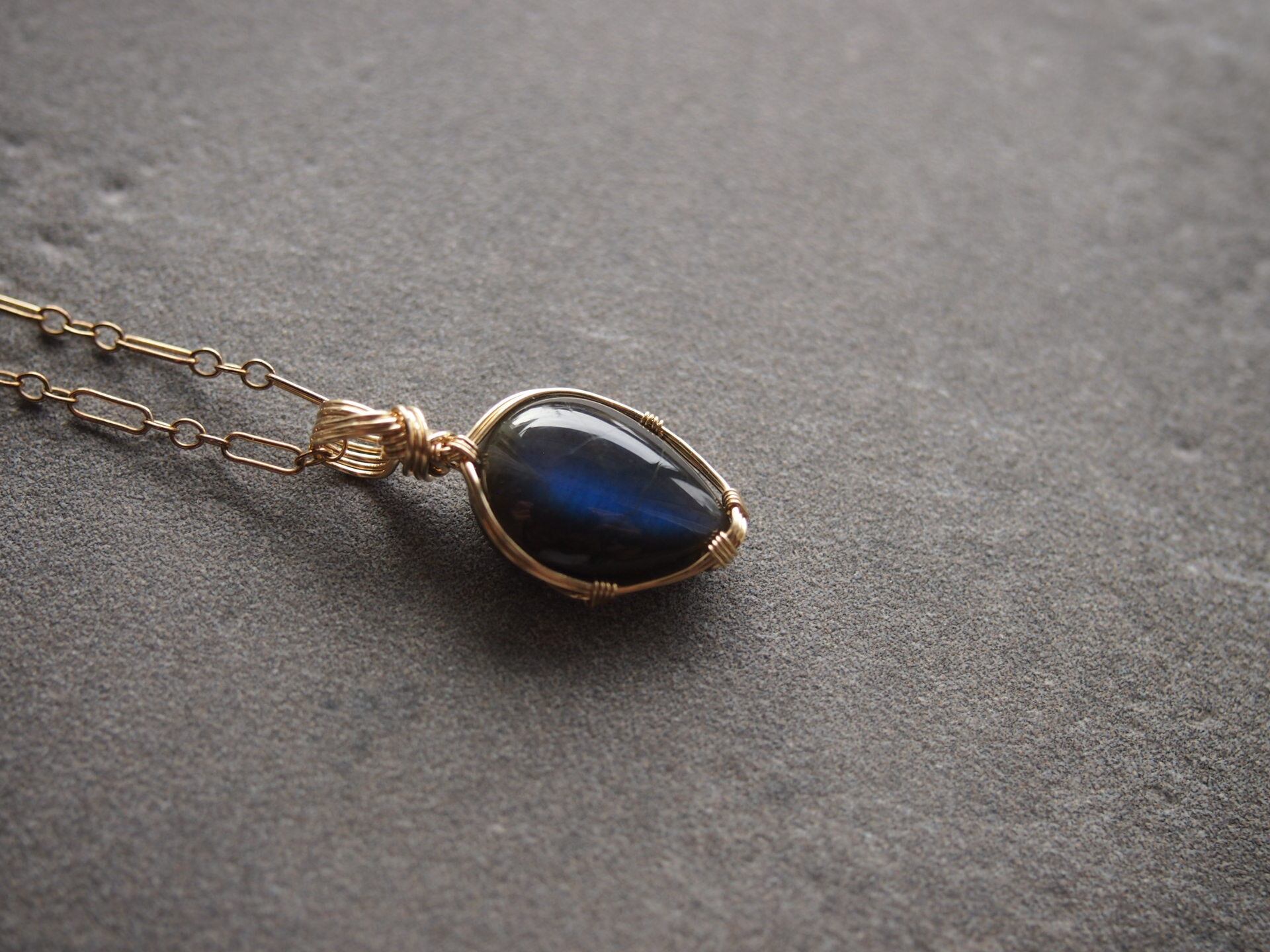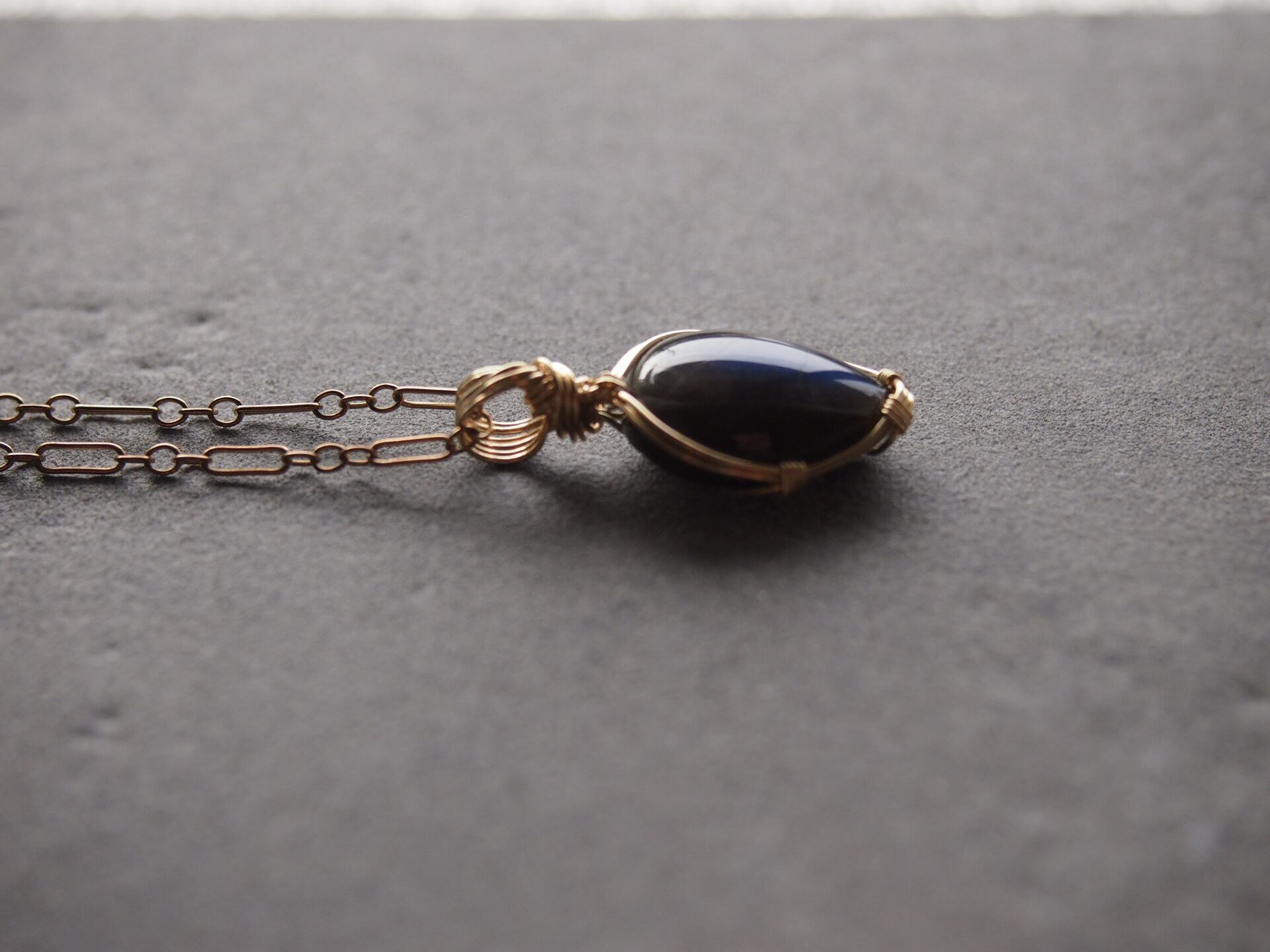 ペアシェイプカボションカットのブラックラブラドライトを14kgfワイヤーで繊細に女神巻きペンダントトップに仕上げました♡