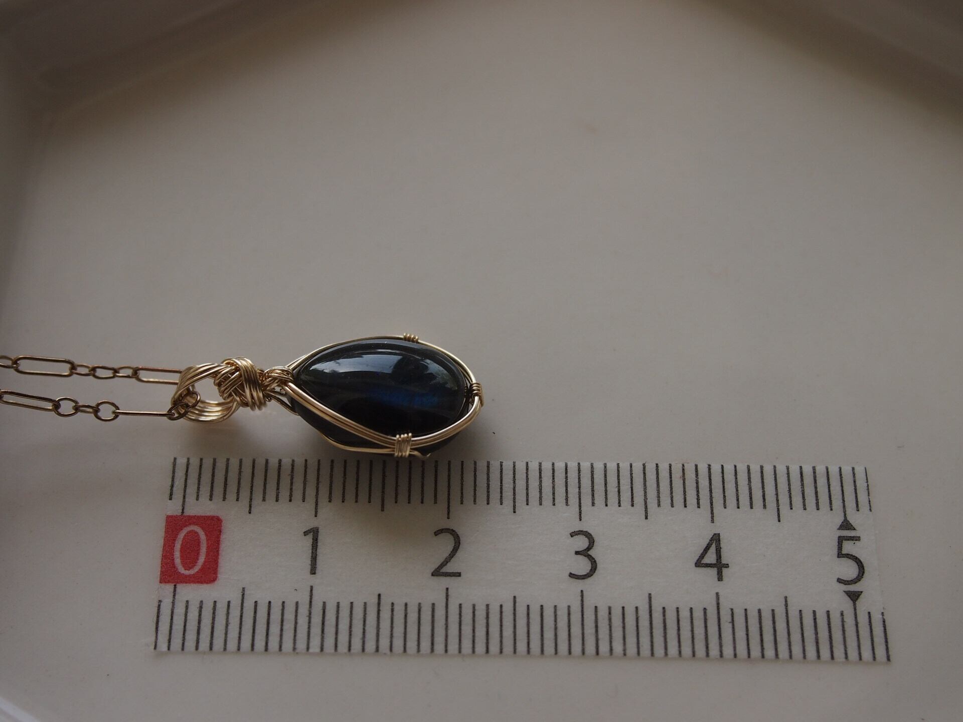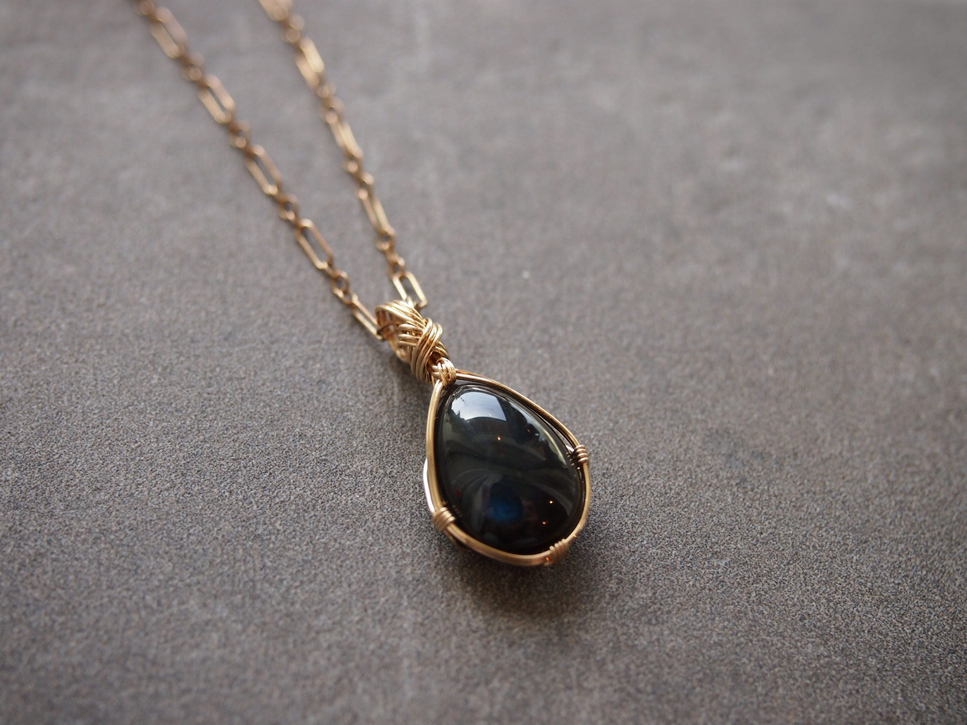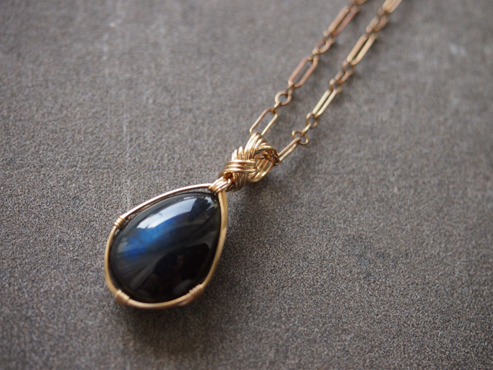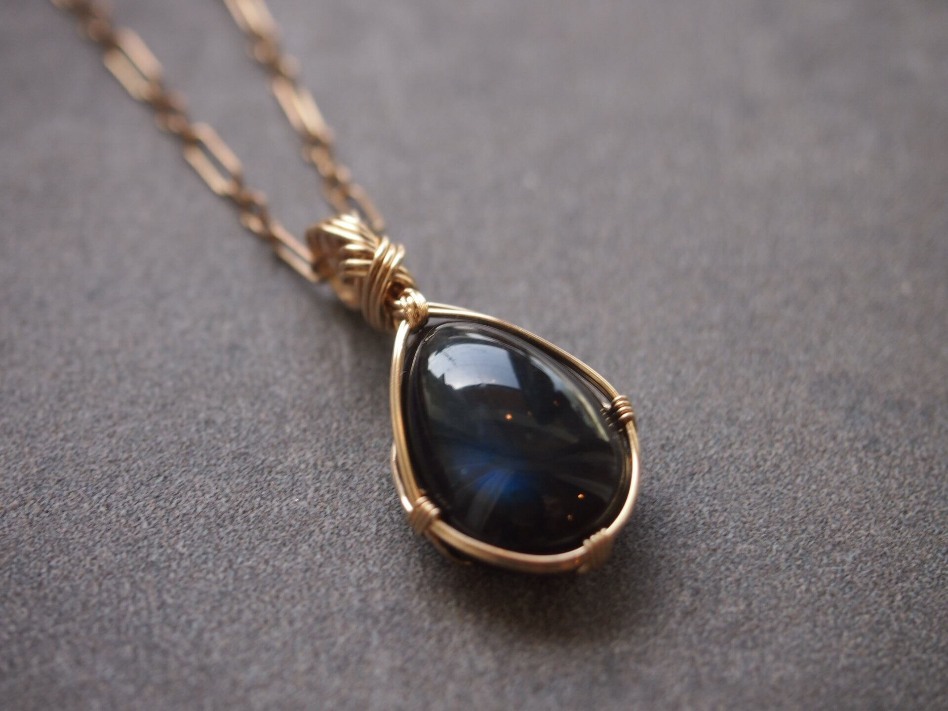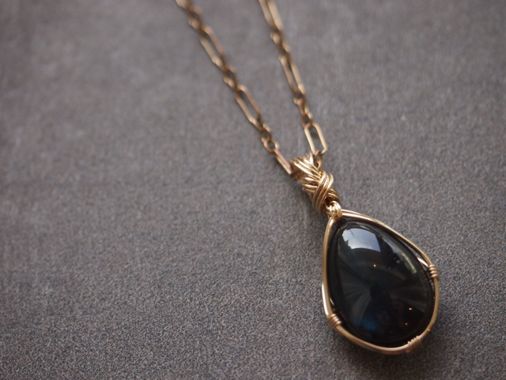 ペアシェイプカボションカットのブラックラブラドライトを14kgfワイヤーで繊細に女神巻きペンダントトップに仕上げました♡