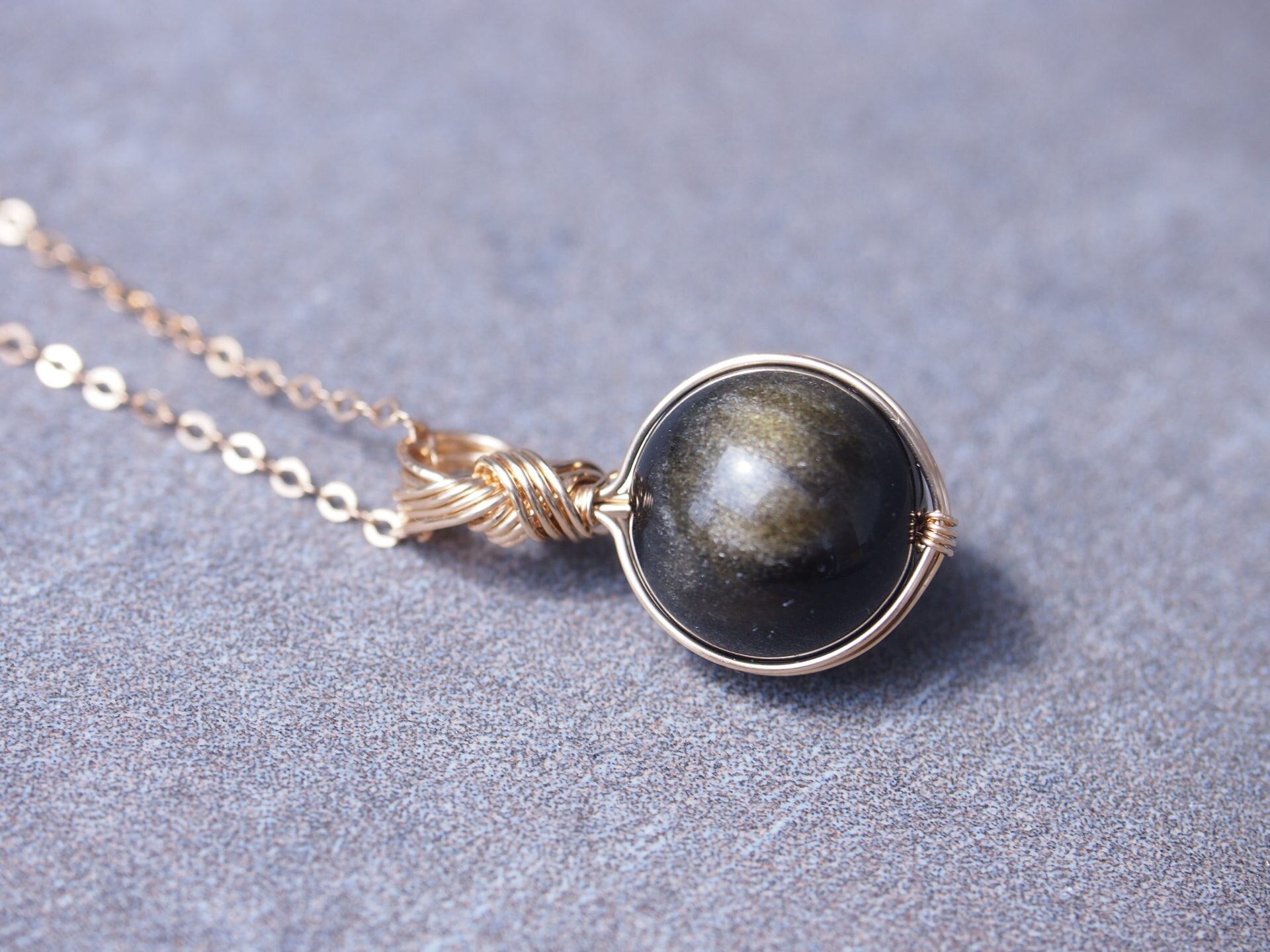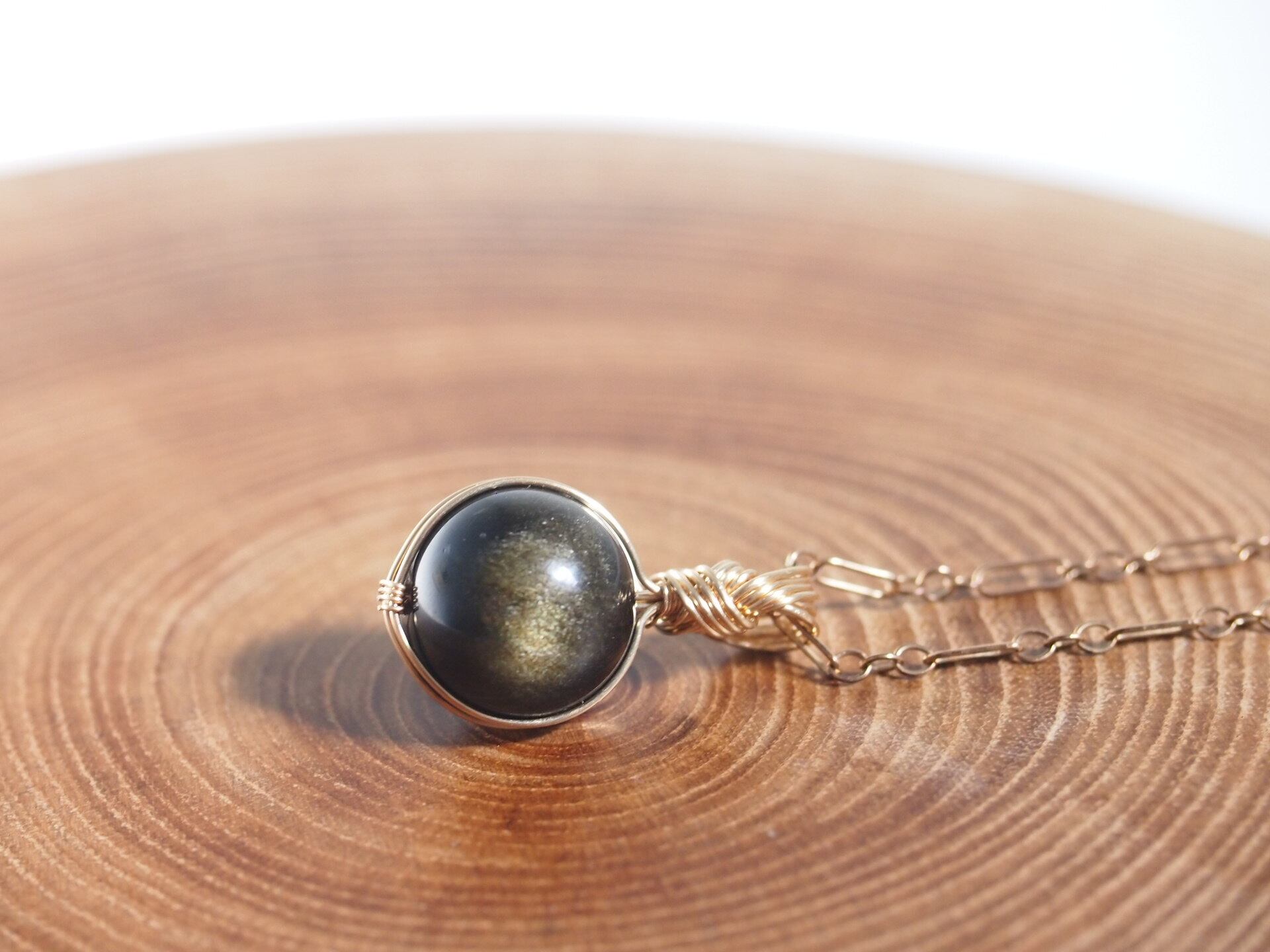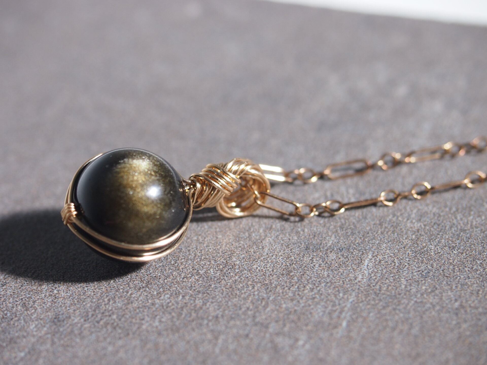 ゴールデンオブシディアンの10mmの丸玉を14kgfワイヤーで繊細に女神巻きペンダントトップに仕上げました♡