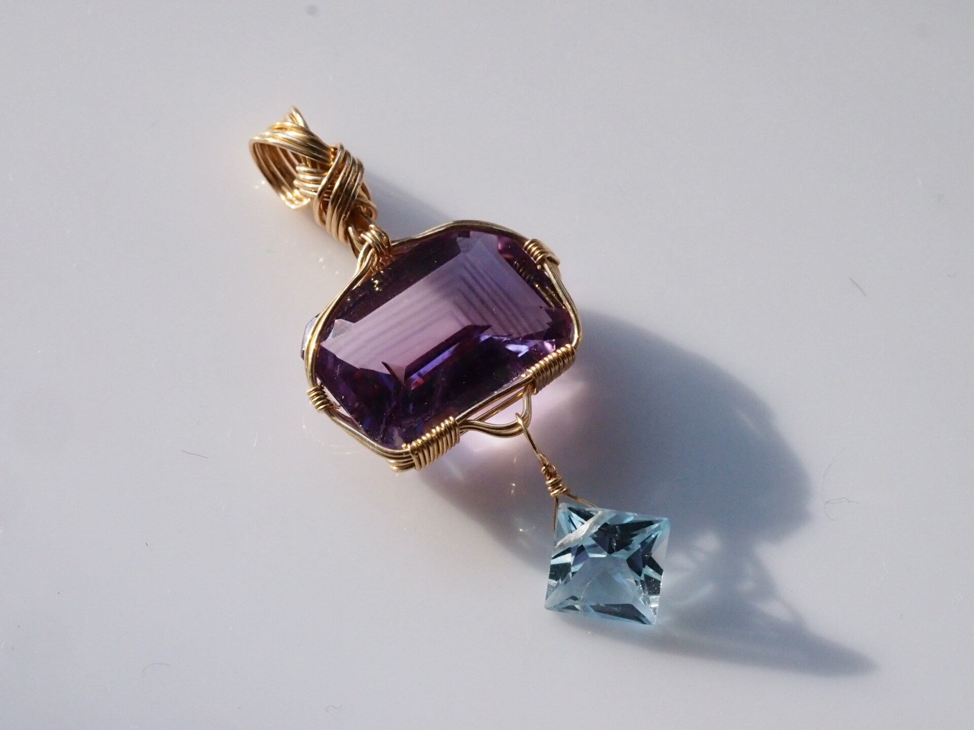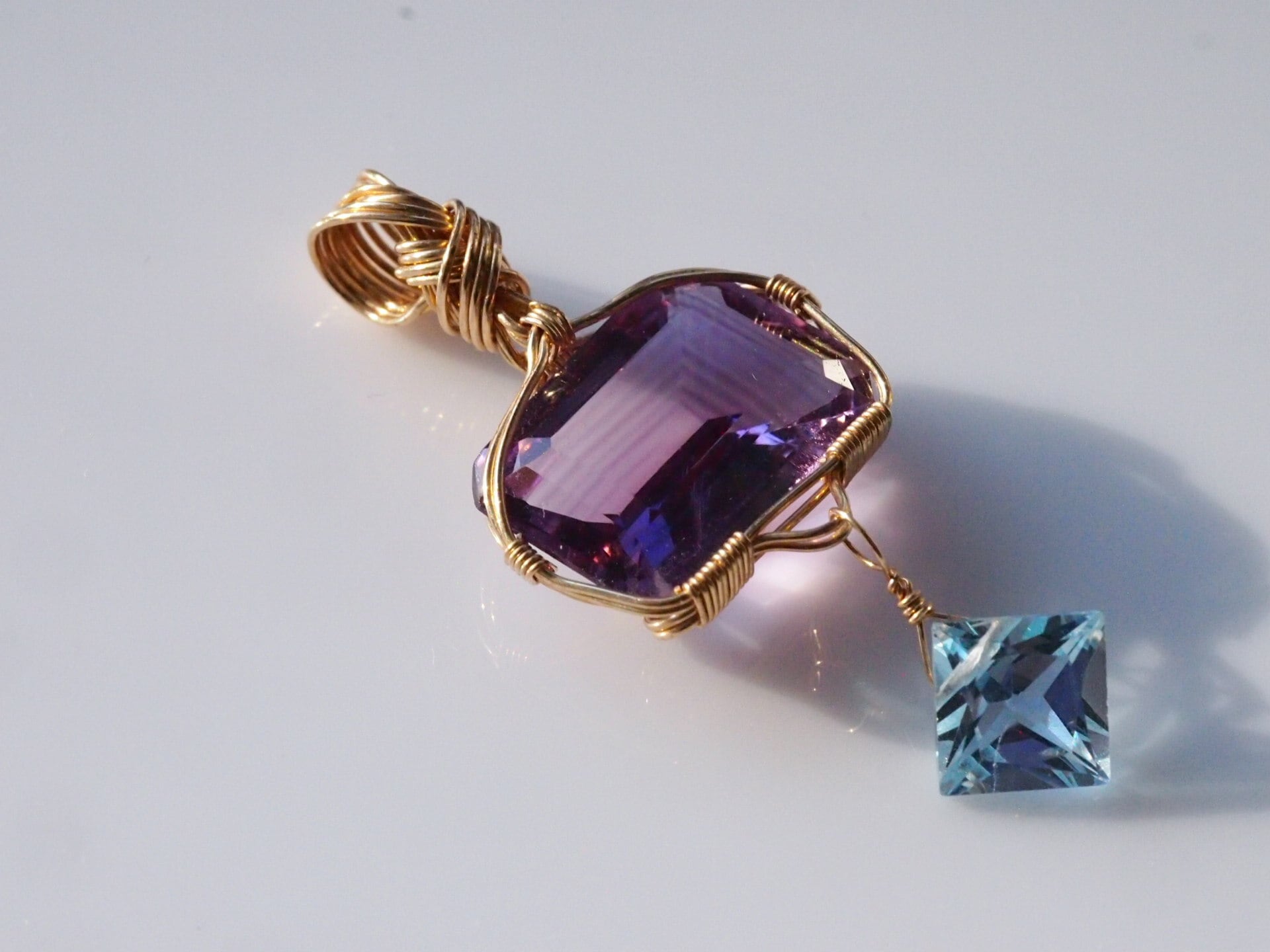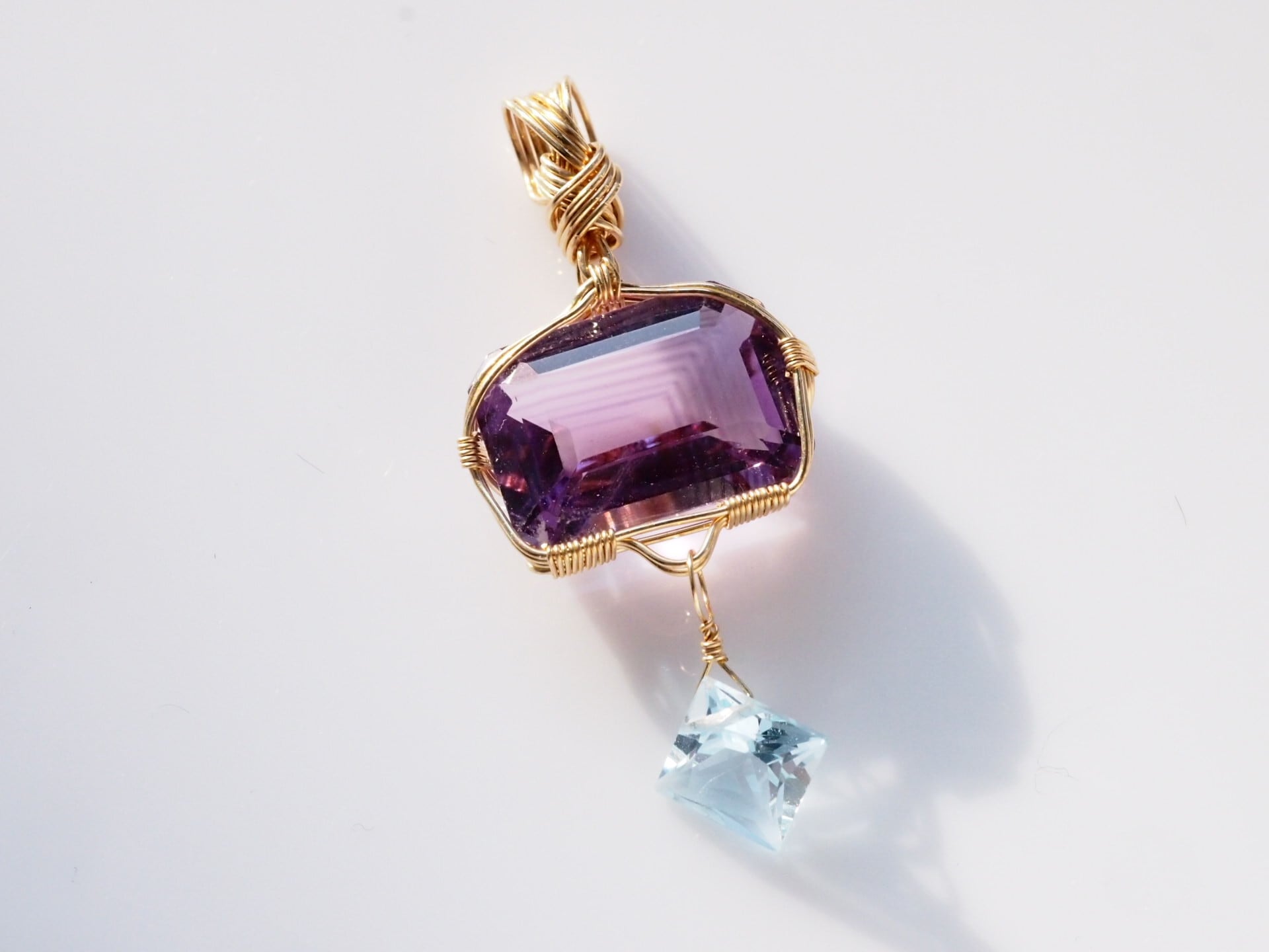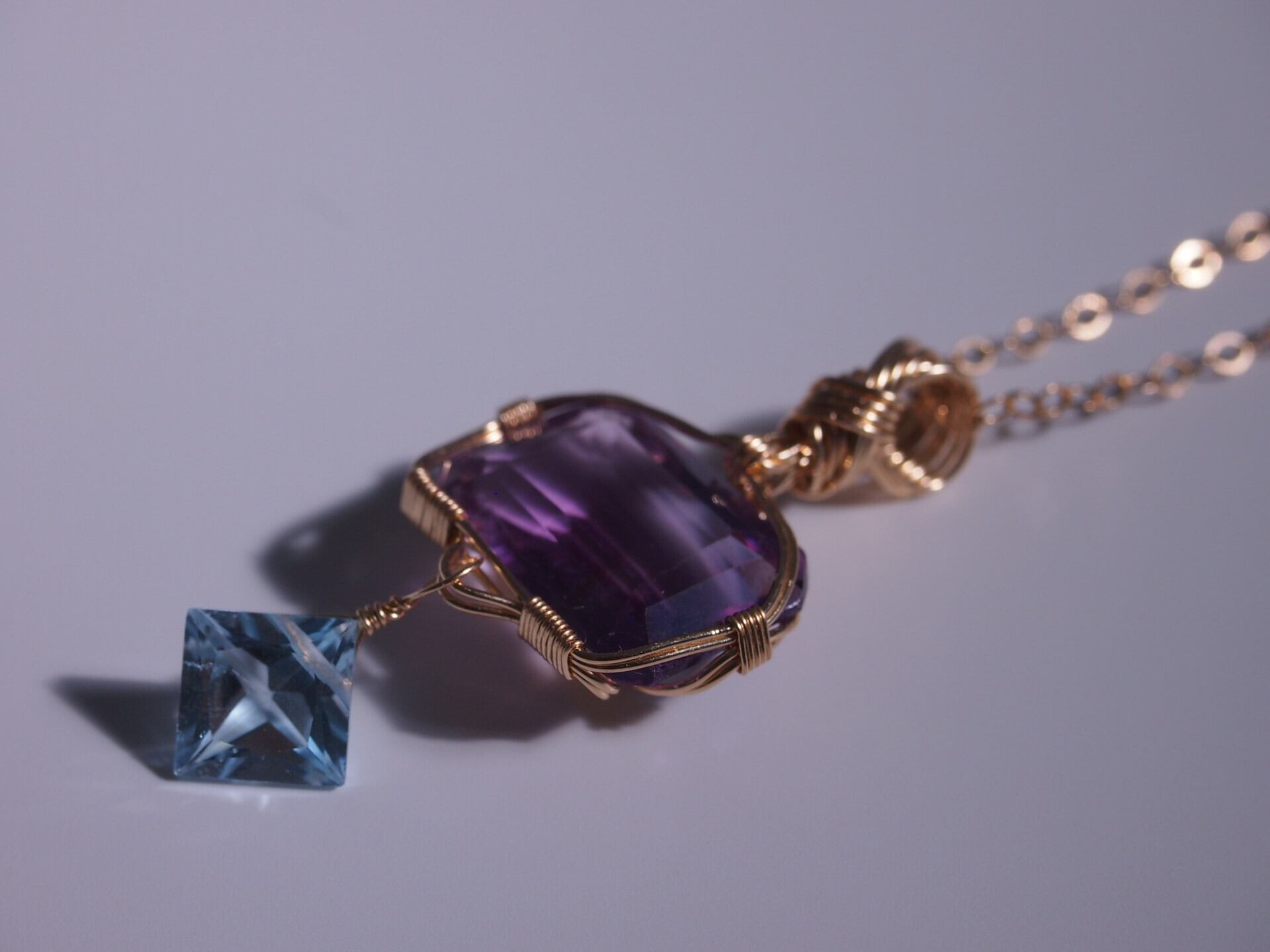 ファントムの入ったレクタングルカットのアメシストと、スカイブルートパーズを14kgfワイヤーで繊細に女神巻きペンダントトップに仕上げました♡