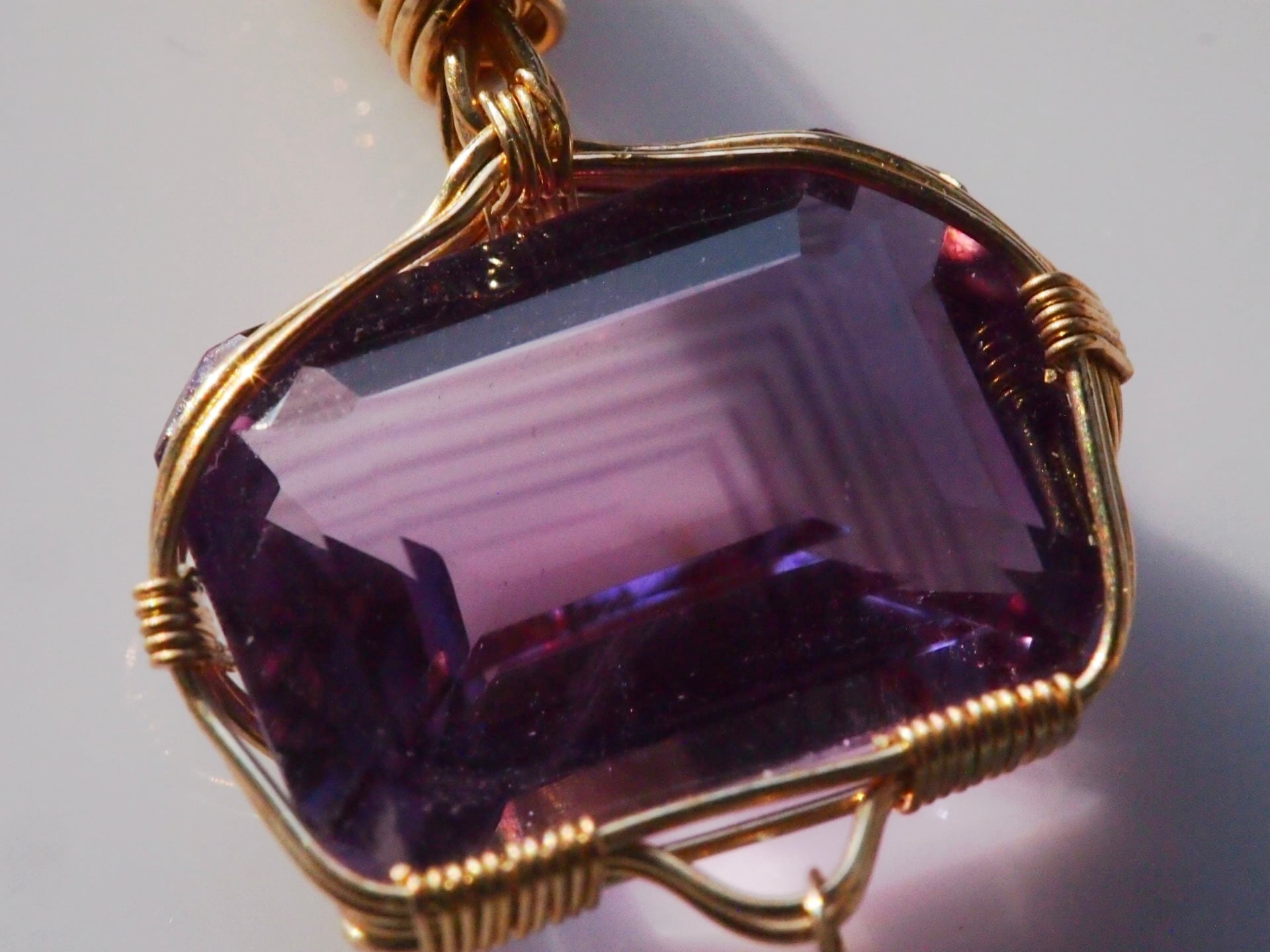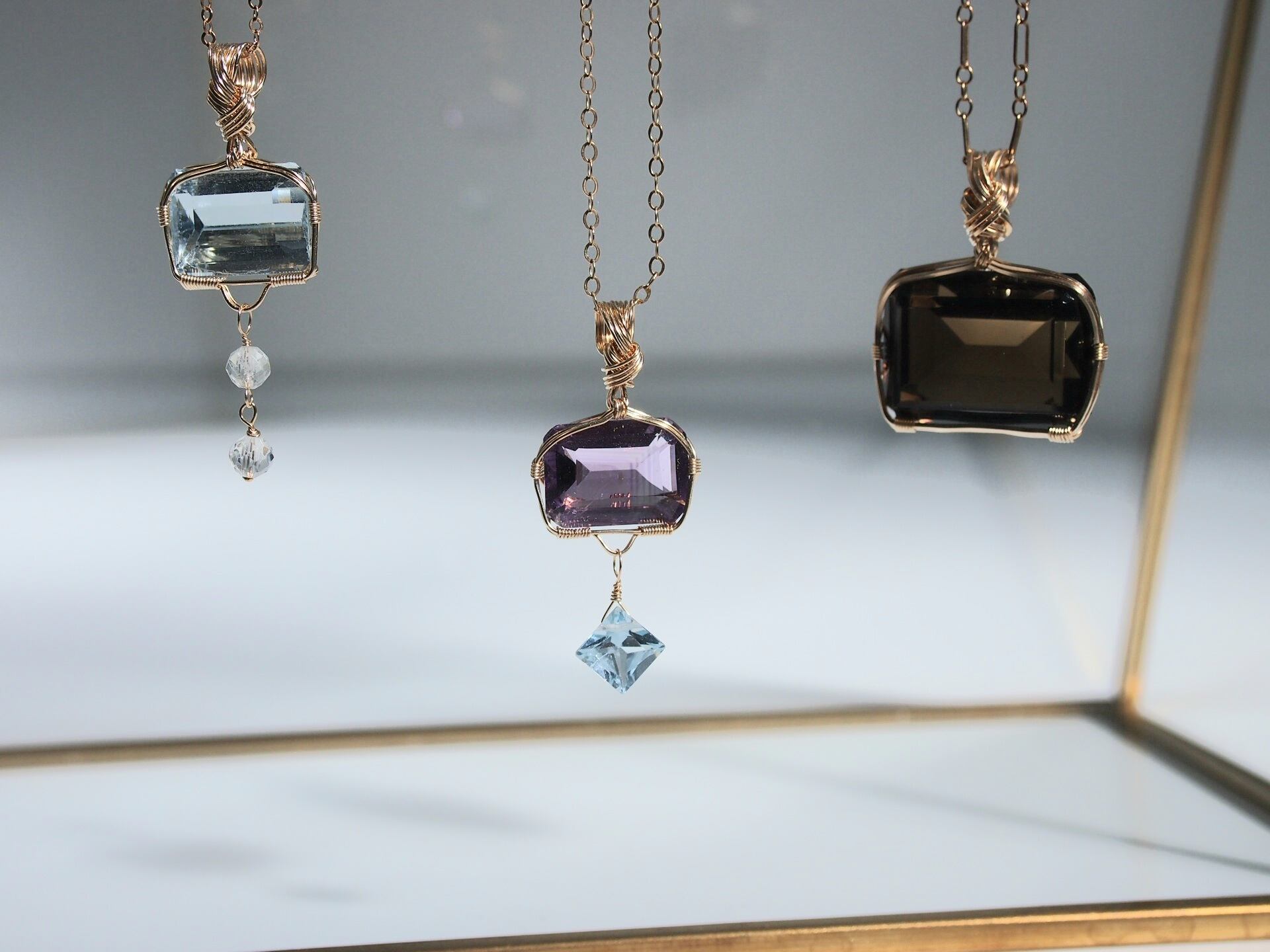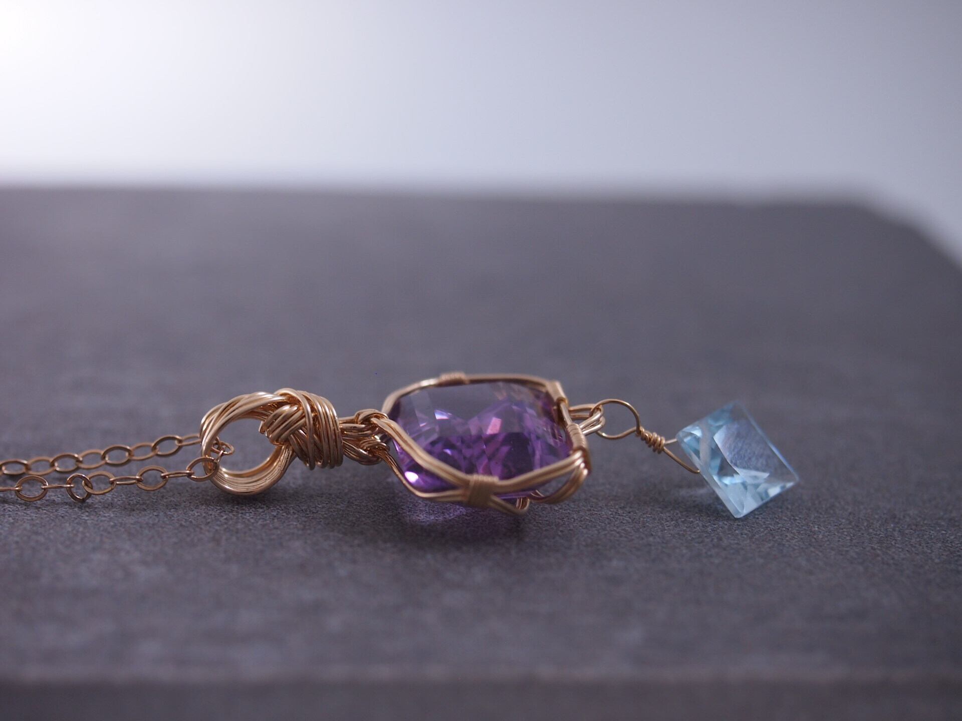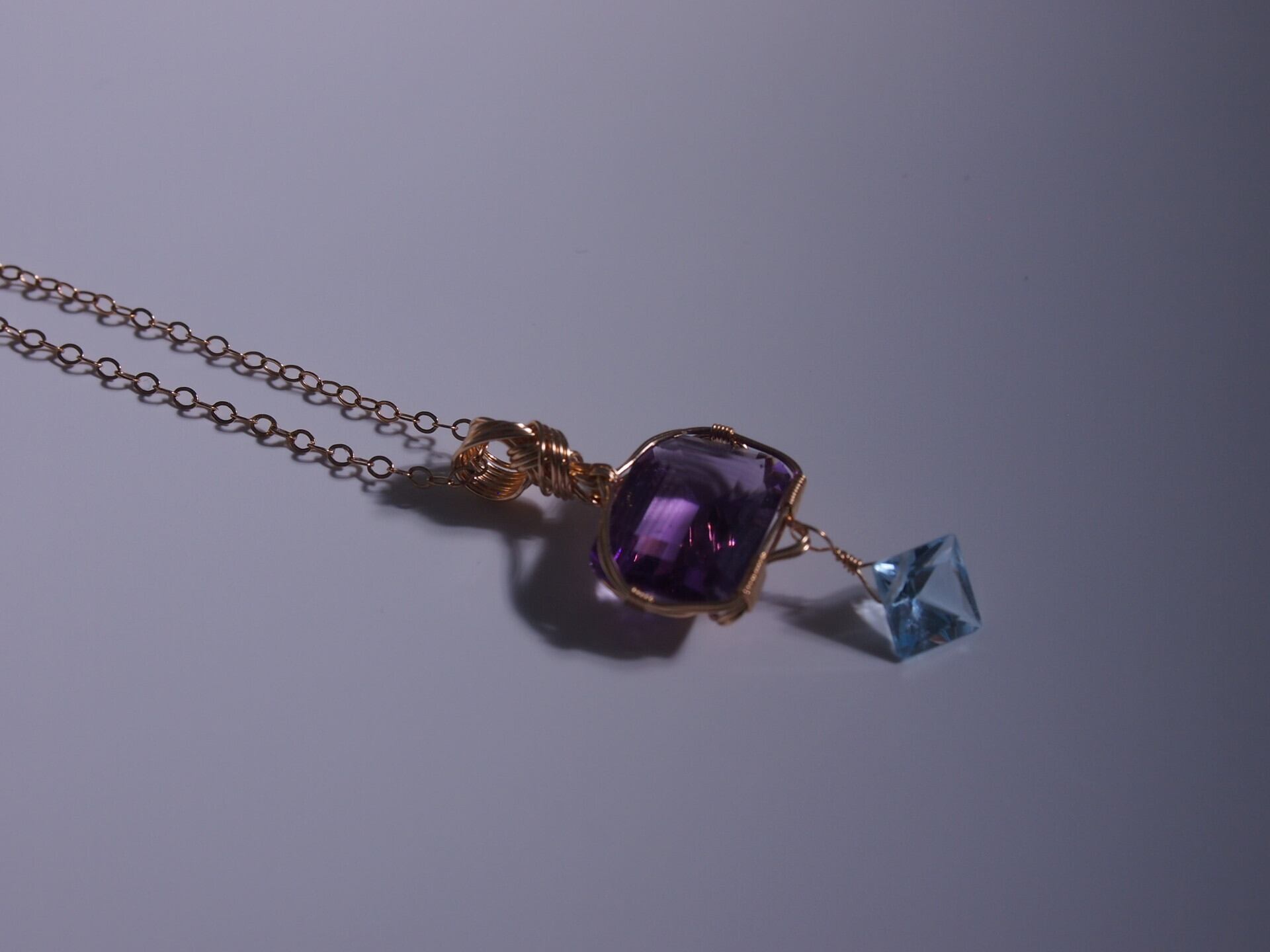ファントムの入ったレクタングルカットのアメシストと、スカイブルートパーズを14kgfワイヤーで繊細に女神巻きペンダントトップに仕上げました♡