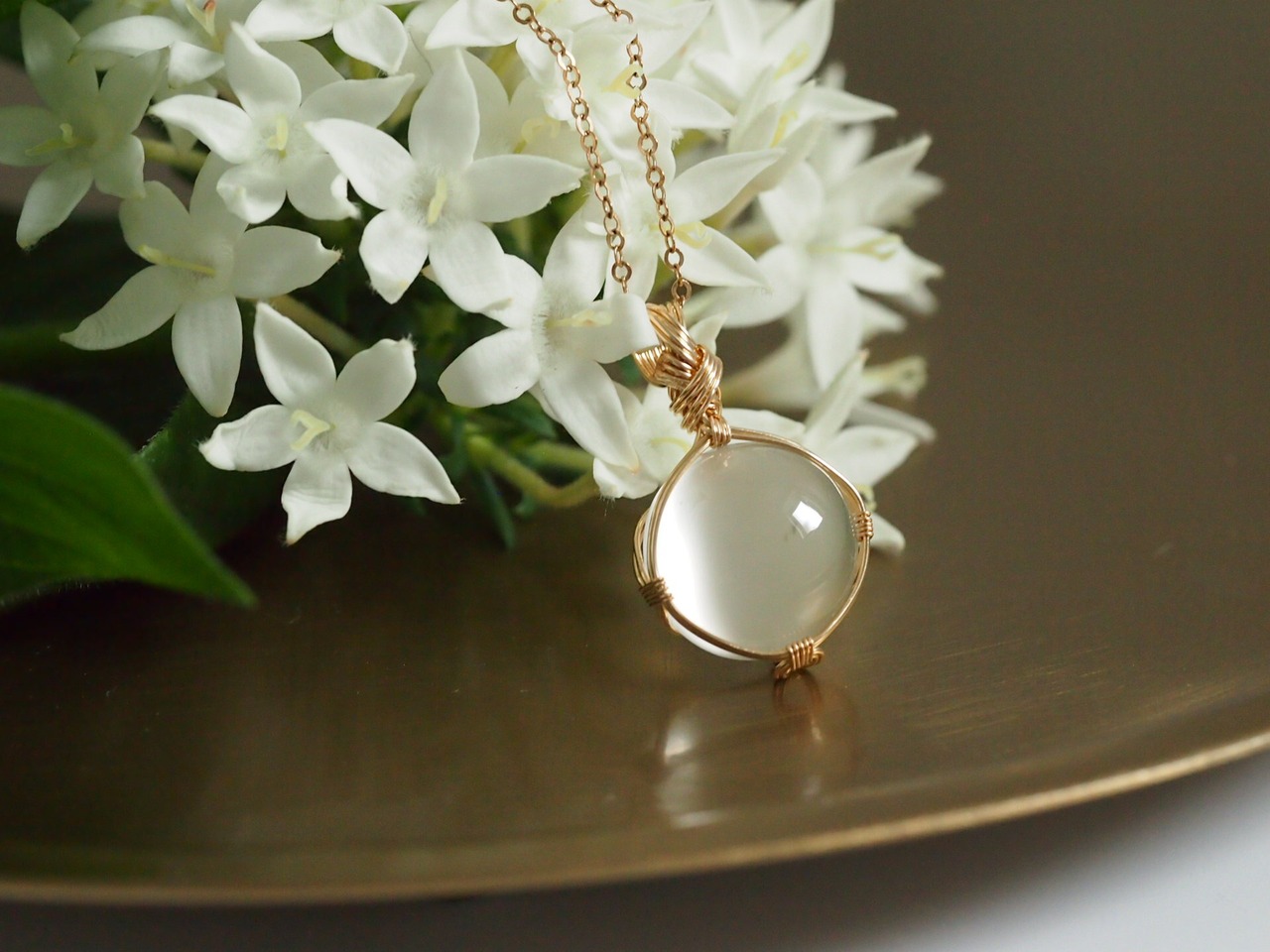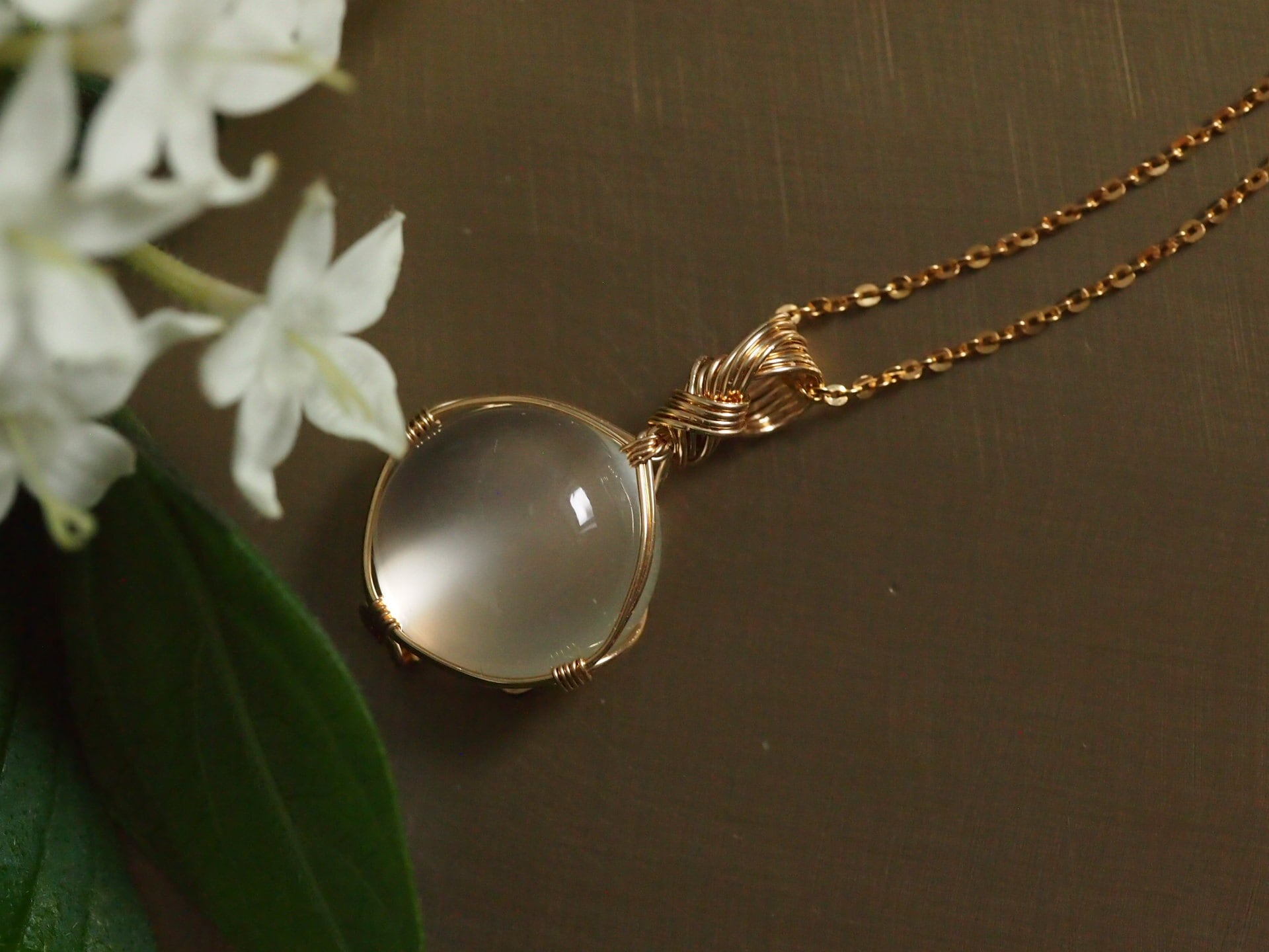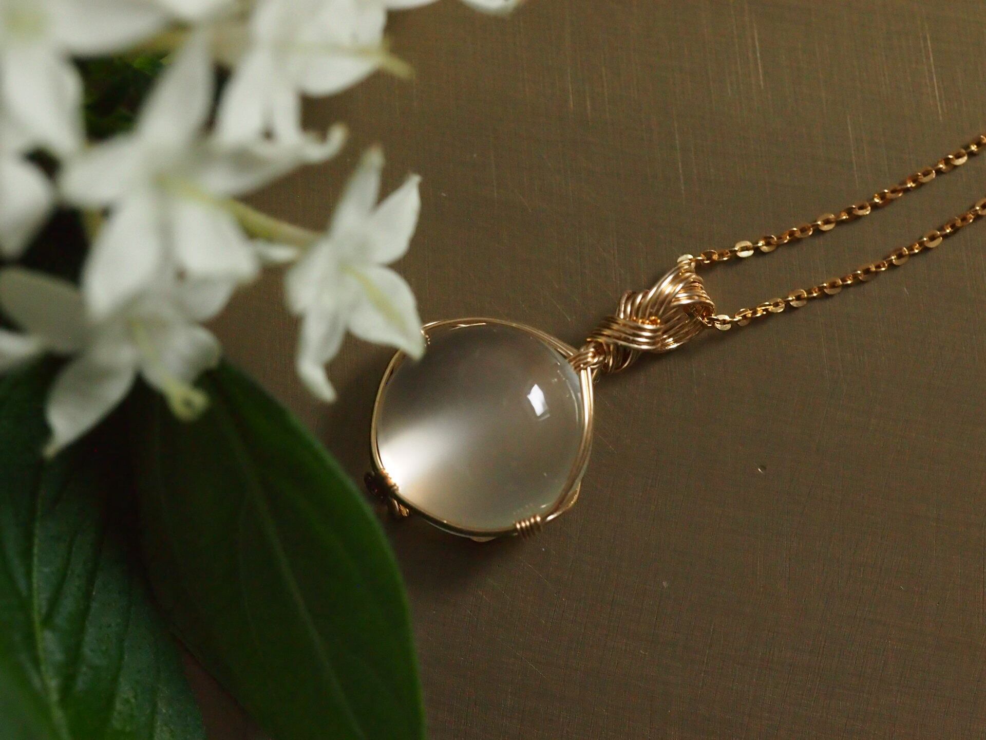 まんまるなカボションカットのムーンストーンを14kgfワイヤーで繊細にペンダントトップに仕上げました♡