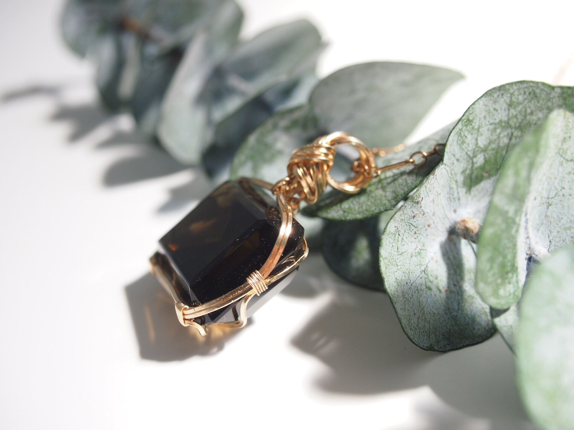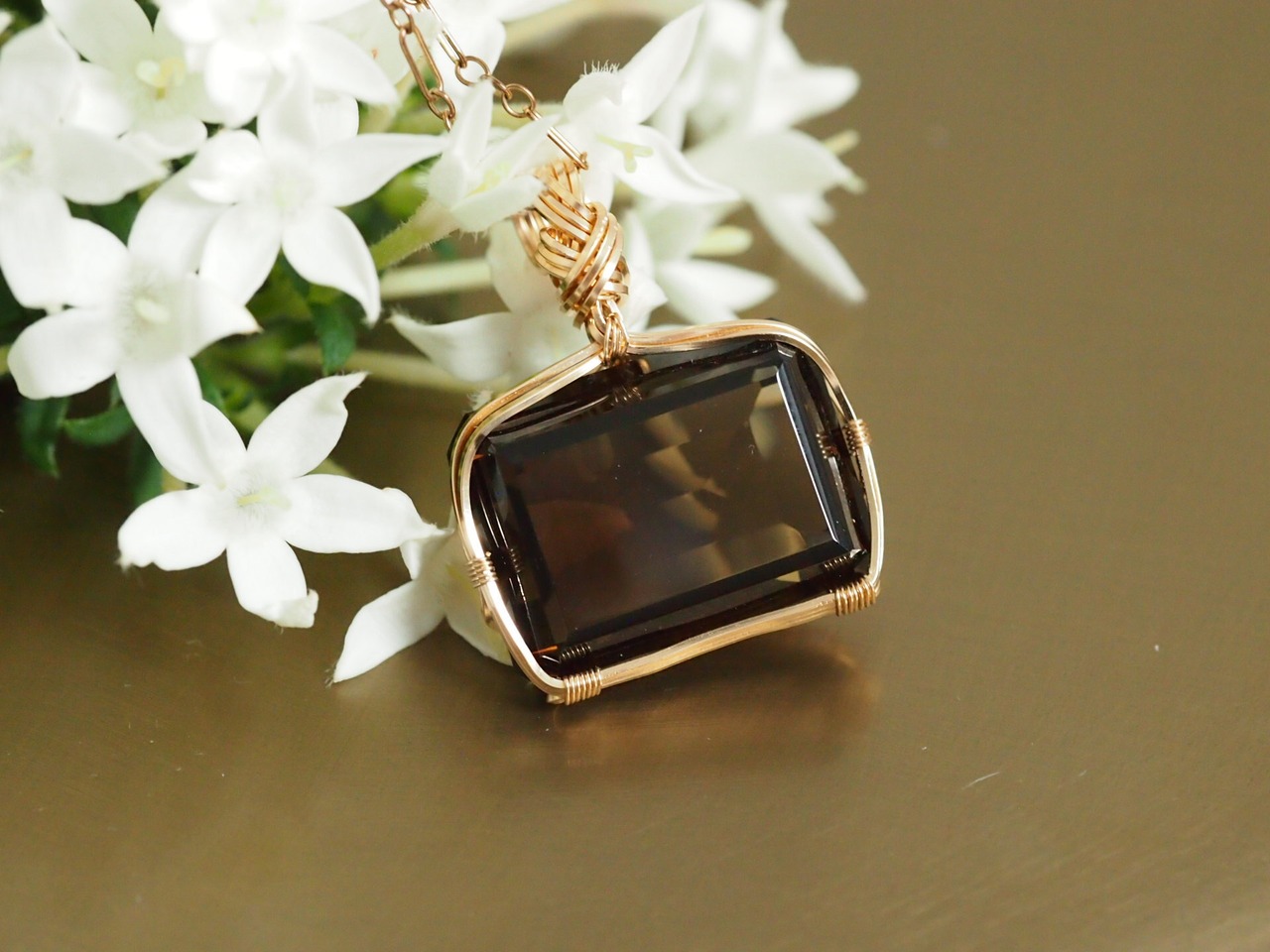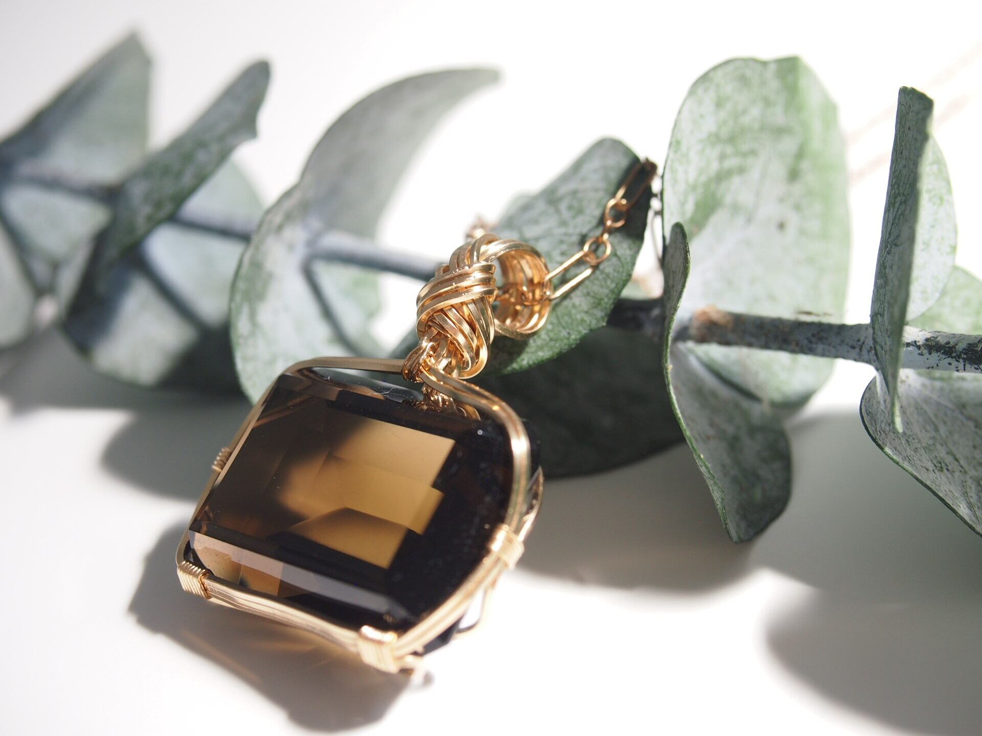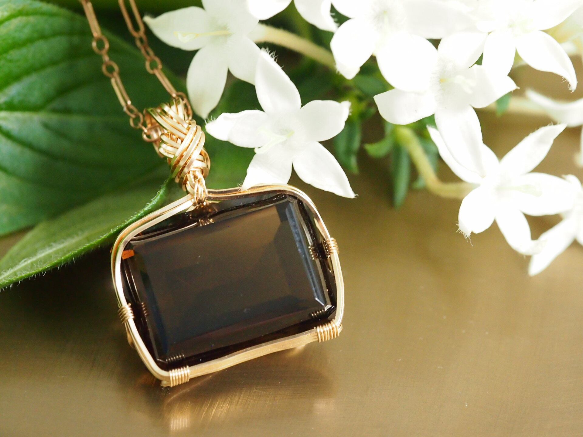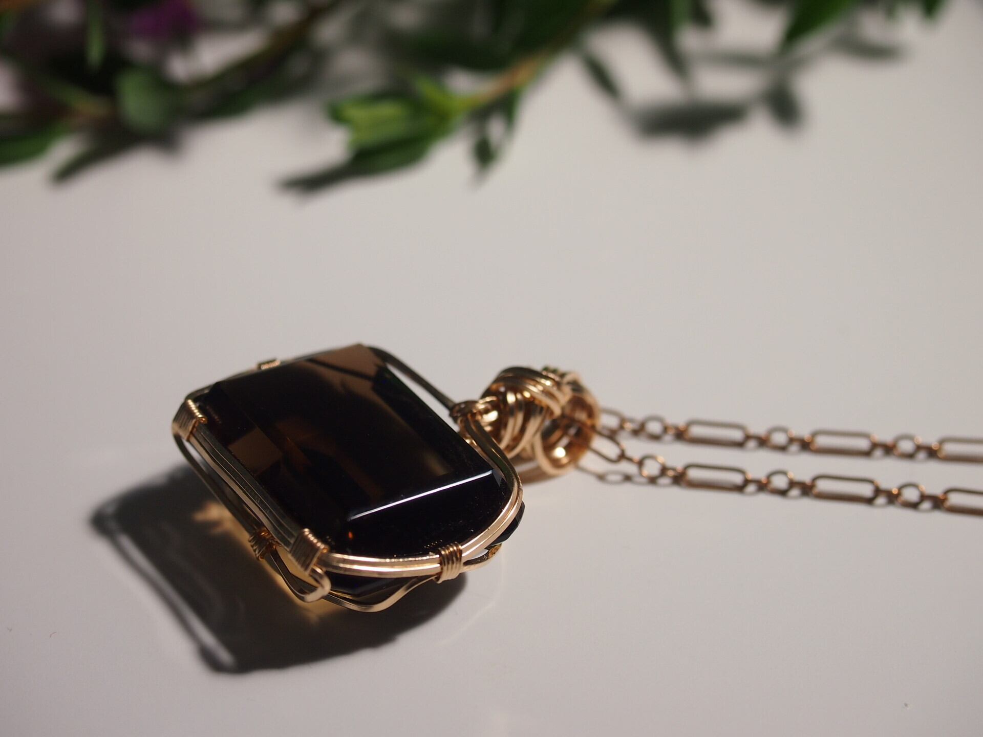レクタングルカットのスモーキークォーツを14kgfスクエアワイヤーで繊細にペンダントトップに仕上げました♡