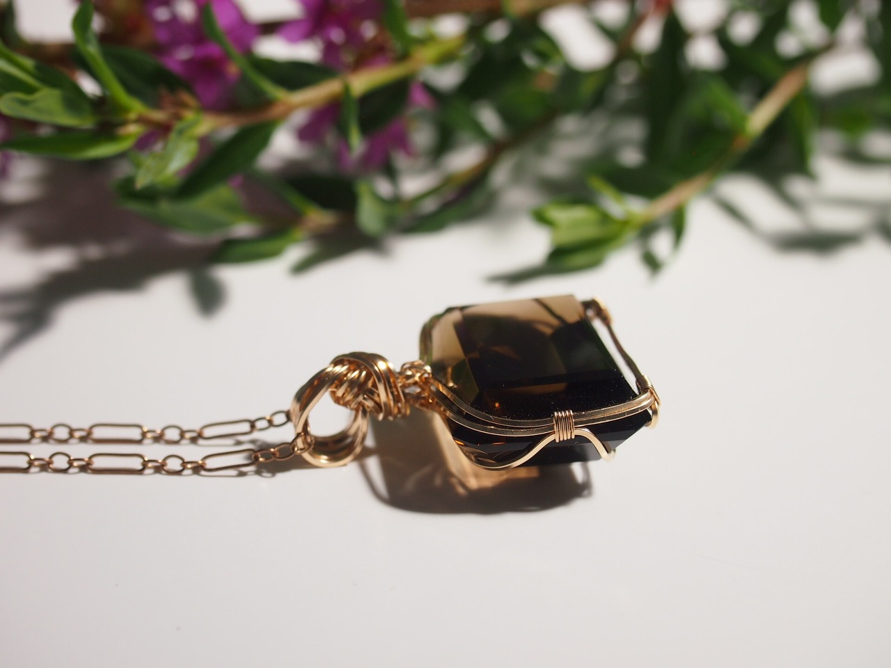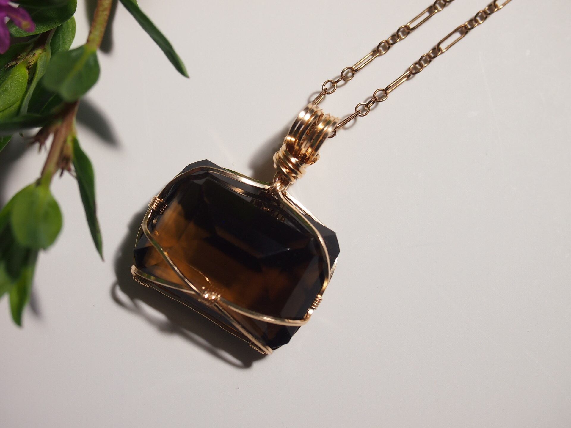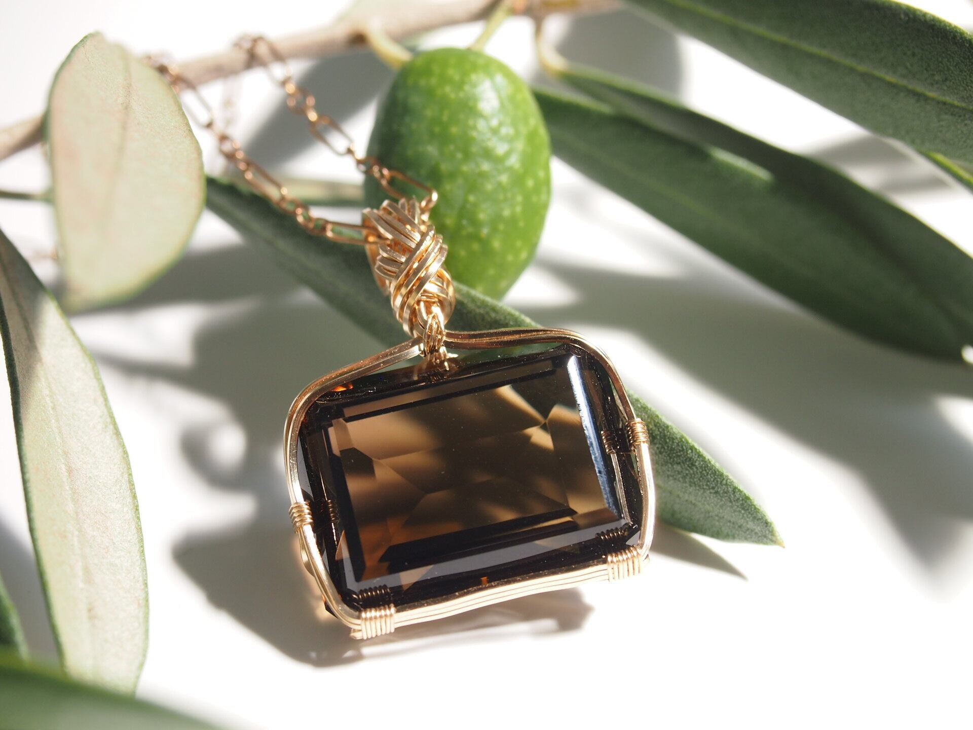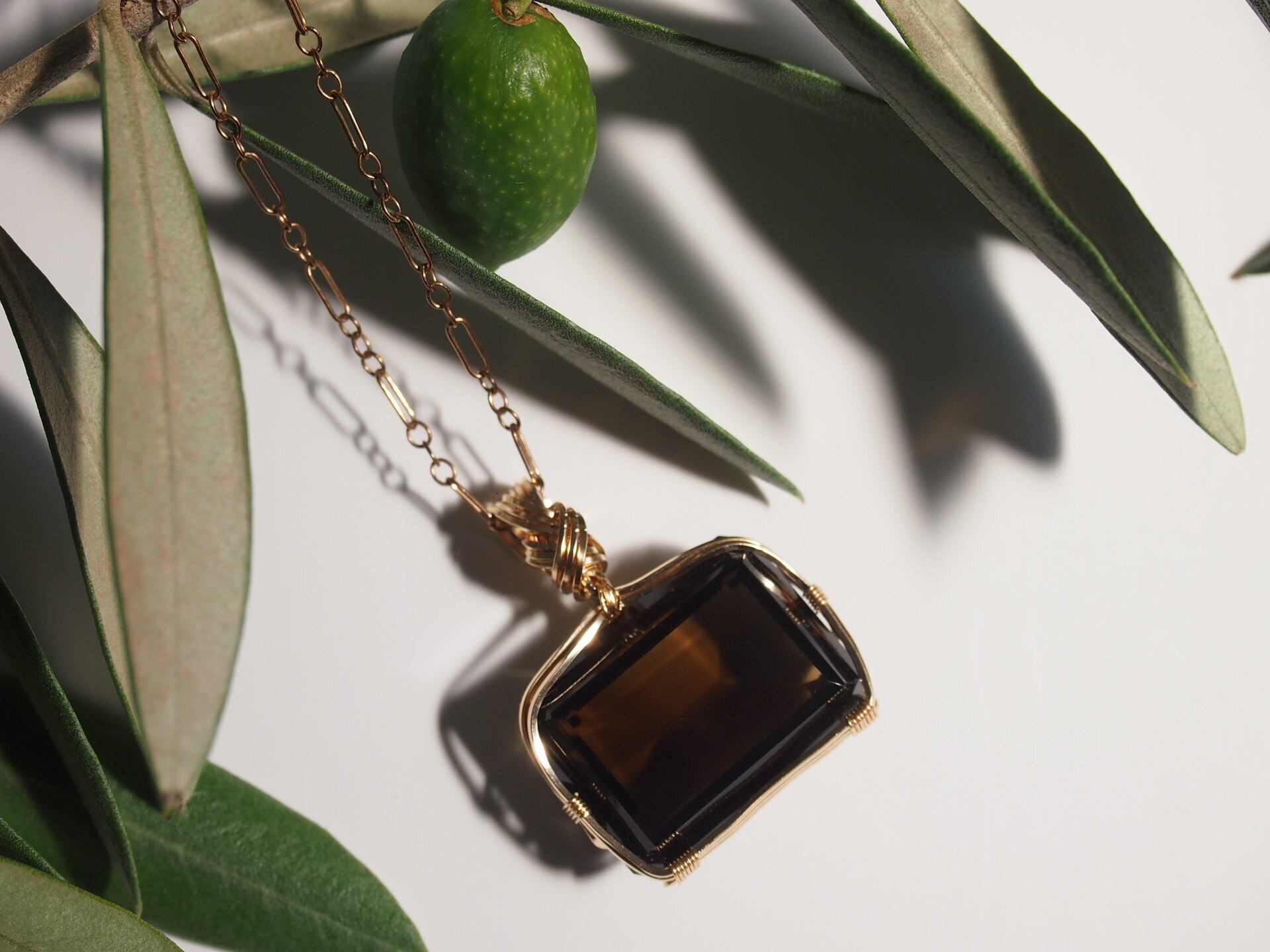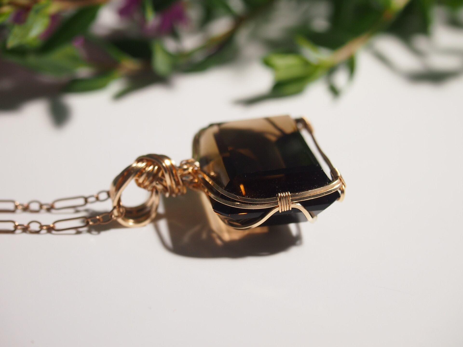 レクタングルカットのスモーキークォーツを14kgfスクエアワイヤーで繊細にペンダントトップに仕上げました♡