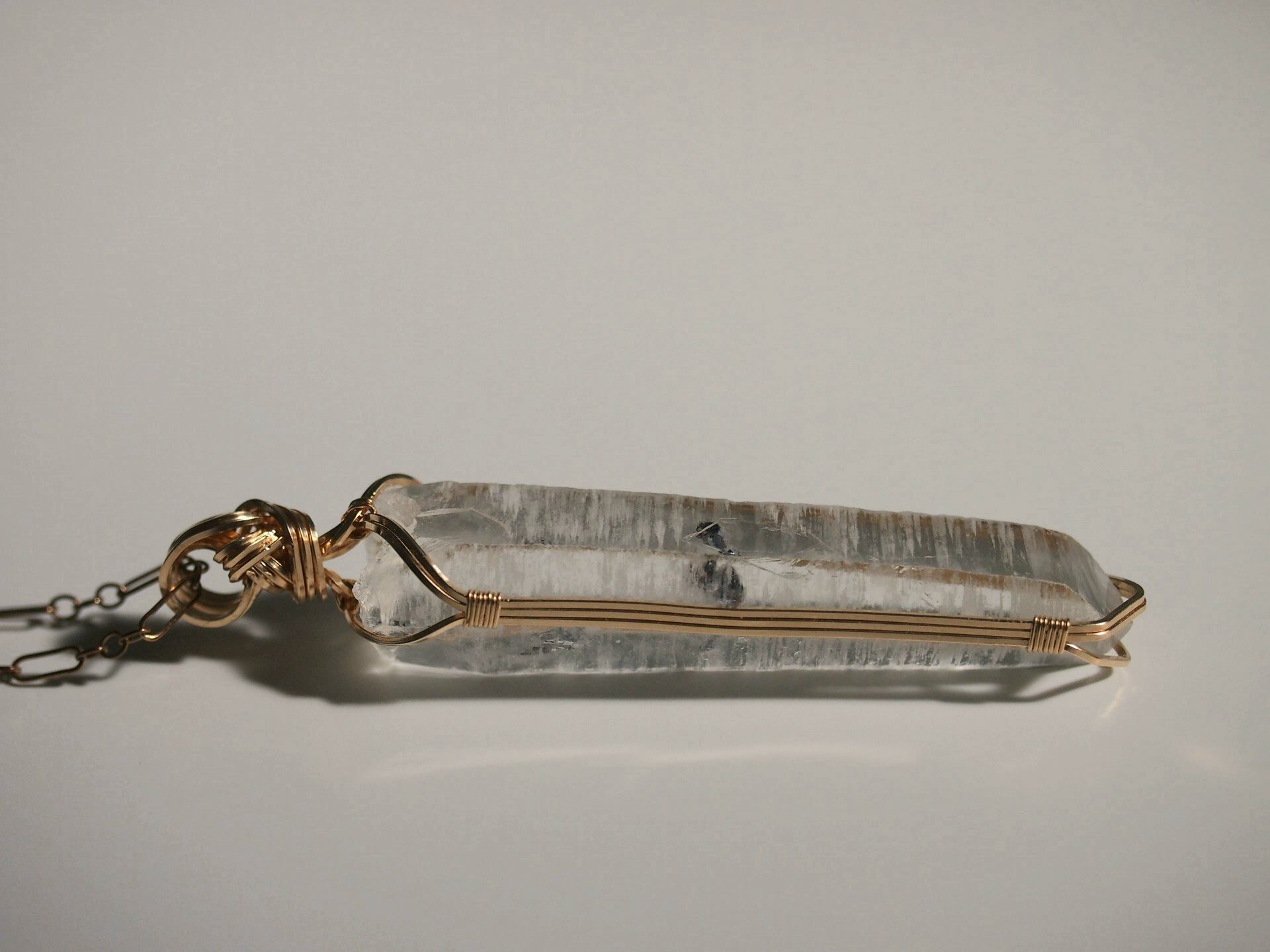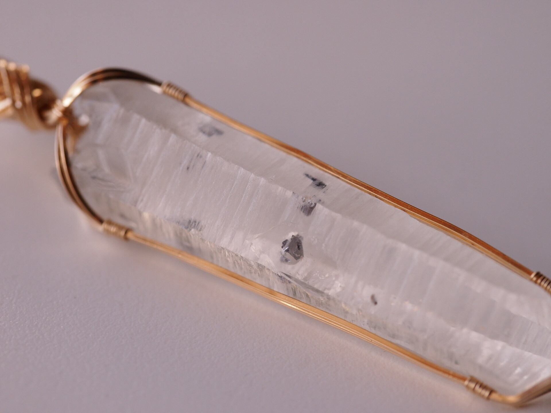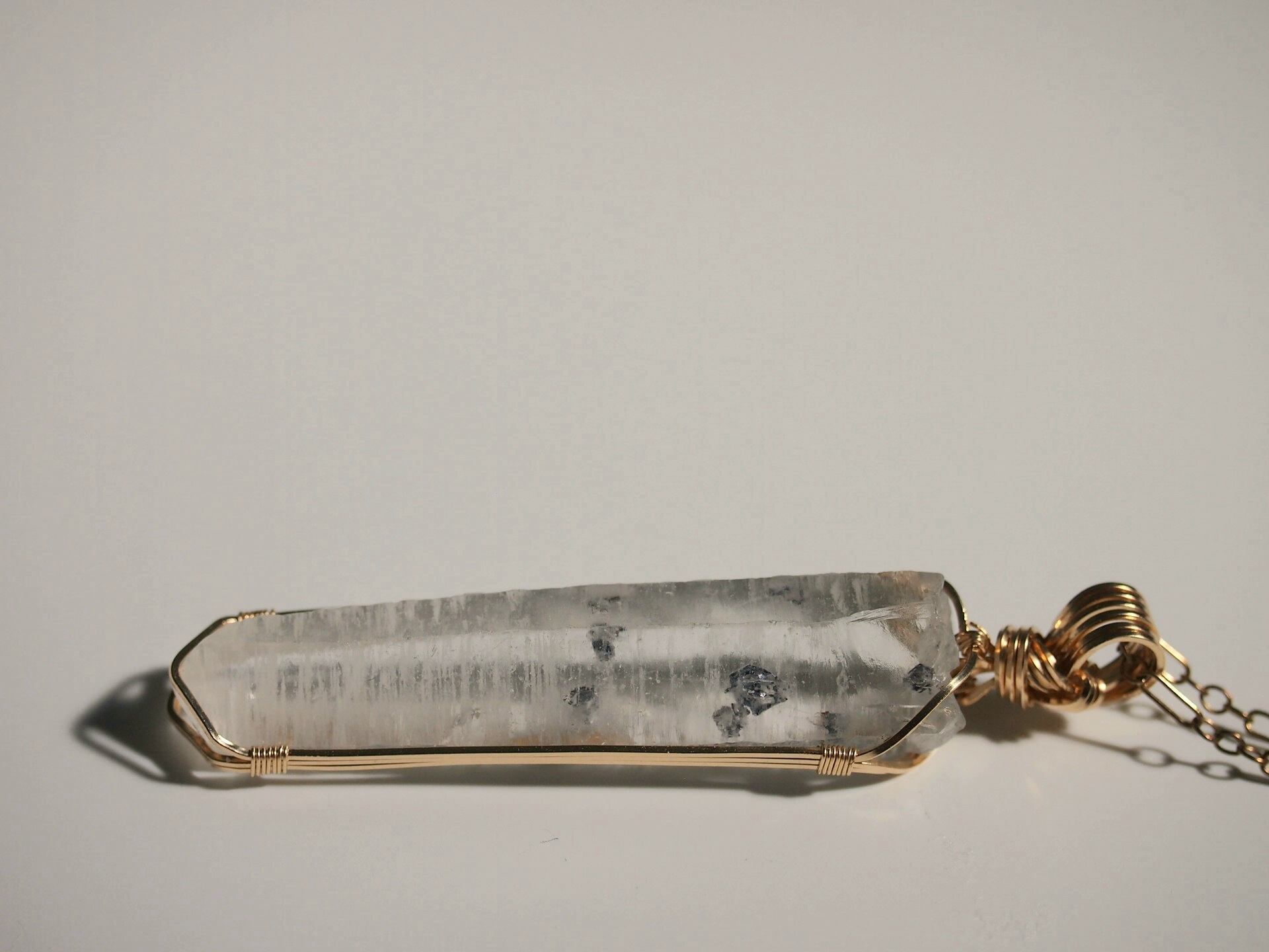 輝水鉛鉱の結晶を内包したクォーツを14kgfスクエアワイヤーで繊細に女神巻きペンダントトップに仕上げました♡