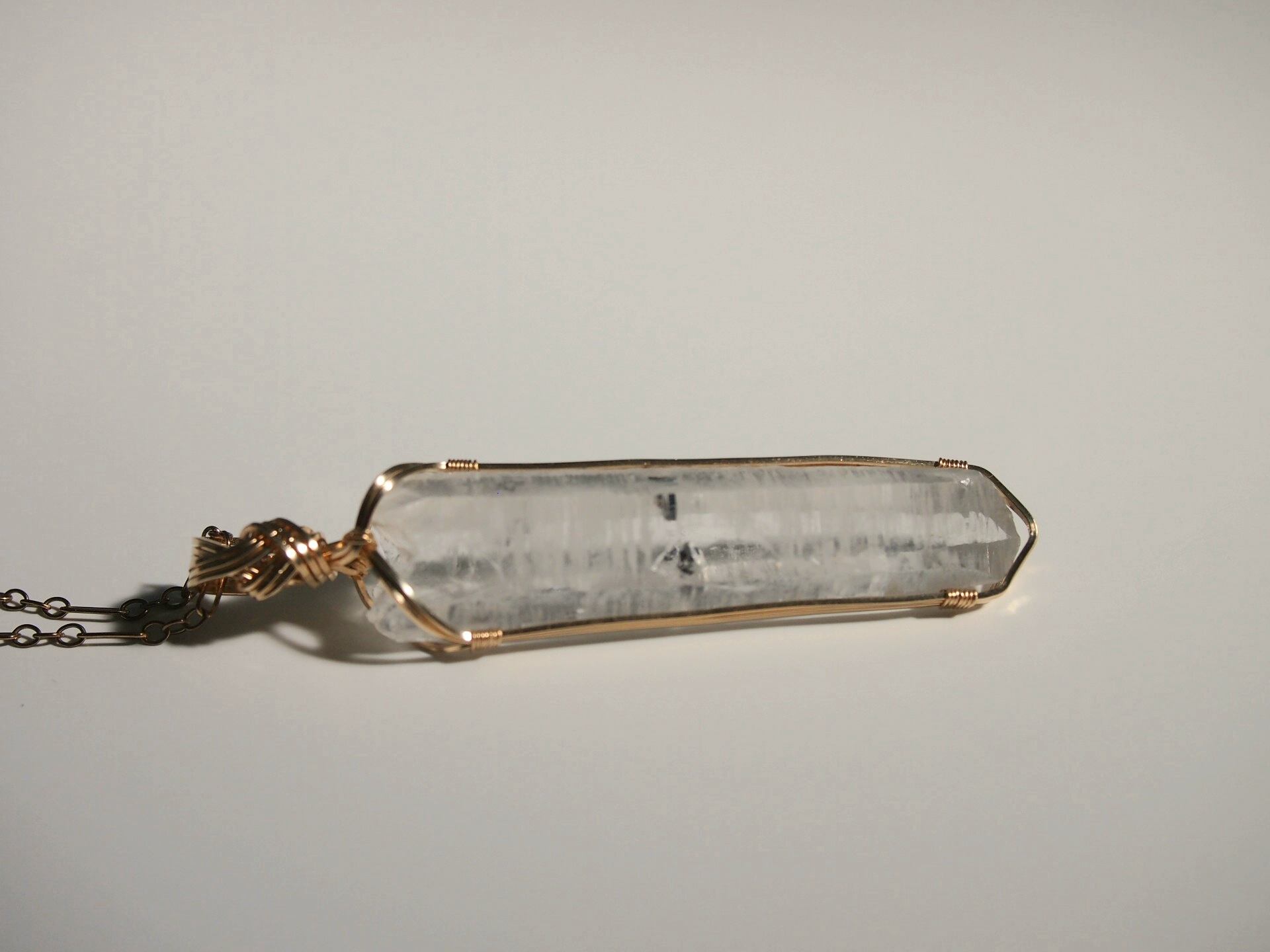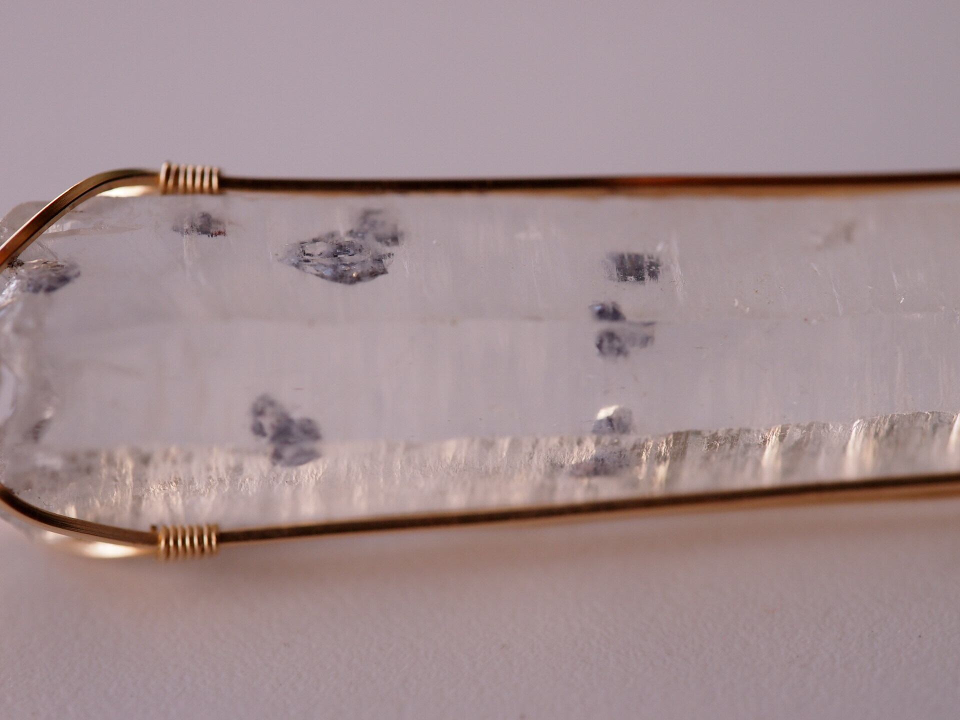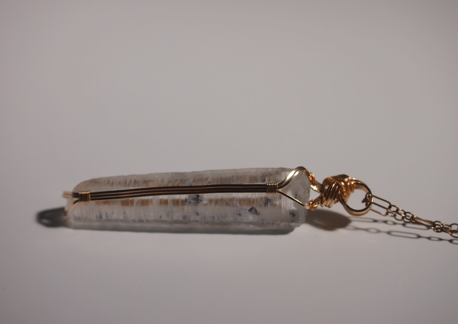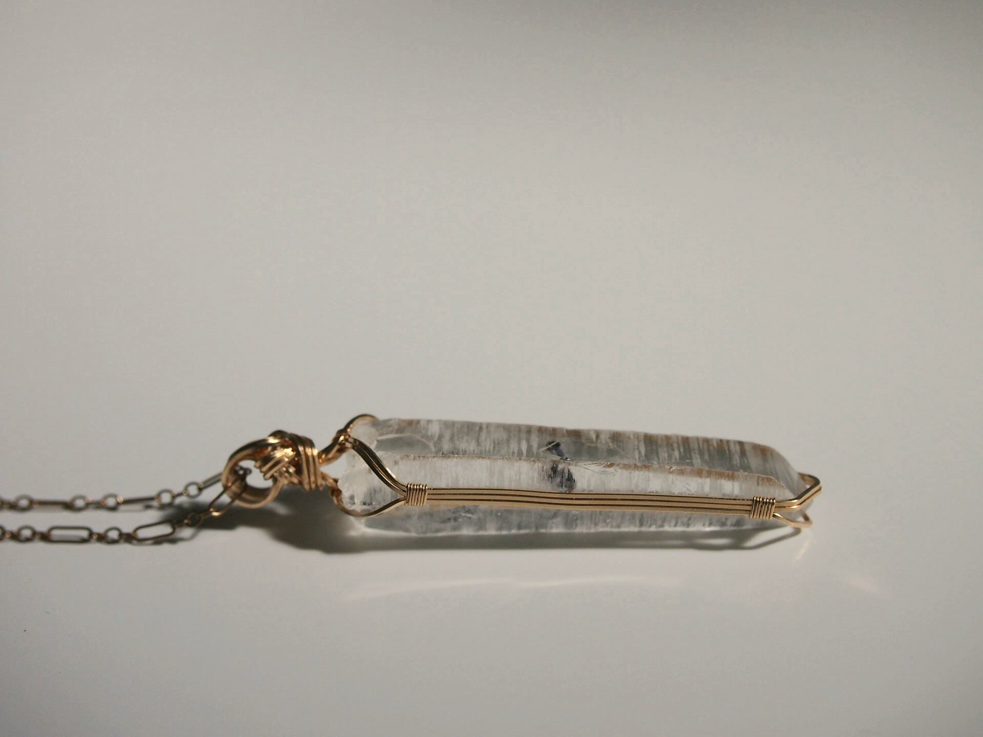 輝水鉛鉱の結晶を内包したクォーツを14kgfスクエアワイヤーで繊細に女神巻きペンダントトップに仕上げました♡