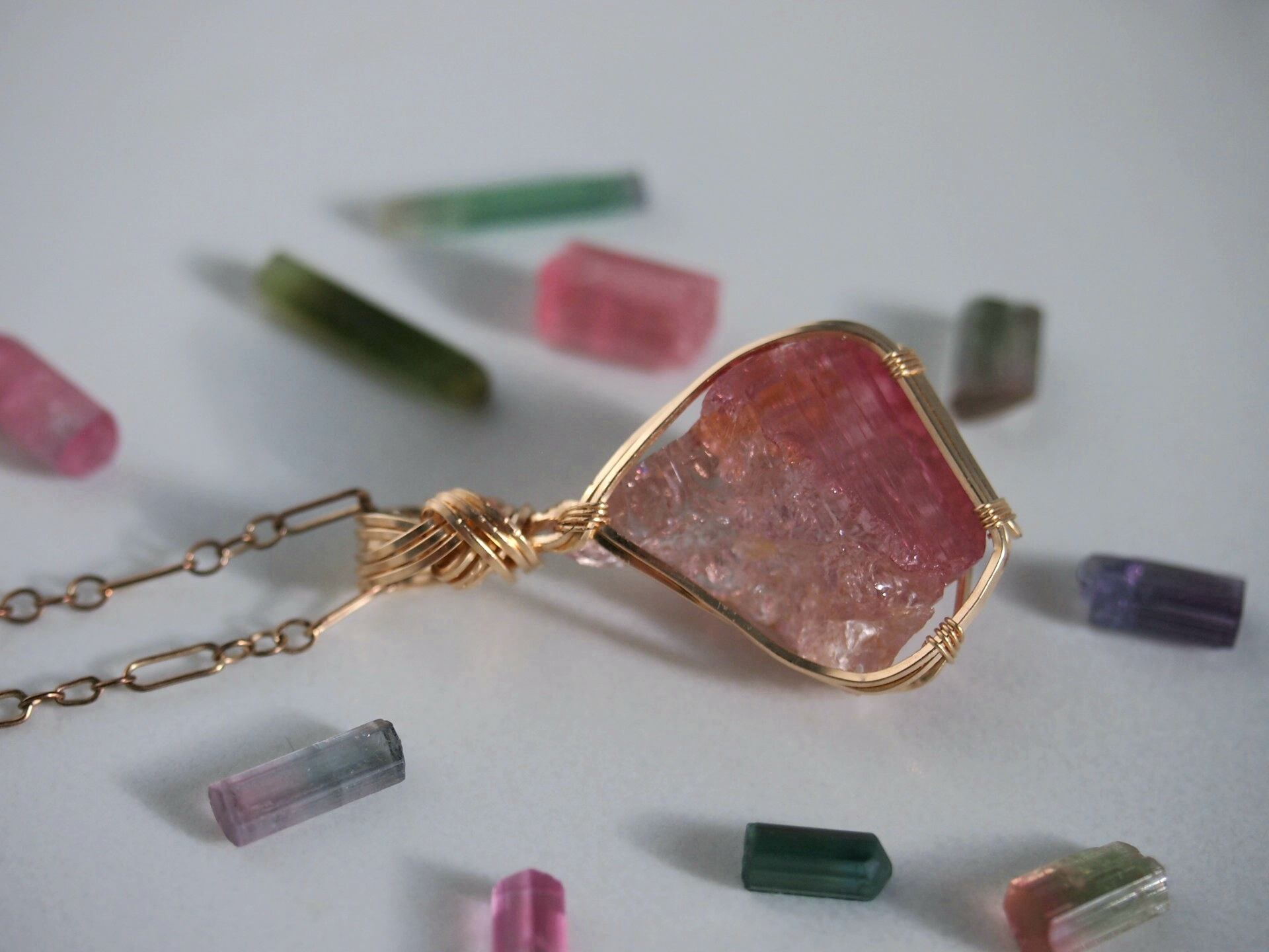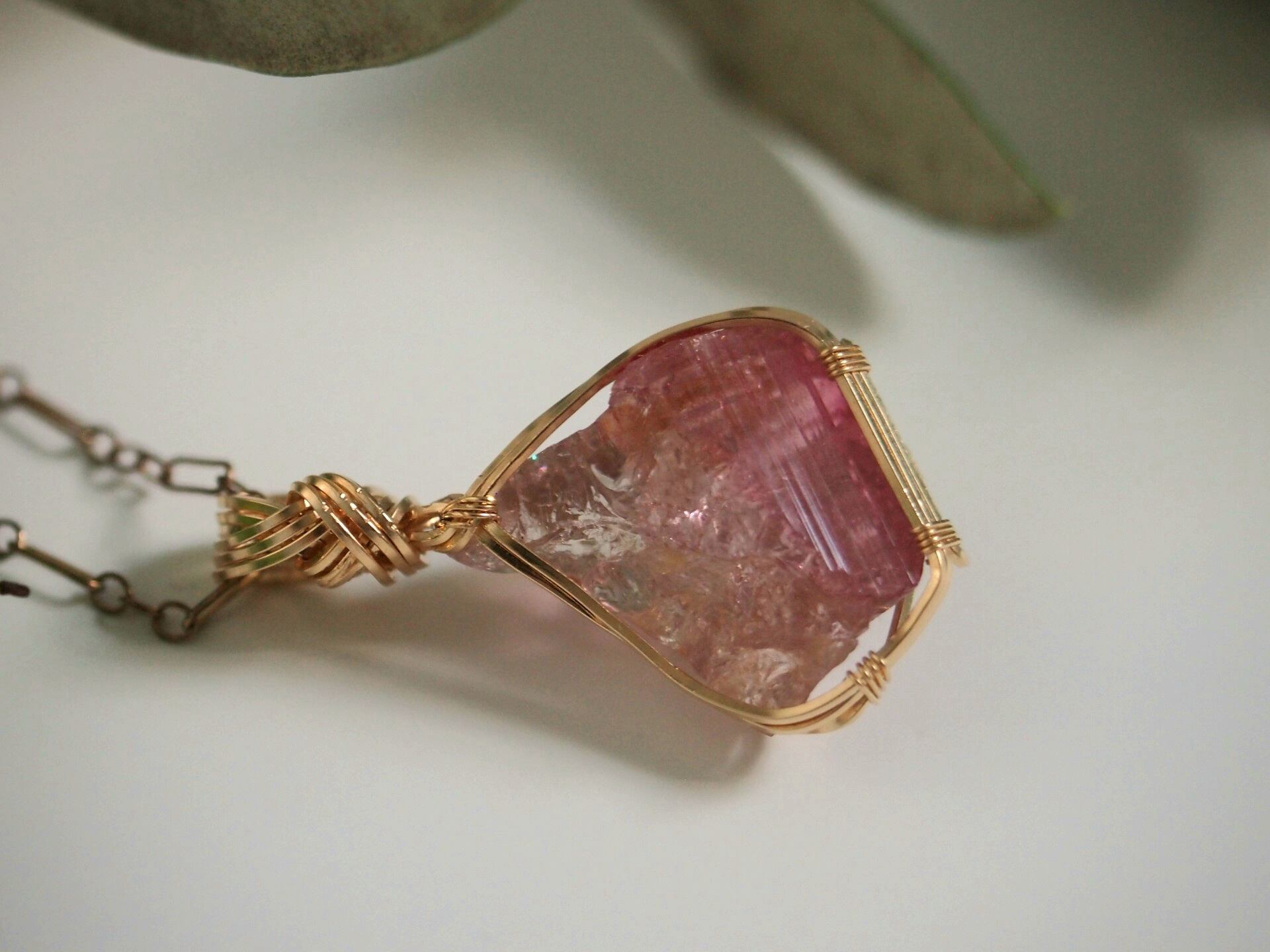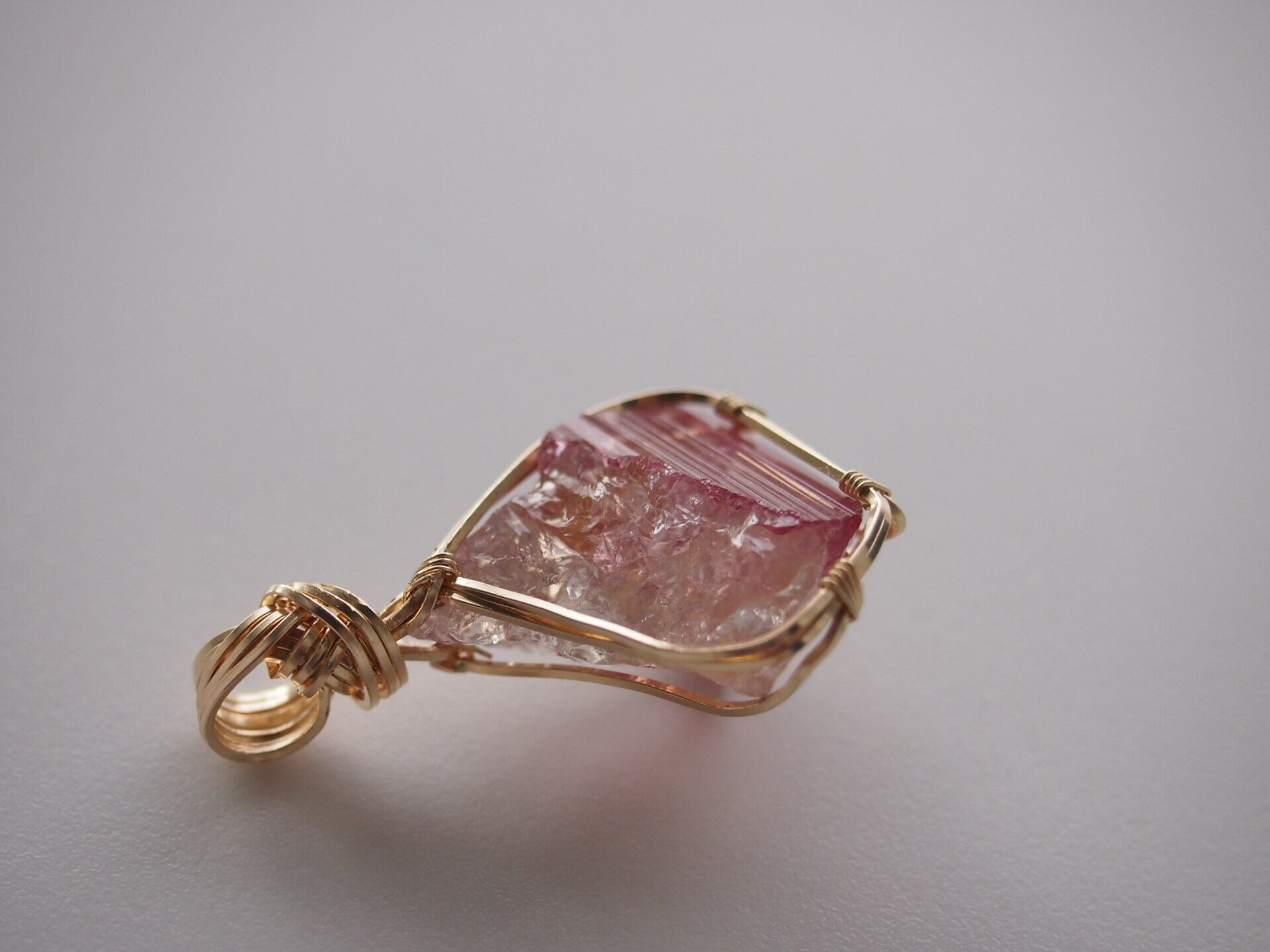 ピンクトルマリンの原石を14kgfスクエアワイヤーで繊細に女神巻きペンダントトップに仕上げました♡
