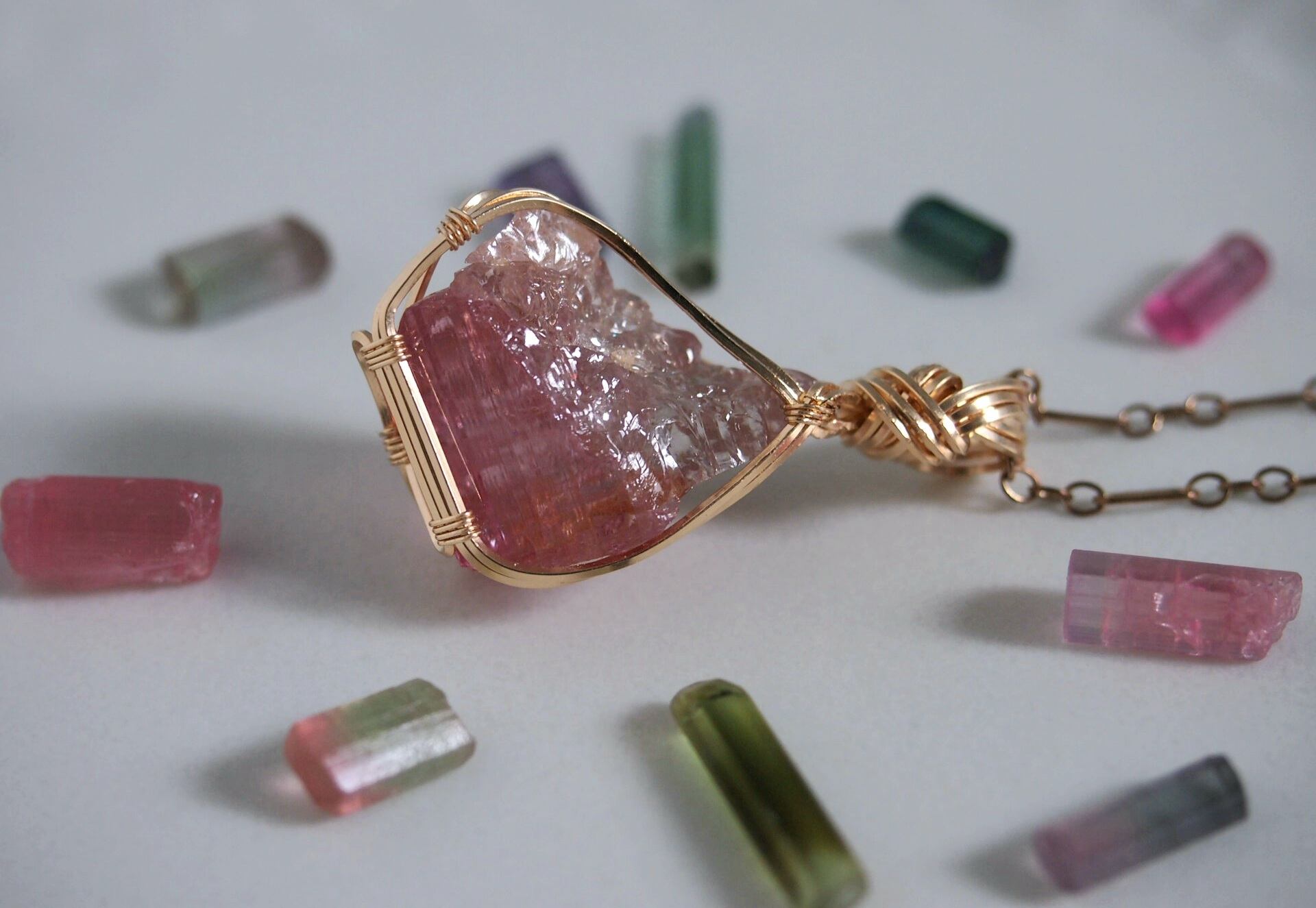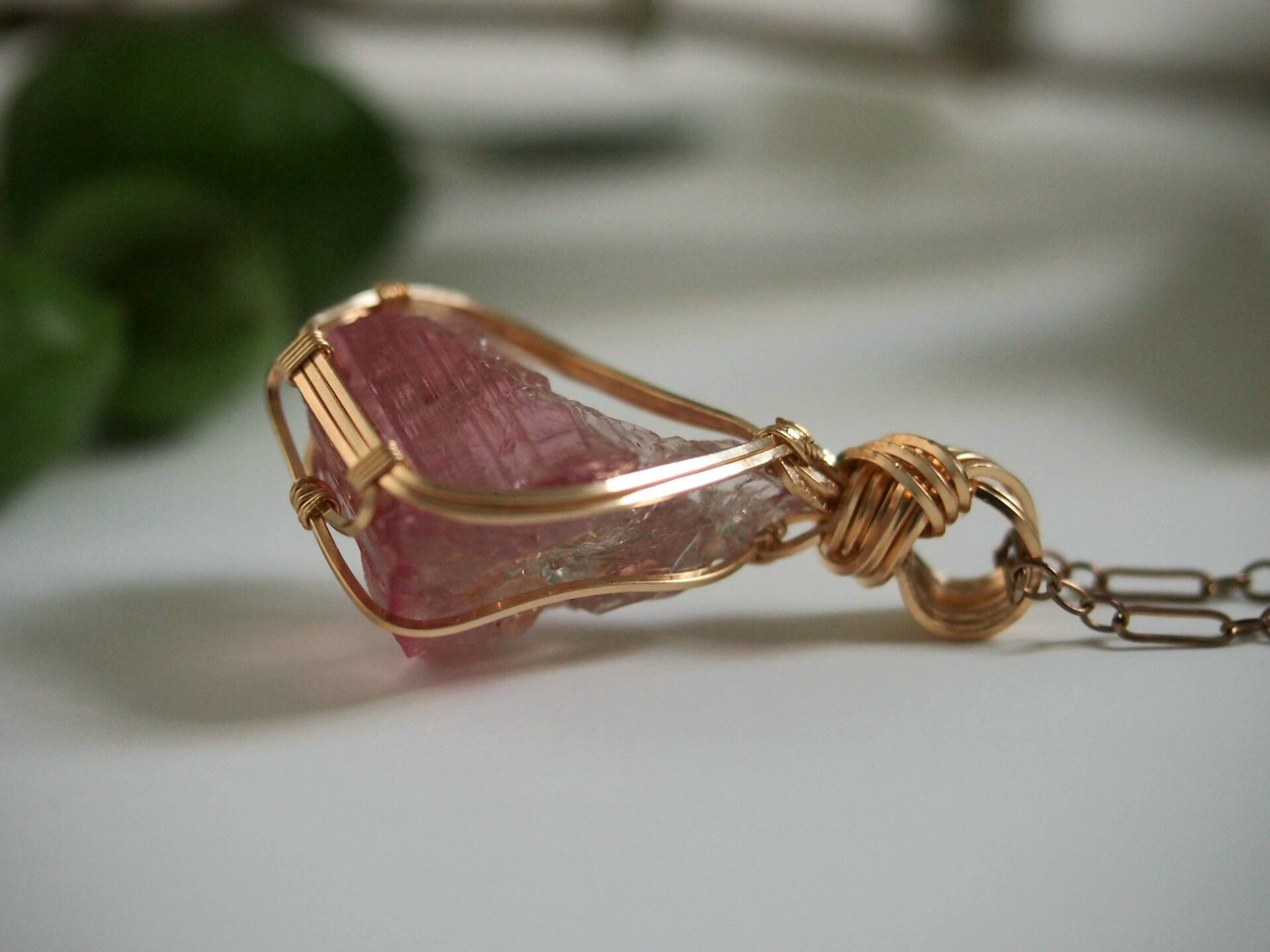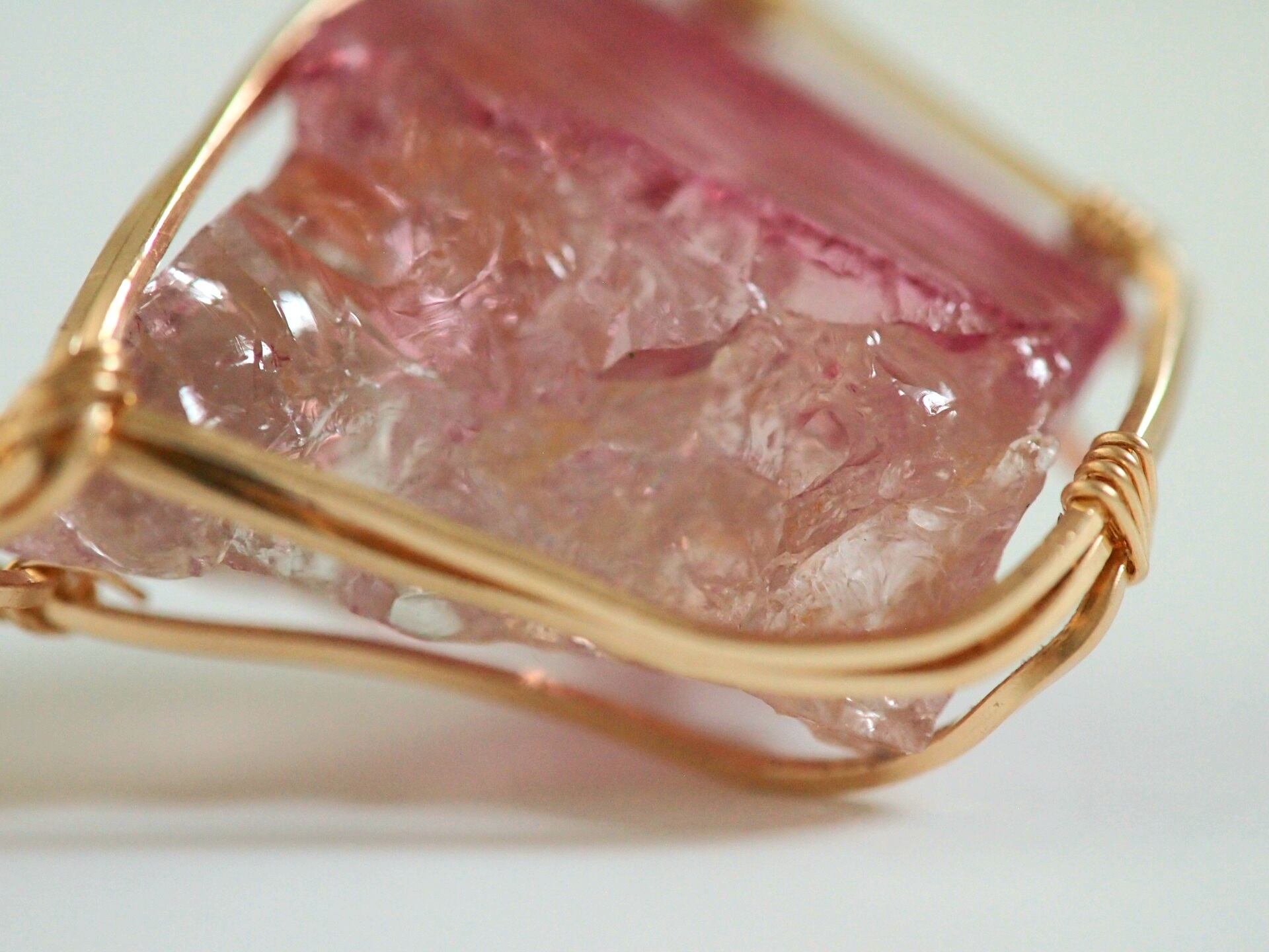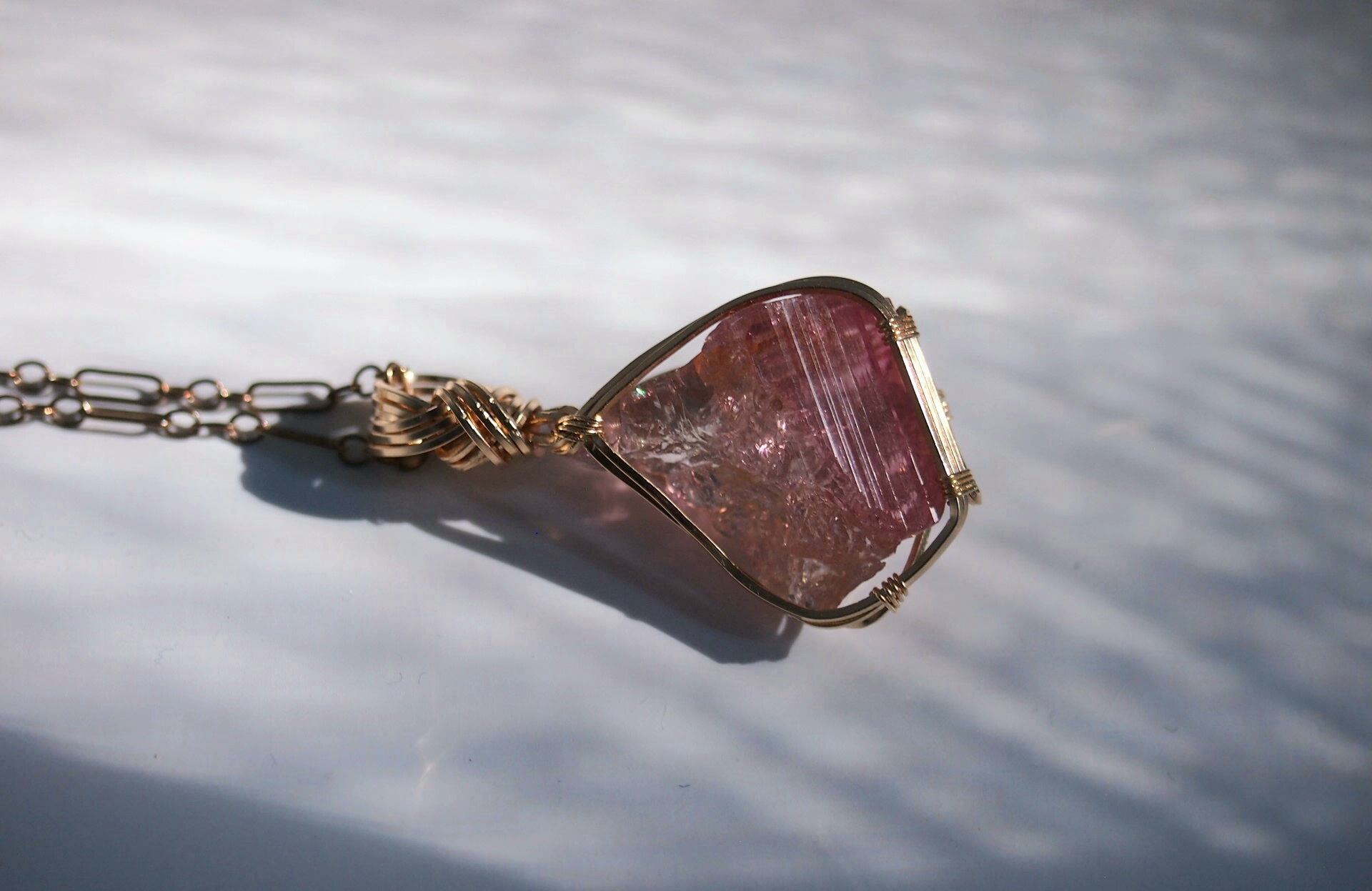 ピンクトルマリンの原石を14kgfスクエアワイヤーで繊細に女神巻きペンダントトップに仕上げました♡