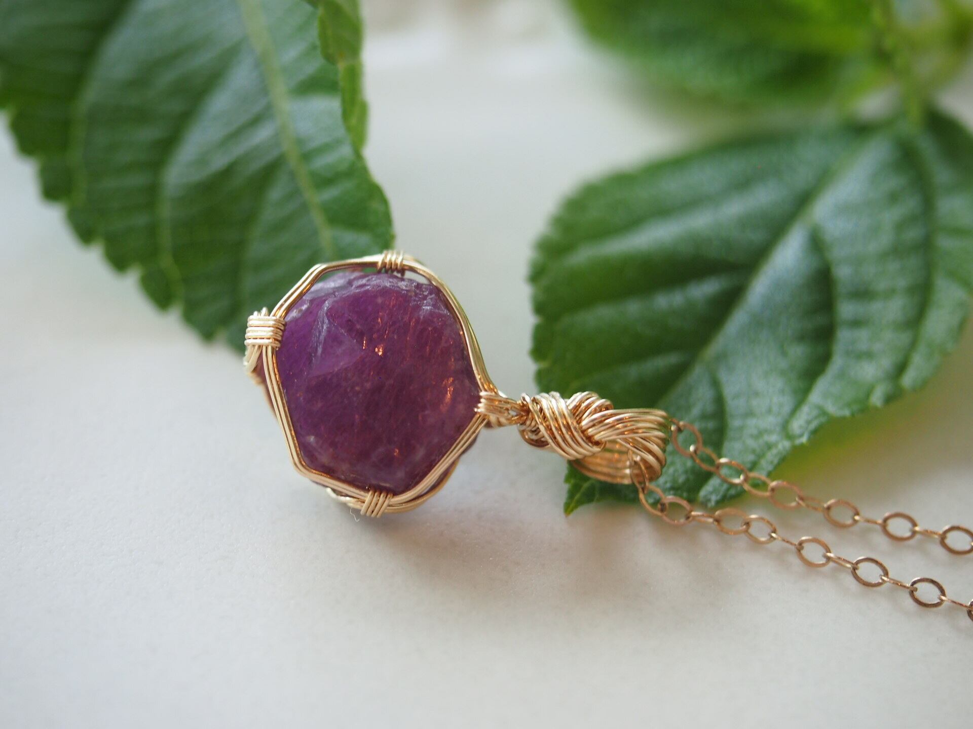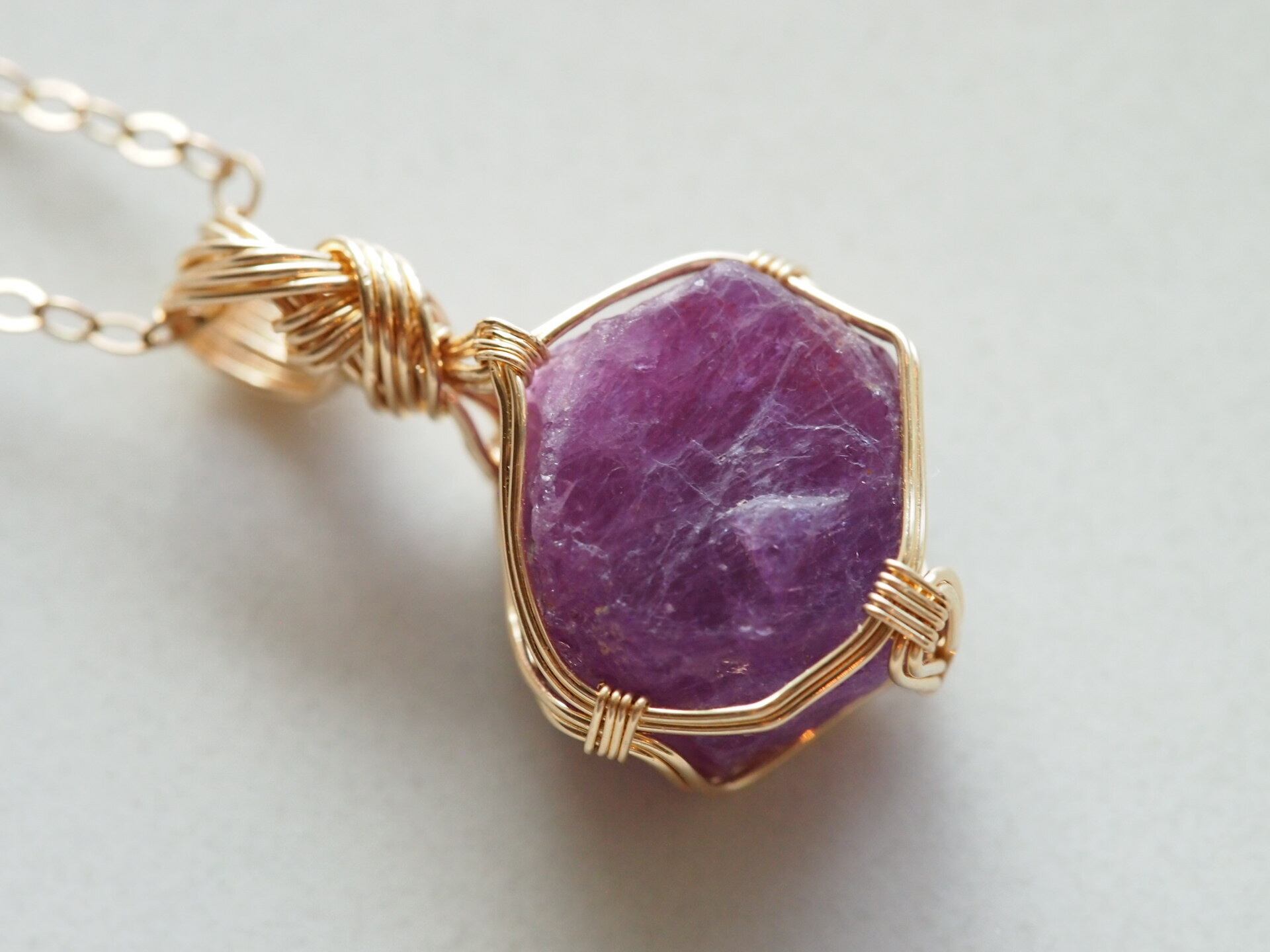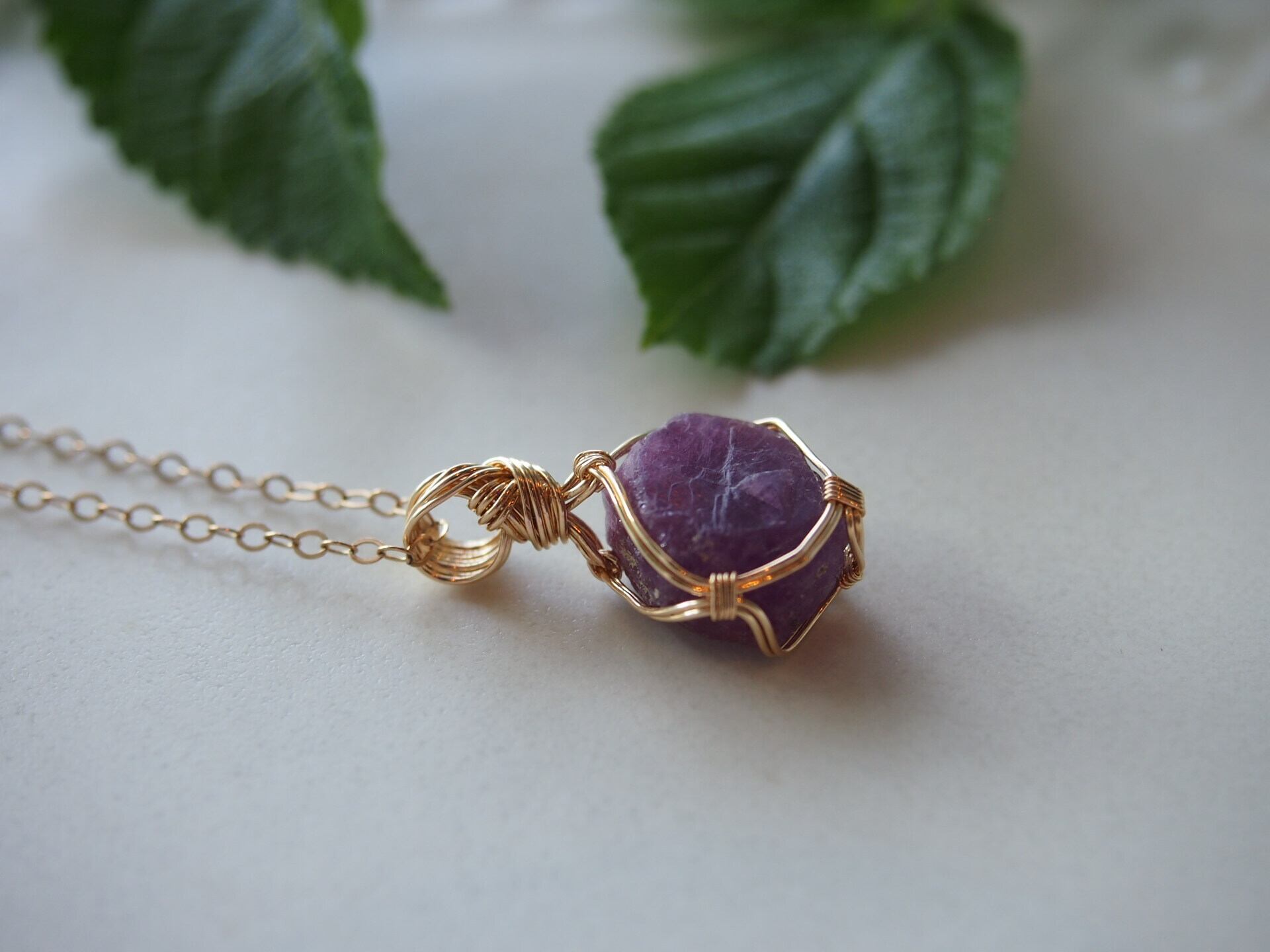 ルビーの原石を14kgfワイヤーで繊細に女神巻きペンダントトップに仕上げました♡