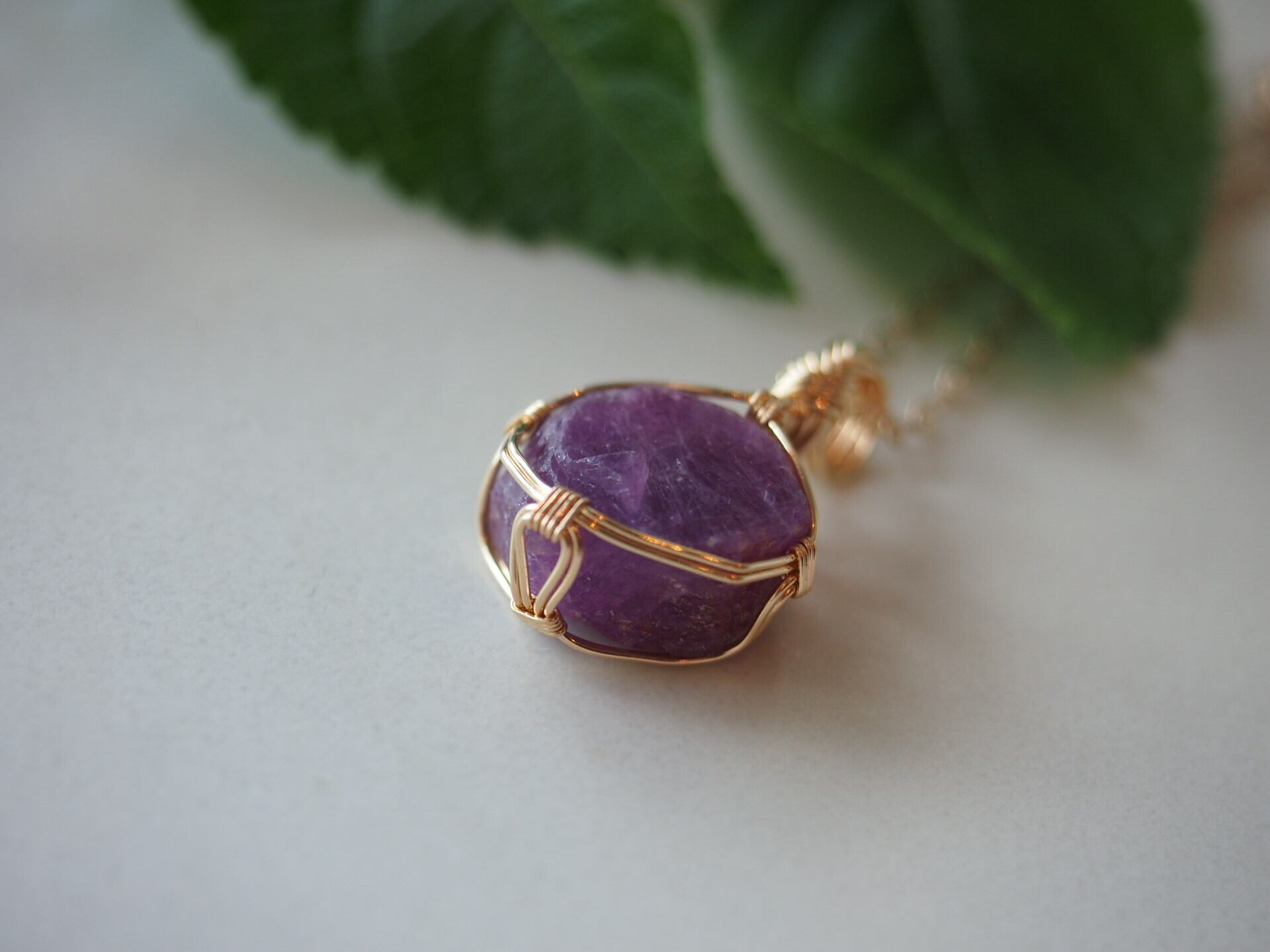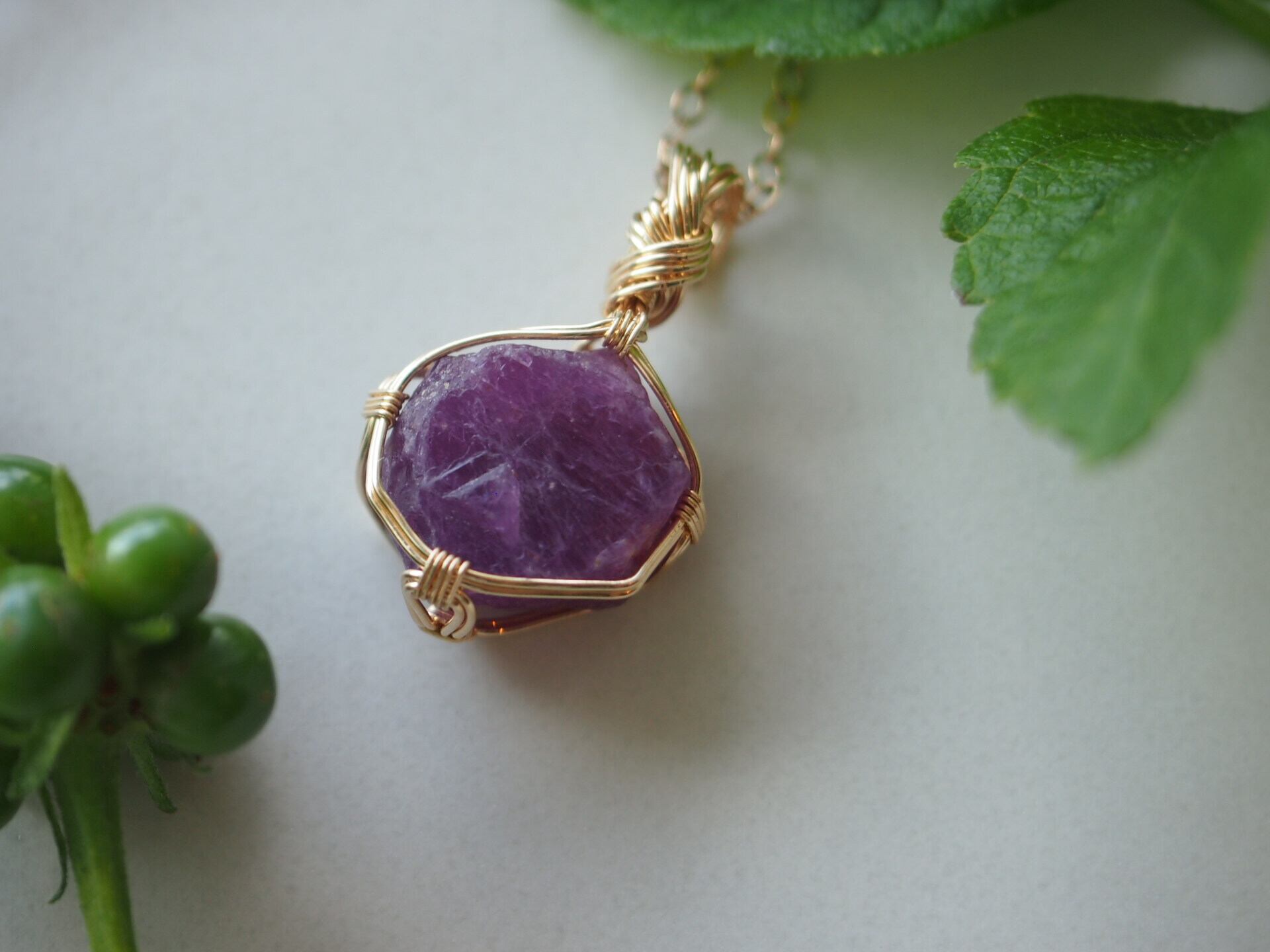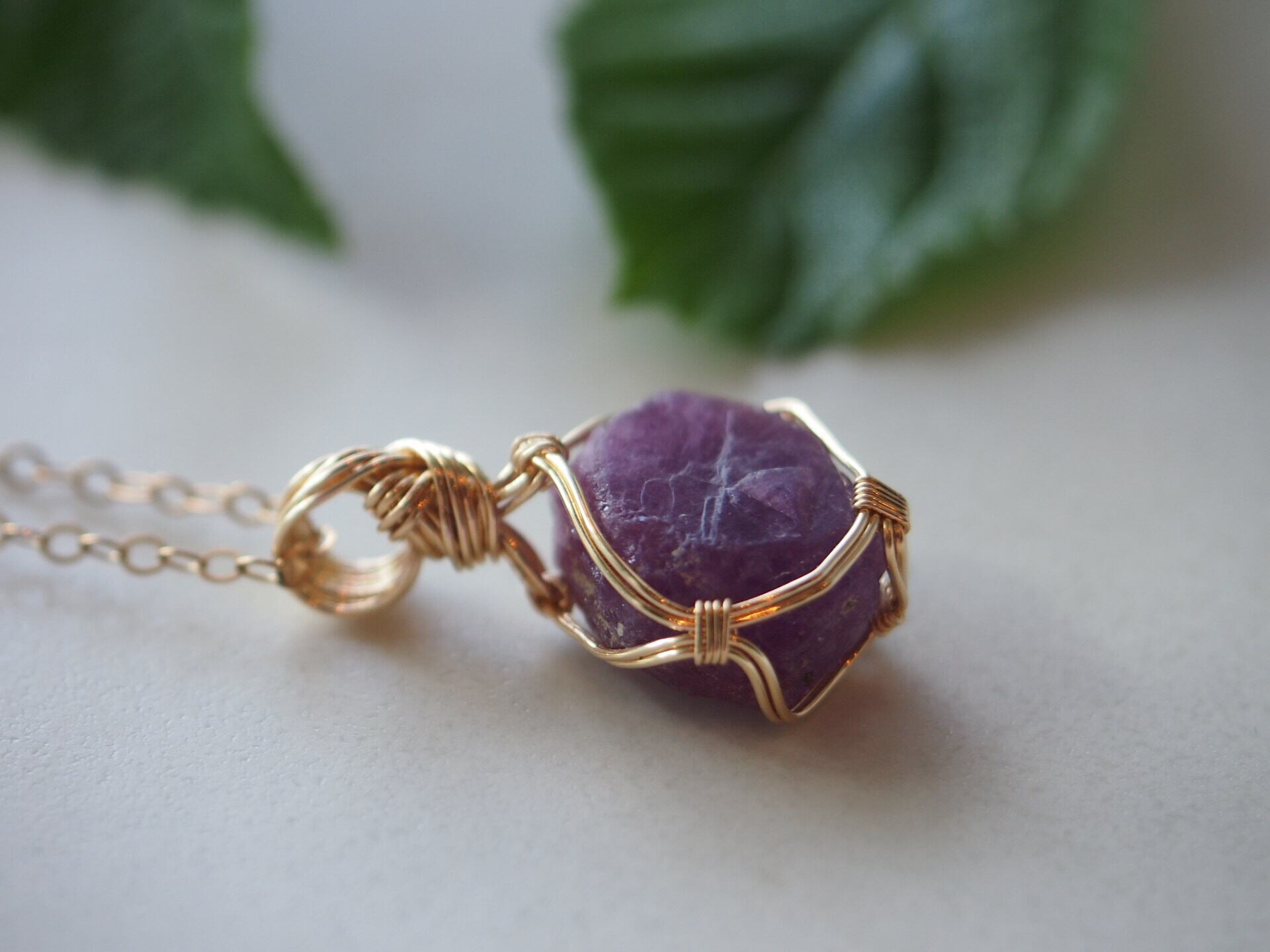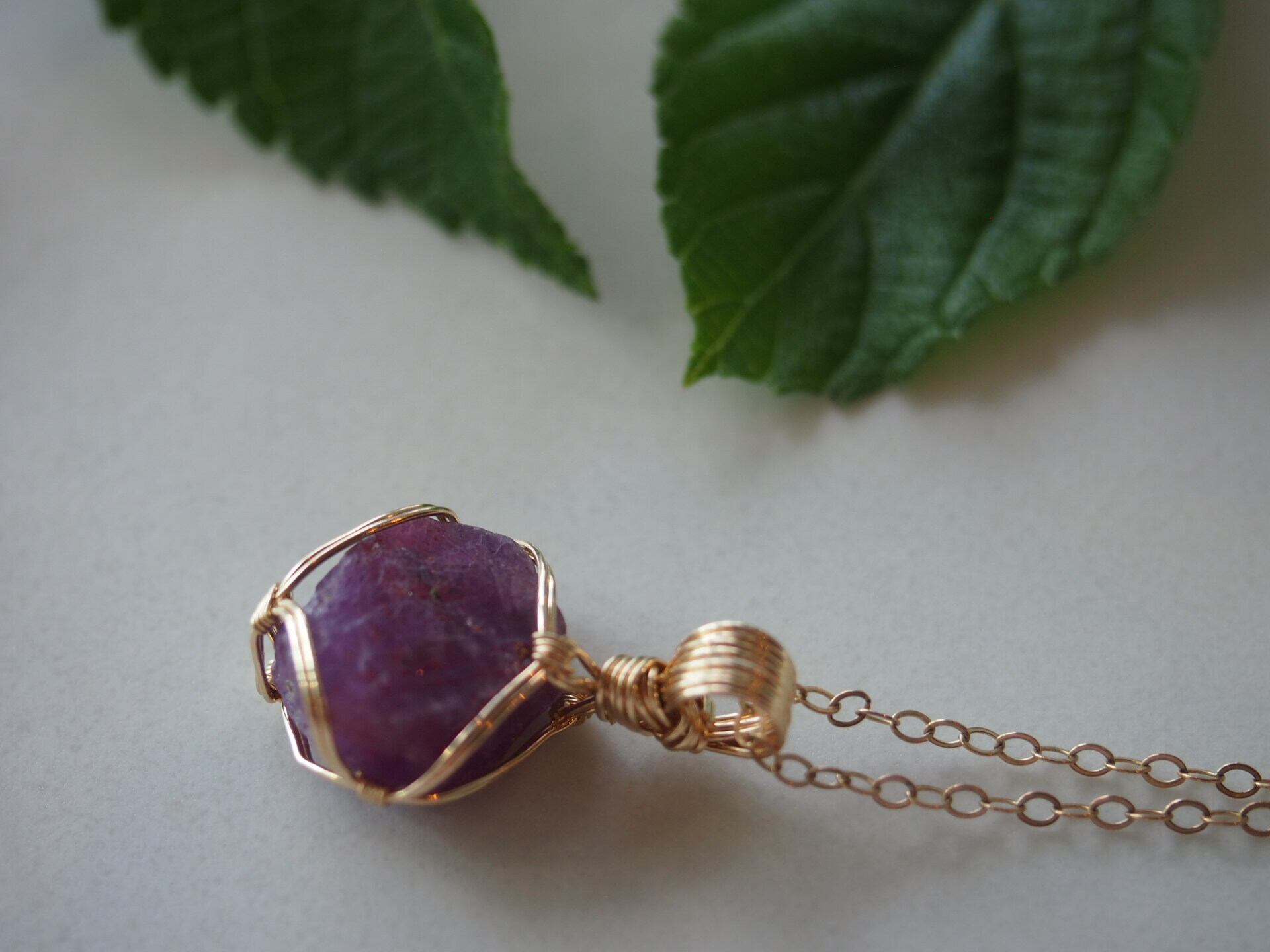 ルビーの原石を14kgfワイヤーで繊細に女神巻きペンダントトップに仕上げました♡