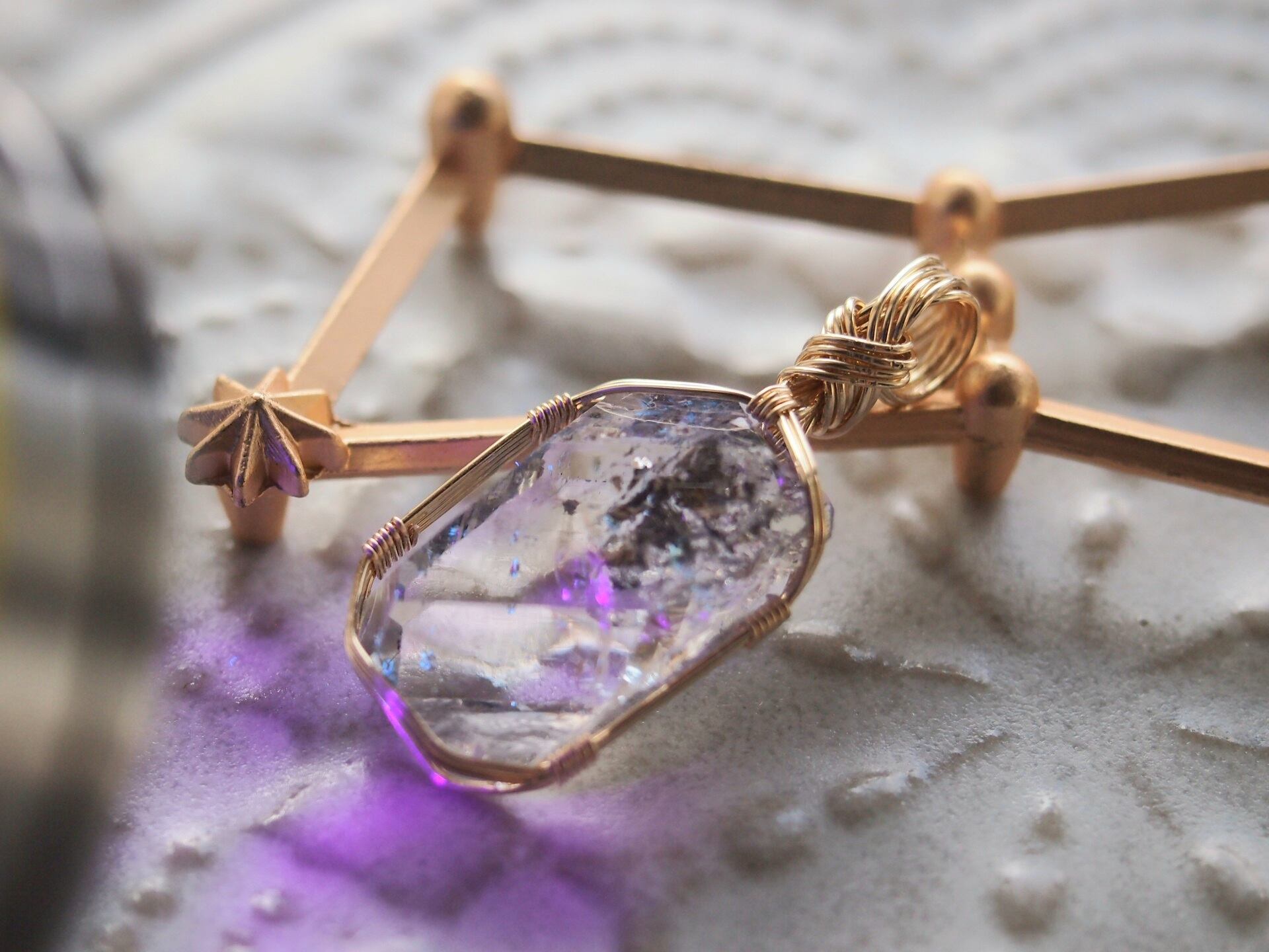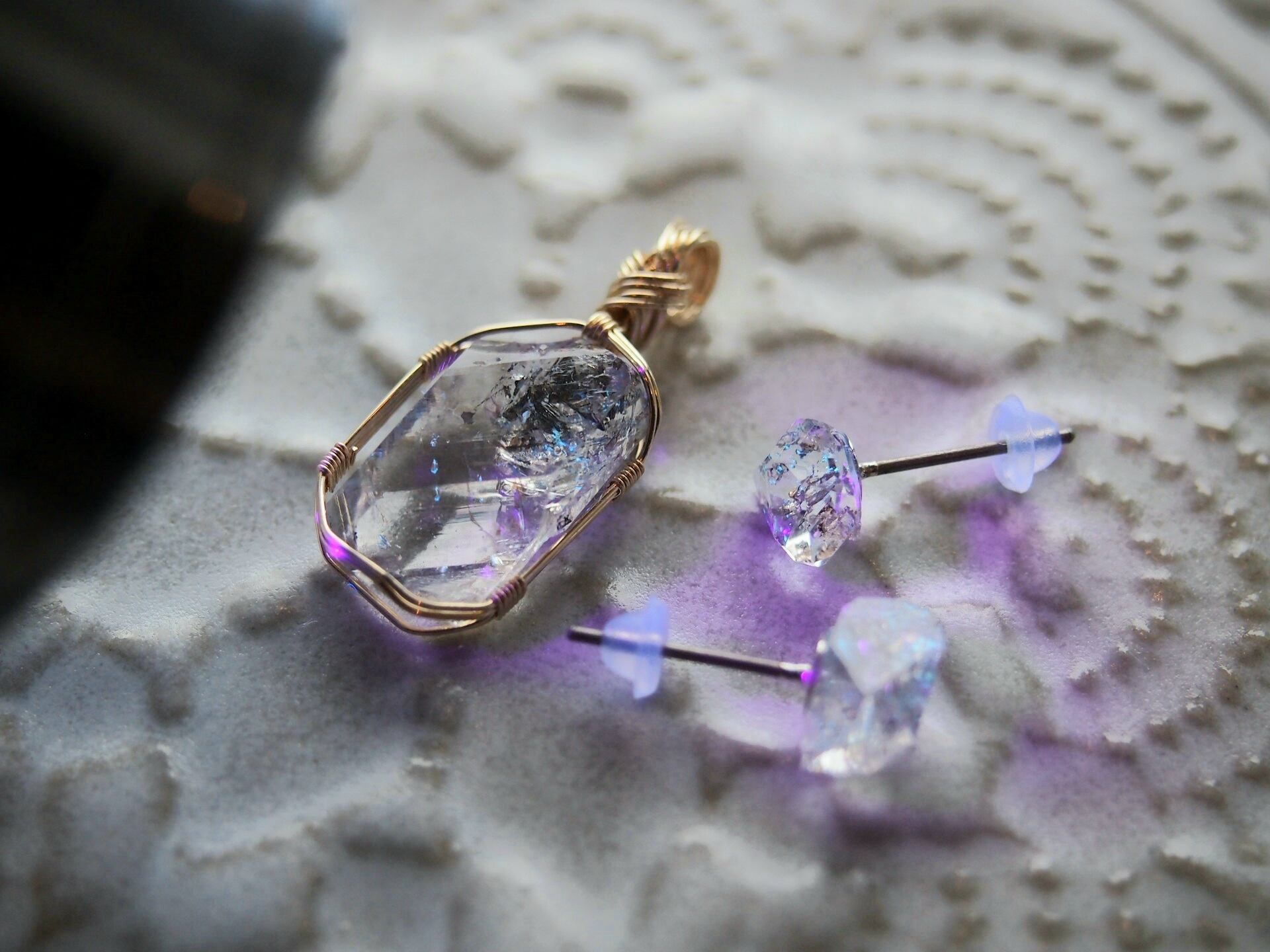 ・なるべくストーンを美しく見せるため、繊細な技術を使ってワイヤーで巻いております。ワイヤー部分に無理な力をかけたり、引っ張ったりするとデザインが損なわれてしまう可能性がございます。