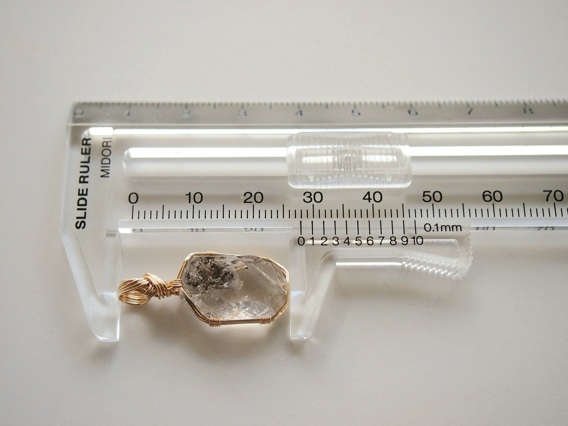 こちらは透明な水晶に黒っぽい内包物が肉眼で確認できます。