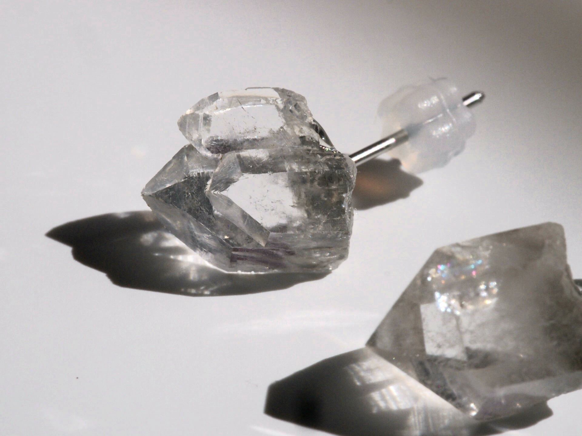 天然のものですので、もちろん左右で石の形状が違うのですが、一つは単結晶、もう一つ派3つの結晶がくっついたミニクラスタータイプです。
