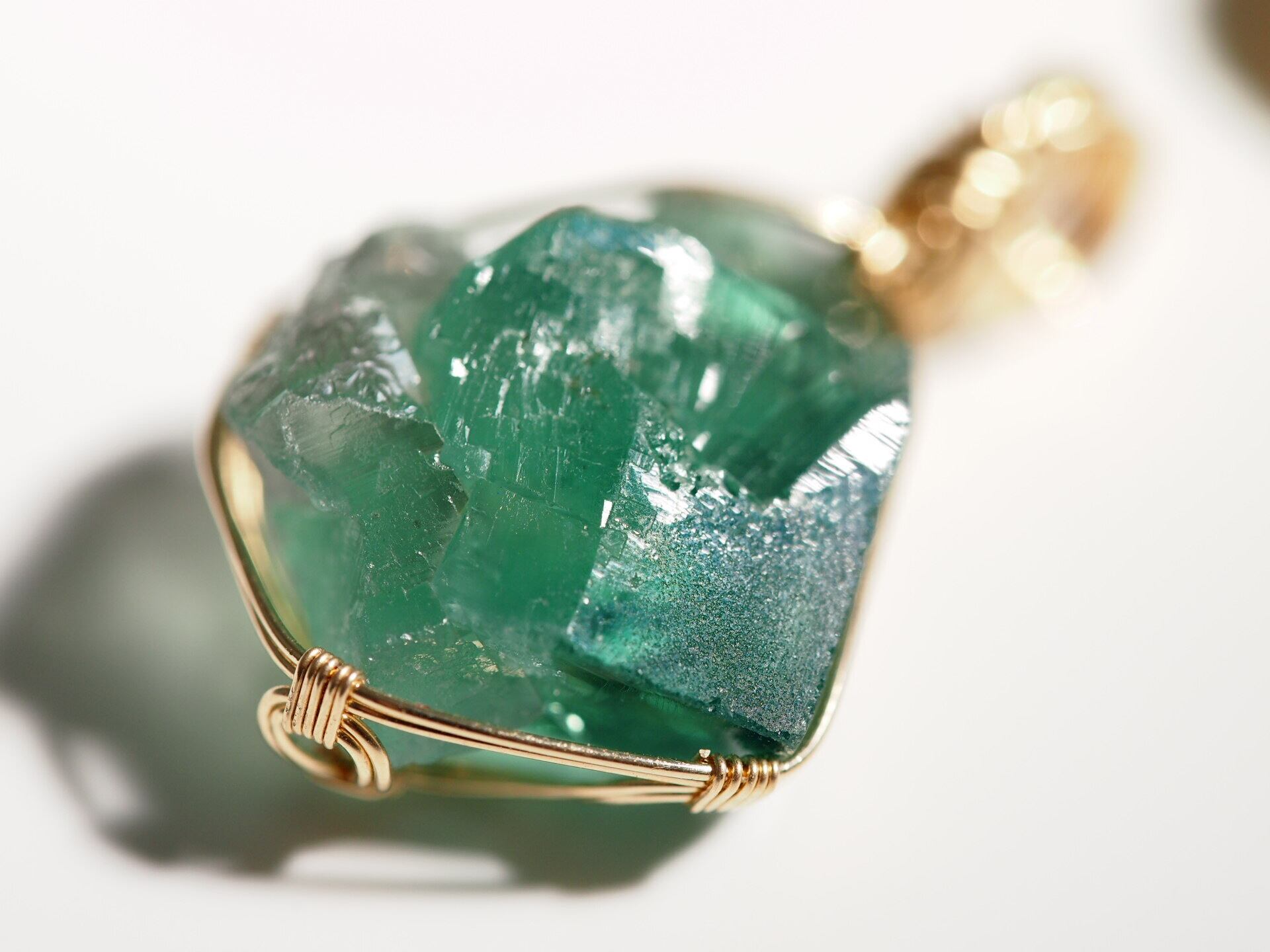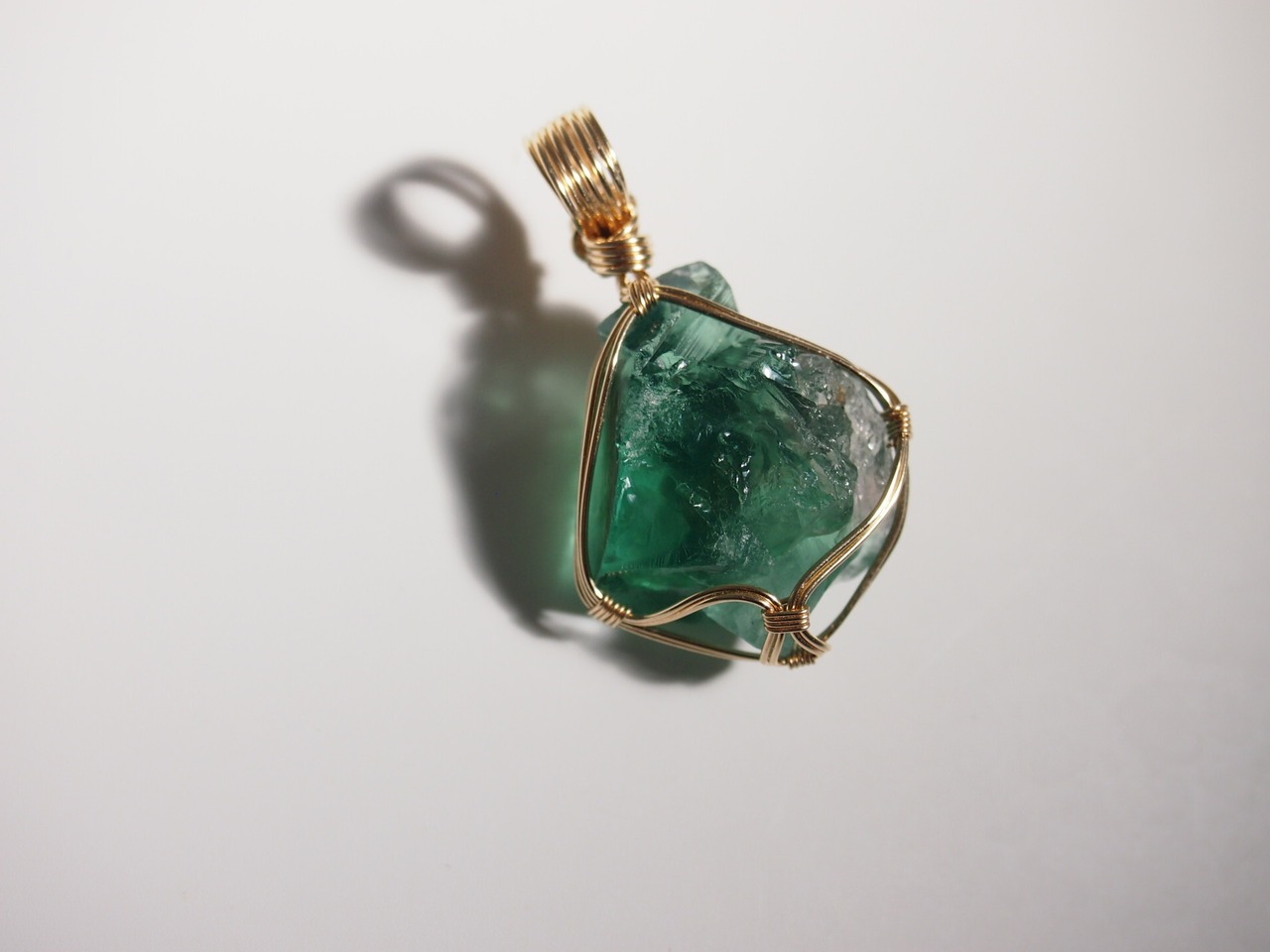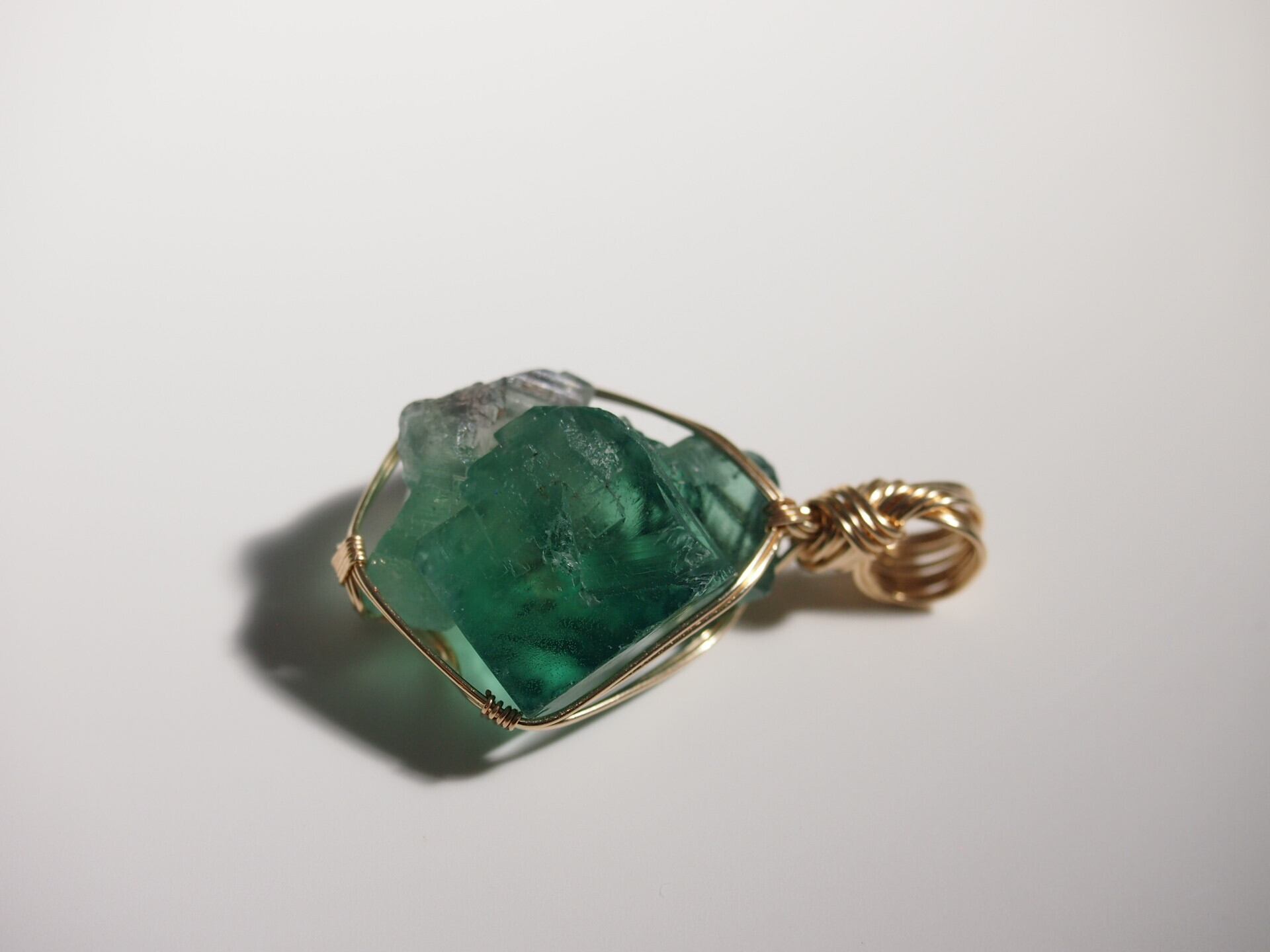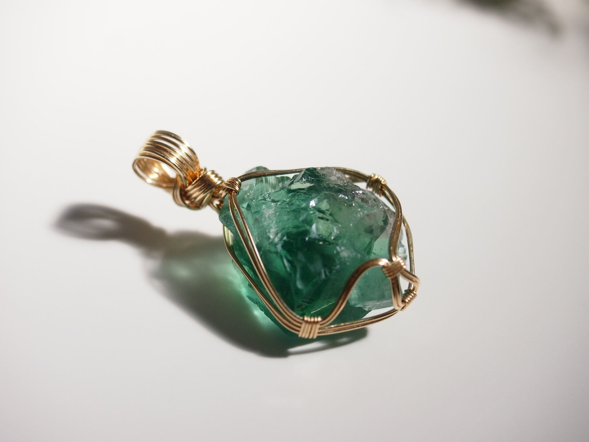 イギリスロジャリー産フローライト原石を14kgfワイヤーで繊細に女神巻きペンダントトップに仕上げました♡