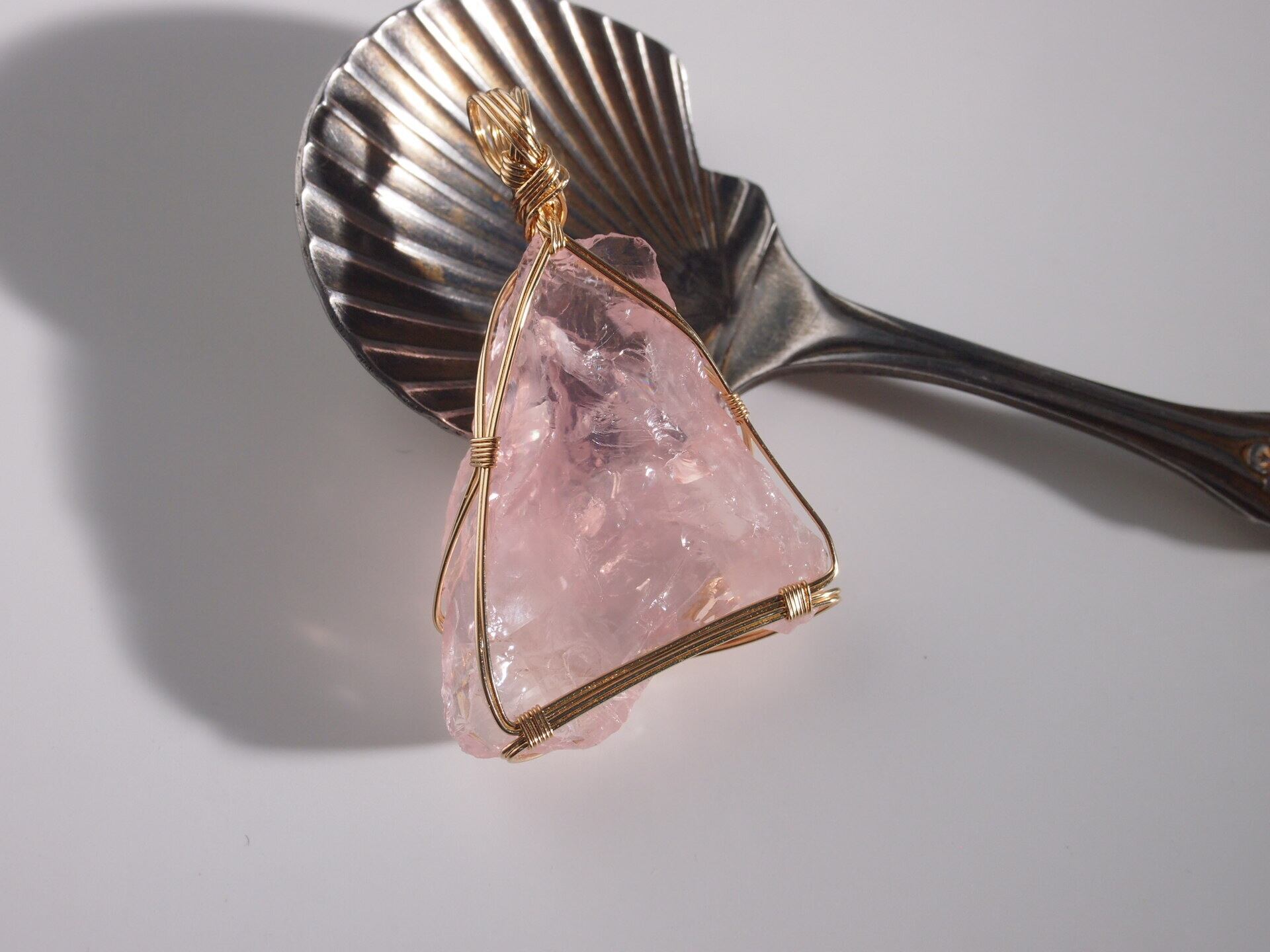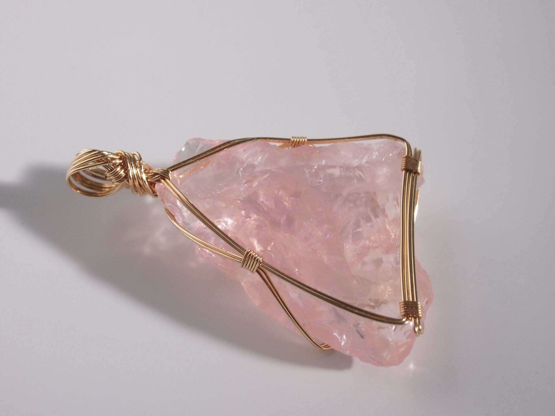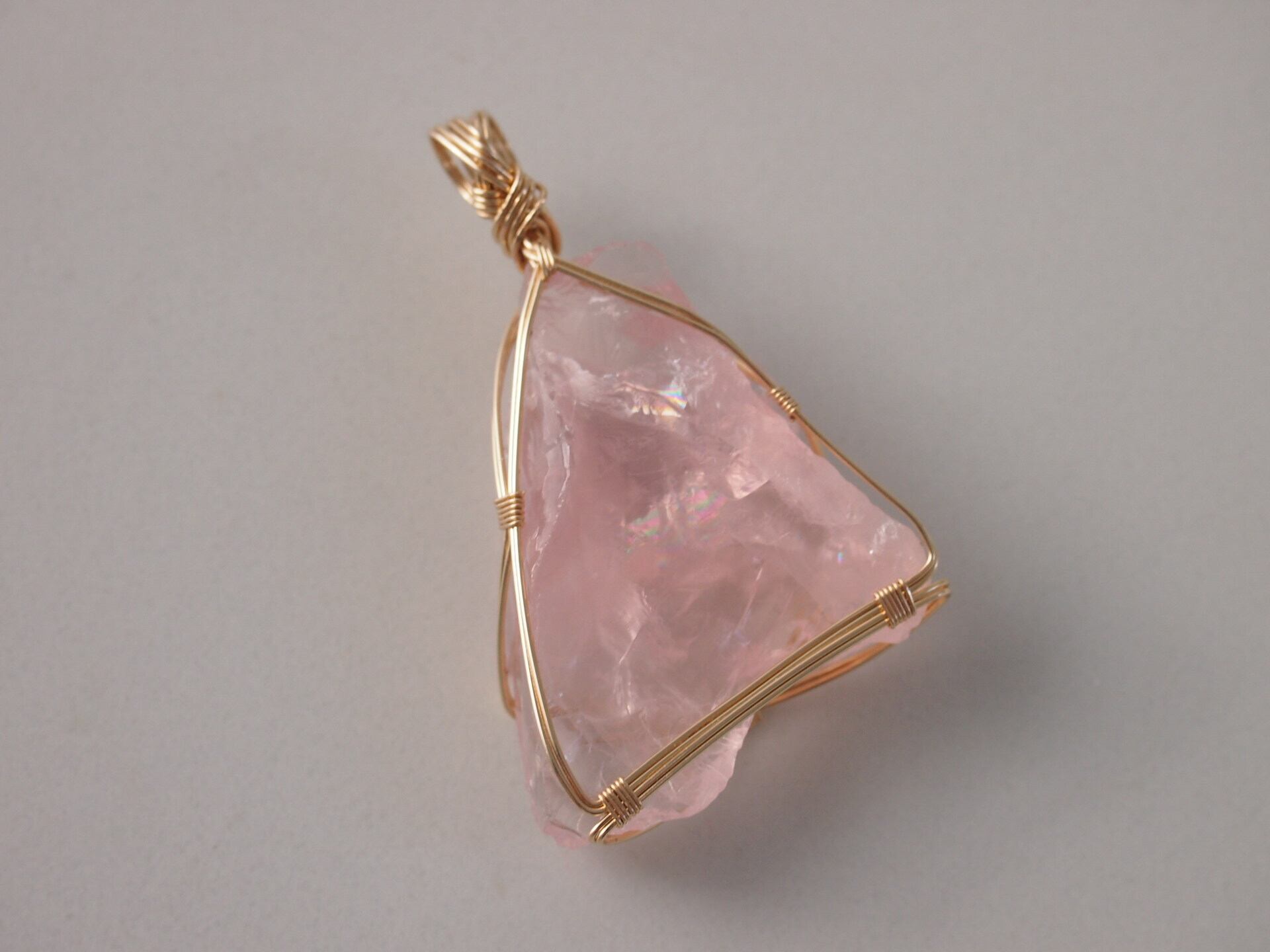 ローズクォーツのラフロックを14kgfワイヤーで繊細に女神巻き®ペンダントトップに仕上げました♡