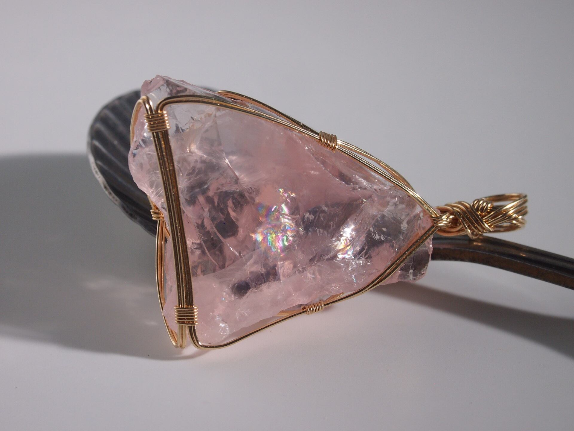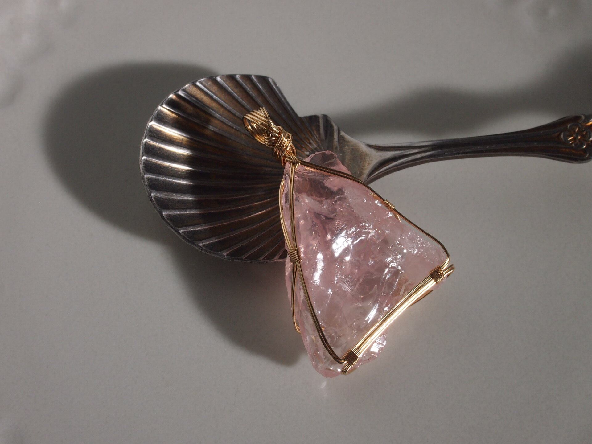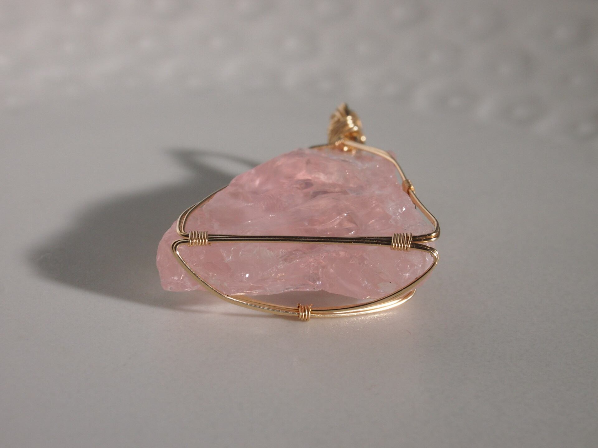 ローズクォーツのラフロックを14kgfワイヤーで繊細に女神巻き®ペンダントトップに仕上げました♡