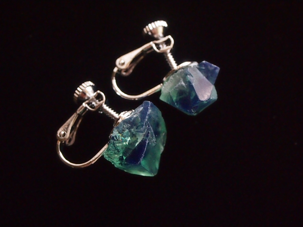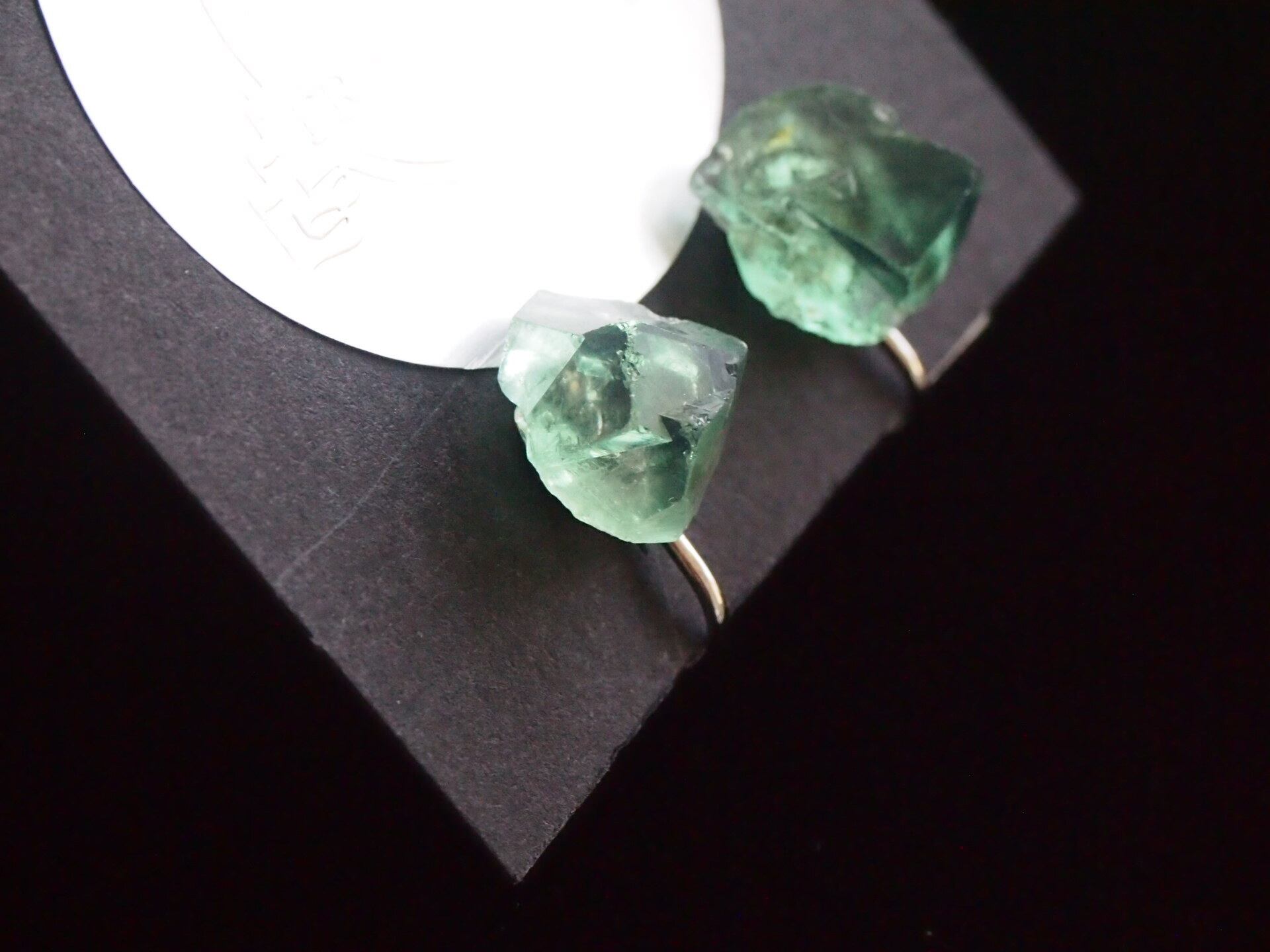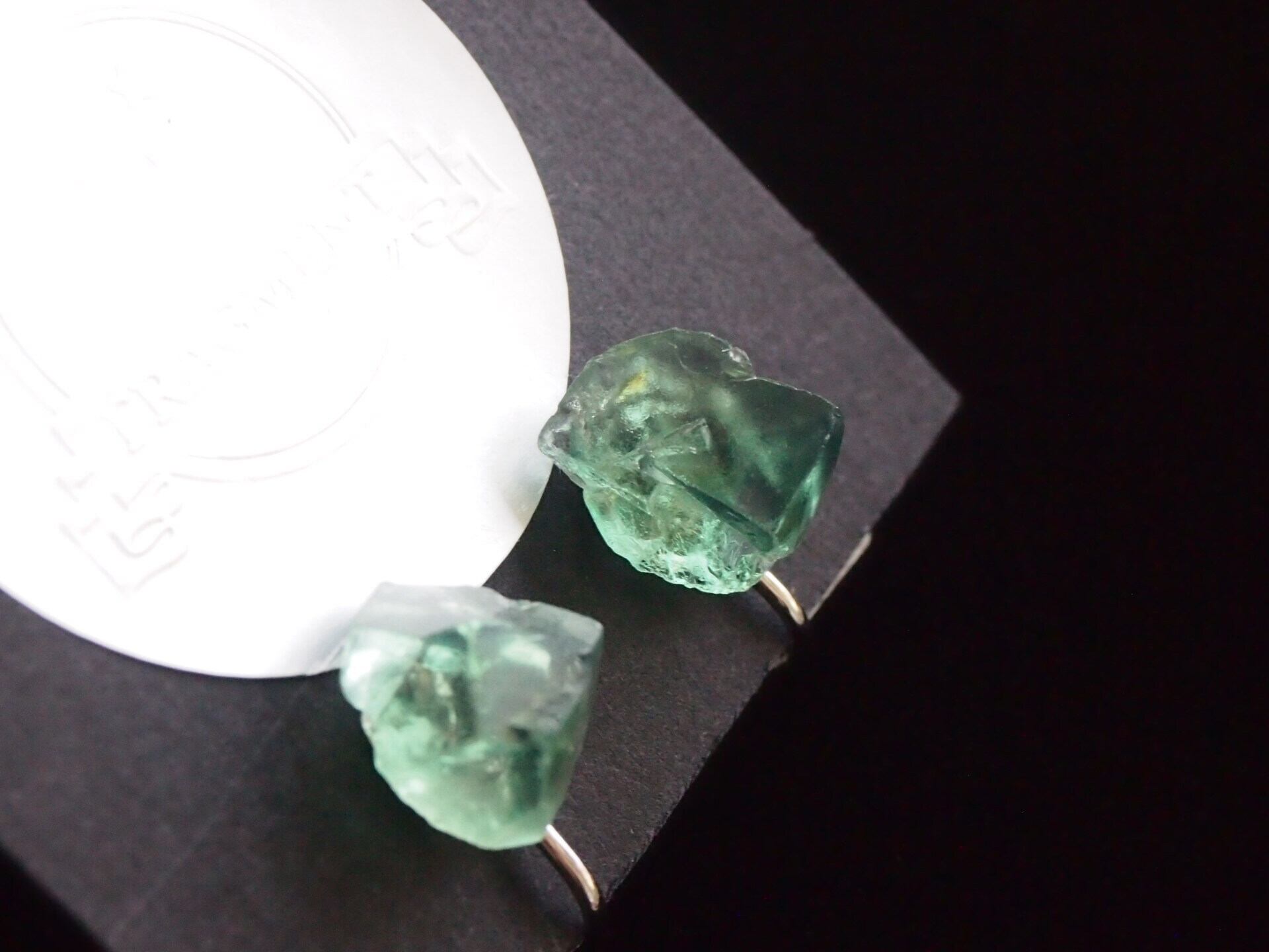 強蛍光でよく知られるイギリスのロジャリー鉱山のフローライトの結晶で、イヤリングを制作しました✧
