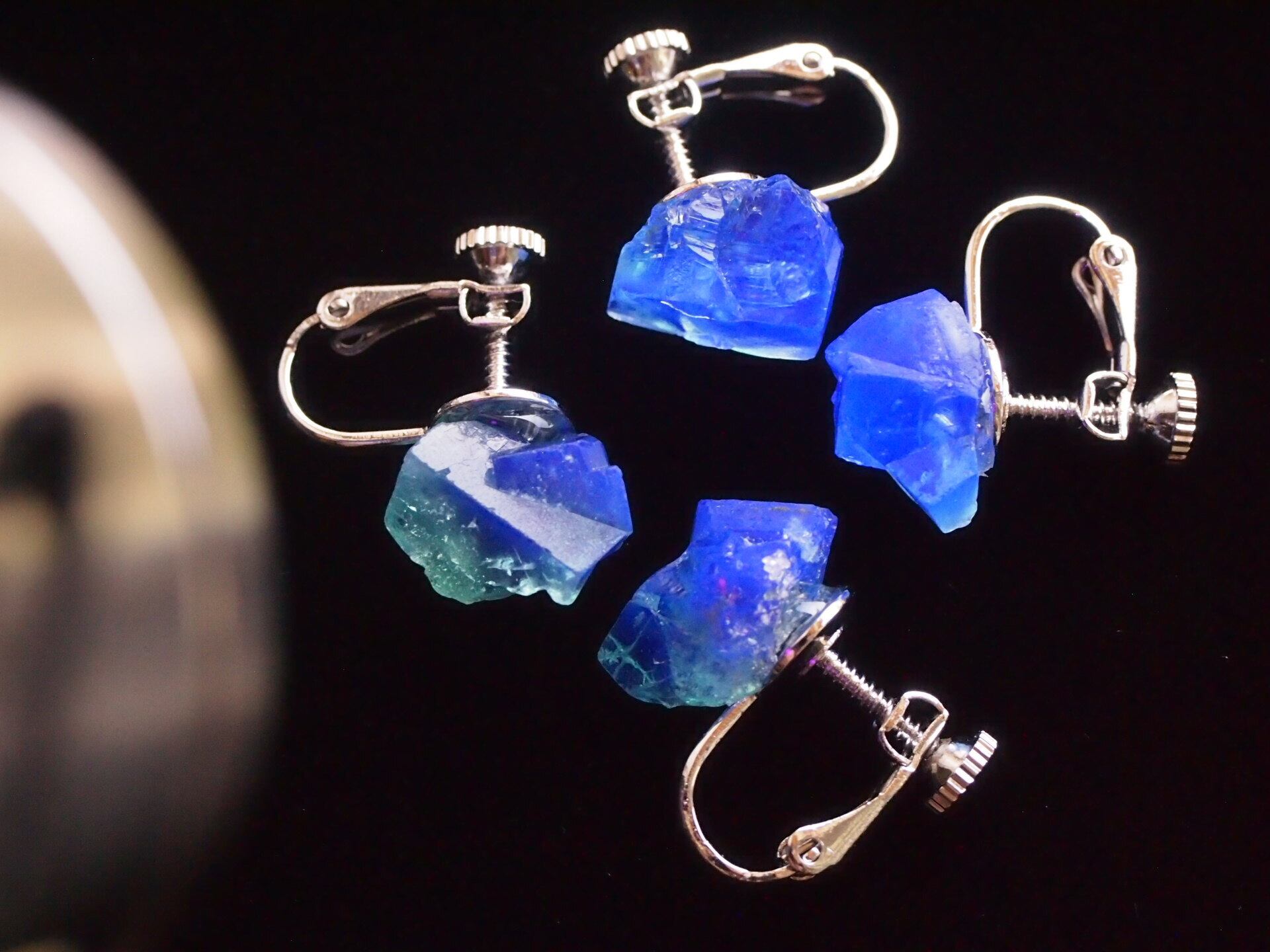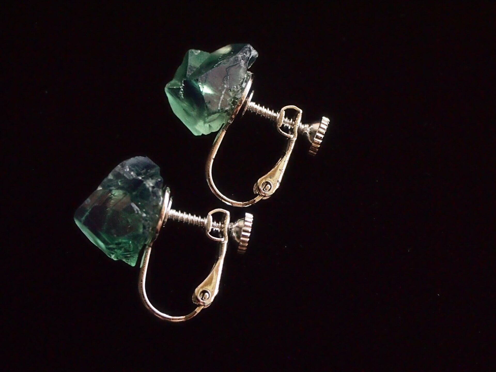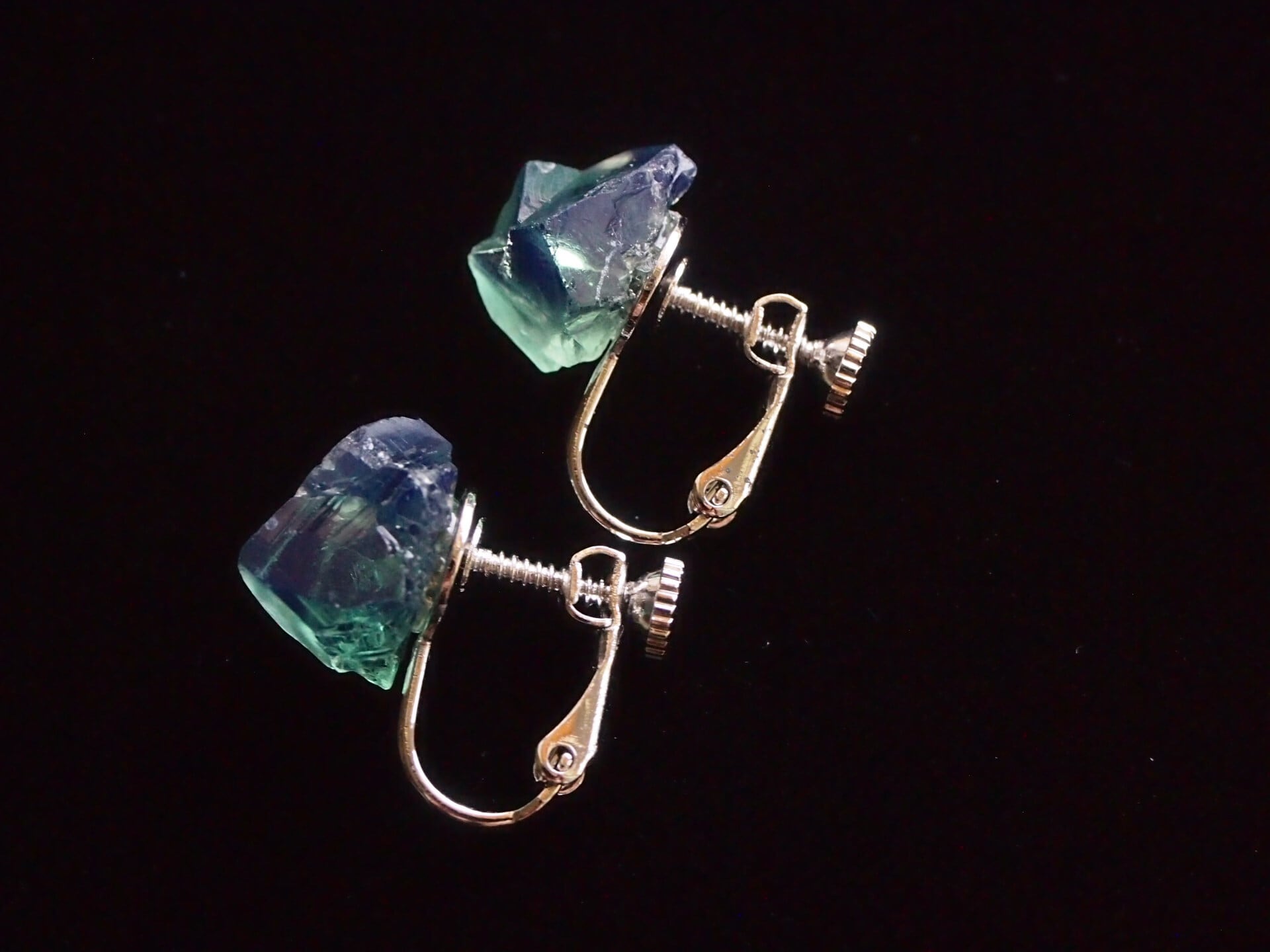 強蛍光でよく知られるイギリスのロジャリー鉱山のフローライトの結晶で、イヤリングを制作しました✧