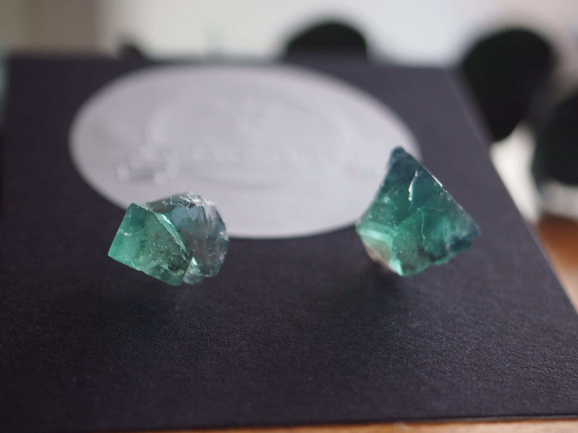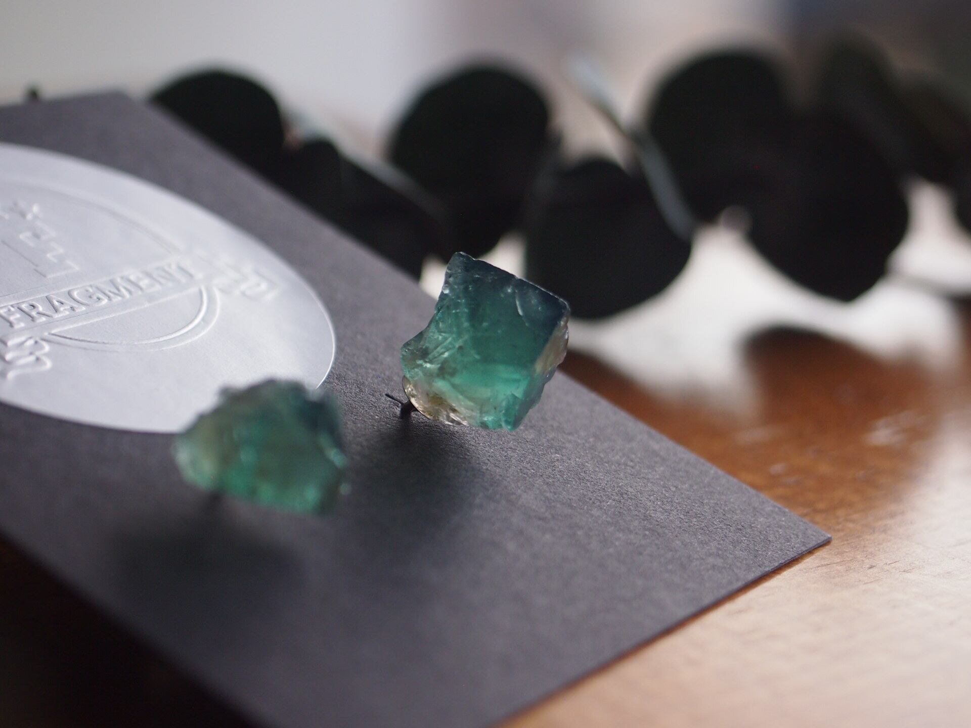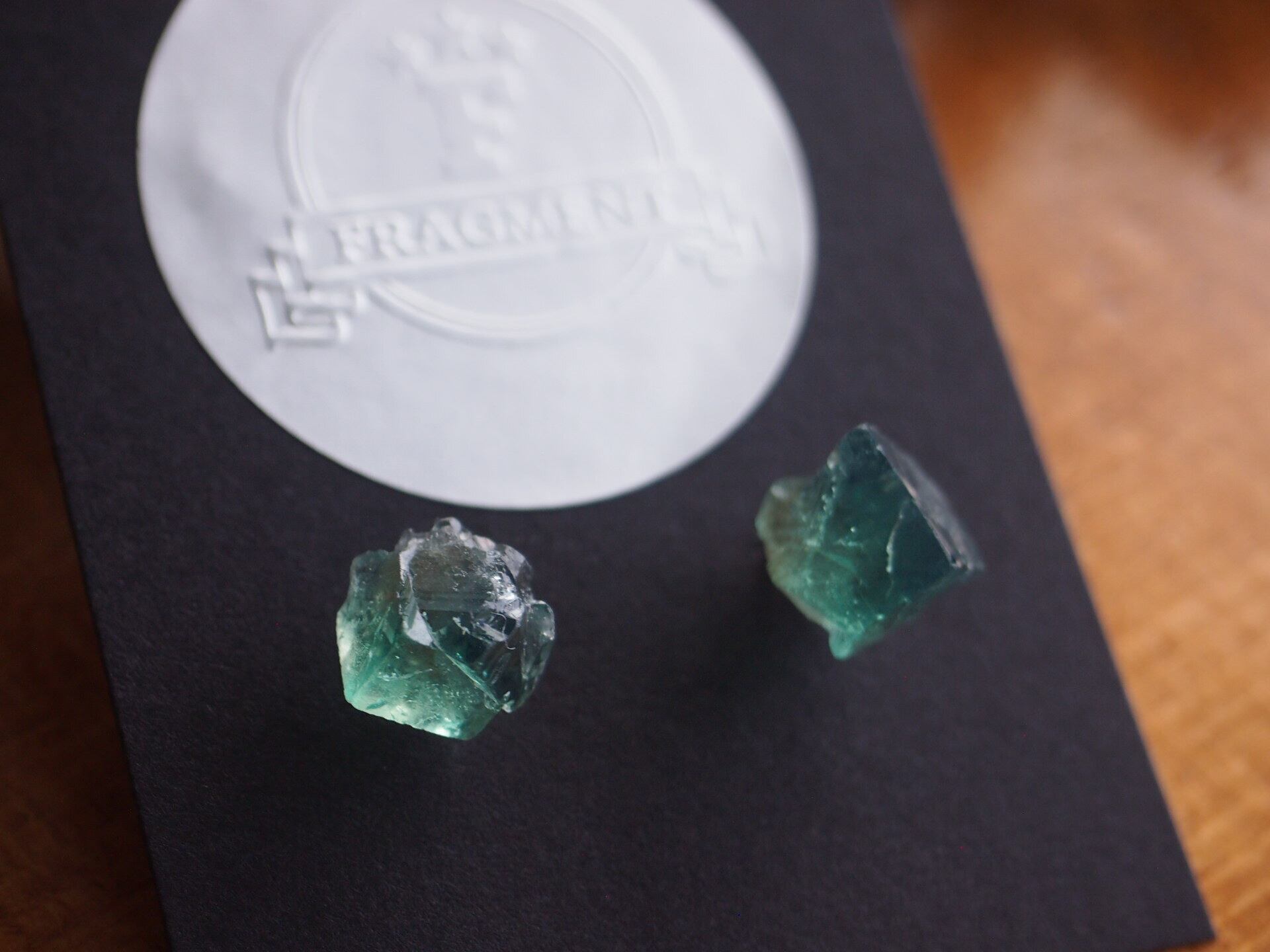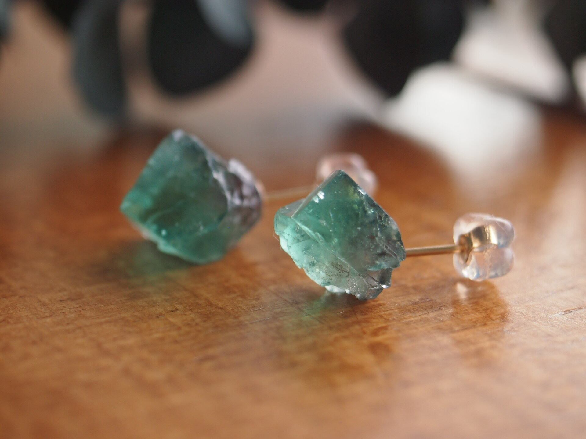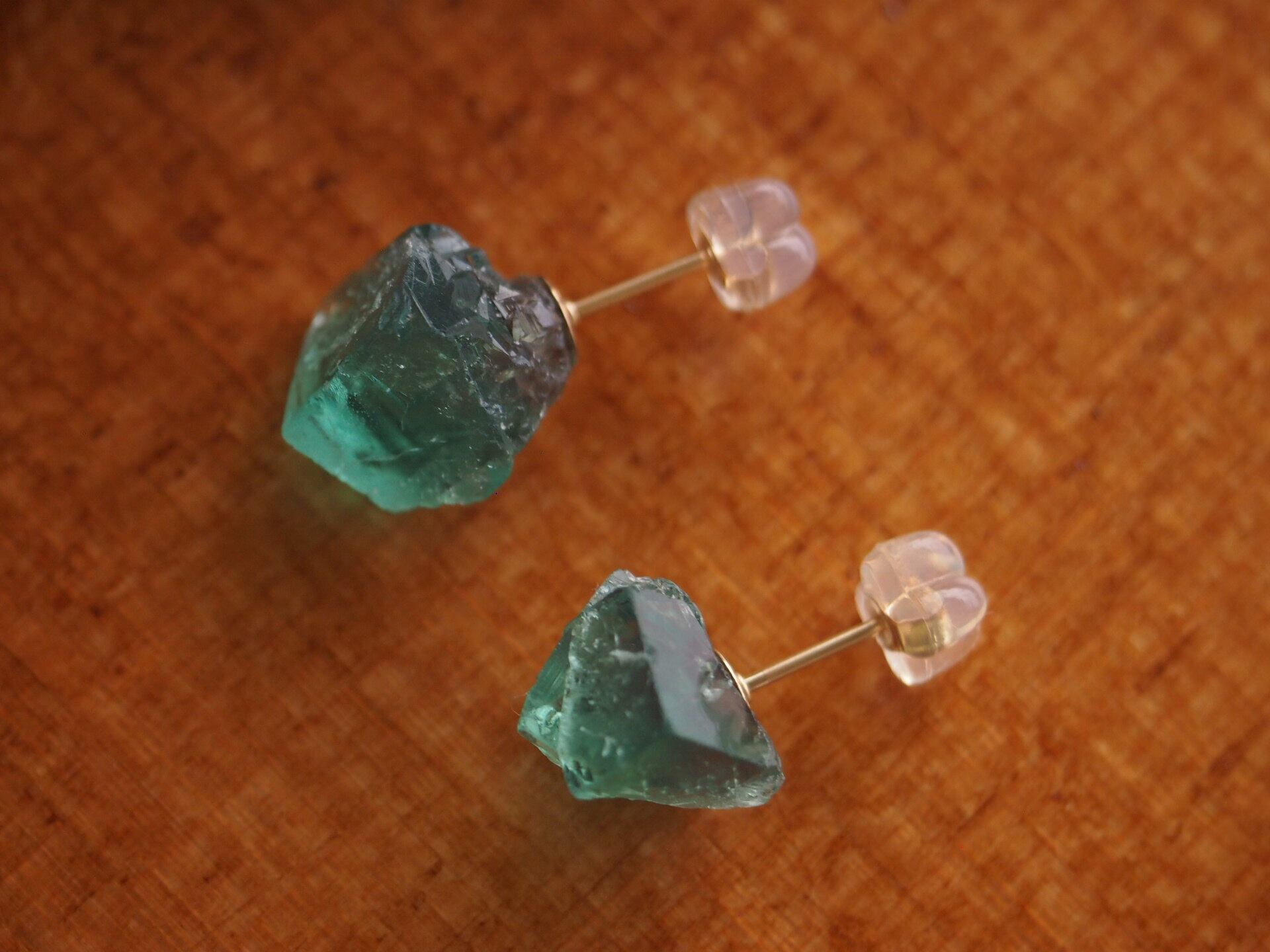 強蛍光でよく知られるイギリスのロジャリー鉱山の小さめのフローライトの結晶で、ピアスを制作しました✧
