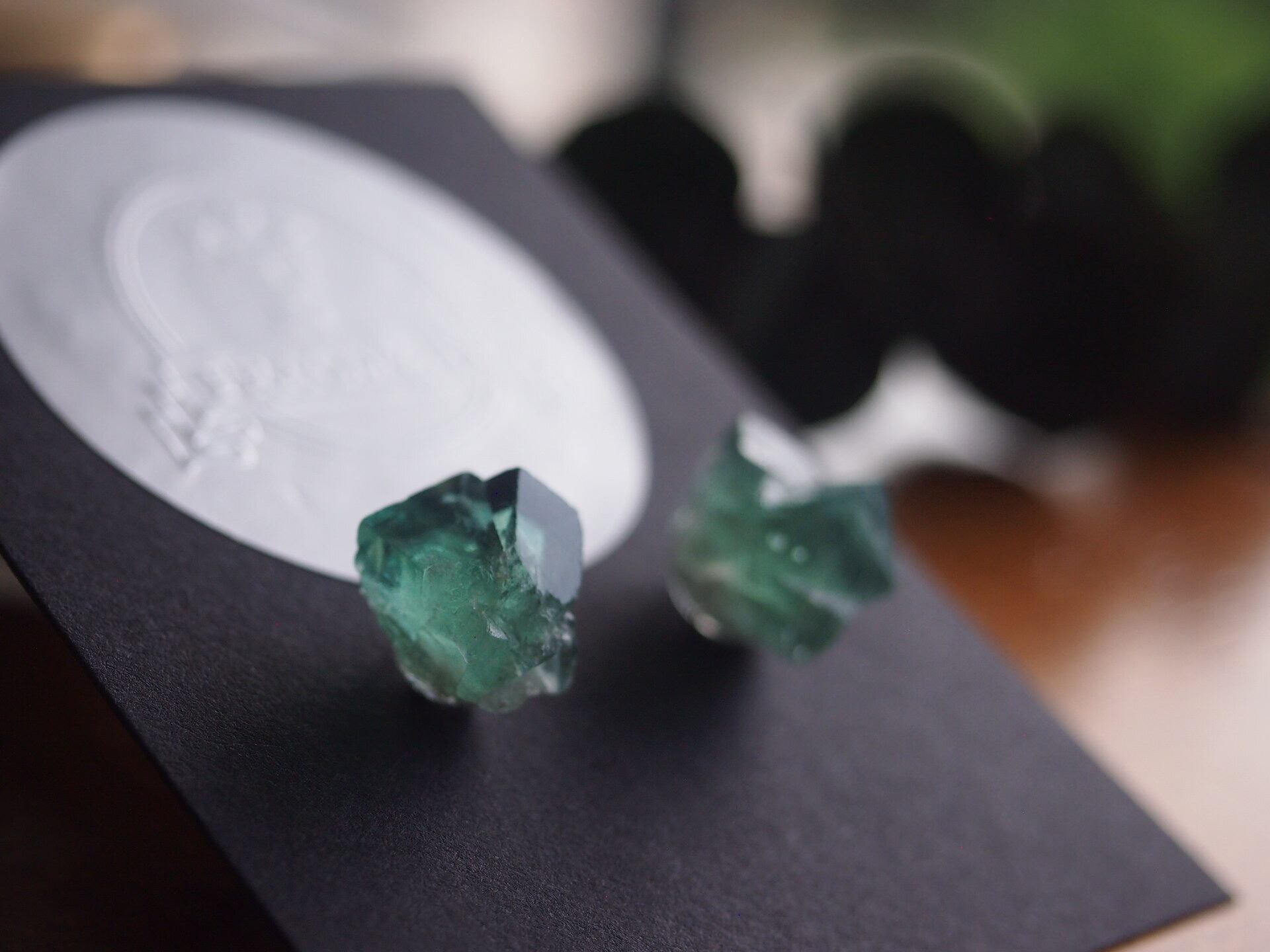 強蛍光でよく知られるイギリスのロジャリー鉱山のフローライトの貫入双晶の原石で、ピアスを制作しました✧