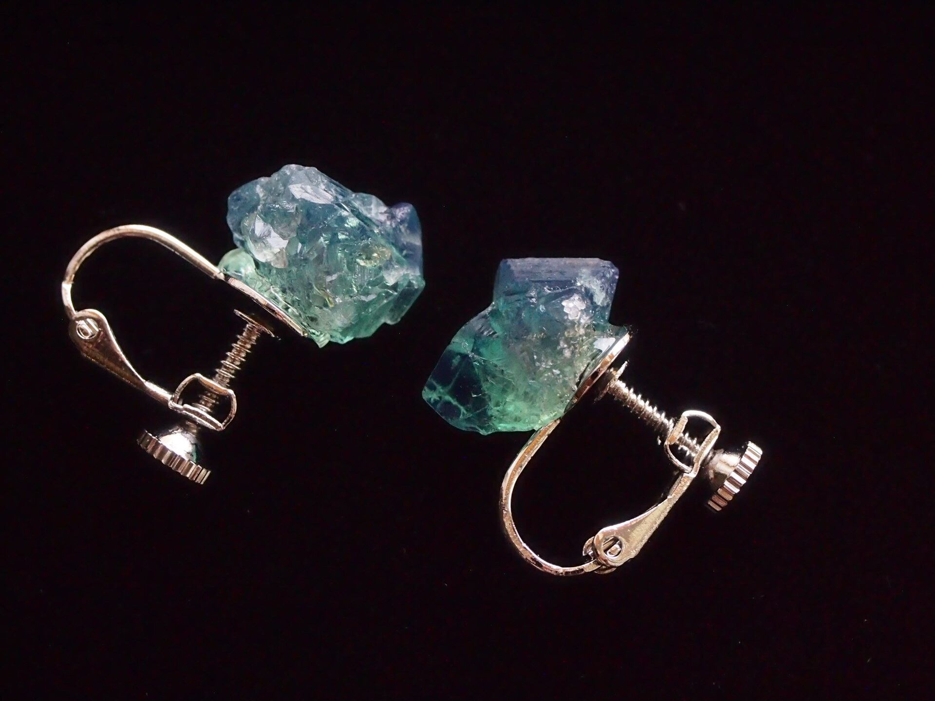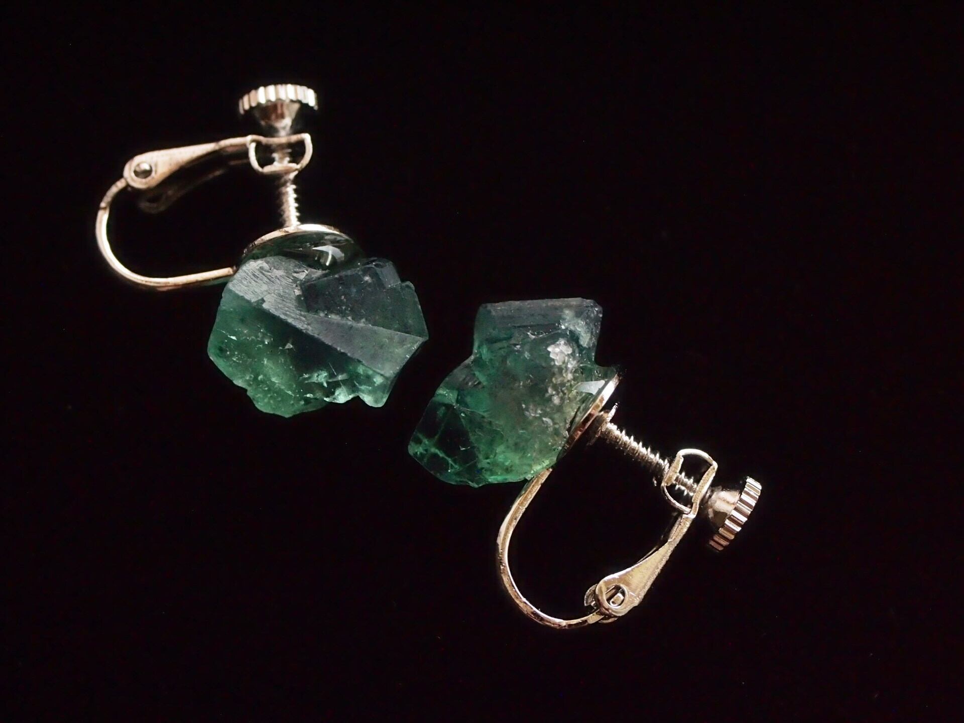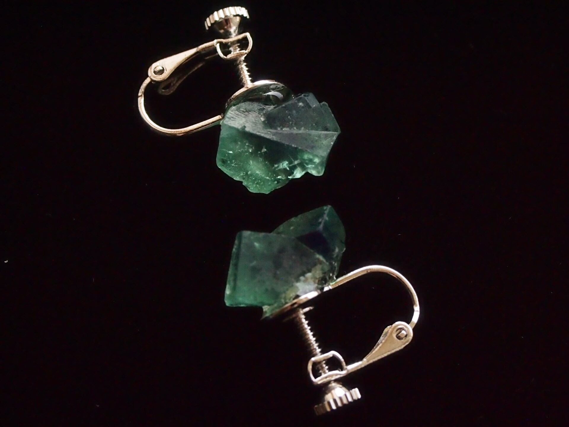 強蛍光でよく知られるイギリスのロジャリー鉱山のフローライトの結晶で、イヤリングを制作しました✧