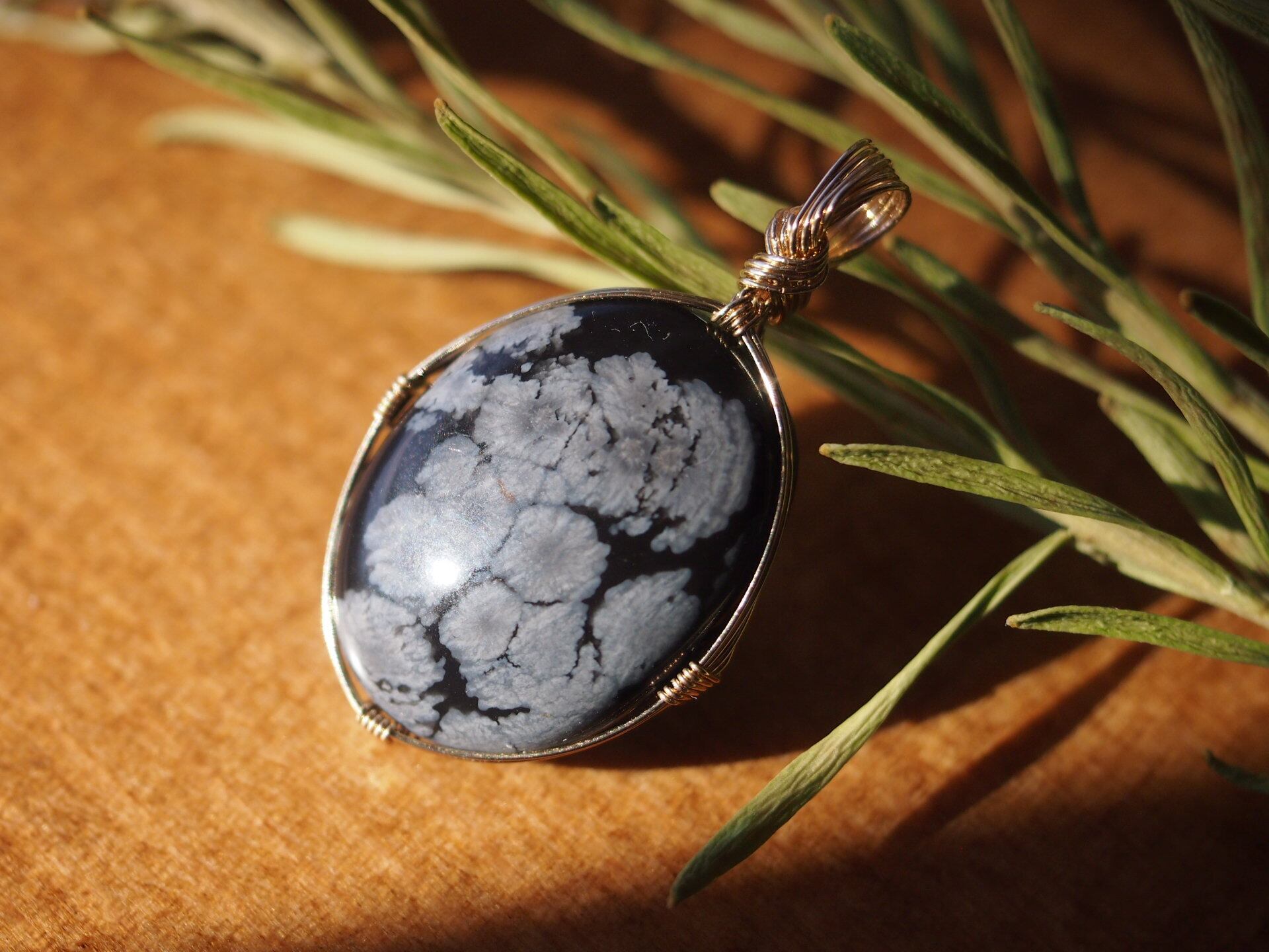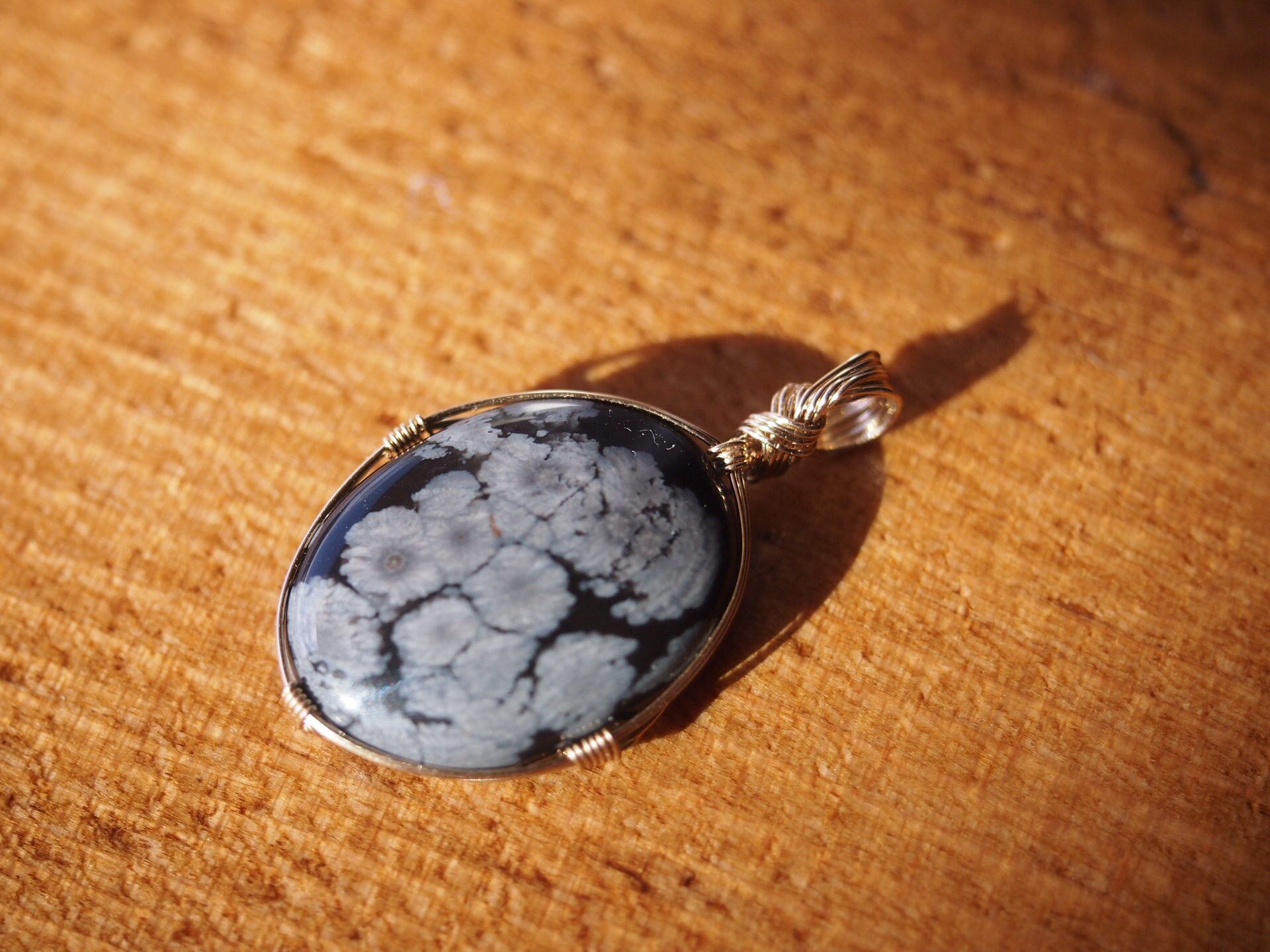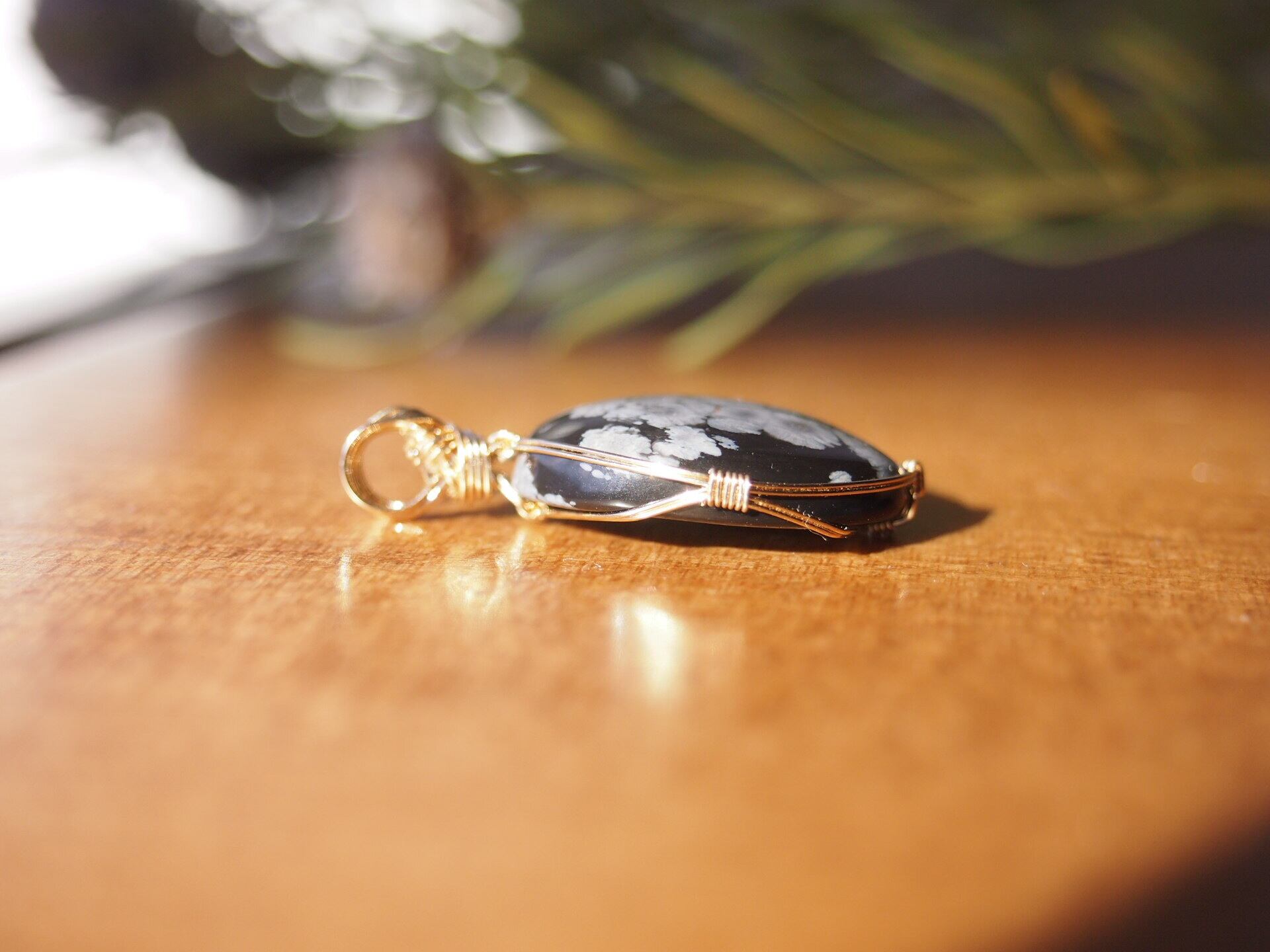 お花のような模様のカボションカットのオブシディアンを、14kgfワイヤーで繊細に女神巻き®ペンダントトップに仕上げました♡