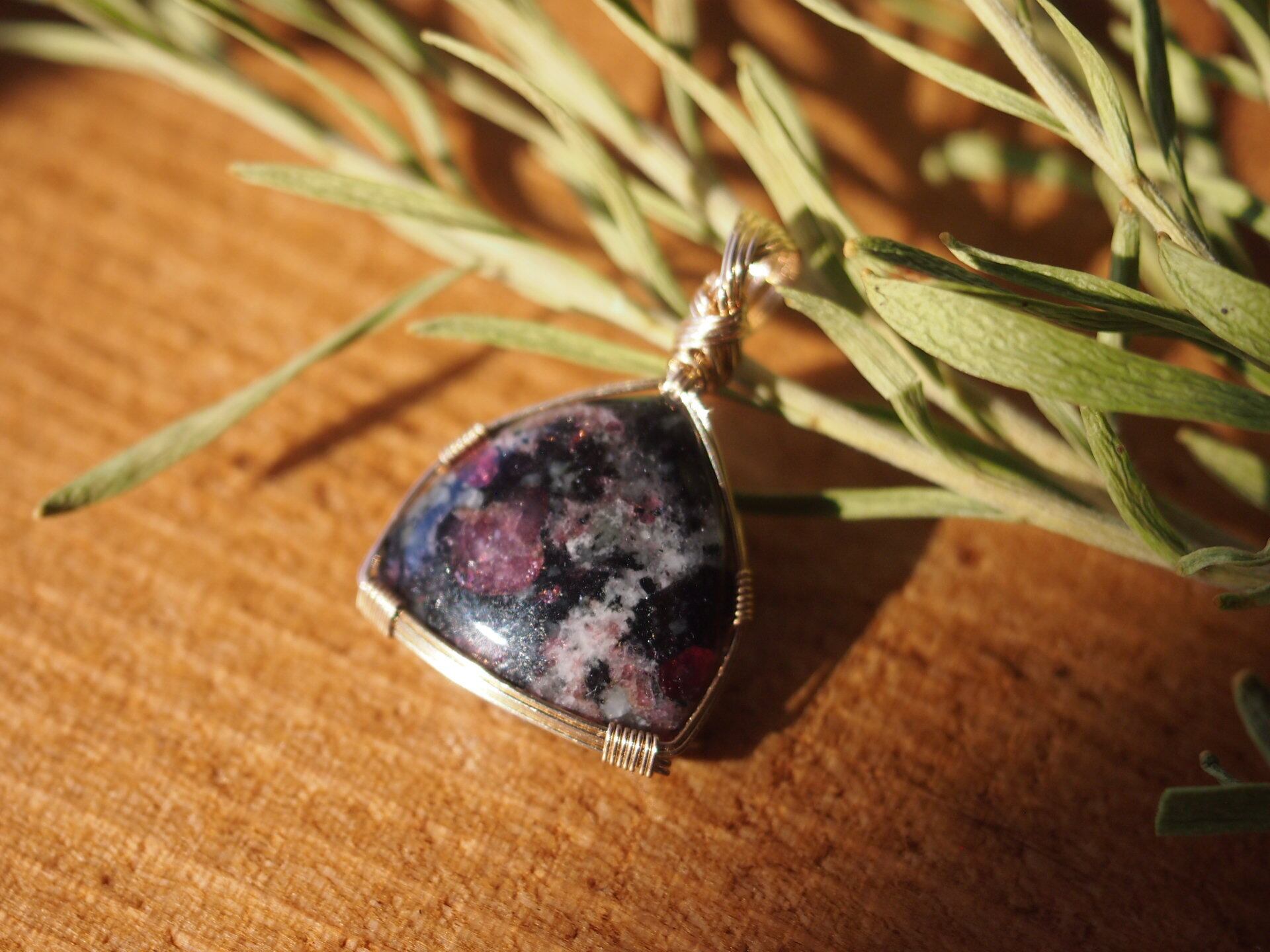 ぷっくりした曲線を持つトリリアントカットを施されたユーディアライトを、14kgfワイヤーで繊細に女神巻き®ペンダントトップに仕上げました♡