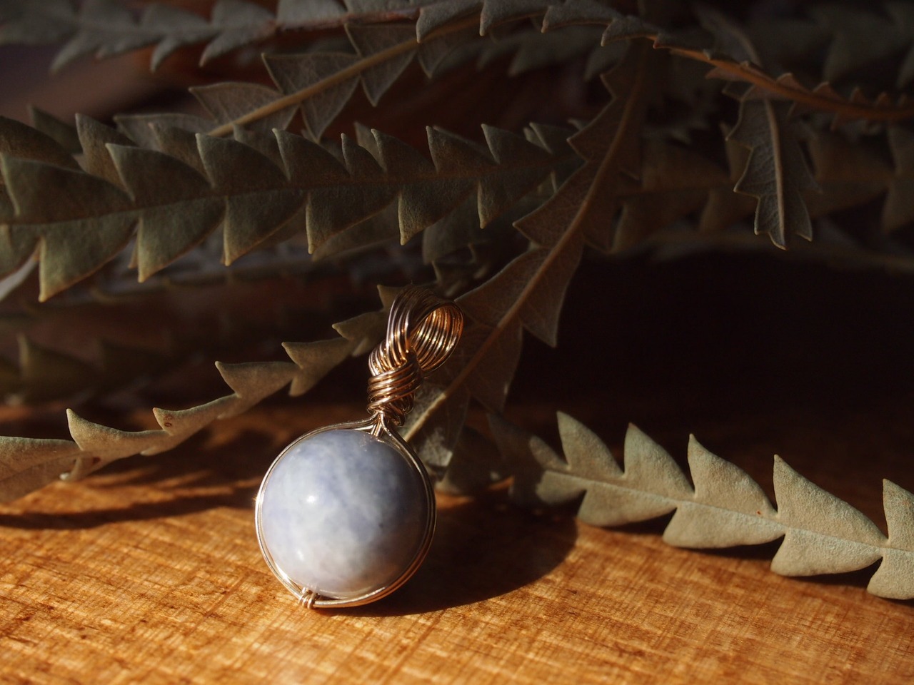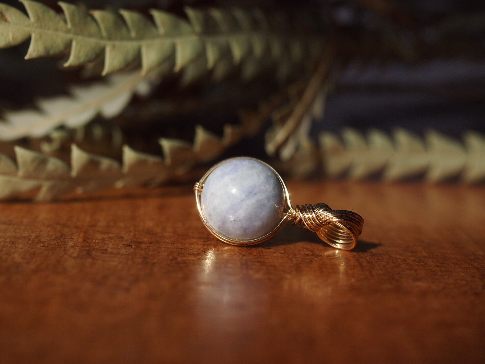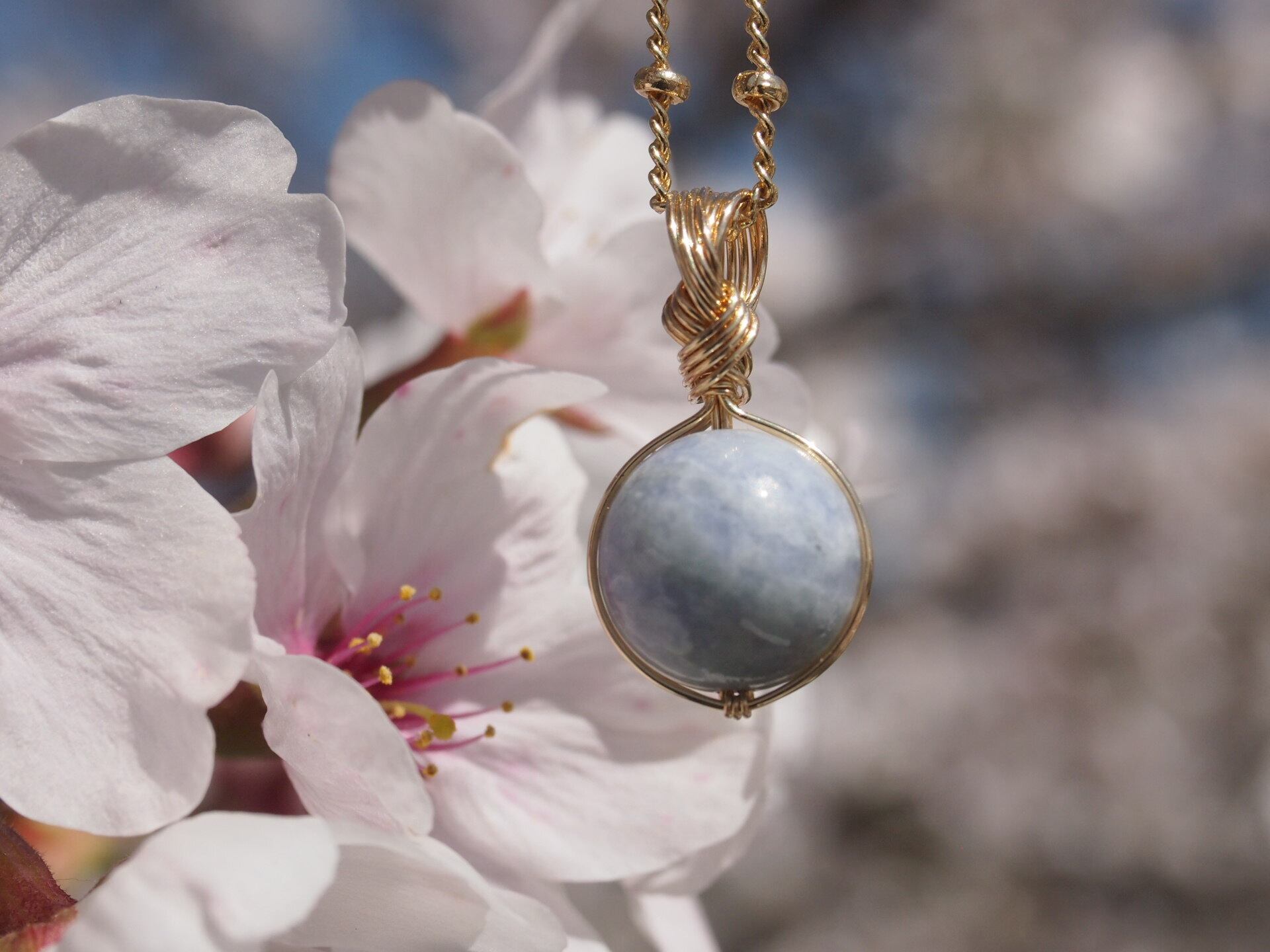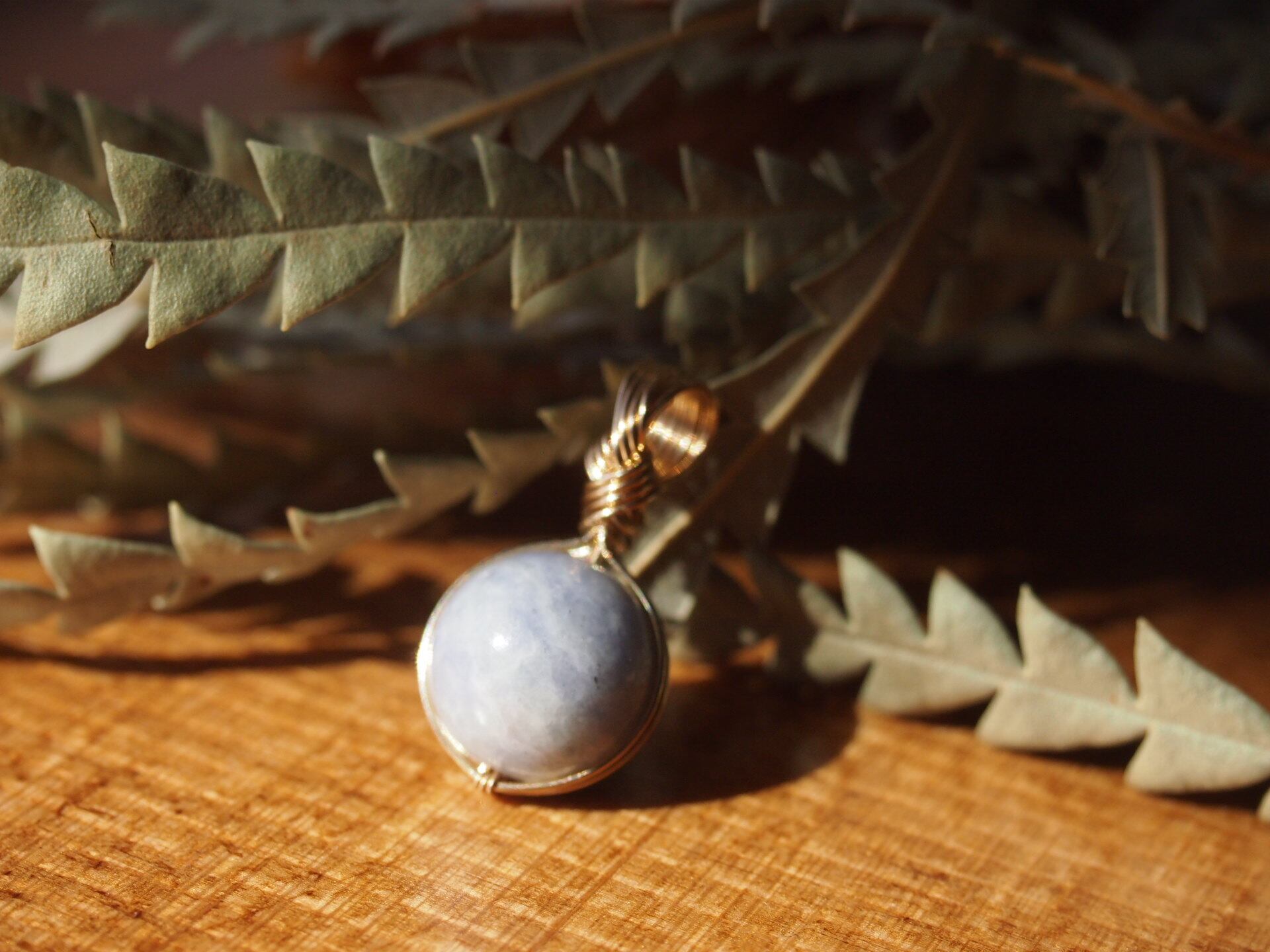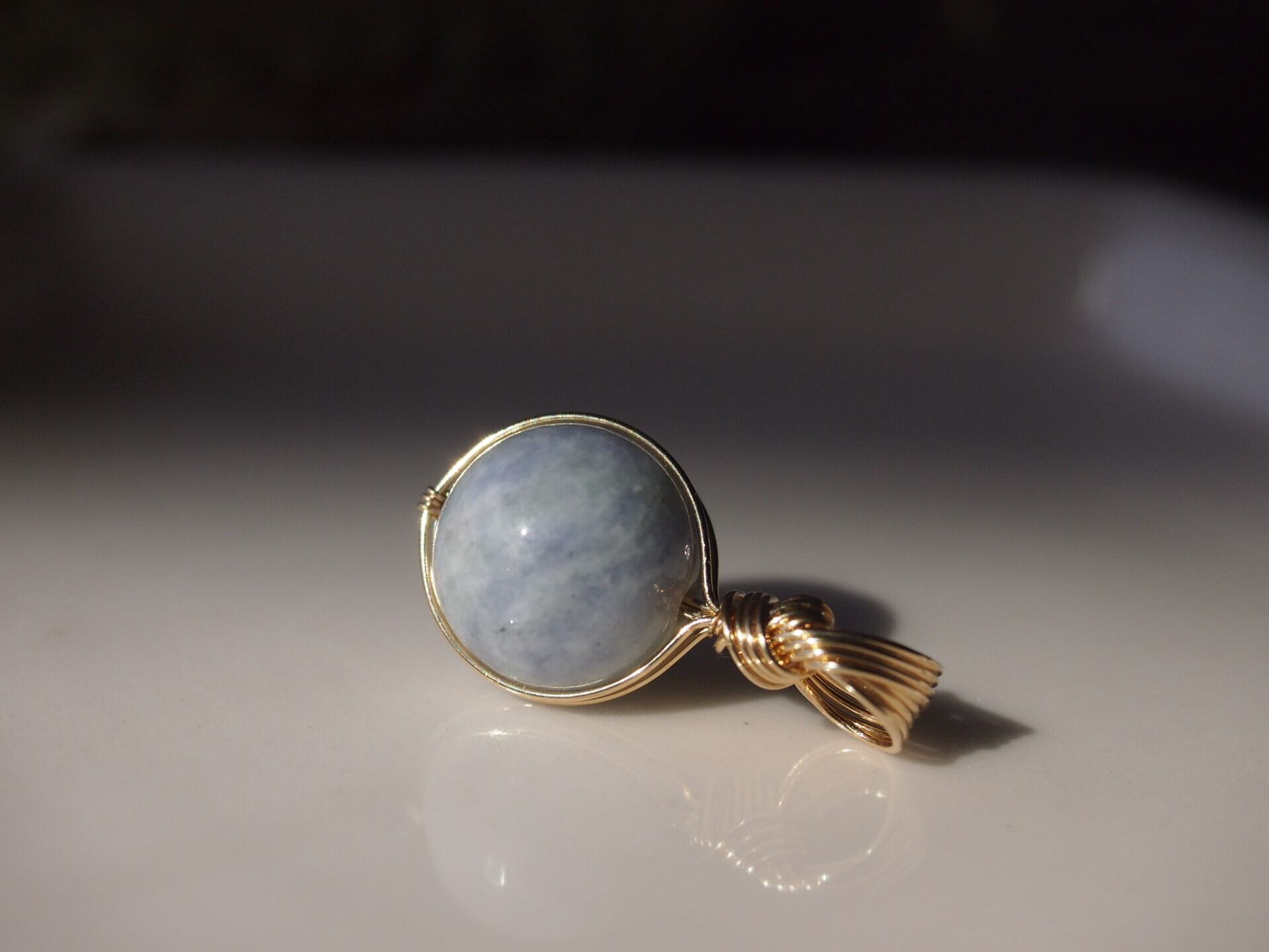 ラベンダー翡翠の10mmの丸玉を14kgfワイヤーで繊細に女神巻き®ペンダントトップに仕上げました♡