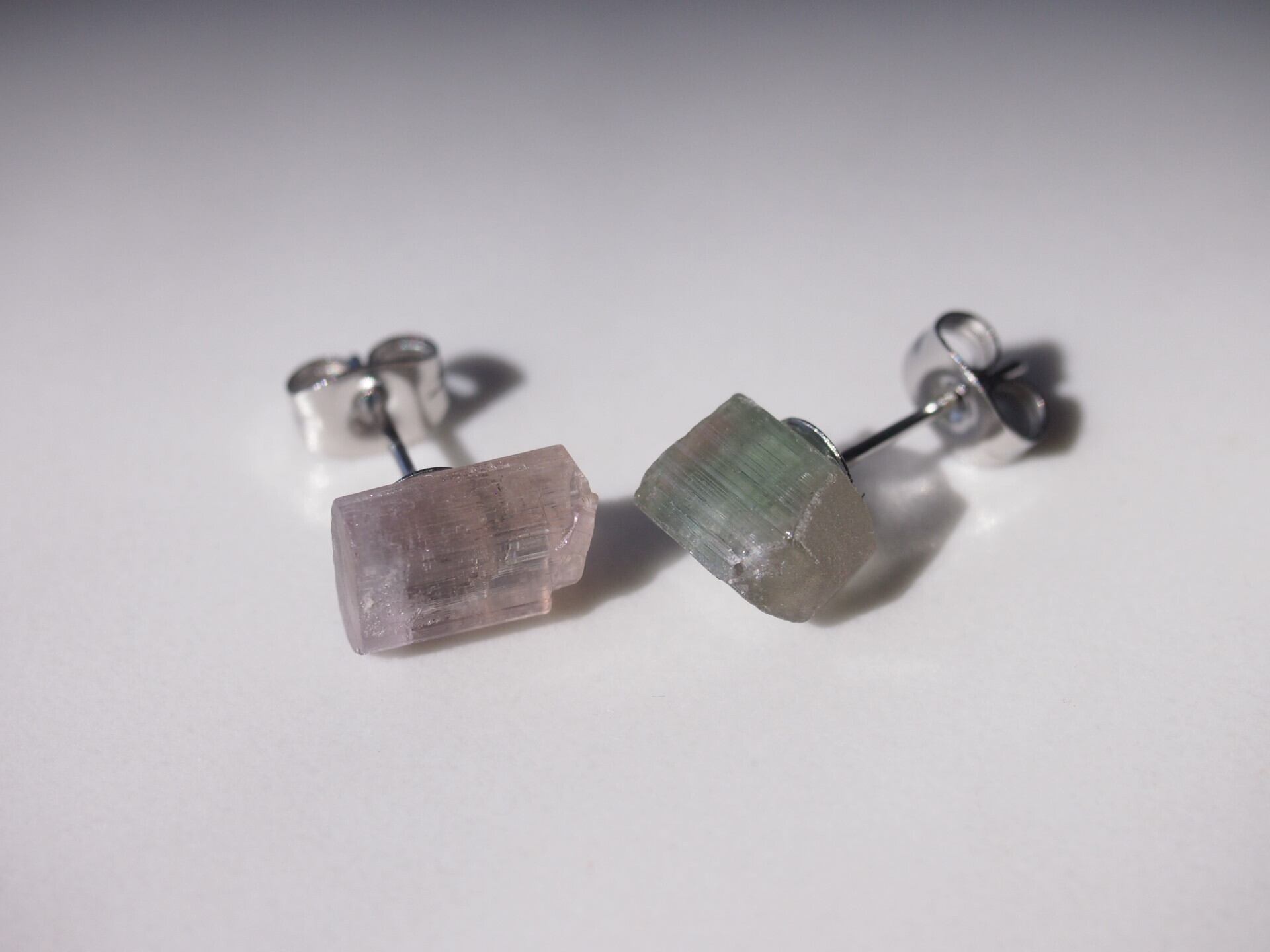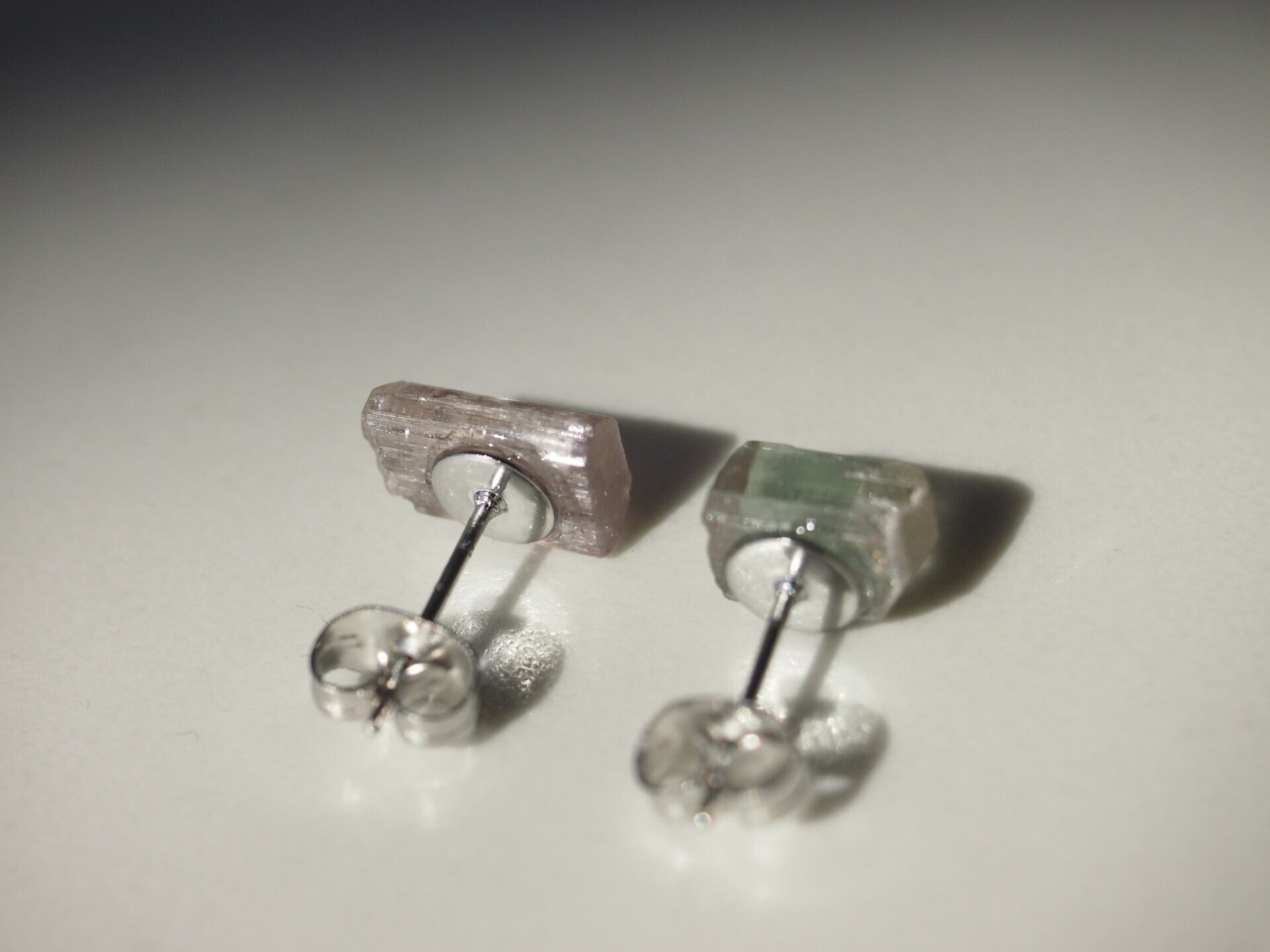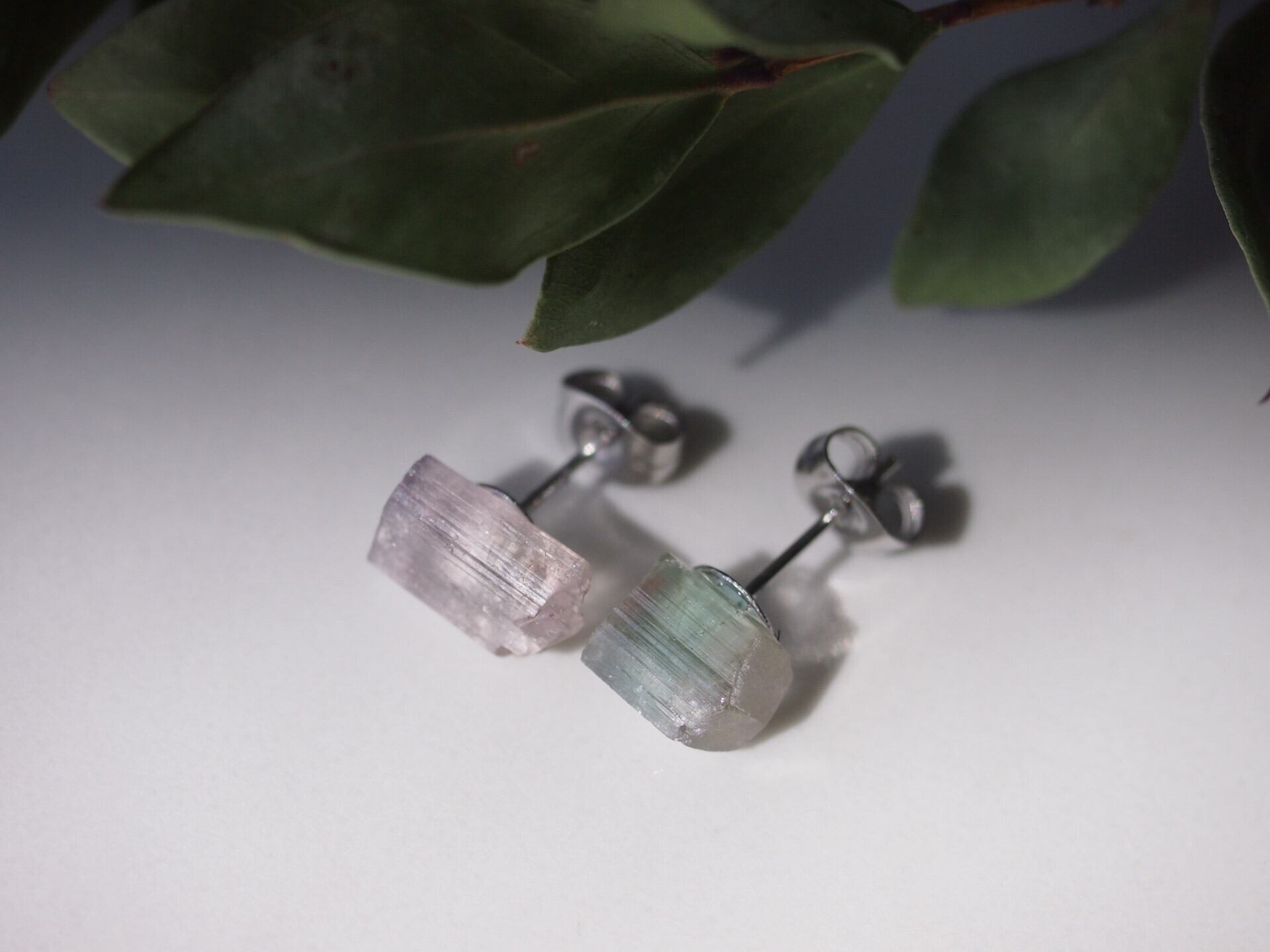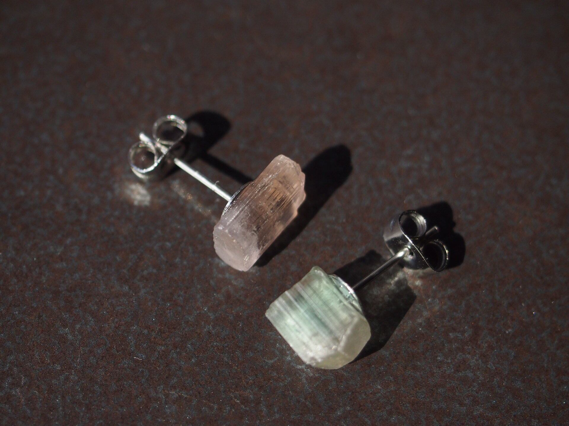 片方はピンク、もう片方はピンクとグリーンのバイカラーの原石を使用しました。