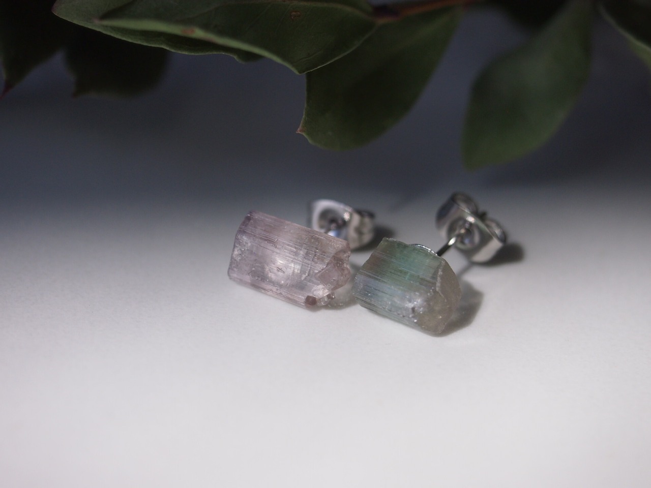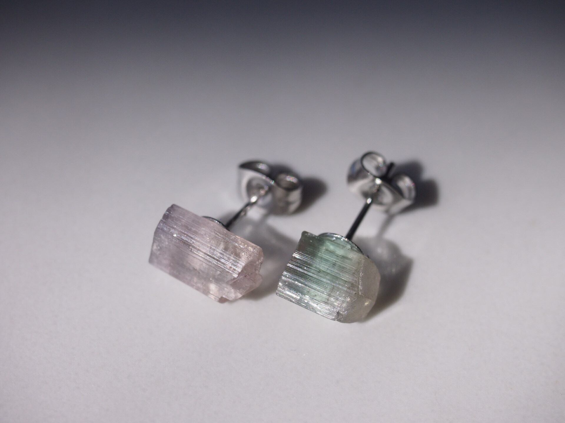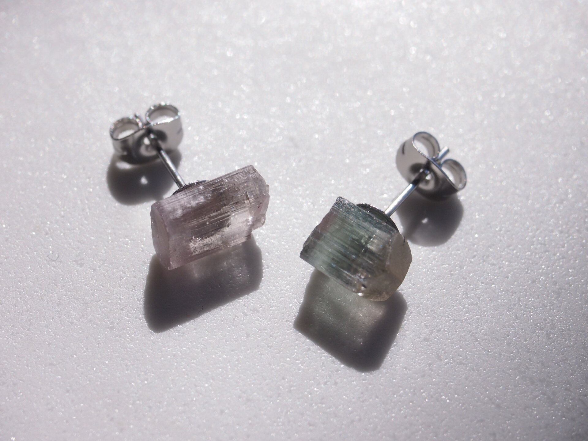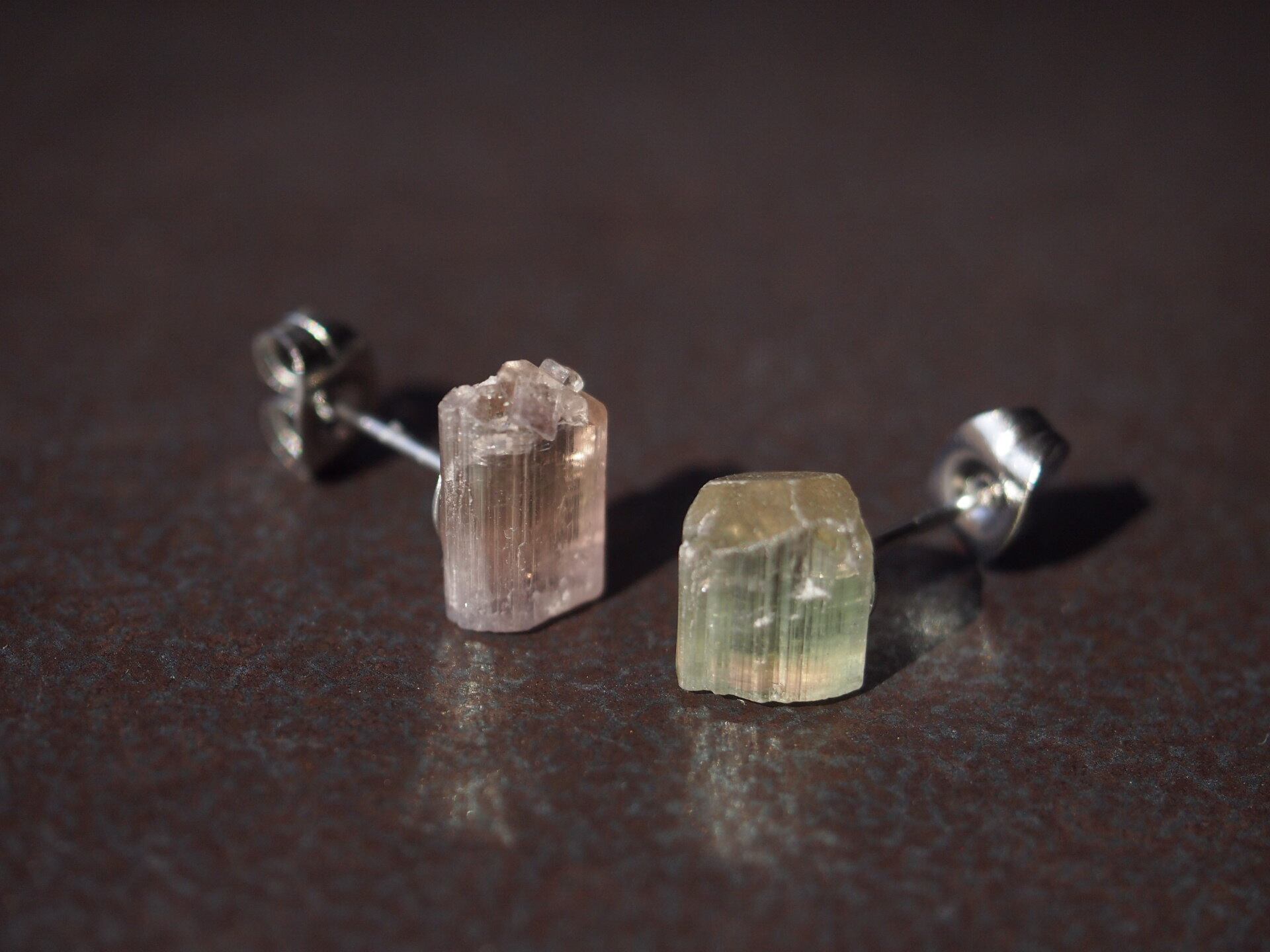 片方はピンク、もう片方はピンクとグリーンのバイカラーの原石を使用しました。