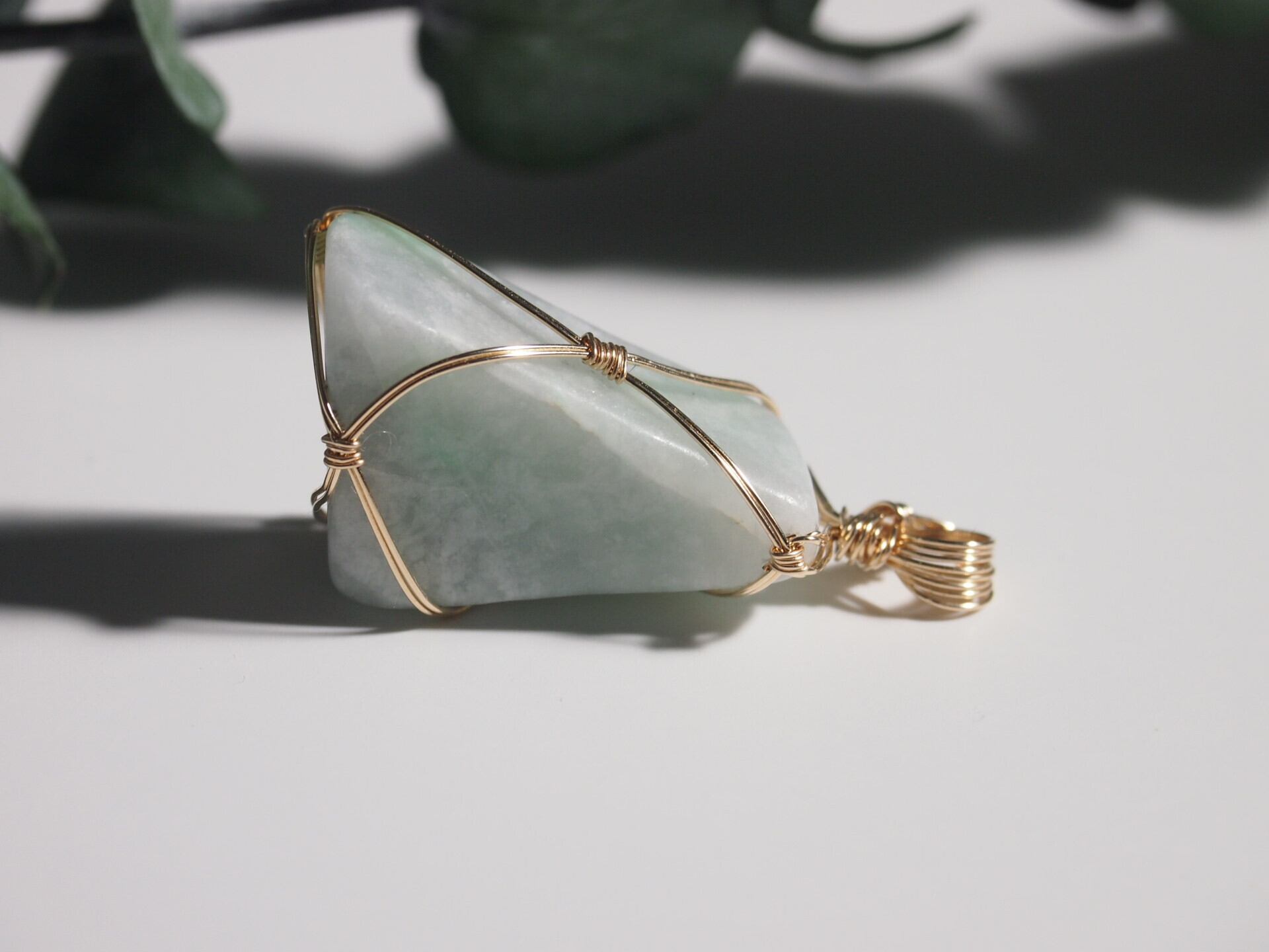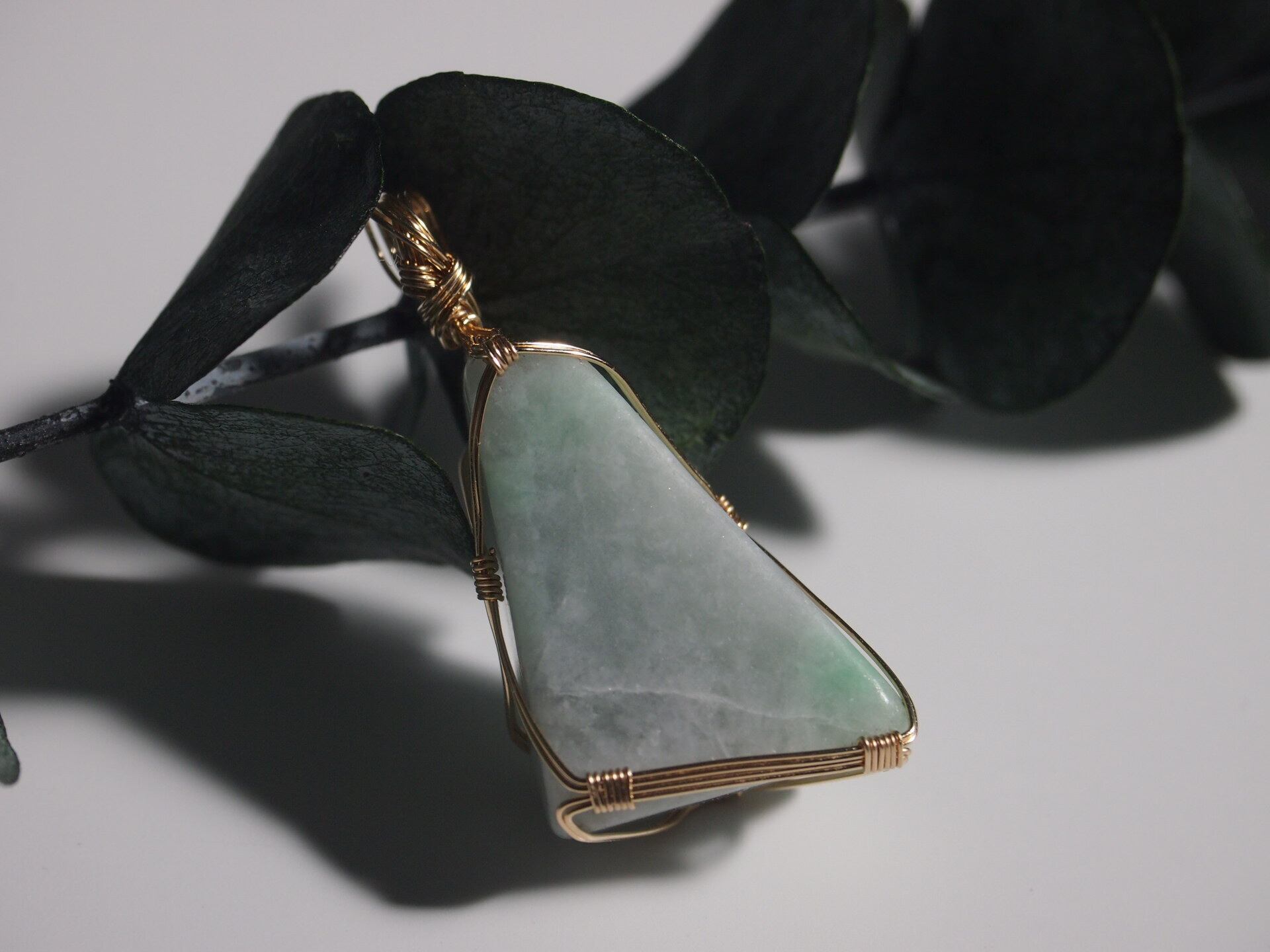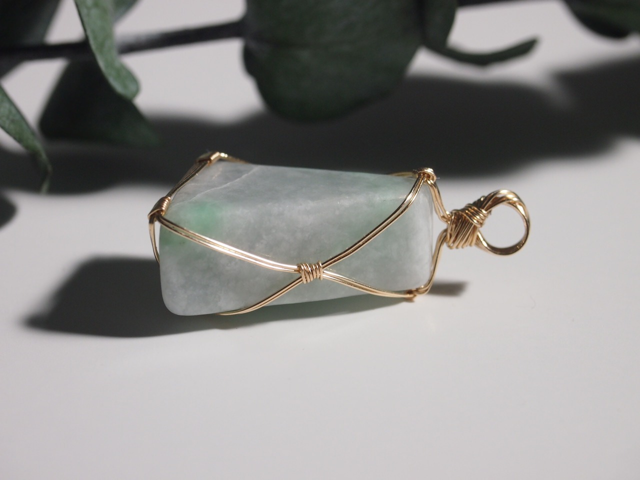 アップルグリーンの入る、美しい糸魚川産の翡翠を14kgfワイヤーで繊細にペンダントトップに仕上げました♡