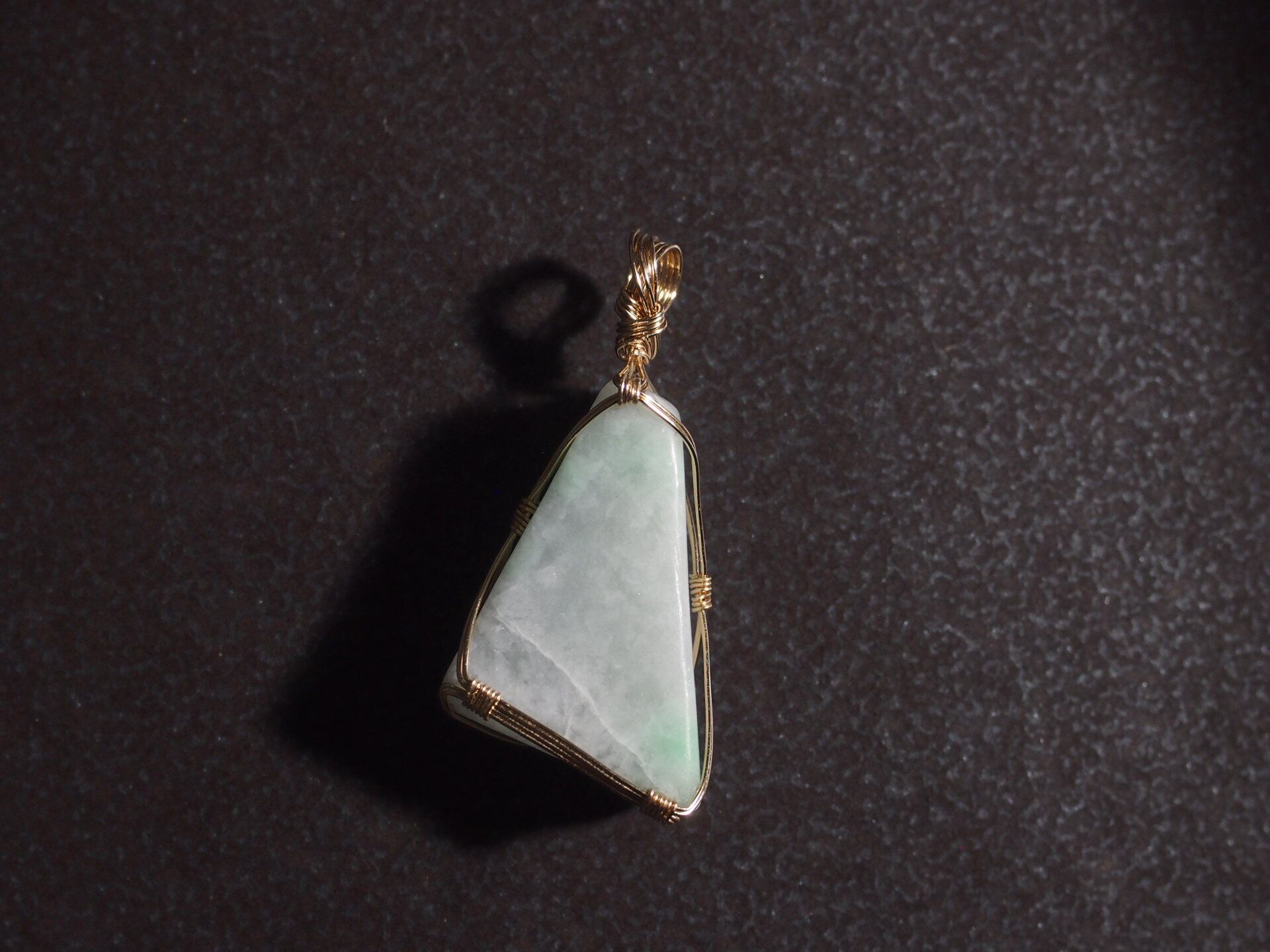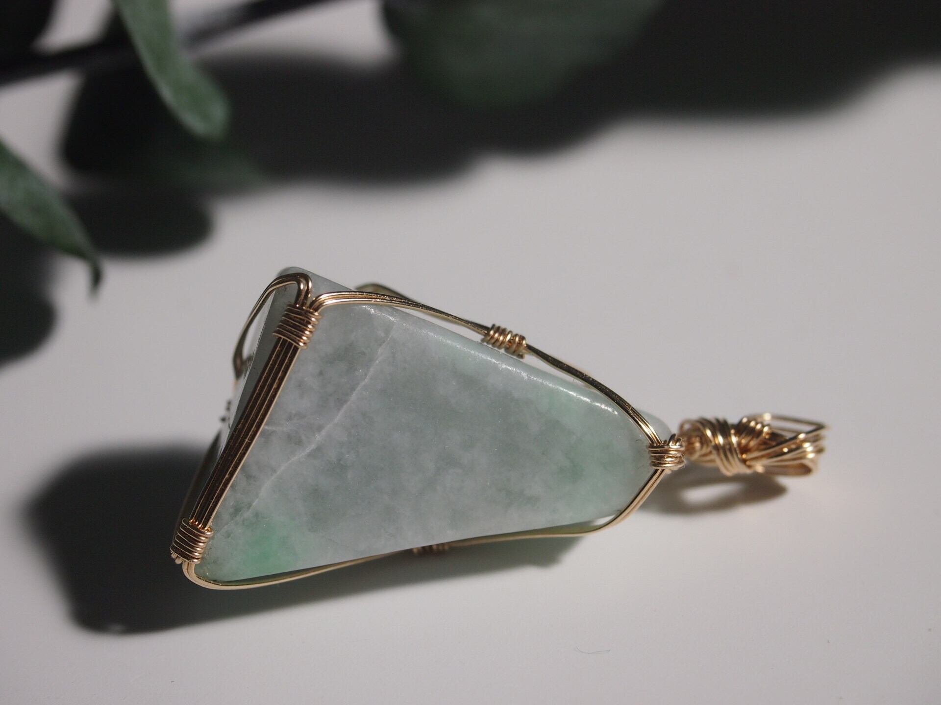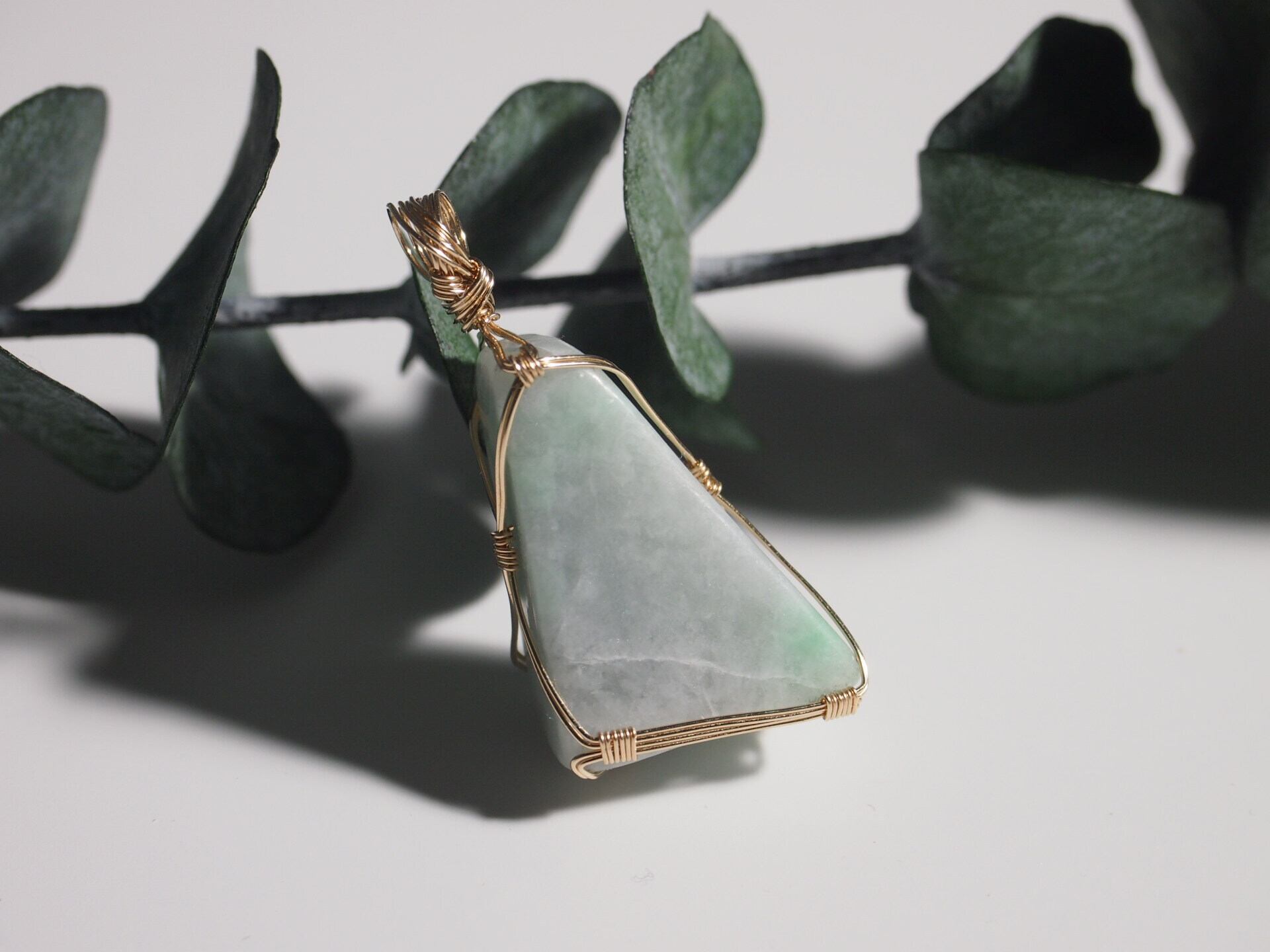アップルグリーンの入る、美しい糸魚川産の翡翠を14kgfワイヤーで繊細にペンダントトップに仕上げました♡