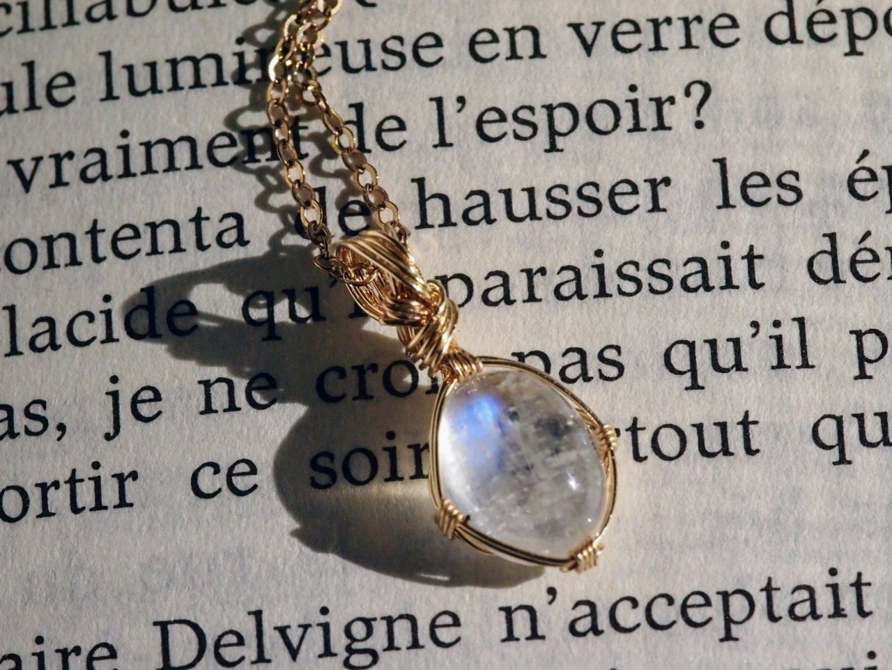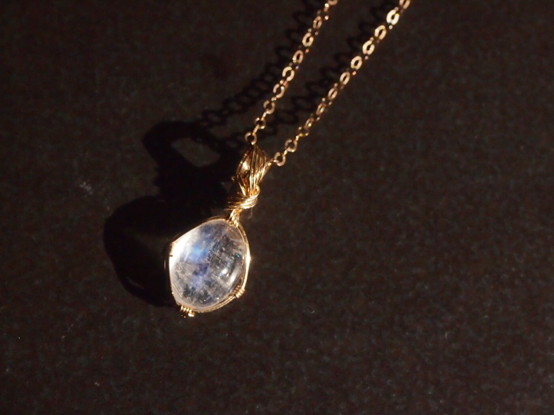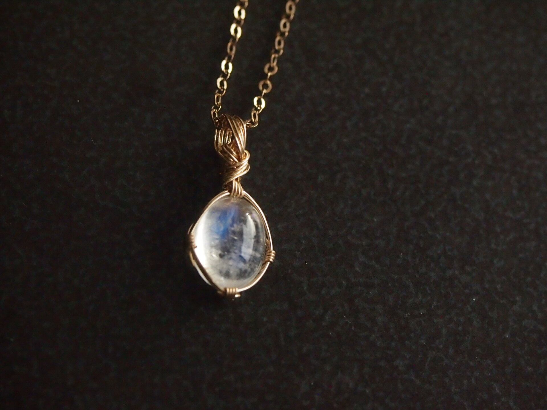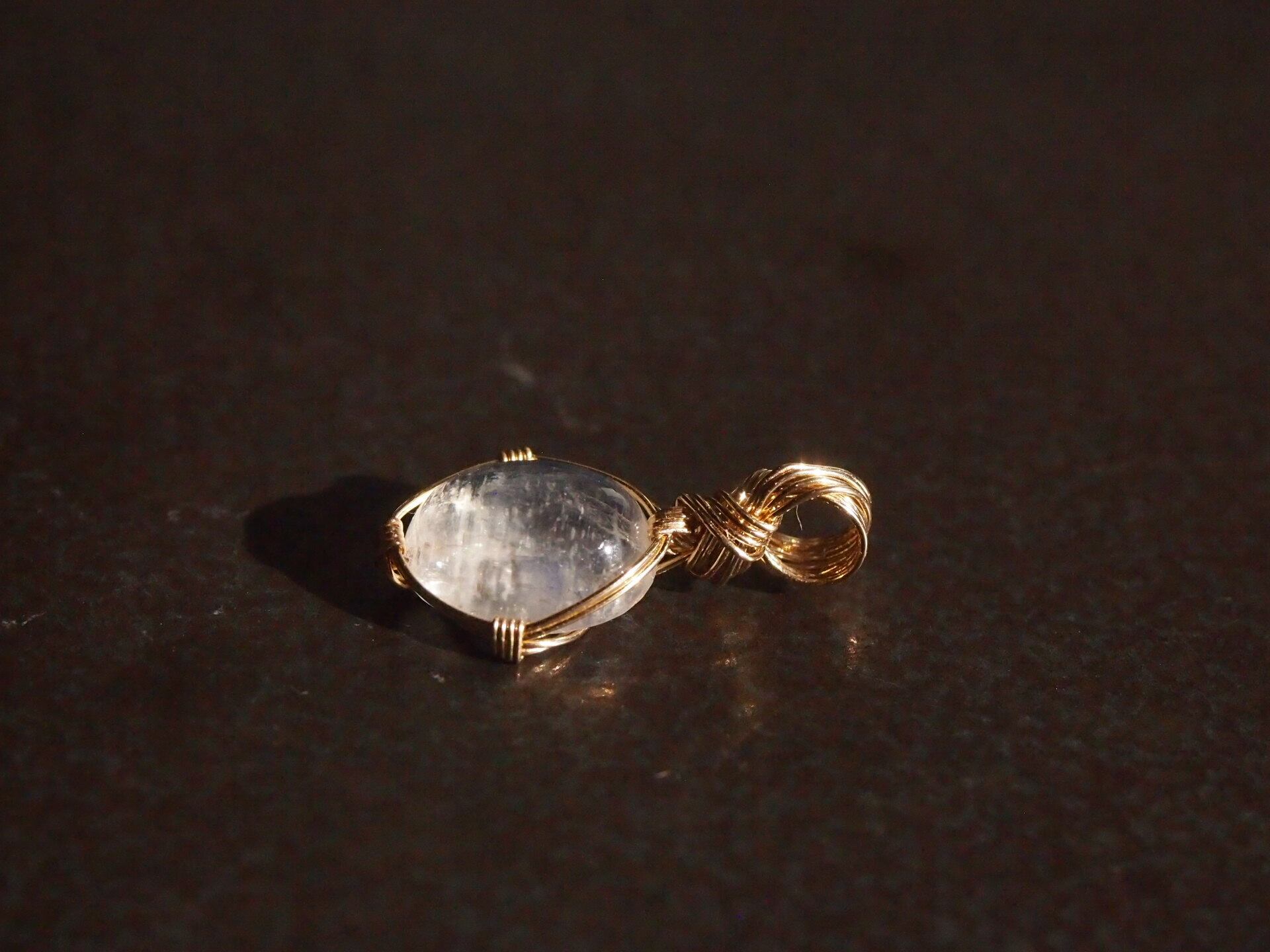 小さなカボションカットのロイヤルブルームーンストーンを14kgfワイヤーで繊細に女神巻きペンダントトップに仕上げました♡