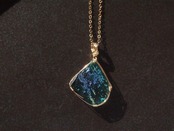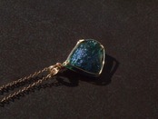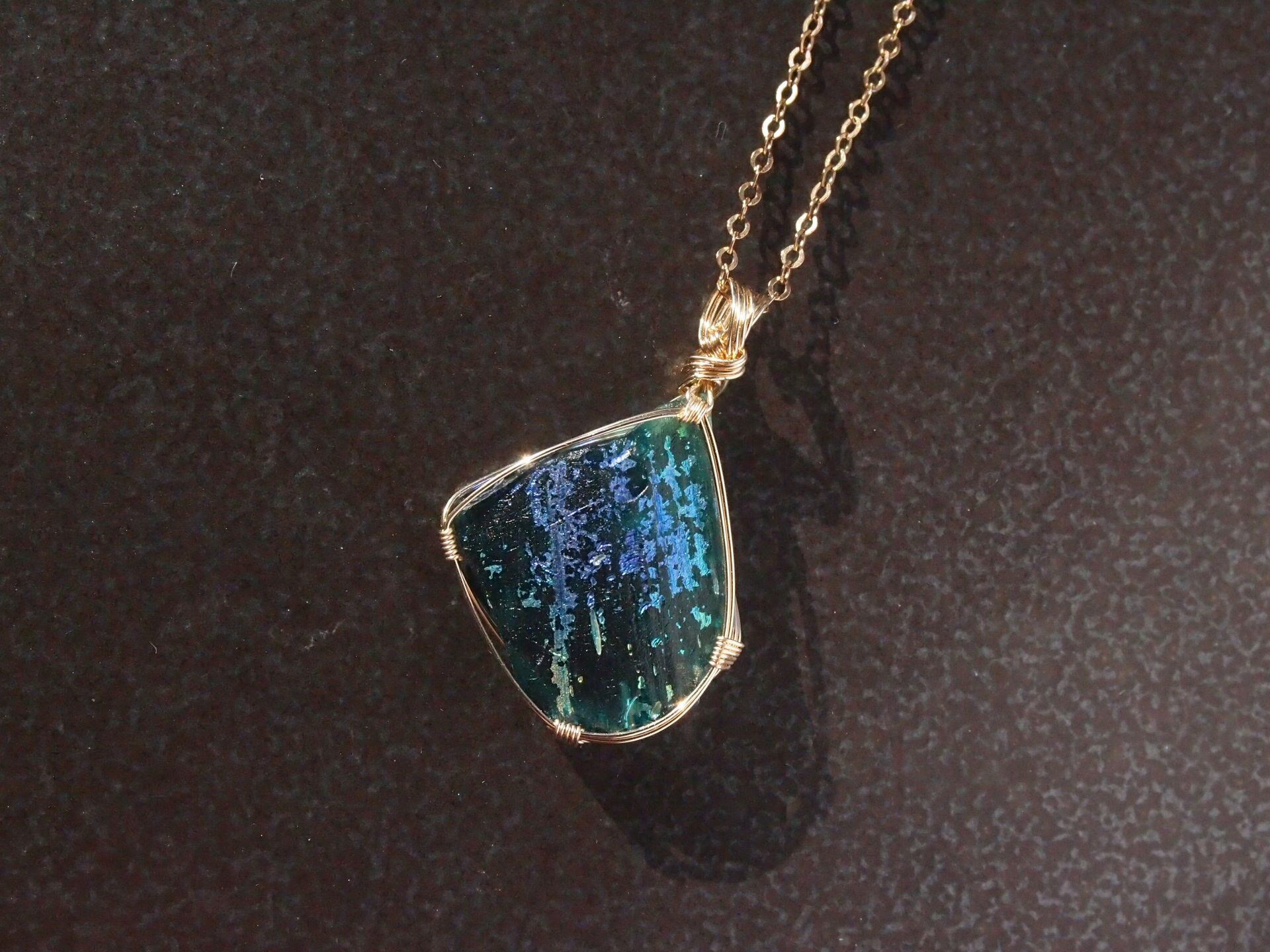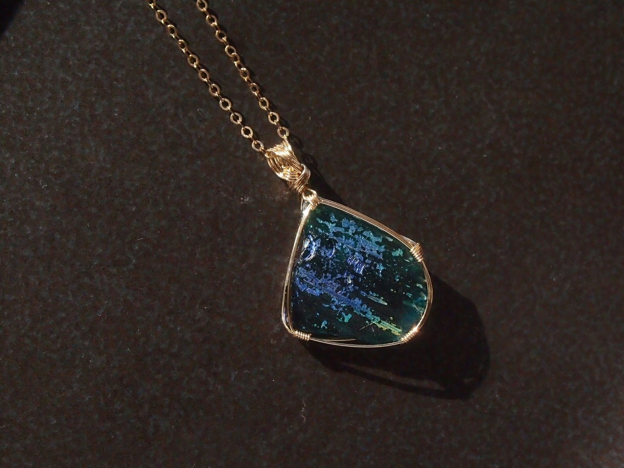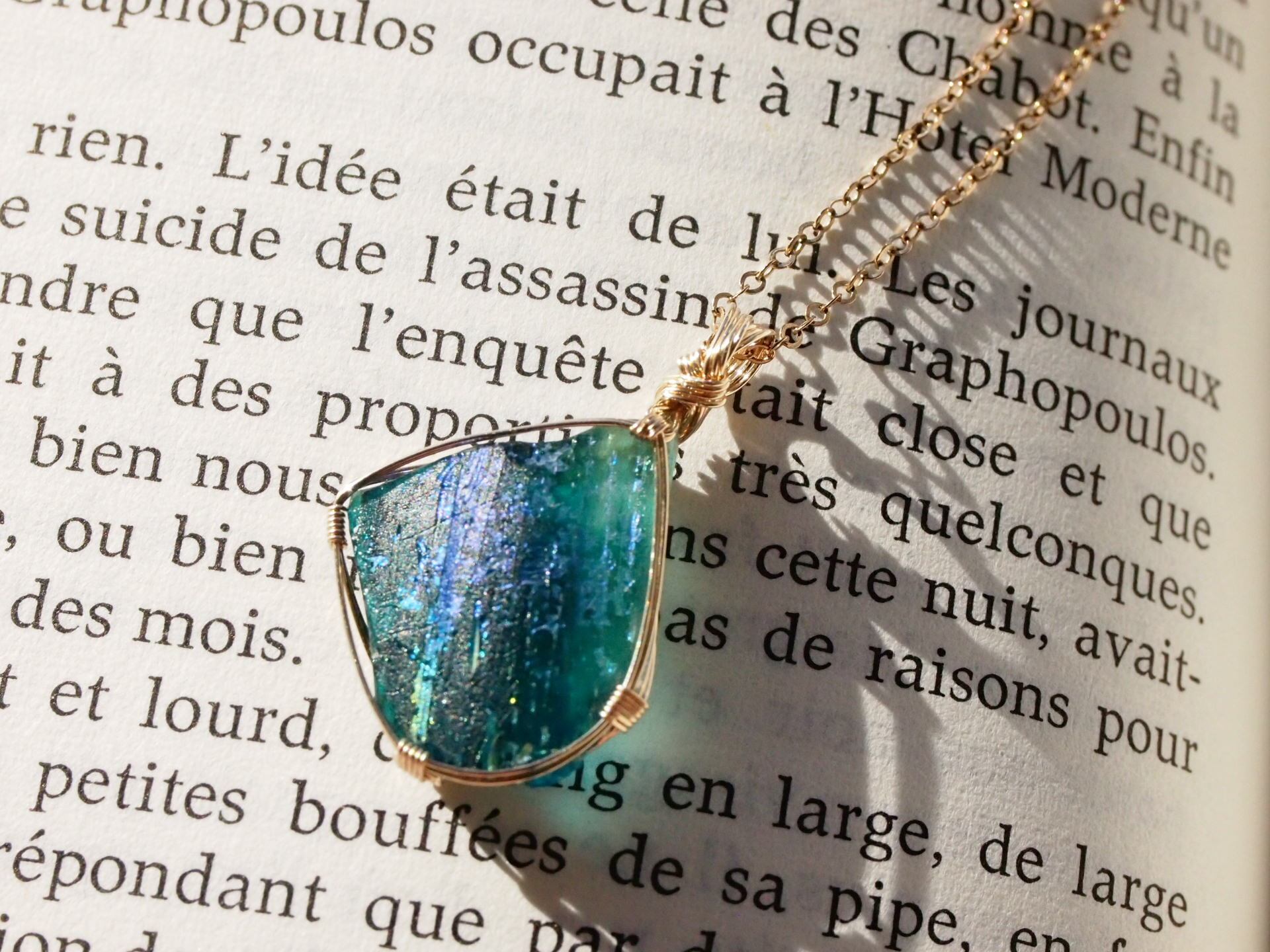 この作品に使用したローマングラスは、深いブルーグリーンのガラスにグリーンやブルー、オレンジなど様々な色の銀化が観察できます。